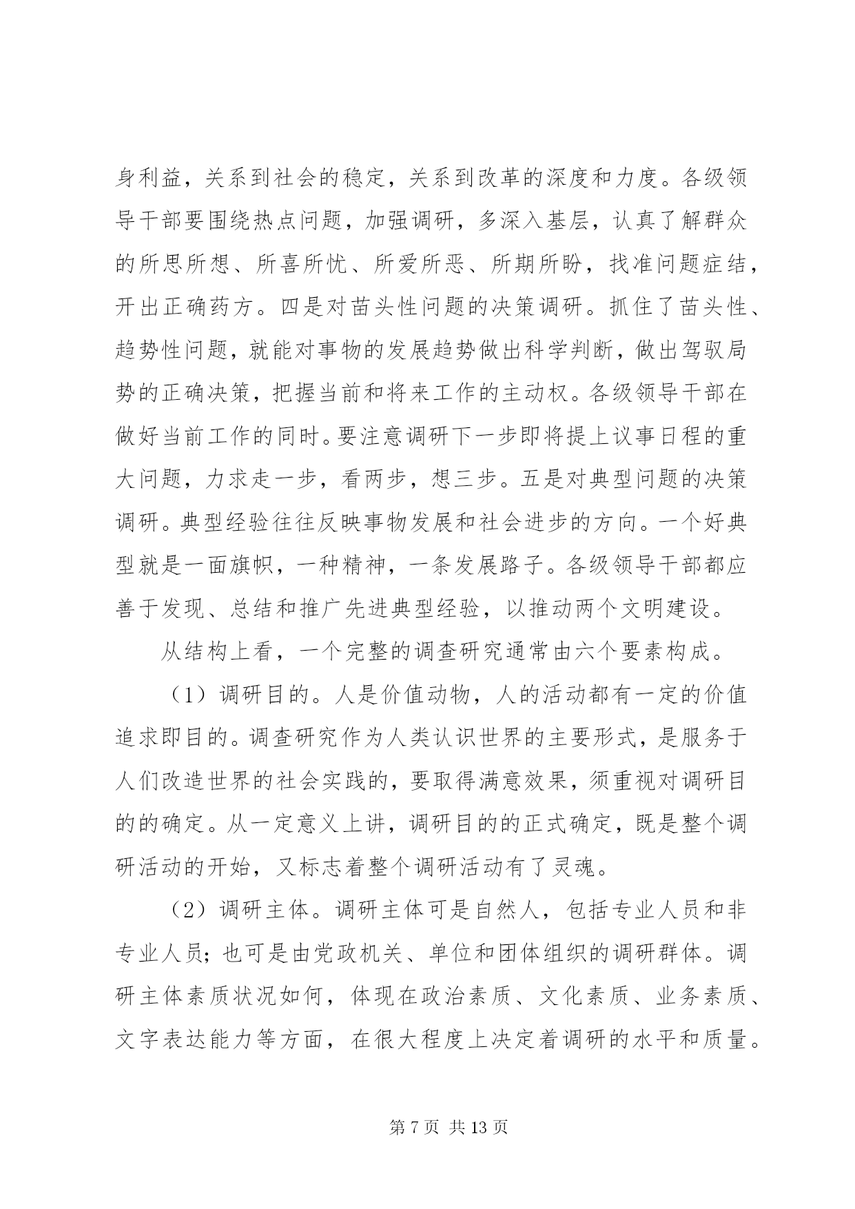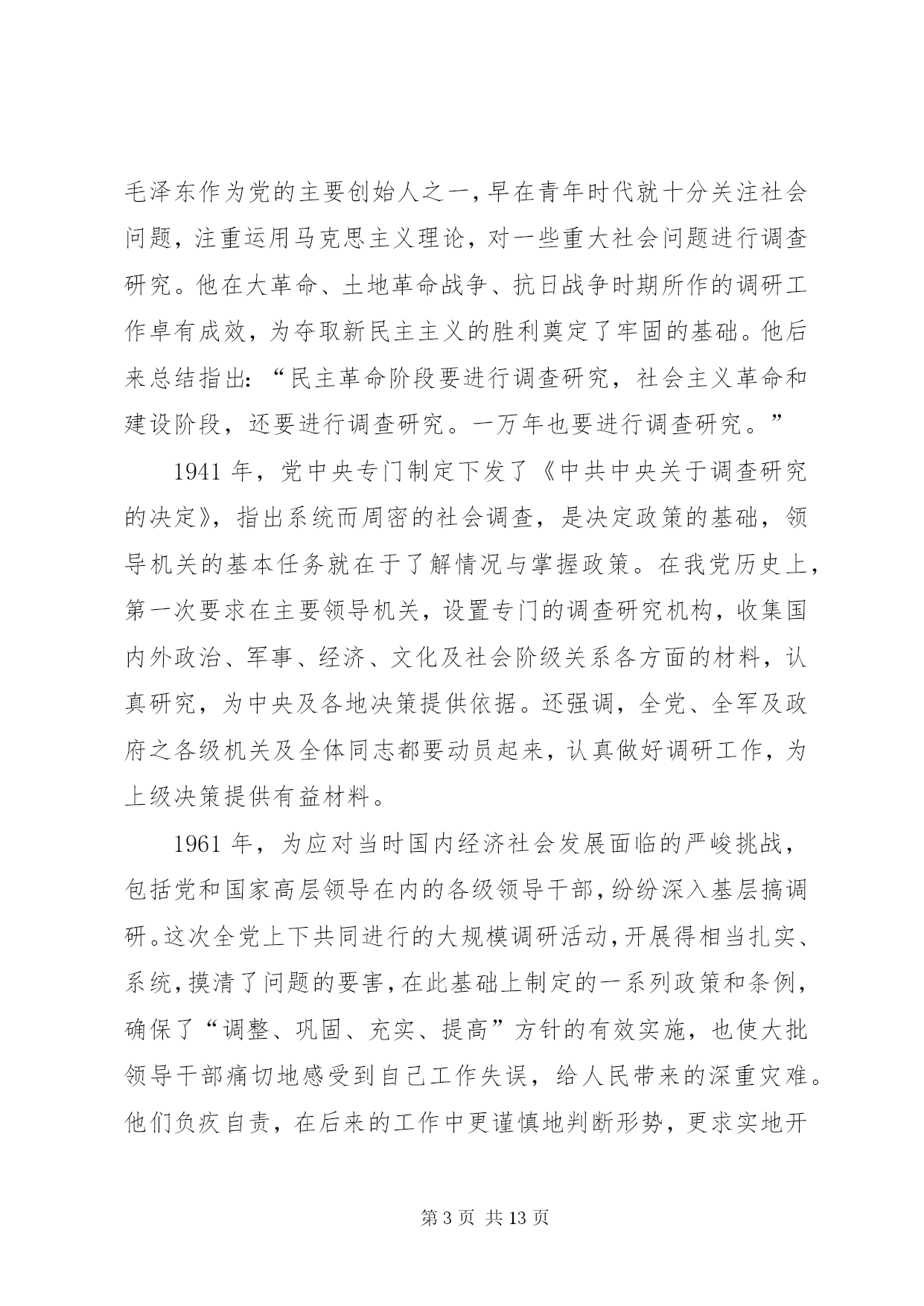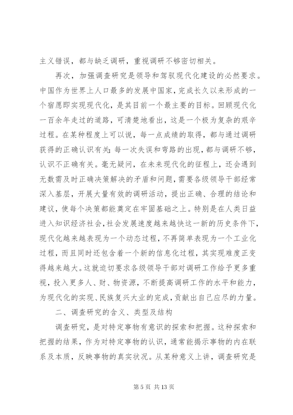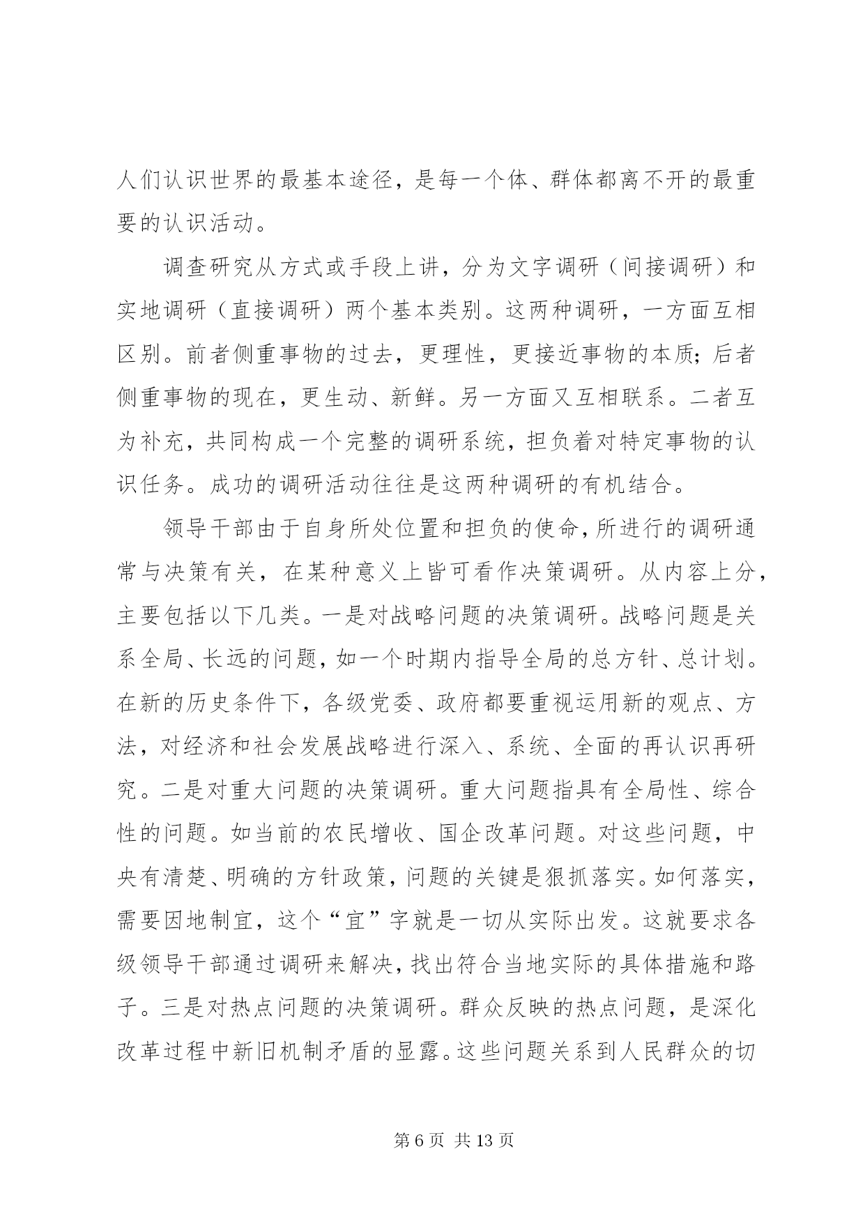 第PAGE\*Arabic\*MERGEFORMAT13页共NUMPAGES\*MERGEFORMAT13页领导干部理论研究思考目前在部分领导干部中,有一种有影响的观点认为,在现代通讯、信息技术飞速发展,办公手段、条件日趋现代化,调研主体日益多元化的新形势下,领导干部的调研工作已变得没有多少价值可言了。与此种认识多少有些关系,很多调查研究变了味,走了调。在部分干部那里,所谓的调研要么是先设定好框框、论点,再按图索骥的“论证式”调研;要么是沽名钓誉、哗众取宠的“名利式”调研;要么是“规定动作”,只调“好”不调“差”的“盆景式”调研;要么是“形而下而神不下”的“走马观花式”调研;要么是光调查不解决问题的“两张皮式”调研;等等。这样的“调研”实际上已演变成实用主义和形式主义,偏离了调研宗旨。这些看法和做法的存在,从一个侧面反映出,当前有相当数量的领导干部,对调查研究的含义、价值、及改进方法等应把握的基本问题,不甚了了,有很多模糊乃至错误认识。这就使得各级领导干部在新的历史条件下,重新认识调查研究,扎实提高调研工作水平,变得格外必要和格外重要。一、调查研究的地位和作用近年来,江泽民总书记一再指出,在新时期,尽管我们开展调查研究的对象、内容、手段、条件,发生了新变化,但调研在党的决策工作和全部领导工作中的地位、作用,从未改变,且显得更重要,只能加强,不能削弱。他强调,没有调查就没有发言权,更没有决策权。总书记的论断,充分表明了调查研究在新的历史条件下的极端重要性和紧迫性。从某种程度上讲,调查研究既是领导干部的一门必修课,又是领导干部的一项基本功。这一工作做得好坏,直接关乎现代化的成败,关乎社会主义事业兴衰。首先,开展调查研究是领导干部的一项基本任务。毛泽东说过:“政策和策略是党的生命。”而领导活动从某种意义上讲,主要表现为决策工作。决策是人们有意识改造世界的客观物质活动的主要组成部分,是人们主观能动性的突出表现。在辩证唯物主义看来,就像其他任何主观能动性的发挥,都要受一定客观条件限制一样,决策也要受一定条件限制。决策以认识为基础。在很大程度上,决策正确与否,取决于人们认识正确与否。要保证决策正确,必须首先保证认识正确,如实反映客观世界,充分反映各方面、各层次人群的需要。由于调查研究是人们认识客观世界的最基本途径,所以各级领导干部必须切实提高对调研重要性的认识,把调研当作自己的一项主要日常工作,摆在突出位置,努力摆脱主观主义、形式主义、教条主义和经验主义束缚。只有这样,才能真正把握社会现象,特别是复杂社会现象的来龙去脉,弄清问题的历史、现状和趋势,从而为决策提供可靠依据,奠定坚实基础。其次,重视调查研究是中国共产党人的优良传统和一贯作风。毛泽东作为党的主要创始人之一,早在青年时代就十分关注社会问题,注重运用马克思主义理论,对一些重大社会问题进行调查研究。他在大革命、土地革命战争、抗日战争时期所作的调研工作卓有成效,为夺取新民主主义的胜利奠定了牢固的基础。他后来总结指出:“民主革命阶段要进行调查研究,社会主义革命和建设阶段,还要进行调查研究。一万年也要进行调查研究。”1941年,党中央专门制定下发了《中共中央关于调查研究的决定》,指出系统而周密的社会调查,是决定政策的基础,领导机关的基本任务就在于了解情况与掌握政策。在我党历史上,第一次要求在主要领导机关,设置专门的调查研究机构,收集国内外政治、军事、经济、文化及社会阶级关系各方面的材料,认真研究,为中央及各地决策提供依据。还强调,全党、全军及政府之各级机关及全体同志都要动员起来,认真做好调研工作,为上级决策提供有益材料。1961年,为应对当时国内经济社会发展面临的严峻挑战,包括党和国家高层领导在内的各级领导干部,纷纷深入基层搞调研。这次全党上下共同进行的大规模调研活动,开展得相当扎实、系统,摸清了问题的要害,在此基础上制定的一系列政策和条例,确保了“调整、巩固、充实、提高”方针的有效实施,也使大批领导干部痛切地感受到自己工作失误,给人民带来的深重灾难。他们负疚自责,在后来的工作中更谨慎地判断形势,更求实地开展工作,也更尊重人民群众的切身利益。作为党的第三代领导人的主要代表,江泽民总书记一贯重视调研工作。自上任以来,他多次深入农村、企业、城市社区等领域,身体力行,就一些紧迫、重大的社会问题进行调研,得出了很多有价值的重要结论,有力地推动了我国各项工作的发展。他在1993年全国政研室主任会上发表重要讲话,结合党和政府近年来的实践,站在时代高度,再次强调调研工作的重要性,号召全党大兴调研之风,阐述了许多精辟论断。指出:“加强调查研究不仅是一个工作方法问题,而且是一个关系党和人民事业得失成败的大问题。”“建设有中国特色社会主义事业任重道远,在前进中会遇到许多复杂的新情况新