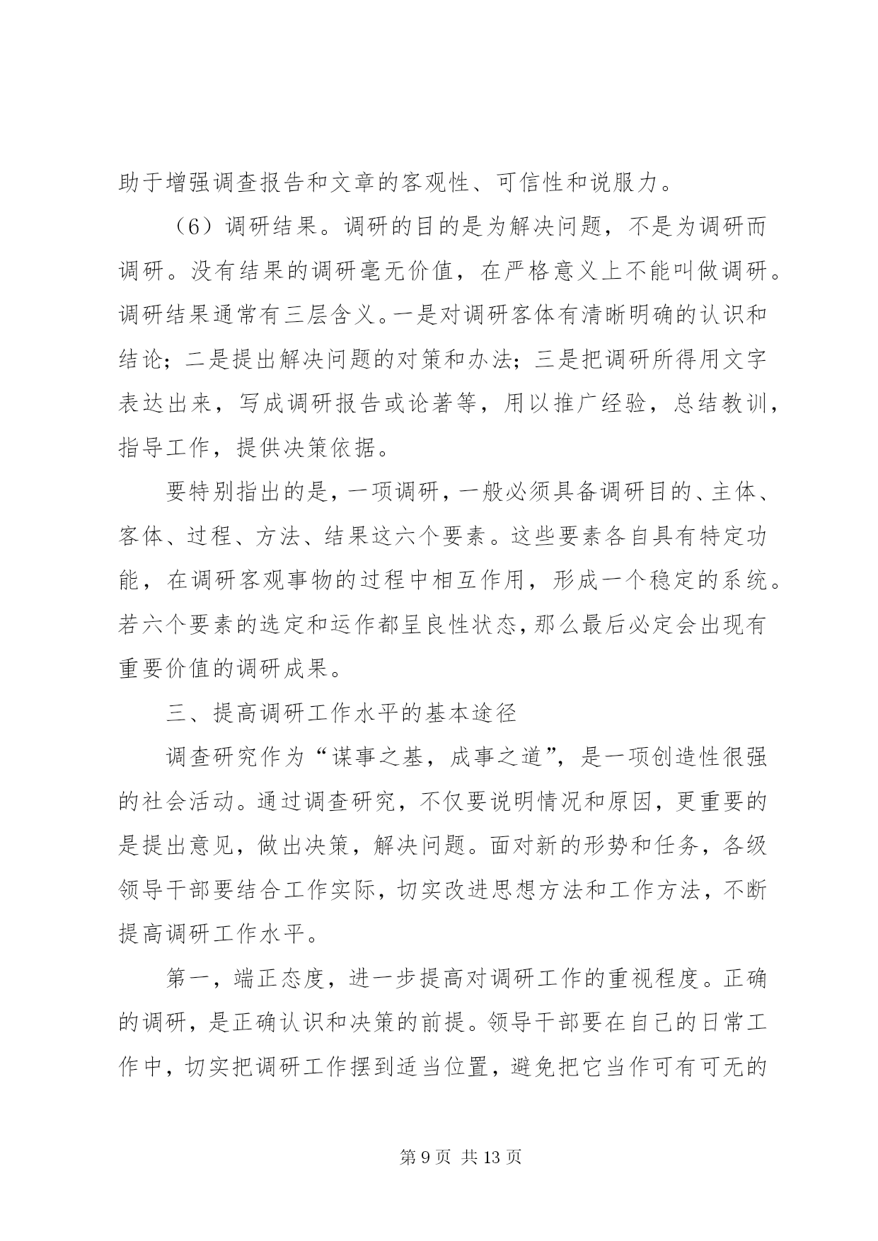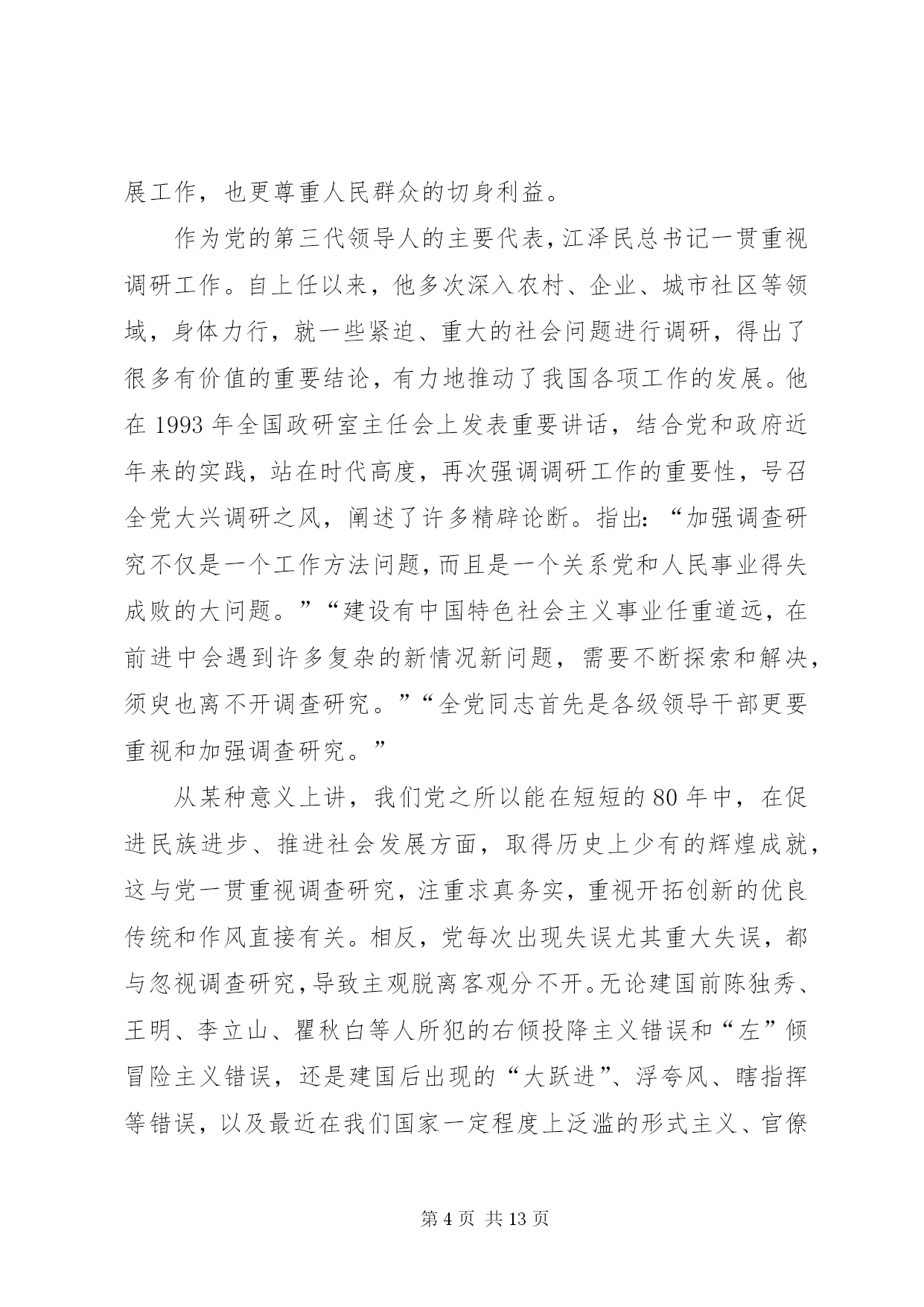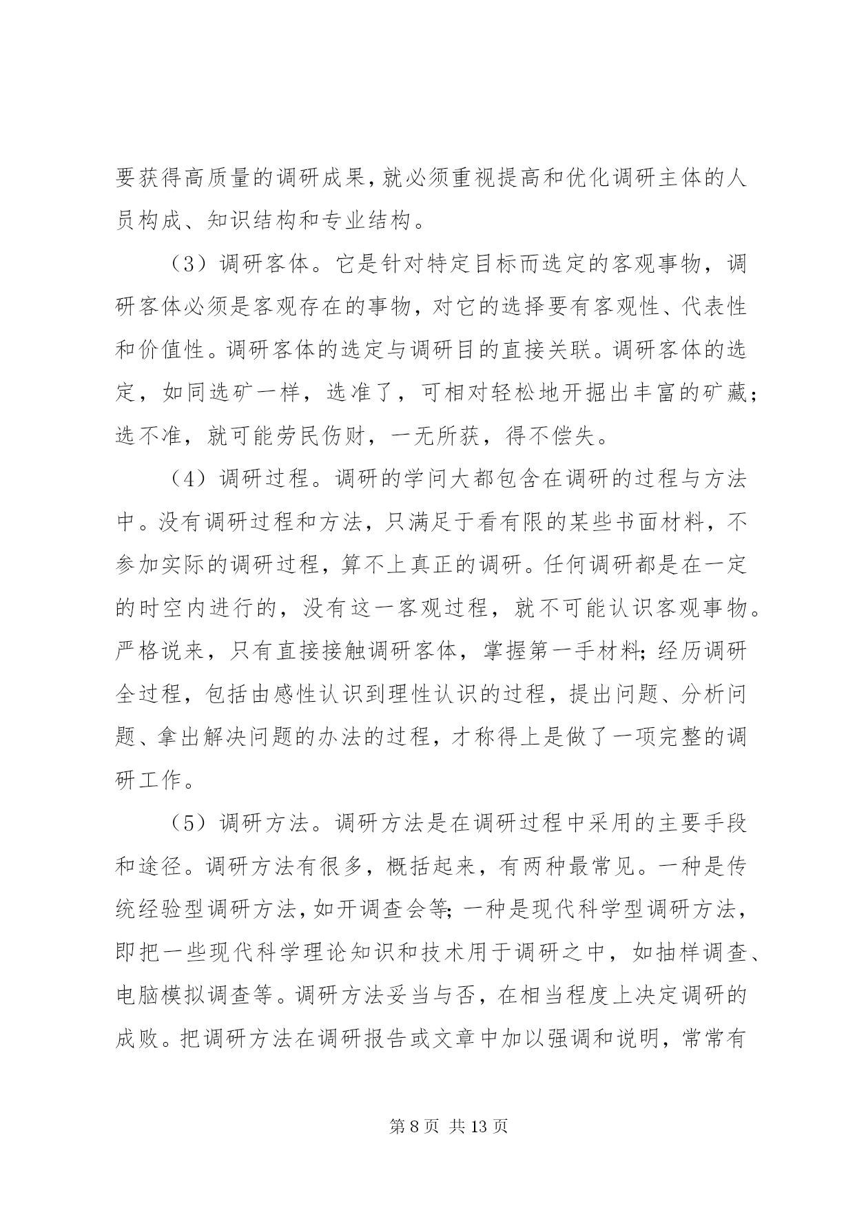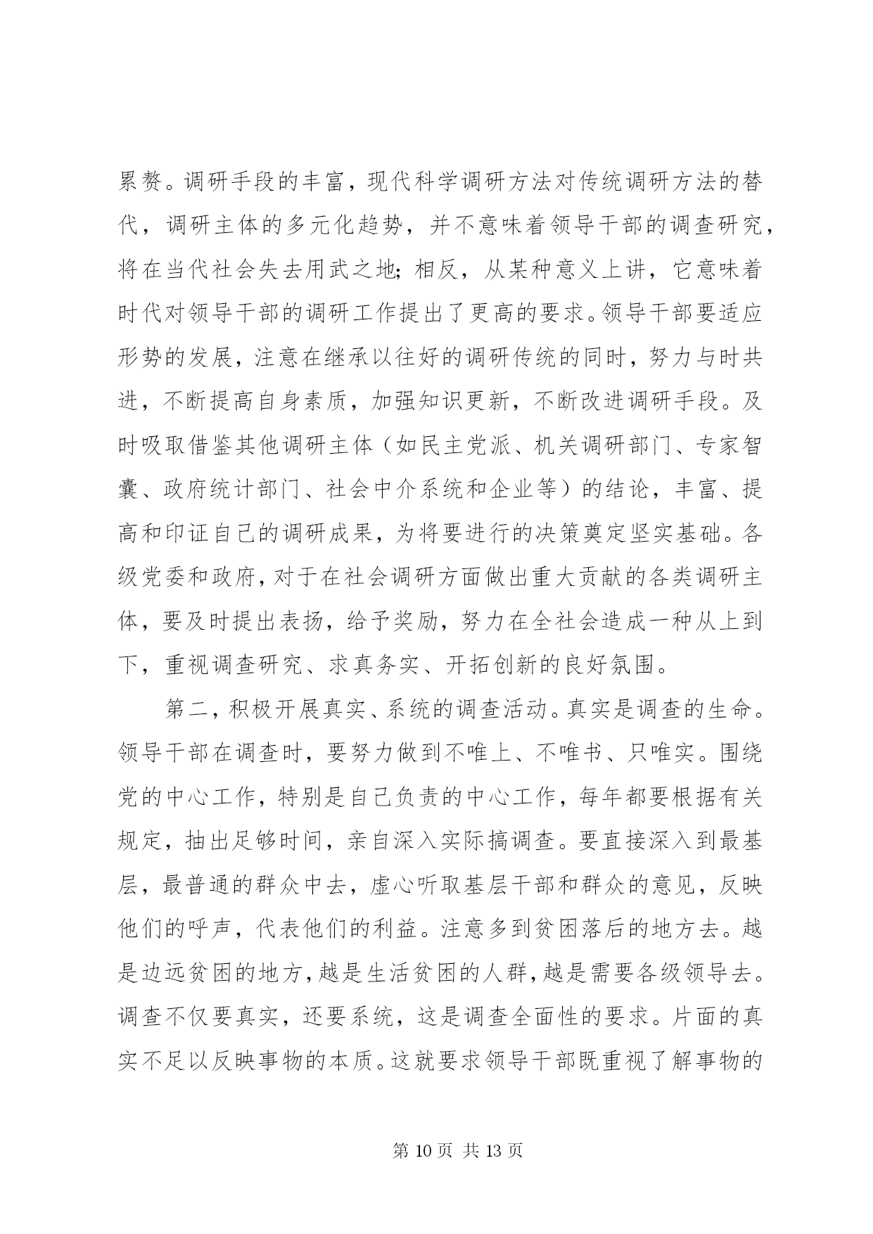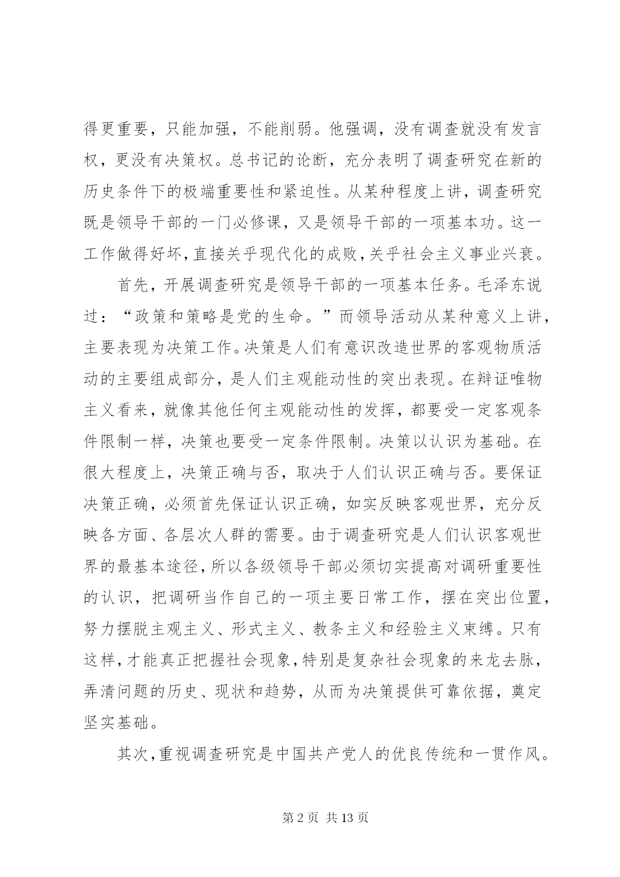第PAGE\*Arabic\*MERGEFORMAT13页共NUMPAGES\*MERGEFORMAT13页领导干部理论研究思考目前在部分领导干部中,有一种有影响的观点认为,在现代通讯、信息技术飞速发展,办公手段、条件日趋现代化,调研主体日益多元化的新形势下,领导干部的调研工作已变得没有多少价值可言了。与此种认识多少有些关系,很多调查研究变了味,走了调。在部分干部那里,所谓的调研要么是先设定好框框、论点,再按图索骥的“论证式”调研;要么是沽名钓誉、哗众取宠的“名利式”调研;要么是“规定动作”,只调“好”不调“差”的“盆景式”调研;要么是“形而下而神不下”的“走马观花式”调研;要么是光调查不解决问题的“两张皮式”调研;等等。这样的“调研”实际上已演变成实用主义和形式主义,偏离了调研宗旨。这些看法和做法的存在,从一个侧面反映出,当前有相当数量的领导干部,对调查研究的含义、价值、及改进方法等应把握的基本问题,不甚了了,有很多模糊乃至错误认识。这就使得各级领导干部在新的历史条件下,重新认识调查研究,扎实提高调研工作水平,变得格外必要和格外重要。一、调查研究的地位和作用近年来,江泽民总书记一再指出,在新时期,尽管我们开展调查研究的对象、内容、手段、条件,发生了新变化,但调研在党的决策工作和全部领导工作中的地位、作用,从未改变,且显得更重要,只能加强,不能削弱。他强调,没有调查就没有发言权,更没有决策权。总书记的论断,充分表明了调查研究在新的历史条件下的极端重要性和紧迫性。从某种程度上讲,调查研究既是领导干部的一门必修课,又是领导干部的一项基本功。这一工作做得好坏,直接关乎现代化的成败,关乎社会主义事业兴衰。首先,开展调查研究是领导干部的一项基本任务。毛泽东说过:“政策和策略是党的生命。”而领导活动从某种意义上讲,主要表现为决策工作。决策是人们有意识改造世界的客观物质活动的主要组成部分,是人们主观能动性的突出表现。在辩证唯物主义看来,就像其他任何主观能动性的发挥,都要受一定客观条件限制一样,决策也要受一定条件限制。决策以认识为基础。在很大程度上,决策正确与否,取决于人们认识正确与否。要保证决策正确,必须首先保证认识正确,如实反映客观世界,充分反映各方面、各层次人群的需要。由于调查研究是人们认识客观世界的最基本途径,所以各级领导干部必须切实提高对调研重要性的认识,把调研当作自己的一项主要日常工作,摆在突出位置,努力摆脱主观主义、形式主义、教条主义和经验主义束缚。只有这样,才能真正把握社会现象,特别是复杂社会现象的来龙去脉,弄清问题的历史、现状和趋势,从而为决策提供可靠依据,奠定坚实基础。其次,重视调查研究是中国共产党人的优良传统和一贯作风。毛泽东作为党的主要创始人之一,早在青年时代就十分关注社会问题,注重运用马克思主义理论,对一些重大社会问题进行调查研究。他在大革命、土地革命战争、抗日战争时期所作的调研工作卓有成效,为夺取新民主主义的胜利奠定了牢固的基础。他后来总结指出:“民主革命阶段要进行调查研究,社会主义革命和建设阶段,还要进行调查研究。一万年也要进行调查研究。”1941年,党中央专门制定下发了《中共中央关于调查研究的决定》,指出系统而周密的社会调查,是决定政策的基础,领导机关的基本任务就在于了解情况与掌握政策。在我党历史上,第一次要求在主要领导机关,设置专门的调查研究机构,收集国内外政治、军事、经济、文化及社会阶级关系各方面的材料,认真研究,为中央及各地决策提供依据。还强调,全党、全军及政府之各级机关及全体同志都要动员起来,认真做好调研工作,为上级决策提供有益材料。1961年,为应对当时国内经济社会发展面临的严峻挑战,包括党和国家高层领导在内的各级领导干部,纷纷深入基层搞调研。这次全党上下共同进行的大规模调研活动,开展得相当扎实、系统,摸清了问题的要害,在此基础上制定的一系列政策和条例,确保了“调整、巩固、充实、提高”方针的有效实施,也使大批领导干部痛切地感受到自己工作失误,给人民带来的深重灾难。他们负疚自责,在后来的工作中更谨慎地判断形势,更求实地开展工作,也更尊重人民群众的切身利益。作为党的第三代领导人的主要代表,江泽民总书记一贯重视调研工作。自上任以来,他多次深入农村、企业、城市社区等领域,身体力行,就一些紧迫、重大的社会问题进行调研,得出了很多有价值的重要结论,有力地推动了我国各项工作的发展。他在1993年全国政研室主任会上发表重要讲话,结合党和政府近年来的实践,站在时代高度,再次强调调研工作的重要性,号召全党大兴调研之风,阐述了许多精辟论断。指出:“加强调查研究不仅是一个工作方法问题,而且是一个关系党和人民事业得失成败的大问题。”“建设有中国特色社会主义事业任重道远,在前进中会遇到许多复杂的新情况新