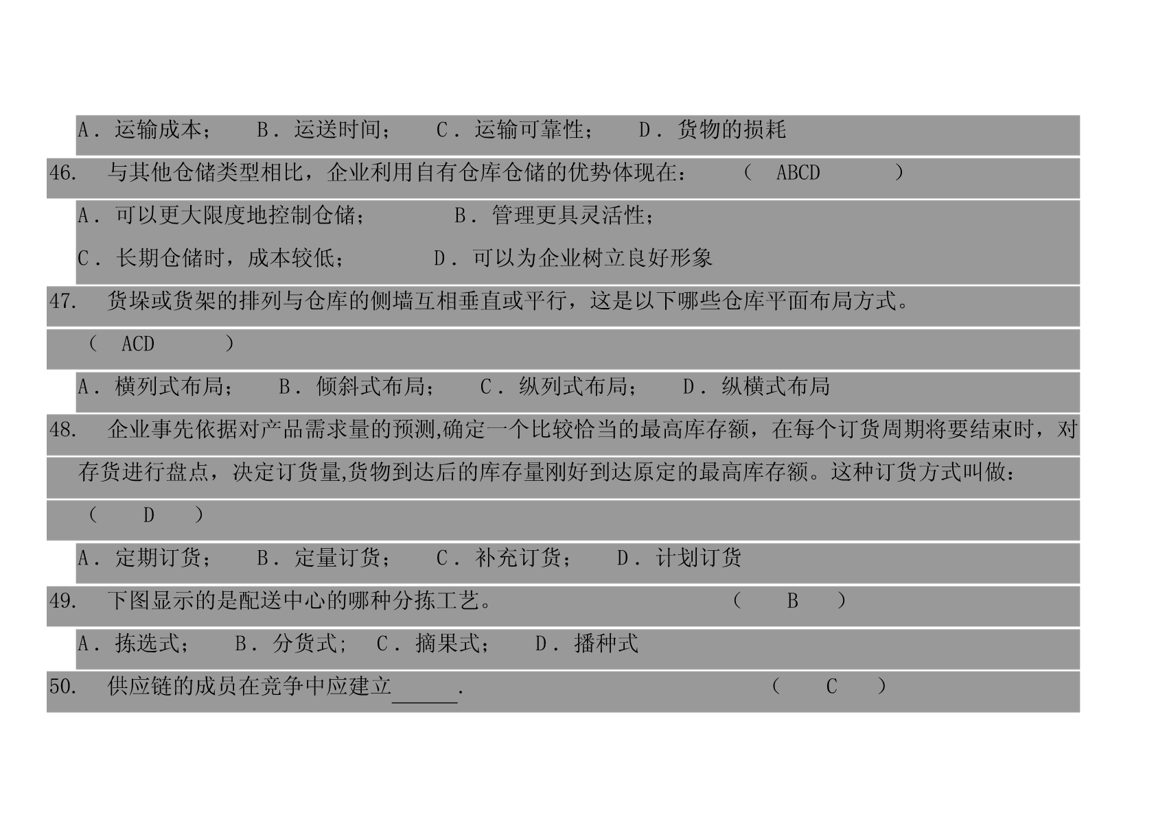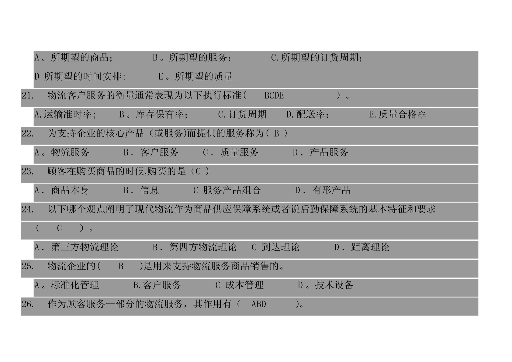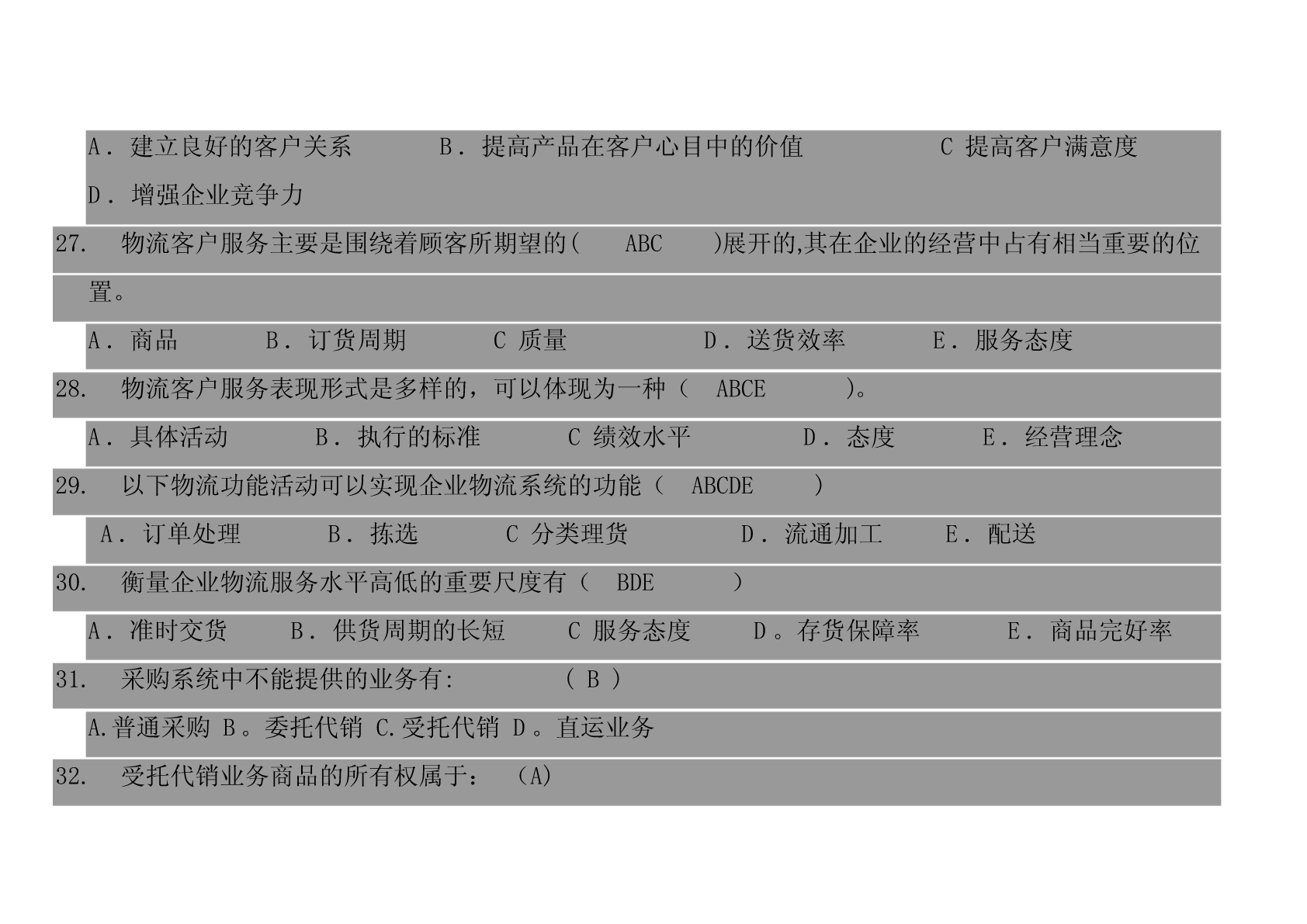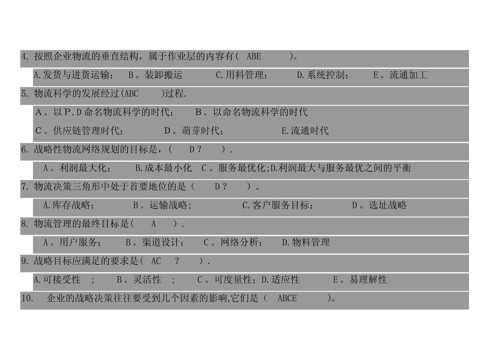 物流管理总复习题二、选择题1.物流是指物资的物质实体由供应者到需求者的流动,(A).A。物资空间位置的变动和时间位置的变动B。物资空间位置的变动和形状性质的变动C.物资时间位置的变动和形状性质的变动D.物资空间位置的变动、时间位置的变动和形状性质的变动2.物资的生产过程的功能是创造物资的(A)。A.形质效用;B.时间效用;C。空间效用;D。社会效用3.流通为实现物资从生产者手中转移到消费者手中的目的,克服(A).A。供需之间的产品的所有权距离、空间距离和时间距离B.供需之间的产品的所有权距离、空间距离和观察距离C。供需之间的产品的所有权距离、观察距离和时间距离D.供需之间的产品的观察距离、空间距离和时间距离4.按照企业物流的垂直结构,属于作业层的内容有(ABE)。A.发货与进货运输;B。装卸搬运C.用料管理;D.系统控制;E。流通加工5.物流科学的发展经过(ABC)过程.A。以P.D命名物流科学的时代;B。以命名物流科学的时代C。供应链管理时代;D。萌芽时代;E.流通时代6.战略性物流网络规划的目标是,(D?).A。利润最大化;B.成本最小化C。服务最优化;D.利润最大与服务最优之间的平衡7.物流决策三角形中处于首要地位的是(D?)。A.库存战略;B。运输战略;C.客户服务目标;D。选址战略8.物流管理的最终目标是(A).A。用户服务;B。渠道设计;C。网络分析;D.物料管理9.战略目标应满足的要求是(AC?).A.可接受性;B。灵活性;C。可度量性;D.适应性E。易理解性10.企业的战略决策往往要受到几个因素的影响,它们是(ABCE)。A.企业过去所实施的战略;B.管理者对风险的态度;C.企业所处的环境;D。企业文化;E。竞争行为和反应11.在企业物流战略管理框架中,属于结构性战略的内容有(CD?)。A.物料管理;B。运输;C.渠道设计;D.网络分析;E.仓库管理12.采购管理作为一项管理活动,在它的职能中,首要的职能是(A?)。A。计划职能;B.组织职能;C.协调职能;D.控制职能13.打破企业原有部门界限,将企业供、产、销物流在企业进行一体化,这是属于企业物流整合中的(D).A。交叉整合;B.横向整合;C.内部整合;D.外部整合14.主要用于企业内部以及企业供应链上下游之间的信息共享的物流信息平台是:(D?)A企业物流信息平台B国家物流公共信息平台C地区物流公共信息平台D行业物流公共信息平台15.(A)对方案实施的结果已知,在一定条件下必然出现某个结果,在对影响因素充分掌握的基础上做出决策。A确定型决策B不确定型决策C风险型决策D错误型决策16.根据管理层次的划分,物流信息分为(A)、战术管理信息、知识管理信息、操作管理信息。A战略型管理信息B外部信息C静态信息D动态信息17.如果站在从事有形产品(或服务)制造或销售的制造企业或商业企业(即货主企业)的角度观察物流服务的话,物流服务属于(C)的范畴。A.企业核心竞争力;B.企业战略发展;C.企业客户服务;D.企业能力管理18.按照日本物流学者阿保荣司教授的“到达理论”,它强调物流服务的本质是将商品送达到用户手中,使其获得商品的(C)。A。价值B.使用价值C.利用可能性;D。所有权19.物流客户服务的最终目标是保证顾客对商品的利用可能性,因此,可以从以下三个方面来反映物流客户服务的内容以及衡量物流客户服务的水准,主要是(ABC)。A。保有顾客所期望的商品存货保障B。在顾客所期望的时间内传递商品的输送保障;C.符合顾客所期望的商品质量;D。符合和顾客期望的商品数量;E。顾客满意度20.物流客户服务主要是围绕着顾客(ACE)展开的。A。所期望的商品;B。所期望的服务;C.所期望的订货周期;D所期望的时间安排;E。所期望的质量21.物流客户服务的衡量通常表现为以下执行标准(BCDE)。A.运输准时率;B。库存保有率;C.订货周期D.配送率;E.质量合格率22.为支持企业的核心产品(或服务)而提供的服务称为(B)A。物流服务B.客户服务C.质量服务D.产品服务23.顾客在购买商品的时候,购买的是(C)A.商品本身B.信息C服务产品组合D.有形产品24.以下哪个观点阐明了现代物流作为商品供应保障系统或者说后勤保障系统的基本特征和要求(C)。A.第三方物流理论B.第四方物流理论C到达理论D.距离理论25.物流企业的(B)是用来支持物流服务商品销售的。A。标准化管理B.客户服务C成本管理D。技术设备26.作为顾客服务一部分的物流服务,其作用有(ABD)。A.建立良好的客户关系B.提高产品在客户心目中的价值C提高客户满