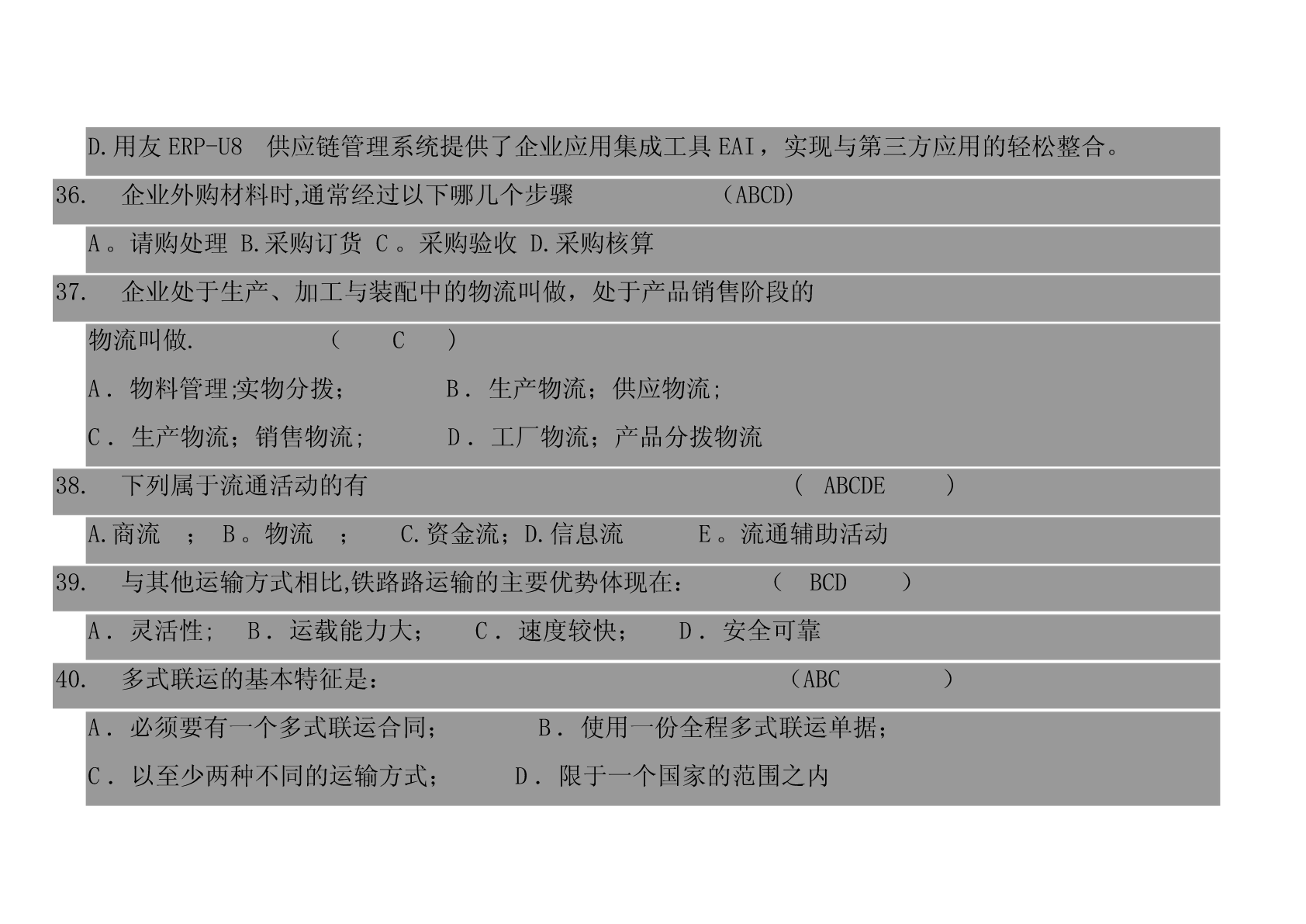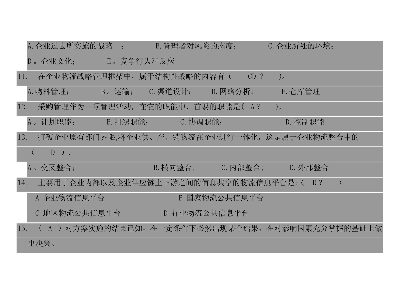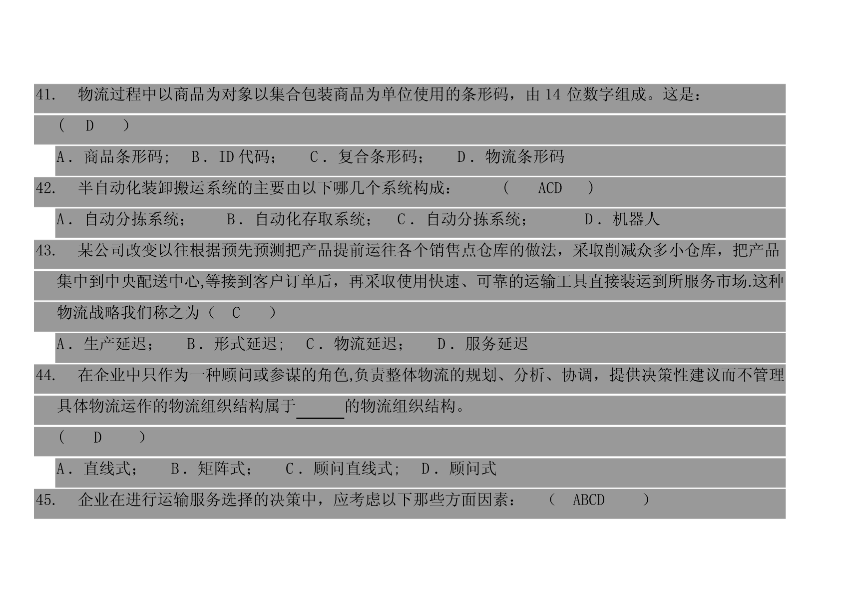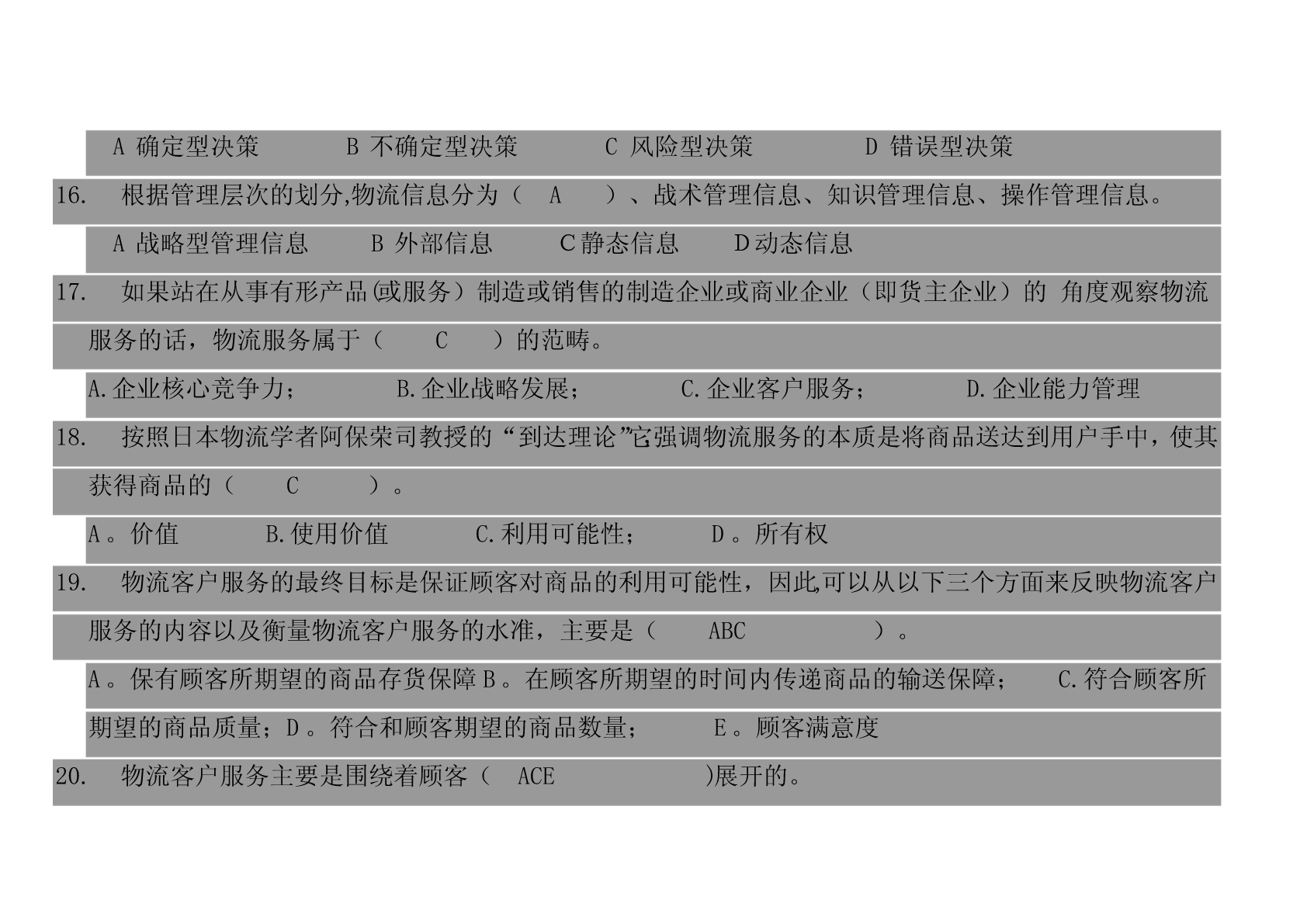 物流管理总复习题二、选择题1.物流是指物资的物质实体由供应者到需求者的流动,(A).A。物资空间位置的变动和时间位置的变动B。物资空间位置的变动和形状性质的变动C.物资时间位置的变动和形状性质的变动D.物资空间位置的变动、时间位置的变动和形状性质的变动2.物资的生产过程的功能是创造物资的(A)。A.形质效用;B.时间效用;C。空间效用;D。社会效用3.流通为实现物资从生产者手中转移到消费者手中的目的,克服(A).A。供需之间的产品的所有权距离、空间距离和时间距离B.供需之间的产品的所有权距离、空间距离和观察距离C。供需之间的产品的所有权距离、观察距离和时间距离D.供需之间的产品的观察距离、空间距离和时间距离4.按照企业物流的垂直结构,属于作业层的内容有(ABE)。A.发货与进货运输;B。装卸搬运C.用料管理;D.系统控制;E。流通加工5.物流科学的发展经过(ABC)过程.A。以P.D命名物流科学的时代;B。以命名物流科学的时代C。供应链管理时代;D。萌芽时代;E.流通时代6.战略性物流网络规划的目标是,(D?).A。利润最大化;B.成本最小化C。服务最优化;D.利润最大与服务最优之间的平衡7.物流决策三角形中处于首要地位的是(D?)。A.库存战略;B。运输战略;C.客户服务目标;D。选址战略8.物流管理的最终目标是(A).A。用户服务;B。渠道设计;C。网络分析;D.物料管理9.战略目标应满足的要求是(AC?).A.可接受性;B。灵活性;C。可度量性;D.适应性E。易理解性10.企业的战略决策往往要受到几个因素的影响,它们是(ABCE)。A.企业过去所实施的战略;B.管理者对风险的态度;C.企业所处的环境;D。企业文化;E。竞争行为和反应11.在企业物流战略管理框架中,属于结构性战略的内容有(CD?)。A.物料管理;B。运输;C.渠道设计;D.网络分析;E.仓库管理12.采购管理作为一项管理活动,在它的职能中,首要的职能是(A?)。A。计划职能;B.组织职能;C.协调职能;D.控制职能13.打破企业原有部门界限,将企业供、产、销物流在企业进行一体化,这是属于企业物流整合中的(D).A。交叉整合;B.横向整合;C.内部整合;D.外部整合14.主要用于企业内部以及企业供应链上下游之间的信息共享的物流信息平台是:(D?)A企业物流信息平台B国家物流公共信息平台C地区物流公共信息平台D行业物流公共信息平台15.(A)对方案实施的结果已知,在一定条件下必然出现某个结果,在对影响因素充分掌握的基础上做出决策。A确定型决策B不确定型决策C风险型决策D错误型决策16.根据管理层次的划分,物流信息分为(A)、战术管理信息、知识管理信息、操作管理信息。A战略型管理信息B外部信息C静态信息D动态信息17.如果站在从事有形产品(或服务)制造或销售的制造企业或商业企业(即货主企业)的角度观察物流服务的话,物流服务属于(C)的范畴。A.企业核心竞争力;B.企业战略发展;C.企业客户服务;D.企业能力管理18.按照日本物流学者阿保荣司教授的“到达理论”,它强调物流服务的本质是将商品送达到用户手中,使其获得商品的(C)。A。价值B.使用价值C.利用可能性;D。所有权19.物流客户服务的最终目标是保证顾客对商品的利用可能性,因此,可以从以下三个方面来反映物流客户服务的内容以及衡量物流客户服务的水准,主要是(ABC)。A。保有顾客所期望的商品存货保障B。在顾客所期望的时间内传递商品的输送保障;C.符合顾客所期望的商品质量;D。符合和顾客期望的商品数量;E。顾客满意度20.物流客户服务主要是围绕着顾客(ACE)展开的。A。所期望的商品;B。所期望的服务;C.所期望的订货周期;D所期望的时间安排;E。所期望的质量21.物流客户服务的衡量通常表现为以下执行标准(BCDE)。A.运输准时率;B。库存保有率;C.订货周期D.配送率;E.质量合格率22.为支持企业的核心产品(或服务)而提供的服务称为(B)A。物流服务B.客户服务C.质量服务D.产品服务23.顾客在购买商品的时候,购买的是(C)A.商品本身B.信息C服务产品组合D.有形产品24.以下哪个观点阐明了现代物流作为商品供应保障系统或者说后勤保障系统的基本特征和要求(C)。A.第三方物流理论B.第四方物流理论C到达理论D.距离理论25.物流企业的(B)是用来支持物流服务商品销售的。A。标准化管理B.客户服务C成本管理D。技术设备26.作为顾客服务一部分的物流服务,其作用有(ABD)。A.建立良好的客户关系B.提高产品在客户心目中的价值C提高客户满