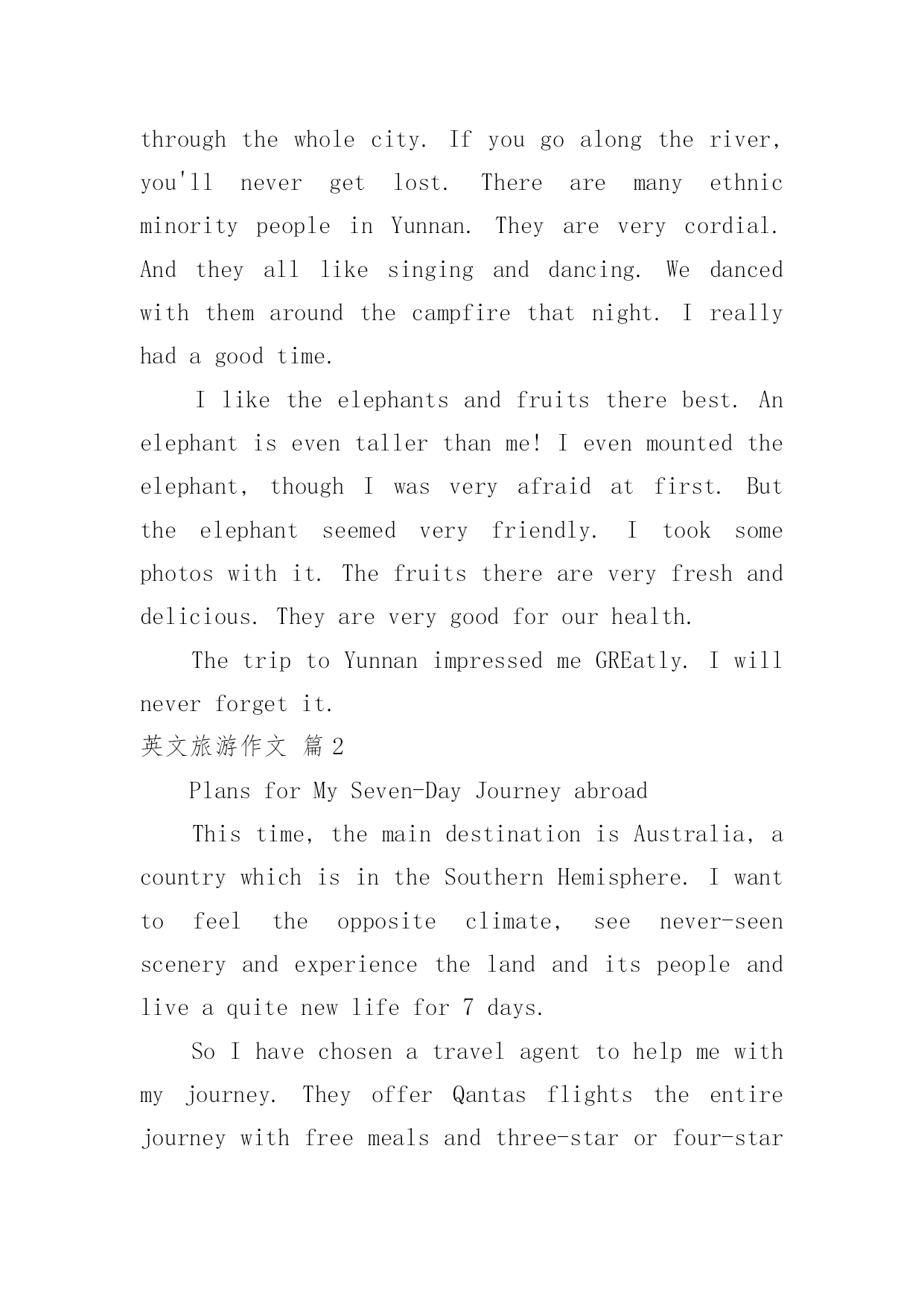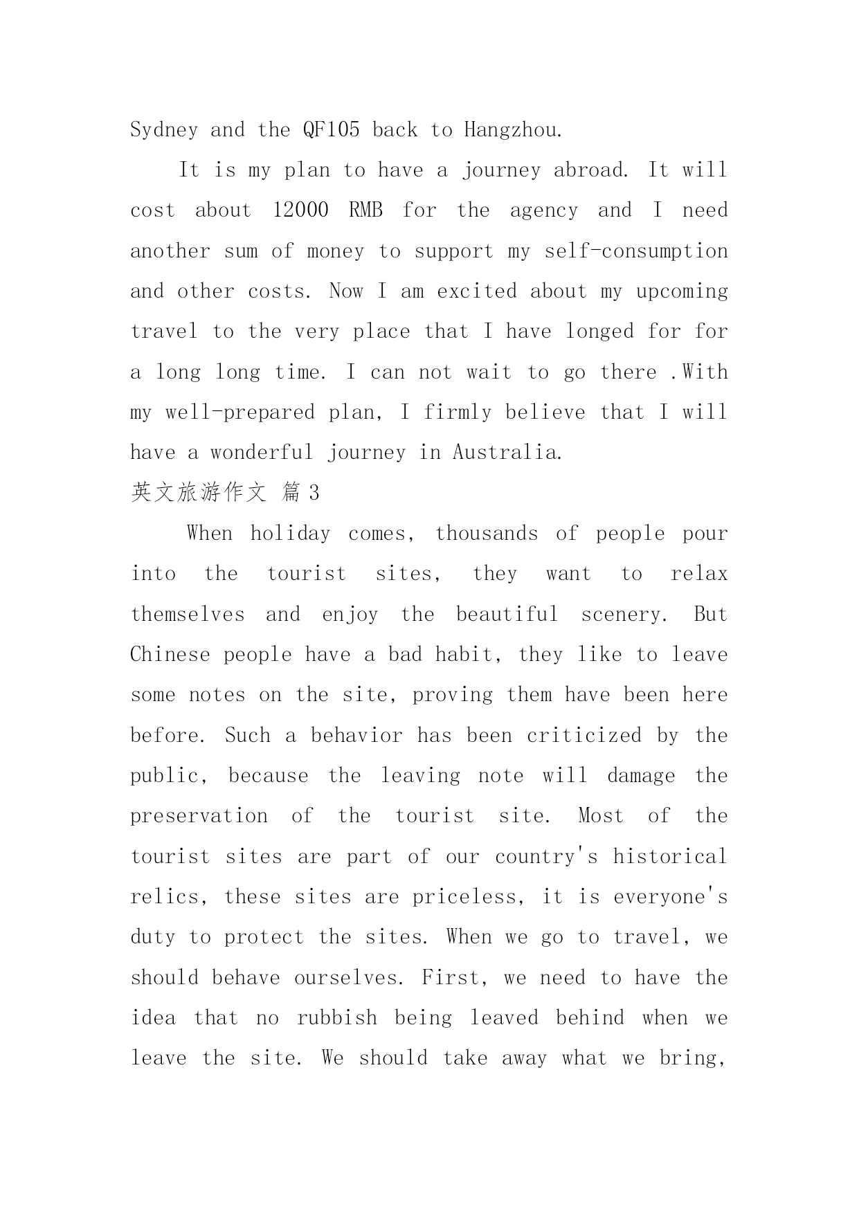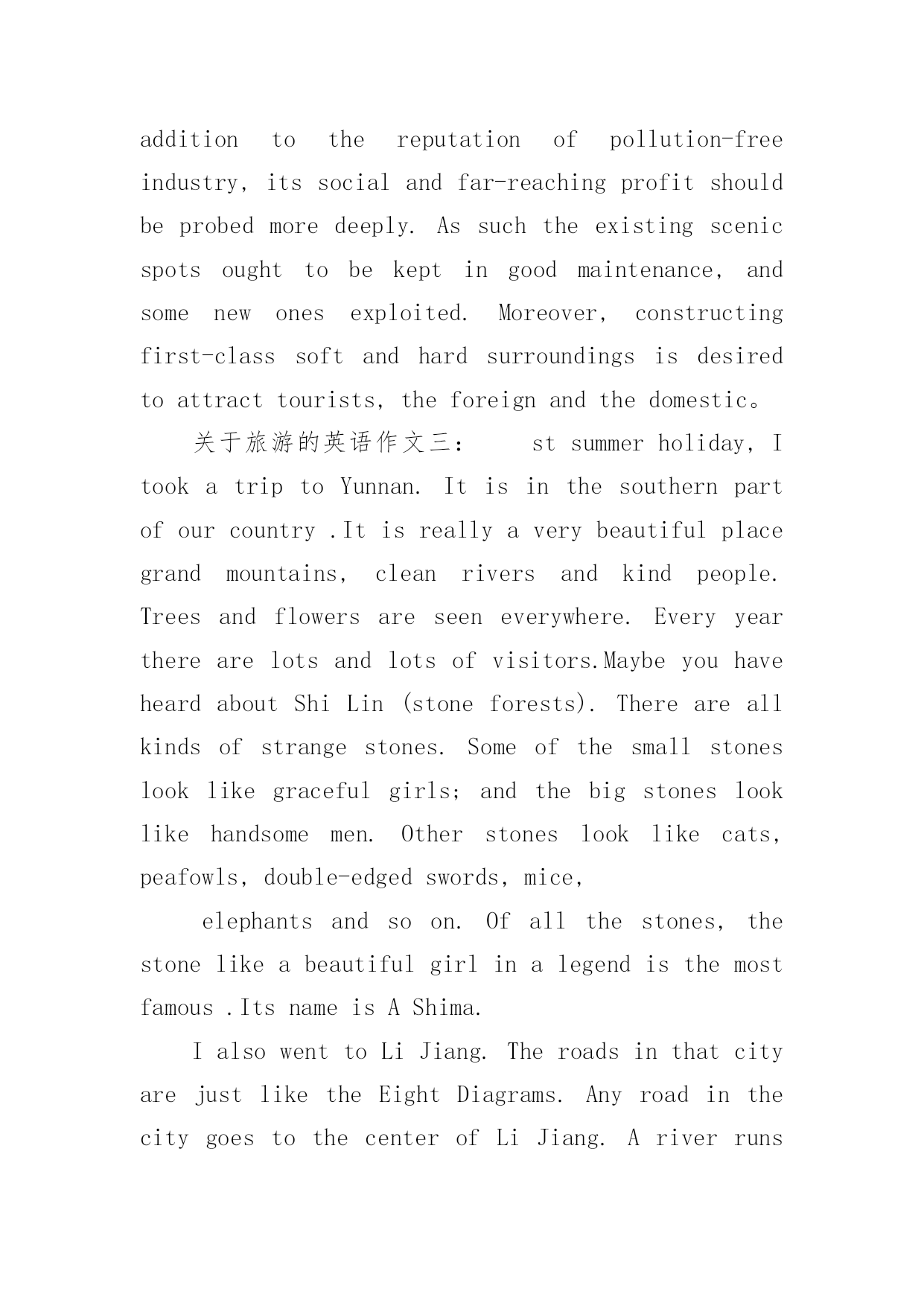英文旅游作文有关英文旅游作文10篇在平凡的学习、工作、生活中,大家都写过作文吧,写作文可以锻炼我们的独处习惯,让自己的心静下来,思考自己未来的方向。那么一般作文是怎么写的呢?下面是小编为大家整理的英文旅游作文10篇,仅供参考,希望能够帮助到大家。英文旅游作文篇1Therearevariedwaysofdefiningtourism.Somepeopleregarditasapollution-freeindustry;othersthinkofitaninvisibleschool,Botharebasedonanacceptedfactthattourismcannotonlyproduceprofitsbearingnopollutionalongwith,buthelpbroadenknowledgeandfortifyhealthy.Asidefromtheabovethereexistsawidespreadtheory,claimingthatwhateverisoftheabilitytoincreaseincapitalbelongstoproductiveindustry.Inthissense,tourismshouldholdapositioninthescopeandoughttobetreatedassuch.Itistruethatthereissomesenseinthetheory,yetanotherequallyorevenmoreimportantaspectshouldbegrantedmorepublicityto.Tourism,intermsofitsobjectivepurposes,hasasocialfunctionwhichcontributestohumancommunication.Comingfromvadoussocialbackgrounds,havingmotivesandgoalsofeverykind,touristsgettogether,drawcloseandexchangeideasoftheirown,fromwhichafreshstateofmindwillbecreated.Sowhatkindofproductionisit?Tothequestionweshouldhavegoodreasontogiveaproperanswer:itisaspiritproduction,areproductionofrelationsofproduction.Andthemorefrequentlysuchexchangesaremade,themoregoodtheywilldotopromotingsocialandeconomicdevelopmentofthemutual.Ifitisthecasethatmakingmoneythroughtourismmeansadentwehavemade,soitforetellsafortunetoprovideculturalservicealongwithtourism.Therefore,tokeepcloseeyesonthelatterinvolveschangingourmindsfirst,thatis,tourismisbynomeansapureeconomicconcept,buttakesplentyofideologicalactivitiesasitscontent.Tosumup,unlikeothereconomicforms,theprofitsfromtourismeconomycannotbemeasuredcompletelybymeansofhowmuchoutputvalue,profit,andforeignexchangeitwillproduce.Inadditiontothereputationofpollution-freeindustry,itssocialandfar-reachingprofitshouldbeprobedmoredeeply.Assuchtheexistingscenicspotsoughttobekeptingoodmaintenance,andsomenewonesexploited.Moreover,constructingfirst-classsoftandhardsurroundingsisdesiredtoattracttourists,theforeignandthedomestic。关于旅游的英语作文三:stsummerholiday,ItookatriptoYunnan.Itisinthesouther