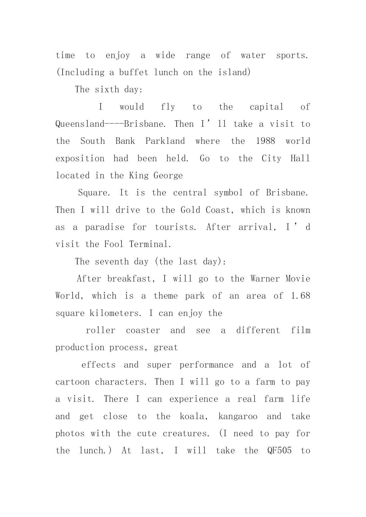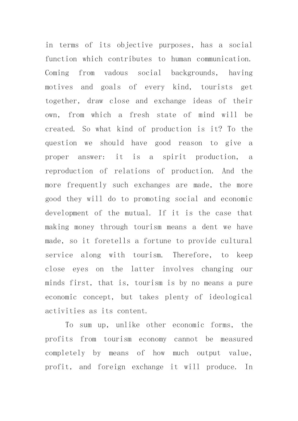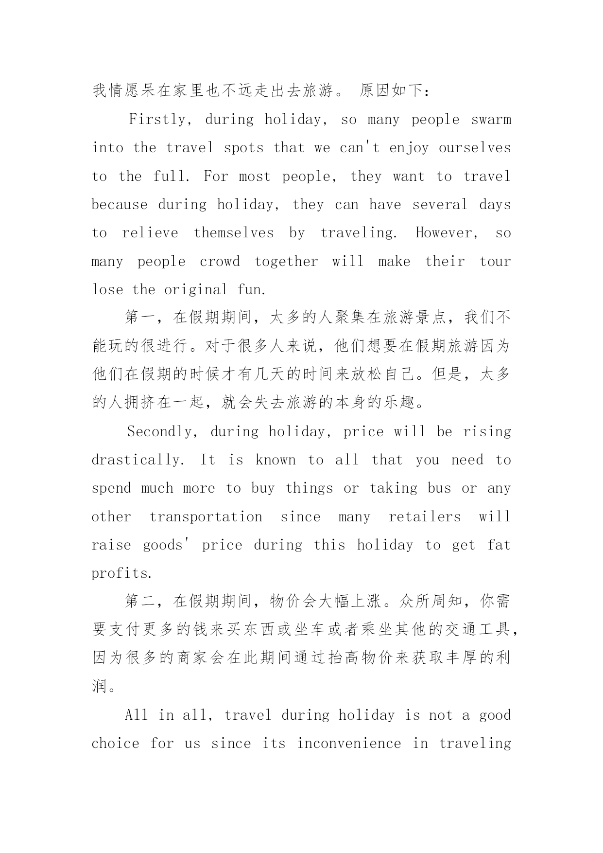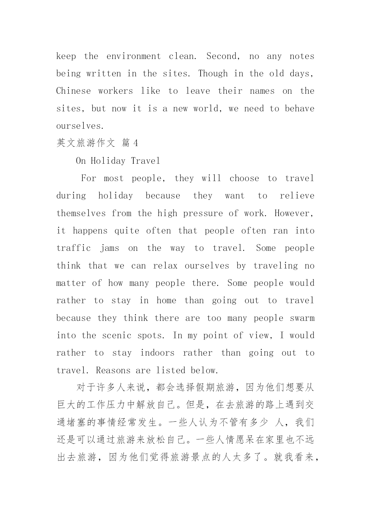 英文旅游作文有关英文旅游作文10篇在平凡的学习、工作、生活中,大家都写过作文吧,写作文可以锻炼我们的独处习惯,让自己的心静下来,思考自己未来的方向。那么一般作文是怎么写的呢?下面是小编为大家整理的英文旅游作文10篇,仅供参考,希望能够帮助到大家。英文旅游作文篇1Therearevariedwaysofdefiningtourism.Somepeopleregarditasapollution-freeindustry;othersthinkofitaninvisibleschool,Botharebasedonanacceptedfactthattourismcannotonlyproduceprofitsbearingnopollutionalongwith,buthelpbroadenknowledgeandfortifyhealthy.Asidefromtheabovethereexistsawidespreadtheory,claimingthatwhateverisoftheabilitytoincreaseincapitalbelongstoproductiveindustry.Inthissense,tourismshouldholdapositioninthescopeandoughttobetreatedassuch.Itistruethatthereissomesenseinthetheory,yetanotherequallyorevenmoreimportantaspectshouldbegrantedmorepublicityto.Tourism,intermsofitsobjectivepurposes,hasasocialfunctionwhichcontributestohumancommunication.Comingfromvadoussocialbackgrounds,havingmotivesandgoalsofeverykind,touristsgettogether,drawcloseandexchangeideasoftheirown,fromwhichafreshstateofmindwillbecreated.Sowhatkindofproductionisit?Tothequestionweshouldhavegoodreasontogiveaproperanswer:itisaspiritproduction,areproductionofrelationsofproduction.Andthemorefrequentlysuchexchangesaremade,themoregoodtheywilldotopromotingsocialandeconomicdevelopmentofthemutual.Ifitisthecasethatmakingmoneythroughtourismmeansadentwehavemade,soitforetellsafortunetoprovideculturalservicealongwithtourism.Therefore,tokeepcloseeyesonthelatterinvolveschangingourmindsfirst,thatis,tourismisbynomeansapureeconomicconcept,buttakesplentyofideologicalactivitiesasitscontent.Tosumup,unlikeothereconomicforms,theprofitsfromtourismeconomycannotbemeasuredcompletelybymeansofhowmuchoutputvalue,profit,andforeignexchangeitwillproduce.Inadditiontothereputationofpollution-freeindustry,itssocialandfar-reachingprofitshouldbeprobedmoredeeply.Assuchtheexistingscenicspotsoughttobekeptingoodmaintenance,andsomenewonesexploited.Moreover,constructingfirst-classsoftandhardsurroundingsisdesiredtoattracttourists,theforeignandthedomestic。关于旅游的英语作文三:stsummerholiday,ItookatriptoYunnan.Itisinthesouther