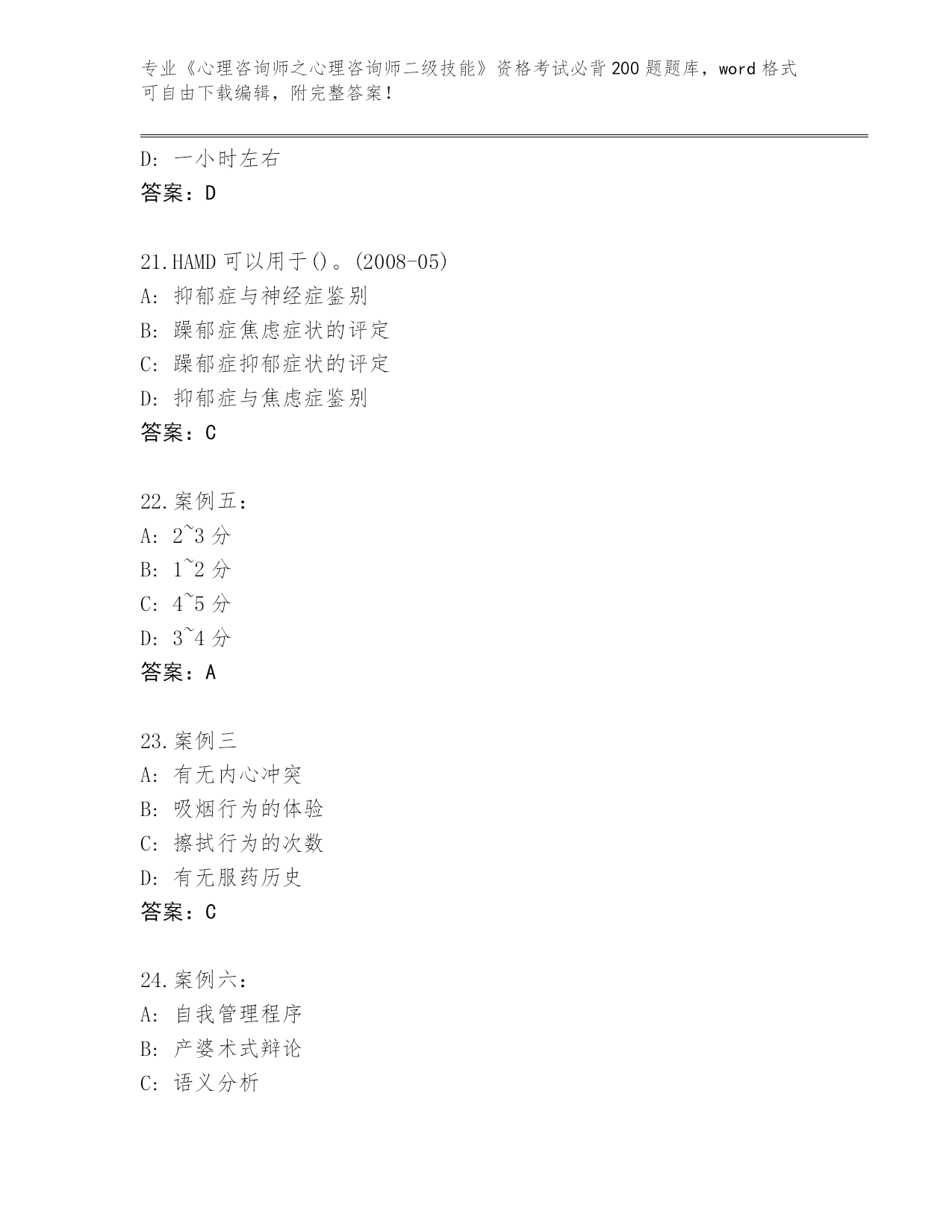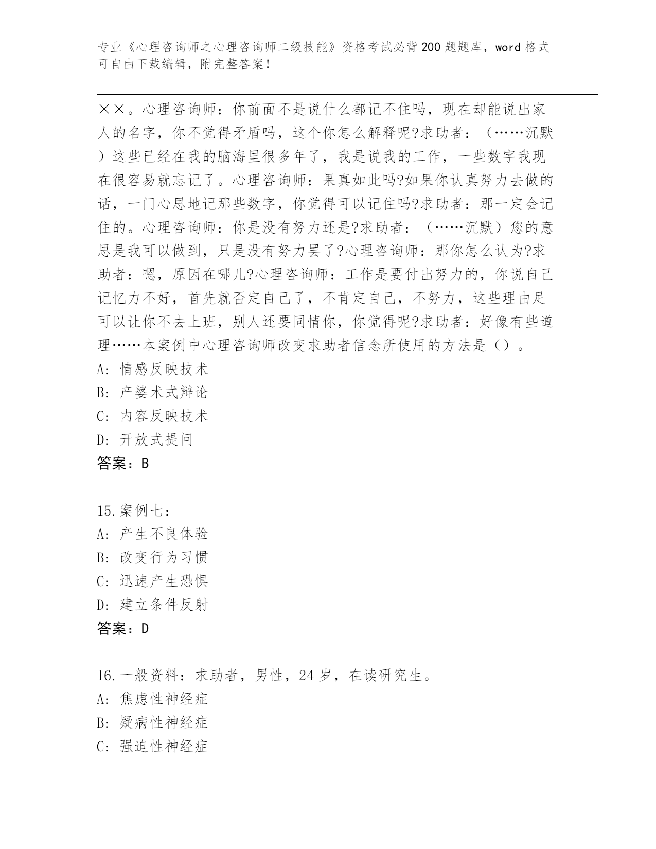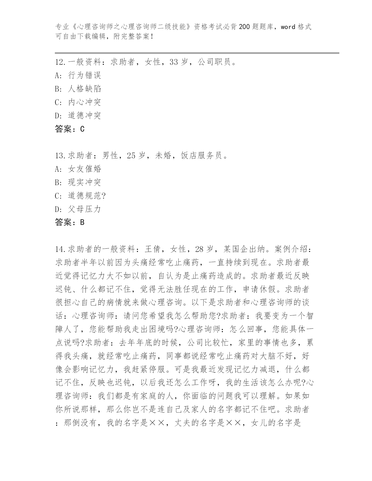 历年甘肃省《心理咨询师之心理咨询师二级技能》资格考试必背200题真题题库a4版可打印