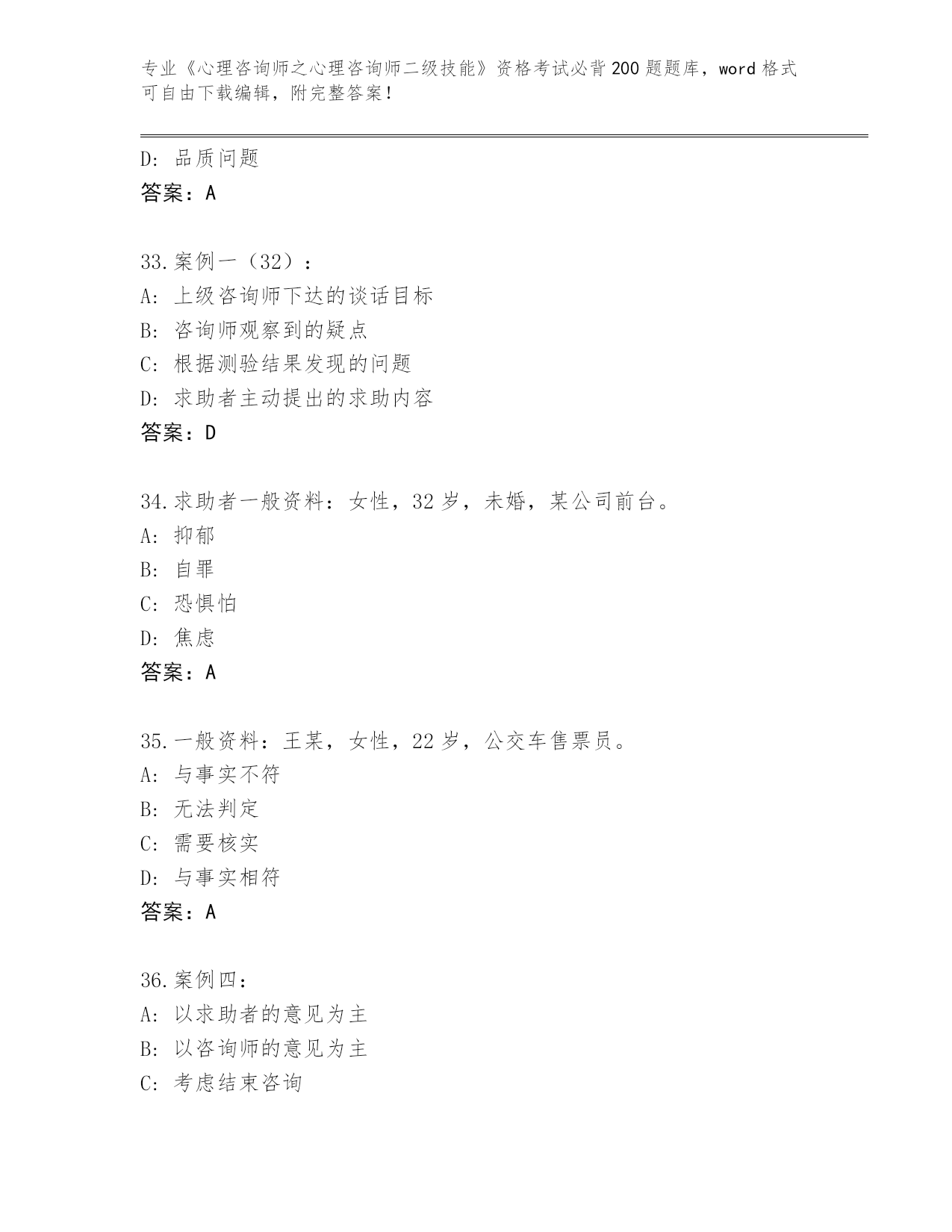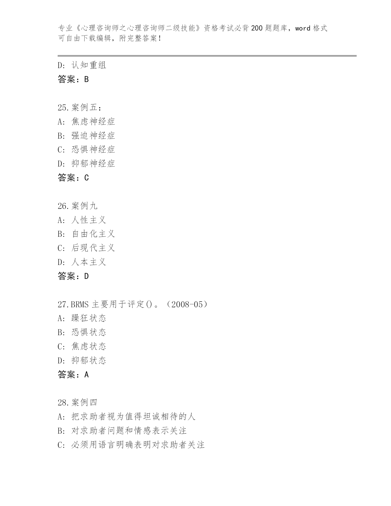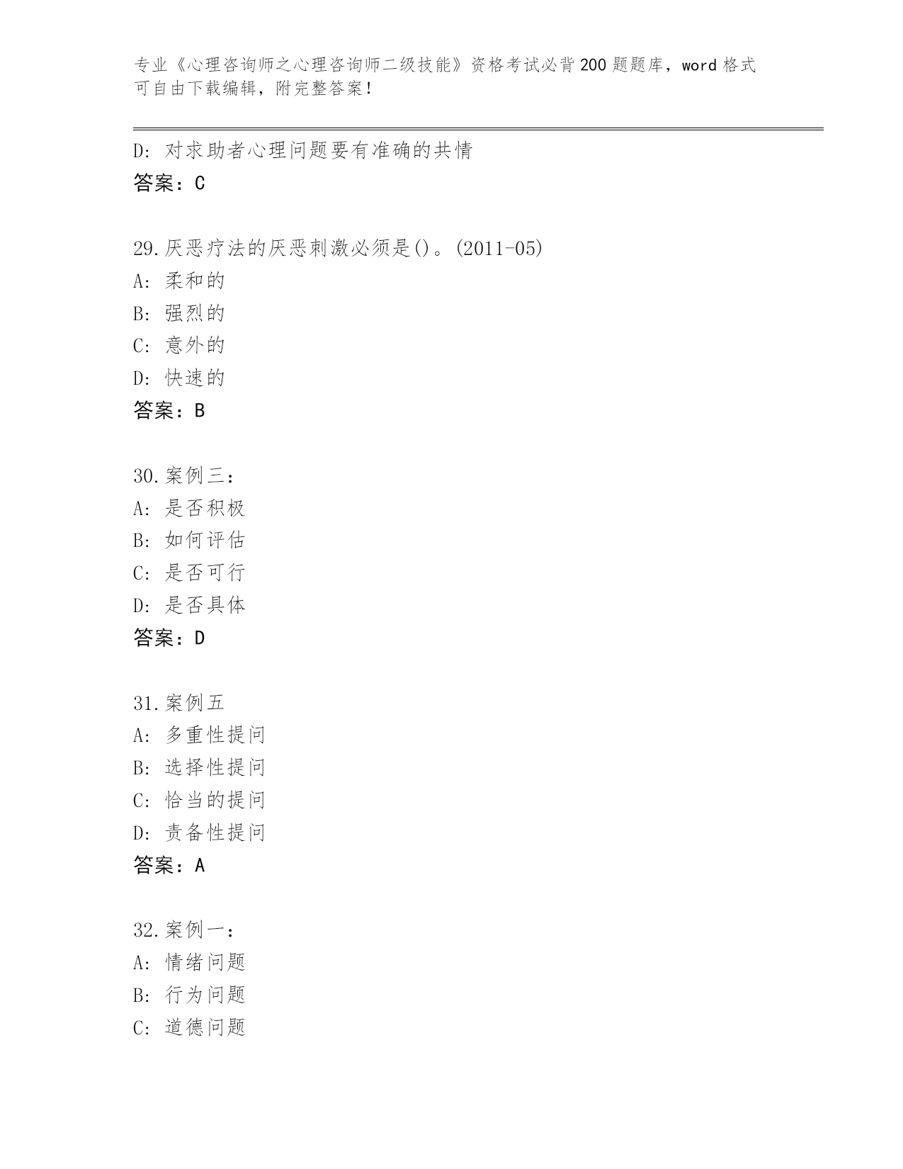 历年甘肃省《心理咨询师之心理咨询师二级技能》资格考试必背200题真题题库a4版可打印