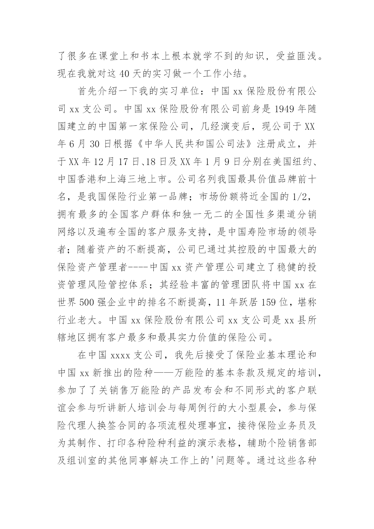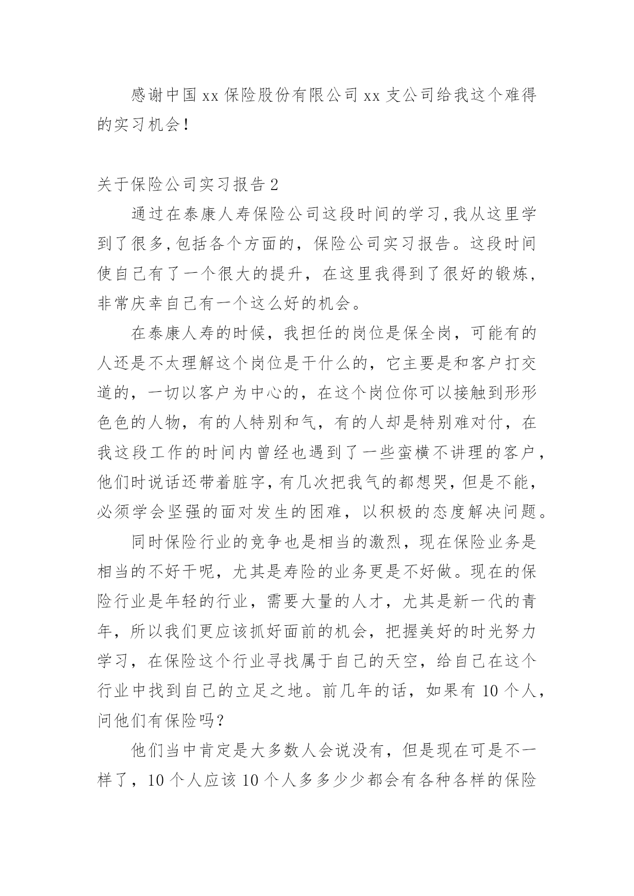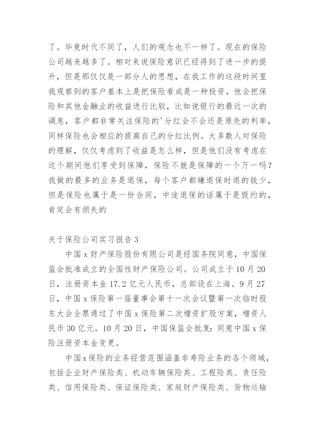 保险公司实习报告关于保险公司实习报告在人们素养不断提高的今天,需要使用报告的情况越来越多,多数报告都是在事情做完或发生后撰写的。其实写报告并没有想象中那么难,以下是小编帮大家整理的关于保险公司实习报告,仅供参考,欢迎大家阅读。关于保险公司实习报告1基本情况:办公实习实习目的:通过办公实习了解保险行业及其营销运作状况,在此基础上把所学的商务和营销理论知识与工作实践密切联系起来,培养实际工作操作能力与分析思考能力,以达到学以致用,并积累一定的社会处世经验。实习时间:20xx.7.10——20xx.8.20实习地点:xx保险股份有限公司支公司总结报告:今年暑假,我有幸到中国xx保险股份有限公司xx支公司进行了为期40天的实习,在这一个多月的实习中我学到了很多在课堂上和书本上根本就学不到的知识,受益匪浅。现在我就对这40天的实习做一个工作小结。首先介绍一下我的实习单位:中国xx保险股份有限公司xx支公司。中国xx保险股份有限公司前身是1949年随国建立的中国第一家保险公司,几经演变后,现公司于XX年6月30日根据《中华人民共和国公司法》注册成立,并于XX年12月17日、18日及XX年1月9日分别在美国纽约、中国香港和上海三地上市。公司名列我国最具价值品牌前十名,是我国保险行业第一品牌;市场份额将近全国的1/2,拥有最多的全国客户群体和独一无二的全国性多渠道分销网络以及遍布全国的客户服务支持,是中国寿险市场的领导者;随着资产的不断提高,公司已通过其控股的中国最大的保险资产管理者----中国xx资产管理公司建立了稳健的投资管理风险管控体系;其经验丰富的管理团队将中国xx在世界500强企业中的排名不断提高,11年跃居159位,堪称行业老大。中国xx保险股份有限公司xx支公司是xx县所辖地区拥有客户最多和最具实力价值的保险公司。在中国xxxx支公司,我先后接受了保险业基本理论和中国xx新推出的险种——万能险的基本条款及规定的培训,参加了了关销售万能险的产品发布会和不同形式的客户联谊会参与听讲新人培训会与每周例行的大小型晨会,参与保险代理人换签合同的各项流程处理事宜,接待保险业务员及为其制作、打印各种险种利益的演示表格,辅助个险销售部及组训室的其他同事解决工作上的'问题等。通过这些各种形式的工作参与,我学到了很多宝贵的实用知识,主要是:(1)保险方面的理论和知识以及保险行业的现状,使我对保险有了一个更客观、全面的认识,理智的判断,也激发了我对金融学的深化了解和欲学以致用的兴趣。(2)通过对已知资料的分析和与同事们的交流,提高了自我的思考认知能力,通过对保险业的现状的研究和前景的科学预测,进一步引发了我对职业取向的思虑,帮助了我在大学期间进行的职业规划和职业生涯设计。(3)对职场有了初步、真实、贴切的认识,明确了努力和改善方向,通过与同事们和众多的业务员的交往、接触,学到了珍贵的人际交往技巧和处世经验,交到了几位可以虚心请教的长辈朋友,感谢他们对我的指导、教育和思想启迪。(4)电脑办公的实用知识与软件应用技巧,以及处理问题的能力和经验,强化了我对扩展知识和提高能力的学习欲望。(5)勤奋、踏实、认真、负责任做事风格的重要性,只有这样,才能得到认可,才能真正有所收获。当然,以我个人之见也发现了一些小的问题,如保险代理人考核制度不够健全,保险业务员职业素质参差不齐,出勤制度不够完善,分工不定期不够明确等需要改善。这次实践教会了我许多,不仅让我扩展了知识的视野,增长了社会见识,而且为我大学毕业后走向社会打下了坚实基础,是我青春时期的一笔重要财富,使我终生受益。感谢在我实习期间所有帮助过我、教导过我的人!感谢中国xx保险股份有限公司xx支公司给我这个难得的实习机会!关于保险公司实习报告2通过在泰康人寿保险公司这段时间的学习,我从这里学到了很多,包括各个方面的,保险公司实习报告。这段时间使自己有了一个很大的提升,在这里我得到了很好的锻炼,非常庆幸自己有一个这么好的机会。在泰康人寿的时候,我担任的岗位是保全岗,可能有的人还是不太理解这个岗位是干什么的,它主要是和客户打交道的,一切以客户为中心的,在这个岗位你可以接触到形形色色的人物,有的人特别和气,有的人却是特别难对付,在我这段工作的时间内曾经也遇到了一些蛮横不讲理的客户,他们时说话还带着脏字,有几次把我气的都想哭,但是不能,必须学会坚强的面对发生的困难,以积极的态度解决问题。同时保险行业的竞争也是相当的激烈,现在保险业务是相当的不好干呢,尤其是寿险的业务更是不好做。现在的保险行业是年轻的行业,需要大量的人才,尤其是新一代的青年,所以我们更应该抓好面前的机会,把握美好的时光努力学习,在保险这个行业寻找属于自己的天空,给自己在这个行业中找到自己的立足之地。前几年的话,如果有10个人,问他们有保险吗?他们当中肯