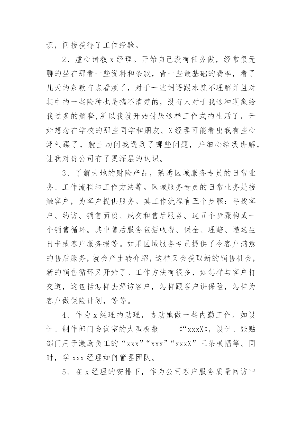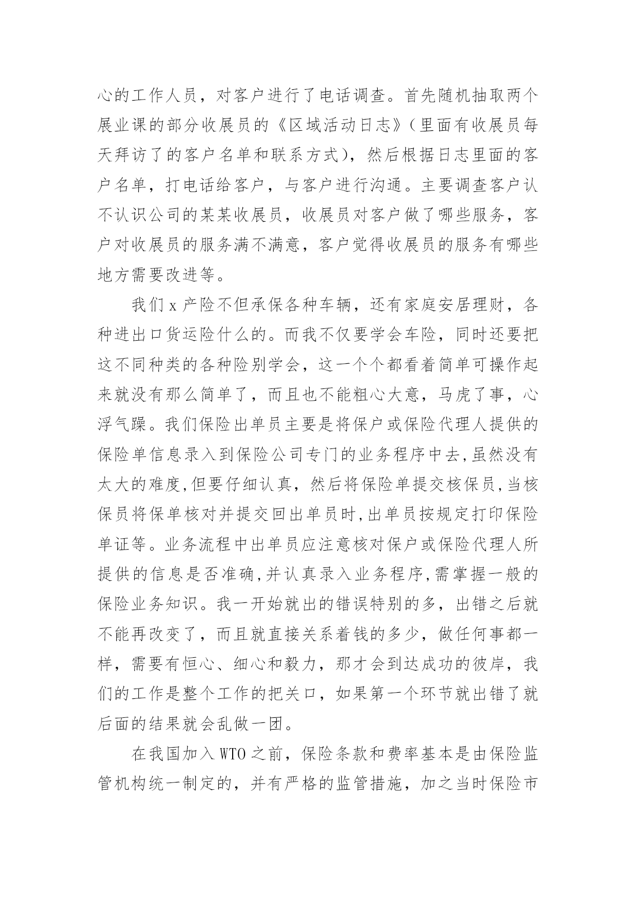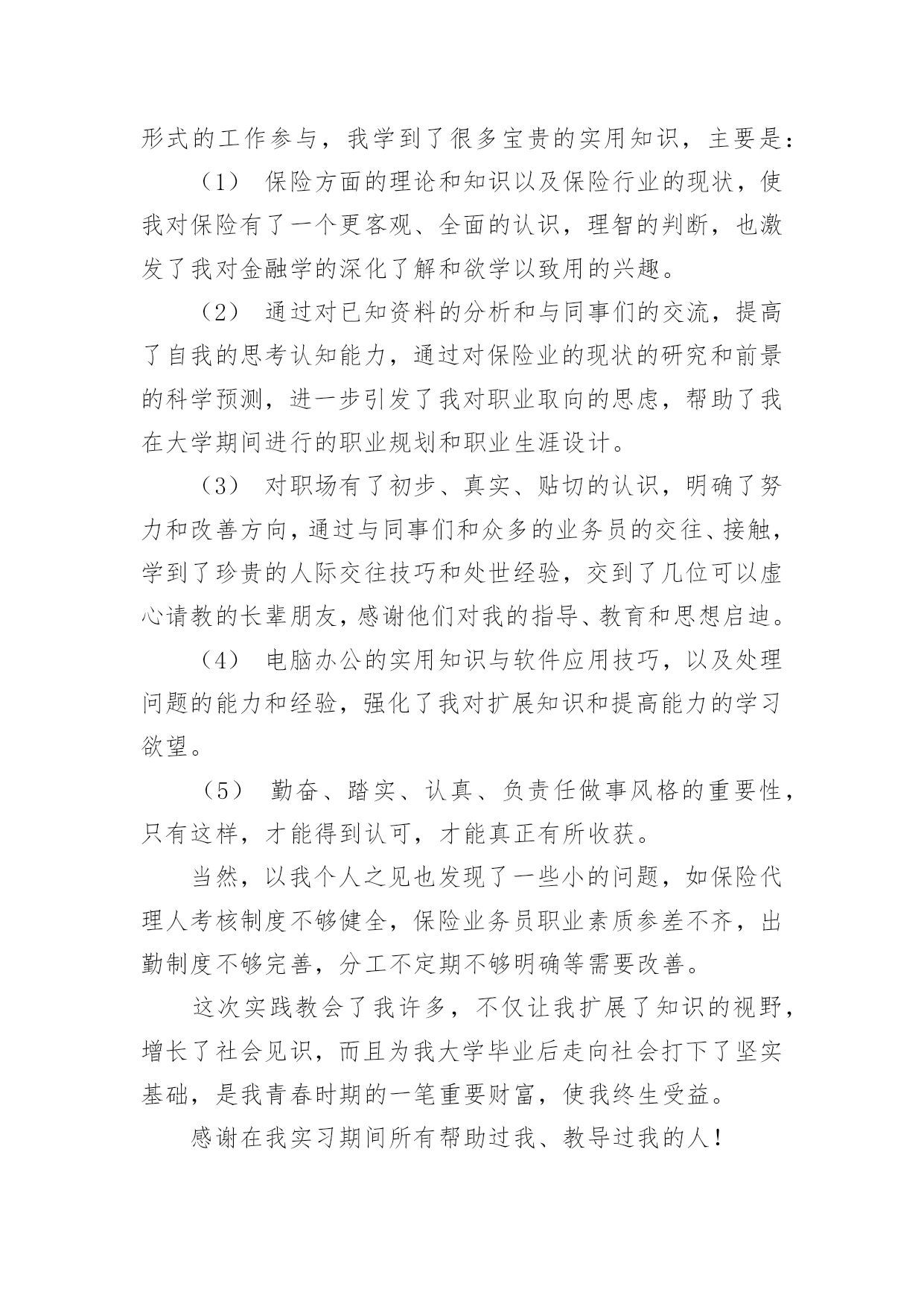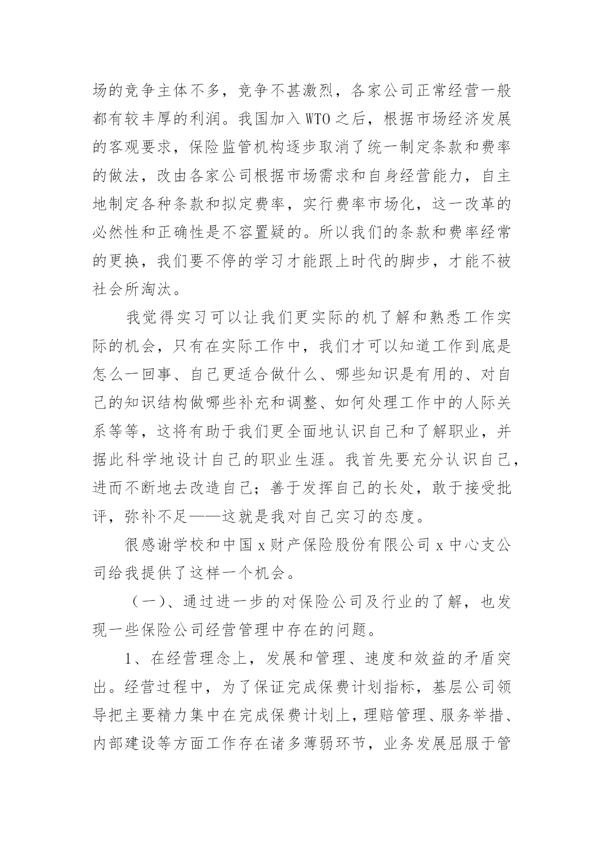 保险公司实习报告关于保险公司实习报告在人们素养不断提高的今天,需要使用报告的情况越来越多,多数报告都是在事情做完或发生后撰写的。其实写报告并没有想象中那么难,以下是小编帮大家整理的关于保险公司实习报告,仅供参考,欢迎大家阅读。关于保险公司实习报告1基本情况:办公实习实习目的:通过办公实习了解保险行业及其营销运作状况,在此基础上把所学的商务和营销理论知识与工作实践密切联系起来,培养实际工作操作能力与分析思考能力,以达到学以致用,并积累一定的社会处世经验。实习时间:20xx.7.10——20xx.8.20实习地点:xx保险股份有限公司支公司总结报告:今年暑假,我有幸到中国xx保险股份有限公司xx支公司进行了为期40天的实习,在这一个多月的实习中我学到了很多在课堂上和书本上根本就学不到的知识,受益匪浅。现在我就对这40天的实习做一个工作小结。首先介绍一下我的实习单位:中国xx保险股份有限公司xx支公司。中国xx保险股份有限公司前身是1949年随国建立的中国第一家保险公司,几经演变后,现公司于XX年6月30日根据《中华人民共和国公司法》注册成立,并于XX年12月17日、18日及XX年1月9日分别在美国纽约、中国香港和上海三地上市。公司名列我国最具价值品牌前十名,是我国保险行业第一品牌;市场份额将近全国的1/2,拥有最多的全国客户群体和独一无二的全国性多渠道分销网络以及遍布全国的客户服务支持,是中国寿险市场的领导者;随着资产的不断提高,公司已通过其控股的中国最大的保险资产管理者----中国xx资产管理公司建立了稳健的投资管理风险管控体系;其经验丰富的管理团队将中国xx在世界500强企业中的排名不断提高,11年跃居159位,堪称行业老大。中国xx保险股份有限公司xx支公司是xx县所辖地区拥有客户最多和最具实力价值的保险公司。在中国xxxx支公司,我先后接受了保险业基本理论和中国xx新推出的险种——万能险的基本条款及规定的培训,参加了了关销售万能险的产品发布会和不同形式的客户联谊会参与听讲新人培训会与每周例行的大小型晨会,参与保险代理人换签合同的各项流程处理事宜,接待保险业务员及为其制作、打印各种险种利益的演示表格,辅助个险销售部及组训室的其他同事解决工作上的'问题等。通过这些各种形式的工作参与,我学到了很多宝贵的实用知识,主要是:(1)保险方面的理论和知识以及保险行业的现状,使我对保险有了一个更客观、全面的认识,理智的判断,也激发了我对金融学的深化了解和欲学以致用的兴趣。(2)通过对已知资料的分析和与同事们的交流,提高了自我的思考认知能力,通过对保险业的现状的研究和前景的科学预测,进一步引发了我对职业取向的思虑,帮助了我在大学期间进行的职业规划和职业生涯设计。(3)对职场有了初步、真实、贴切的认识,明确了努力和改善方向,通过与同事们和众多的业务员的交往、接触,学到了珍贵的人际交往技巧和处世经验,交到了几位可以虚心请教的长辈朋友,感谢他们对我的指导、教育和思想启迪。(4)电脑办公的实用知识与软件应用技巧,以及处理问题的能力和经验,强化了我对扩展知识和提高能力的学习欲望。(5)勤奋、踏实、认真、负责任做事风格的重要性,只有这样,才能得到认可,才能真正有所收获。当然,以我个人之见也发现了一些小的问题,如保险代理人考核制度不够健全,保险业务员职业素质参差不齐,出勤制度不够完善,分工不定期不够明确等需要改善。这次实践教会了我许多,不仅让我扩展了知识的视野,增长了社会见识,而且为我大学毕业后走向社会打下了坚实基础,是我青春时期的一笔重要财富,使我终生受益。感谢在我实习期间所有帮助过我、教导过我的人!感谢中国xx保险股份有限公司xx支公司给我这个难得的实习机会!关于保险公司实习报告2通过在泰康人寿保险公司这段时间的学习,我从这里学到了很多,包括各个方面的,保险公司实习报告。这段时间使自己有了一个很大的提升,在这里我得到了很好的锻炼,非常庆幸自己有一个这么好的机会。在泰康人寿的时候,我担任的岗位是保全岗,可能有的人还是不太理解这个岗位是干什么的,它主要是和客户打交道的,一切以客户为中心的,在这个岗位你可以接触到形形色色的人物,有的人特别和气,有的人却是特别难对付,在我这段工作的时间内曾经也遇到了一些蛮横不讲理的客户,他们时说话还带着脏字,有几次把我气的都想哭,但是不能,必须学会坚强的面对发生的困难,以积极的态度解决问题。同时保险行业的竞争也是相当的激烈,现在保险业务是相当的不好干呢,尤其是寿险的业务更是不好做。现在的保险行业是年轻的行业,需要大量的人才,尤其是新一代的青年,所以我们更应该抓好面前的机会,把握美好的时光努力学习,在保险这个行业寻找属于自己的天空,给自己在这个行业中找到自己的立足之地。前几年的话,如果有10个人,问他们有保险吗?他们当中肯