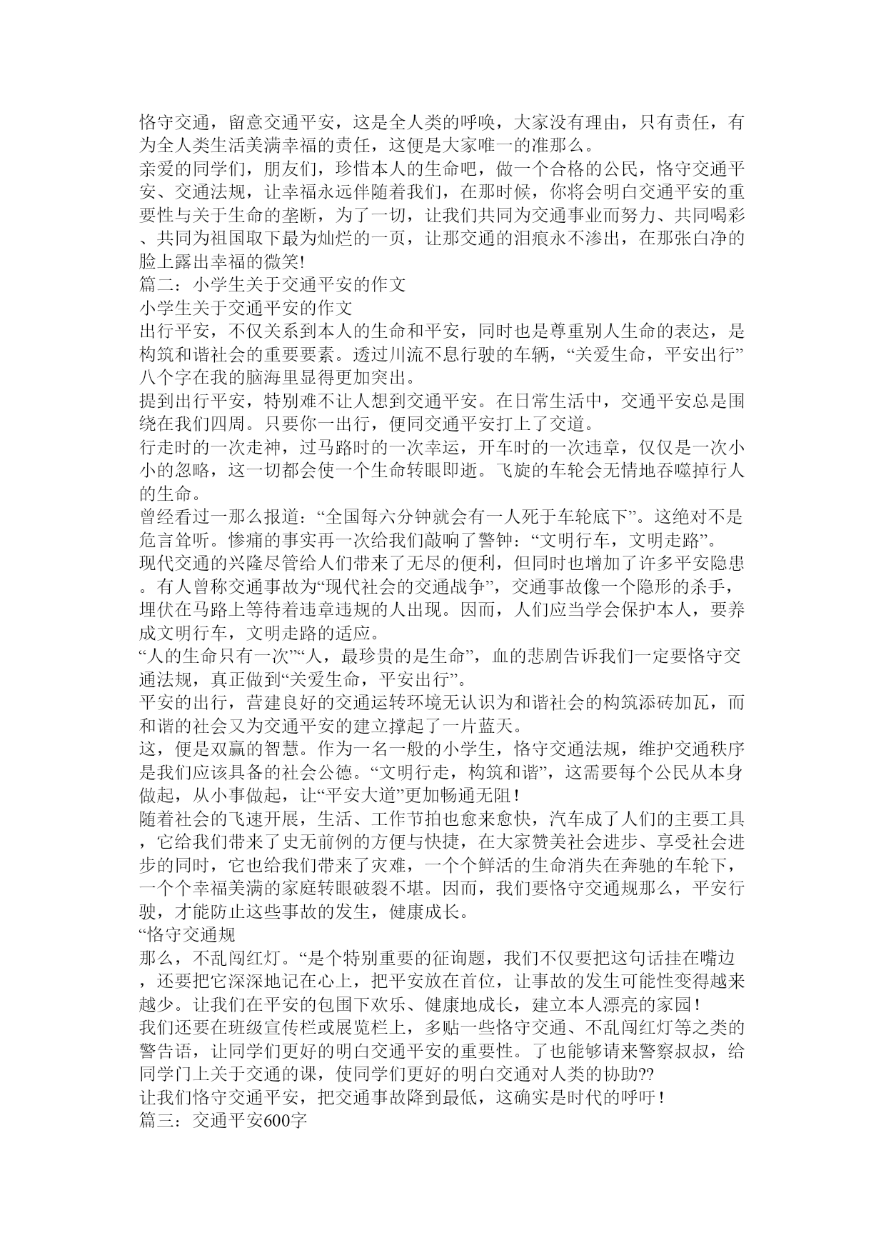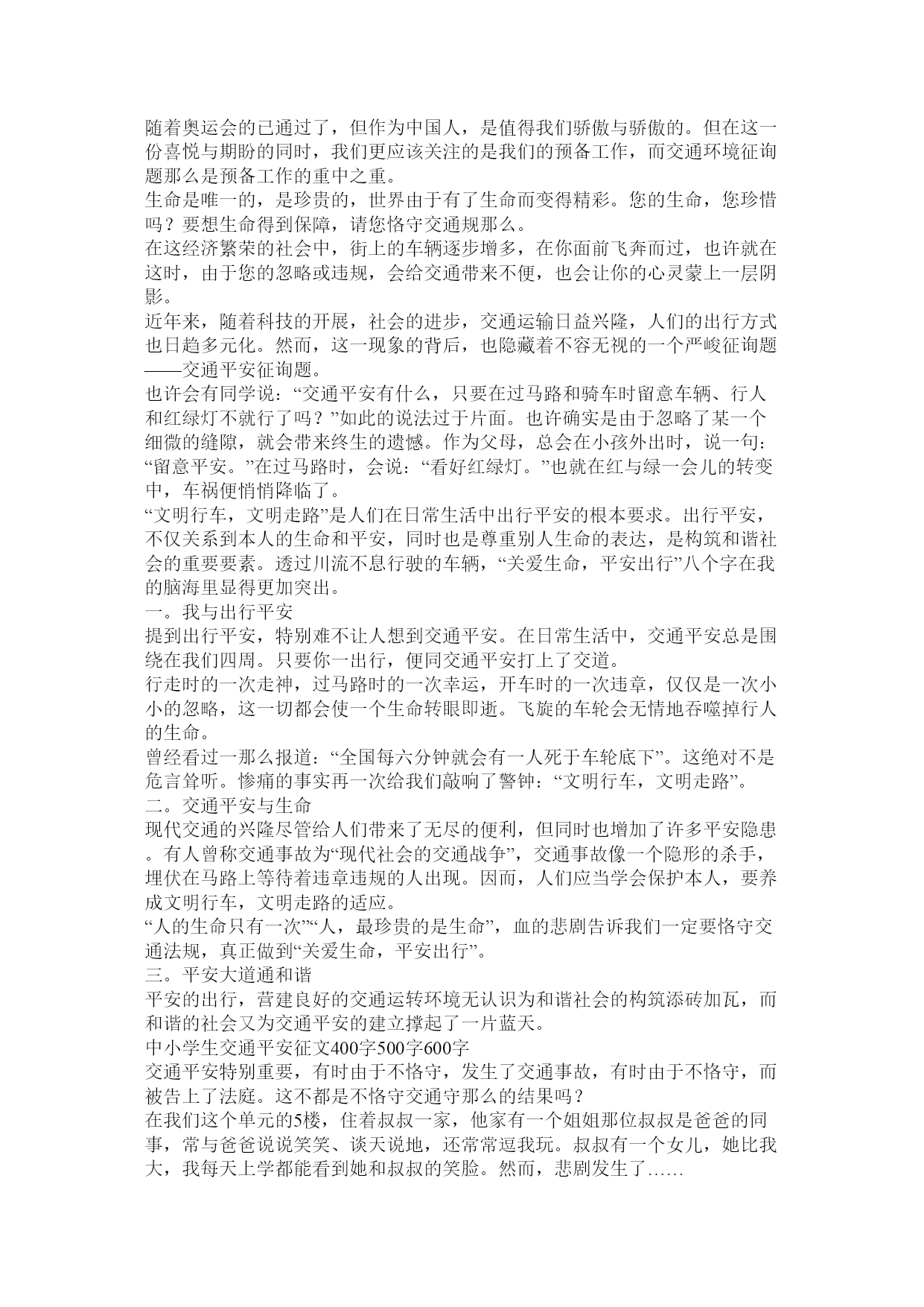 交通平安作文400字篇一:交通平安(450字)作文精选作文:交通平安(450字)作文在我们的生活中,常常会发生交通事故,比方1月20日广西河池国道210线上发生的发生的事:一辆挂广东牌照的小轿车由南宁往贵州方向行驶,与一辆金城江区驶往东兰县方向挂广西牌照,满载乘客的中型一般客车对向相撞,造成中型客车侧翻在国道上,事故导致轿车内司机和一乘客当场死亡,小车内2人和中巴车司机不同程度受伤。事实上交通事故能够防止发生,只要恪守交通规那么,便能够有效防止交通事故的发生。据统计,2004年交通事故超速行驶占死亡数的17。2%,客货运输车辆肇事占死亡总数的38。6;无证驾驶人驾驶机车肇事占死亡总数的20。9%;三年以下驾龄驾驶人肇事占死亡总数31。7%;夜间行驶事故占死亡总数的45。6%,死亡总数超过了100%。假设我们在生活中多留意一些交通法规,例如:行人要走人行道,红灯停,绿灯行;不要酒后开车;不要超速行驶交通事故便会化为零。同时,我们还要学会推断:交警的手势和红绿灯不一样该按哪个走;没有人行道也没有红绿灯、交警如何过马路只要我们留意交通法规同时恪守的话,那交通事故便会跟我们再见了。山东济南历下区解一小四年级:王子杰篇一:关于交通平安的作文关于交通平安的作文人的生活中,处处离不开交通,时时刻刻在交通之间彷徨,也许,一刹那的忽略,会给你带来终身的遗憾。因而,为了朋友,为了家人,为了本人,我们应该恪守交通,做一个知法、守法的好公民。在日常生活中,许多人不留意交通平安,而鲁莽行事,司机驾驶着汽车一跃而过,在那飞奔的过程中,留下了什么,只留下了飘扬的尘埃吗?你是否看到身后隐藏着莫大的恐惧与伤感;喝醉的司机在“晨曦”的朦胧中颠着,昏昏沉沉中,没有任何思想的你,怎能冒如此险。当我看见“司机一滴酒,亲人一行泪”的标语,我为你们的无知而深感惭愧,难道在你们心中,它确实是一张白纸吗?只代表着空虚吗?这使我堕入了沉思!曾经,在一个炎夏里,一个小男孩为了捡一个心爱的小球,不顾一切的直奔马路中央,也许,他还小,单纯的思想并没想到那可悲的后果,真是不幸,一辆卡车飞奔而来,把他压得粉身碎骨,把他永远压在土地深层,父母的泪犹如倾盆大雨,从天而降,又有谁能够听到他们的呼唤,上天是仁慈的,同情之心油然而生,可又能如何样,只有无可奈何的哀叹,忍耐着痛苦,真是可悲啊!一辆载重汽车由于超载,请保存此标记载以致被滚下那万丈深渊,那轰隆声回响山谷,可那位年轻的司机却抛弃一切毫无声息的走了,走得那样伤感,那样的悲伤。那一件件血淋淋的事实在我们的眼前一闪而过,可那悲伤的情景却铭记于心,那是血的挣扎,那是痛苦的泪痕,那是同情的目光。在一次次恶剧不断重演之时,我们是否有所体会,难道不应该为此而珍惜珍贵的生命吗?也许他们死不瞑目,在黑背地,那哀叹永不停息。也许,他们在告诫我们:应该留意交通平安,珍惜拥有。这是他们唯一的话语,这是他们一生中最为精典的佳话。他们已深深领悟到生命的脆弱与坚韧,它取决于你对它的珍惜。恪守交通,留意交通平安,这是全人类的呼唤,大家没有理由,只有责任,有为全人类生活美满幸福的责任,这便是大家唯一的准那么。亲爱的同学们,朋友们,珍惜本人的生命吧,做一个合格的公民,恪守交通平安、交通法规,让幸福永远伴随着我们,在那时候,你将会明白交通平安的重要性与关于生命的垄断,为了一切,让我们共同为交通事业而努力、共同喝彩、共同为祖国取下最为灿烂的一页,让那交通的泪痕永不渗出,在那张白净的脸上露出幸福的微笑!篇二:小学生关于交通平安的作文小学生关于交通平安的作文出行平安,不仅关系到本人的生命和平安,同时也是尊重别人生命的表达,是构筑和谐社会的重要要素。透过川流不息行驶的车辆,“关爱生命,平安出行”八个字在我的脑海里显得更加突出。提到出行平安,特别难不让人想到交通平安。在日常生活中,交通平安总是围绕在我们四周。只要你一出行,便同交通平安打上了交道。行走时的一次走神,过马路时的一次幸运,开车时的一次违章,仅仅是一次小小的忽略,这一切都会使一个生命转眼即逝。飞旋的车轮会无情地吞噬掉行人的生命。曾经看过一那么报道:“全国每六分钟就会有一人死于车轮底下”。这绝对不是危言耸听。惨痛的事实再一次给我们敲响了警钟:“文明行车,文明走路”。现代交通的兴隆尽管给人们带来了无尽的便利,但同时也增加了许多平安隐患。有人曾称交通事故为“现代社会的交通战争”,交通事故像一个隐形的杀手,埋伏在马路上等待着违章违规的人出现。因而,人们应当学会保护本人,要养成文明行车,文明走路的适应。“人的生命只有一次”“人,最珍贵的是生命”,血的悲剧告诉我们一定要恪守交通法规,真正做到“关爱生命,平安出行”。平安的出行,营建良好的交通运转环境无认识为和谐社会的构筑添砖加瓦,而和谐的社会又为交通平