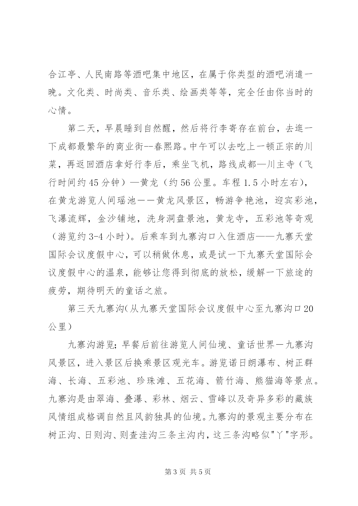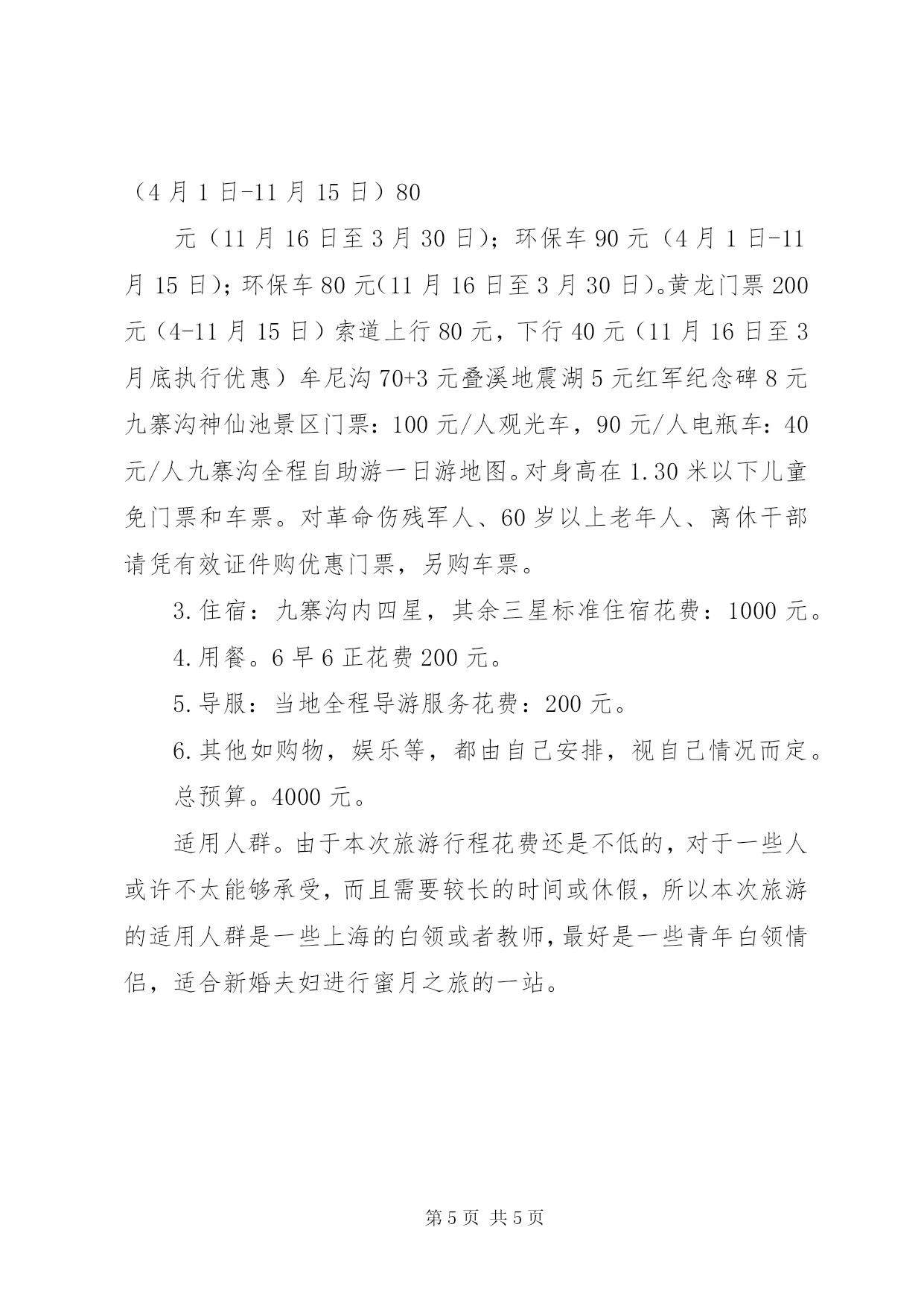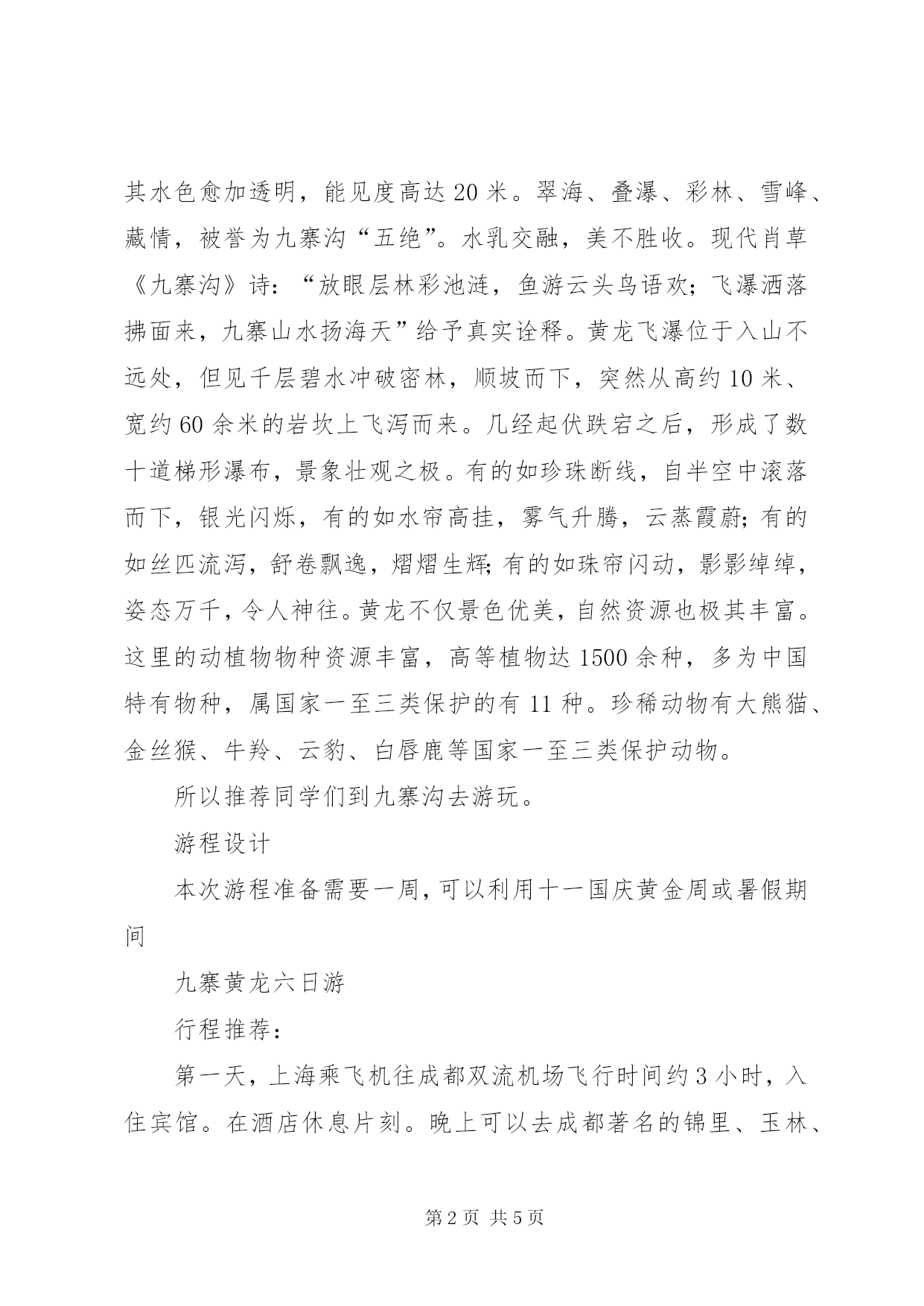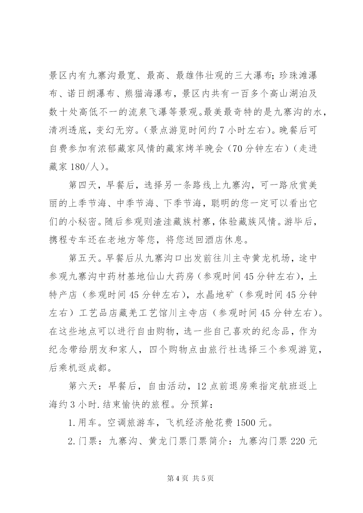 第PAGE\*Arabic\*MERGEFORMAT5页共NUMPAGES\*MERGEFORMAT5页旅游项目策划方案九寨沟黄龙位于XX省阿坝藏族羌族自治区,是我国公布的第一批国家级重点风景名胜区。1990年,九寨沟被列为“中国旅游胜地四十佳”之首,1991年被列入联合国《世界风景名录》,1992年12月又由联合国教科文组织批准,正式列入《世界自然遗产名录》,从此登上世界旅游的宝座,成为中外游客向往的神奇的“梦幻世界”。因沟内分布着9个藏族村寨而得名,海拔2000~3000米,属高山深谷碳酸盐堰塞地貌,以翠海(高山湖泊)、叠海、彩林、雪山、藏情“五绝”驰名中外,被誉为“梦仙境”和“童话世界”。主景长沙有六公里,面积6万多公顷,有长海、剑岩、诺日朗、树正、扎如、黑海六大景观,呈“y”字形分布,以水景最为奇丽,泉、瀑、河、滩将108个海子连缀一体,碧蓝澄澈,千颜万色,多姿多彩,“水在树间流,树在水中长”,有“黄山归来不看岳,九寨归来不看水”和“世界水景之王”之称。九寨沟特别美丽,国家中唯一获得“世界自然遗产”的“童话世界”。九寨沟的山水形成于第四纪古冰川时期,海拔在2000—3200之间,现保秋天里的九寨沟存着大量第四纪古冰川遗迹。九寨沟的地下水富含大量的碳酸钙质,湖底、湖堤、湖畔水边均可见乳白色碳酸钙形成的结晶体,来自雪山、森林。九寨沟的活水泉又异常洁净,加之梯形状的湖泊层层过滤,其水色愈加透明,能见度高达20米。翠海、叠瀑、彩林、雪峰、藏情,被誉为九寨沟“五绝”。水乳交融,美不胜收。现代肖草《九寨沟》诗:“放眼层林彩池涟,鱼游云头鸟语欢;飞瀑洒落拂面来,九寨山水扬海天”给予真实诠释。黄龙飞瀑位于入山不远处,但见千层碧水冲破密林,顺坡而下,突然从高约10米、宽约60余米的岩坎上飞泻而来。几经起伏跌宕之后,形成了数十道梯形瀑布,景象壮观之极。有的如珍珠断线,自半空中滚落而下,银光闪烁,有的如水帘高挂,雾气升腾,云蒸霞蔚;有的如丝匹流泻,舒卷飘逸,熠熠生辉;有的如珠帘闪动,影影绰绰,姿态万千,令人神往。黄龙不仅景色优美,自然资源也极其丰富。这里的动植物物种资源丰富,高等植物达1500余种,多为中国特有物种,属国家一至三类保护的有11种。珍稀动物有大熊猫、金丝猴、牛羚、云豹、白唇鹿等国家一至三类保护动物。所以推荐同学们到九寨沟去游玩。游程设计本次游程准备需要一周,可以利用十一国庆黄金周或暑假期间九寨黄龙六日游行程推荐:第一天,上海乘飞机往成都双流机场飞行时间约3小时,入住宾馆。在酒店休息片刻。晚上可以去成都著名的锦里、玉林、合江亭、人民南路等酒吧集中地区,在属于你类型的酒吧消遣一晚。文化类、时尚类、音乐类、绘画类等等,完全任由你当时的心情。第二天,早晨睡到自然醒,然后将行李寄存在前台,去逛一下成都最繁华的商业街--春熙路。中午可以去吃上一顿正宗的川菜,再返回酒店拿好行李后,乘坐飞机,路线成都—川主寺(飞行时间约45分钟)—黄龙(约56公里。车程1.5小时左右),在黄龙游览人间瑶池――黄龙风景区,畅游争艳池,迎宾彩池,飞瀑流辉,金沙铺地,洗身洞盘景池,黄龙寺,五彩池等奇观(游览约3-4小时)。后乘车到九寨沟口入住酒店——九寨天堂国际会议度假中心,可以稍做休息,或是试一下九寨天堂国际会议度假中心的温泉,能够让您得到彻底的放松,缓解一下旅途的疲劳,期待明天的童话之旅。第三天九寨沟(从九寨天堂国际会议度假中心至九寨沟口20公里)九寨沟游览;早餐后前往游览人间仙境、童话世界―九寨沟风景区,进入景区后换乘景区观光车。游览诺日朗瀑布、树正群海、长海、五彩池、珍珠滩、五花海、箭竹海、熊猫海等景点。九寨沟是由翠海、叠瀑、彩林、烟云、雪峰以及奇异多彩的藏族风情组成格调自然且风韵独具的仙境。九寨沟的景观主要分布在树正沟、日则沟、则查洼沟三条主沟内,这三条沟略似"丫"字形。景区内有九寨沟最宽、最高、最雄伟壮观的三大瀑布;珍珠滩瀑布、诺日朗瀑布、熊猫海瀑布,景区内共有一百多个高山湖泊及数十处高低不一的流泉飞瀑等景观。最美最奇特的是九寨沟的水,清冽透底,变幻无穷。(景点游览时间约7小时左右)。晚餐后可自费参加有浓郁藏家风情的藏家烤羊晚会(70分钟左右)(走进藏家180/人)。第四天,早餐后,选择另一条路线上九寨沟,可一路欣赏美丽的上季节海、中季节海、下季节海,聪明的您一定可以看出它们的小秘密。随后参观则渣洼藏族村寨,体验藏族风情。游毕后,携程专车还在老地方等您,将您送回酒店休息。第五天。早餐后从九寨沟口出发前往川主寺黄龙机场,途中参观九寨沟中药材基地仙山大药房(参观时间45分钟左右),土特产店(参观时间45分钟左右),水晶地矿(参观时间45分钟左右)工艺品店藏羌工艺馆川主寺店(参观时间45分钟左右)。在这些地点可以进行自由购物,选一些