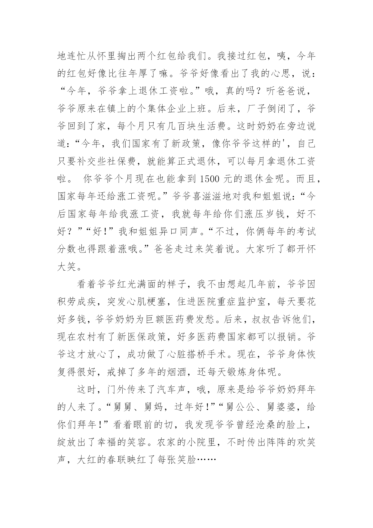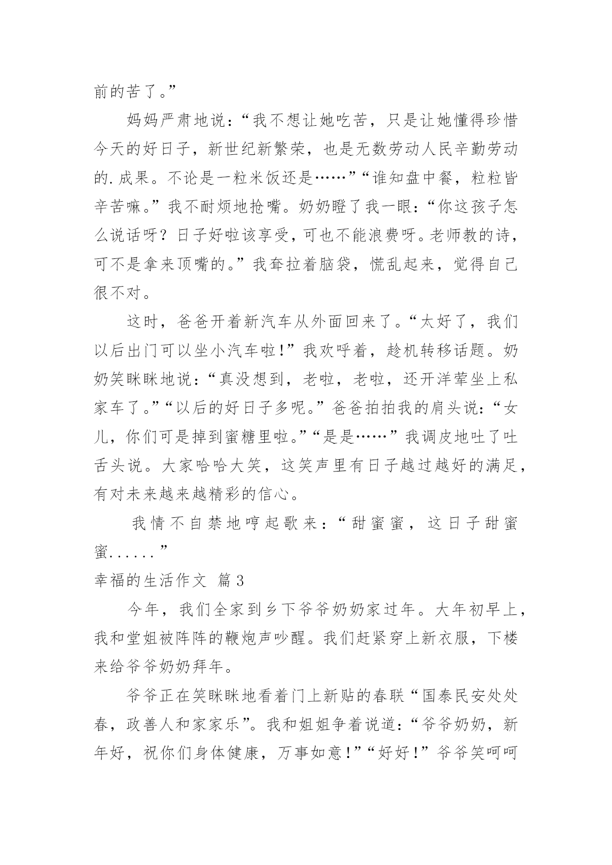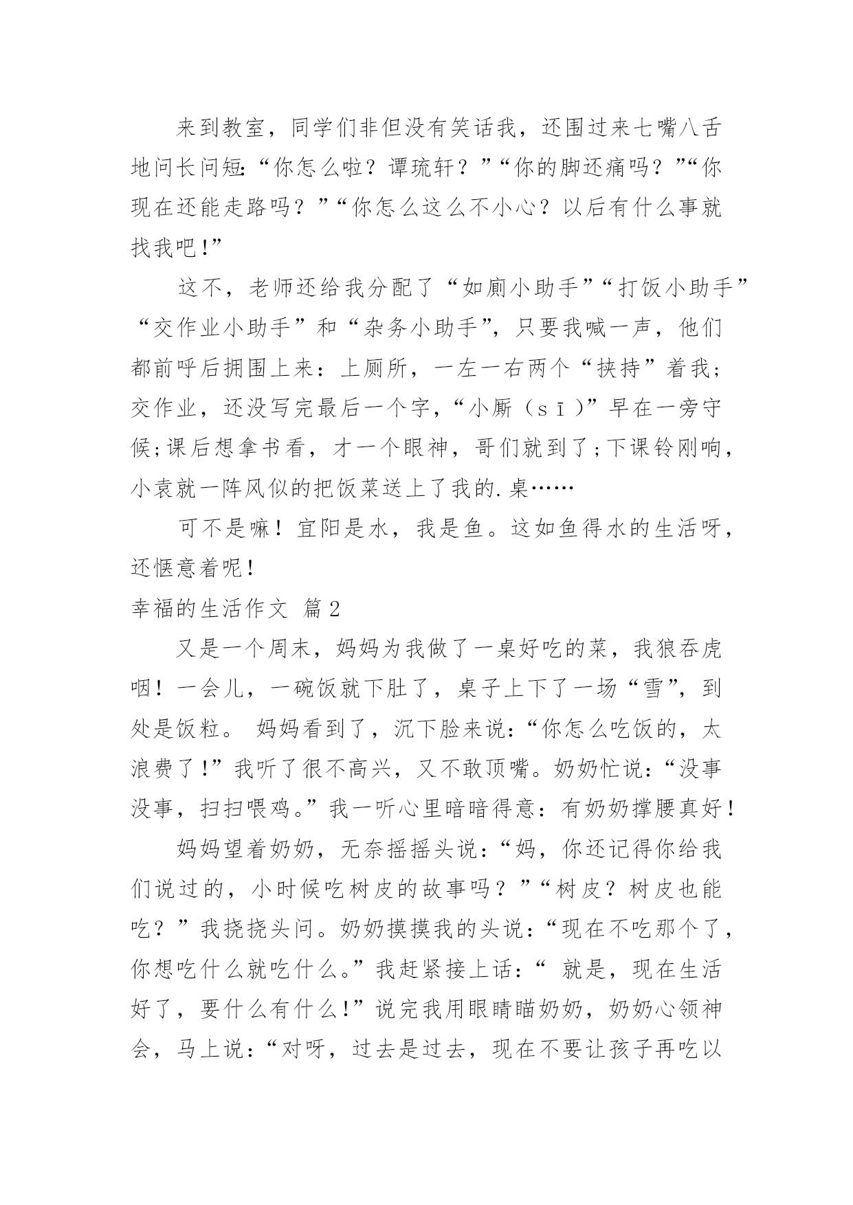 幸福的生活作文【实用】幸福的生活作文三篇在日常的学习、工作、生活中,说到作文,大家肯定都不陌生吧,作文是从内部言语向外部言语的过渡,即从经过压缩的简要的、自己能明白的语言,向开展的、具有规范语法结构的、能为他人所理解的外部语言形式的转化。你知道作文怎样写才规范吗?下面是小编整理的幸福的生活作文4篇,欢迎大家分享。幸福的生活作文篇1宜阳是水,我是鱼。可这如鱼得水的生活,却被我的一次摔伤打破了!上石膏!“一条腿”禁下地21天!我的“一条腿”生活开始了!不过,我发现“一条腿”带来的幸福可不止一点点。“衣来伸手,饭来张口”,这可是我如今的真实写照呀!在家里,衣裤有人穿,牙膏有人挤,洗澡有人搓,吃饭有人背,上学还有人驮(tuó),这感觉,爽!而在学校呢,我的“福利”就更多啦!我可以不用做课间操!可以带好多书去教室看个够!可以晚交作业!可以坐着回答问题!这实在是太幸福啦!你看,当妈妈把我驮进学校时,门口的值日老师不但没有拦住我们,反而关切地问:“怎么弄成这样了?快背他进去吧!慢一点儿,慢一点儿啊!”好温暖呀!来到教室,同学们非但没有笑话我,还围过来七嘴八舌地问长问短:“你怎么啦?谭琉轩?”“你的脚还痛吗?”“你现在还能走路吗?”“你怎么这么不小心?以后有什么事就找我吧!”这不,老师还给我分配了“如廁小助手”“打饭小助手”“交作业小助手”和“杂务小助手”,只要我喊一声,他们都前呼后拥围上来:上厕所,一左一右两个“挟持”着我;交作业,还没写完最后一个字,“小厮(sī)”早在一旁守候;课后想拿书看,才一个眼神,哥们就到了;下课铃刚响,小袁就一阵风似的把饭菜送上了我的.桌……可不是嘛!宜阳是水,我是鱼。这如鱼得水的生活呀,还惬意着呢!幸福的生活作文篇2又是一个周末,妈妈为我做了一桌好吃的菜,我狼吞虎咽!一会儿,一碗饭就下肚了,桌子上下了一场“雪”,到处是饭粒。妈妈看到了,沉下脸来说:“你怎么吃饭的,太浪费了!”我听了很不高兴,又不敢顶嘴。奶奶忙说:“没事没事,扫扫喂鸡。”我一听心里暗暗得意:有奶奶撑腰真好!妈妈望着奶奶,无奈摇摇头说:“妈,你还记得你给我们说过的,小时候吃树皮的故事吗?”“树皮?树皮也能吃?”我挠挠头问。奶奶摸摸我的头说:“现在不吃那个了,你想吃什么就吃什么。”我赶紧接上话:“就是,现在生活好了,要什么有什么!”说完我用眼睛瞄奶奶,奶奶心领神会,马上说:“对呀,过去是过去,现在不要让孩子再吃以前的苦了。”妈妈严肃地说:“我不想让她吃苦,只是让她懂得珍惜今天的好日子,新世纪新繁荣,也是无数劳动人民辛勤劳动的.成果。不论是一粒米饭还是……”“谁知盘中餐,粒粒皆辛苦嘛。”我不耐烦地抢嘴。奶奶瞪了我一眼:“你这孩子怎么说话呀?日子好啦该享受,可也不能浪费呀。老师教的诗,可不是拿来顶嘴的。”我耷拉着脑袋,慌乱起来,觉得自己很不对。这时,爸爸开着新汽车从外面回来了。“太好了,我们以后出门可以坐小汽车啦!”我欢呼着,趁机转移话题。奶奶笑眯眯地说:“真没想到,老啦,老啦,还开洋荤坐上私家车了。”“以后的好日子多呢。”爸爸拍拍我的肩头说:“女儿,你们可是掉到蜜糖里啦。”“是是……”我调皮地吐了吐舌头说。大家哈哈大笑,这笑声里有日子越过越好的满足,有对未来越来越精彩的信心。我情不自禁地哼起歌来:“甜蜜蜜,这日子甜蜜蜜......”幸福的生活作文篇3今年,我们全家到乡下爷爷奶奶家过年。大年初早上,我和堂姐被阵阵的鞭炮声吵醒。我们赶紧穿上新衣服,下楼来给爷爷奶奶拜年。爷爷正在笑眯眯地看着门上新贴的春联“国泰民安处处春,政善人和家家乐”。我和姐姐争着说道:“爷爷奶奶,新年好,祝你们身体健康,万事如意!”“好好!”爷爷笑呵呵地连忙从怀里掏出两个红包给我们。我接过红包,咦,今年的红包好像比往年厚了嘛。爷爷好像看出了我的心思,说:“今年,爷爷拿上退休工资啦。”哦,真的吗?听爸爸说,爷爷原来在镇上的个集体企业上班。后来,厂子倒闭了,爷爷回到了家,每个月只有几百块生活费。这时奶奶在旁边说道:“今年,我们国家有了新政策,像你爷爷这样的',自己只要补交些社保费,就能算正式退休,可以每月拿退休工资啦。你爷爷个月现在也能拿到1500元的退休金呢。而且,国家每年还给涨工资呢。”爷爷喜滋滋地对我和姐姐说:“今后国家每年给我涨工资,我就每年给你们涨压岁钱,好不好?”“好!”我和姐姐异口同声。“不过,你俩每年的考试分数也得跟着涨哦。”爸爸走过来笑着说。大家听了都开怀大笑。看着爷爷红光满面的样子,我不由想起几年前,爷爷因积劳成疾,突发心肌梗塞,住进医院重症监护室,每天要花好多钱,爷爷奶奶为巨额医药费发愁。后来,叔叔告诉他们,现在农村有了新医保政策,好多医药费国家都可以报销。爷爷这才放心了,成功做了心脏搭桥手术。现在,爷爷身体恢复得很好,戒掉了多年的烟酒,还每天锻炼身体呢。这时,门