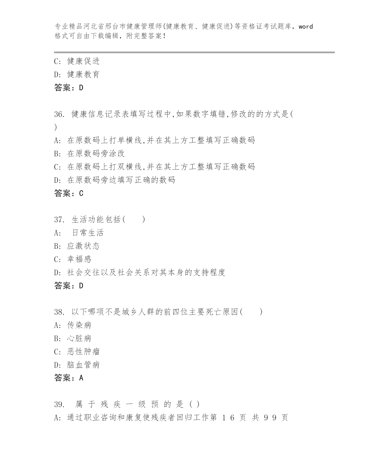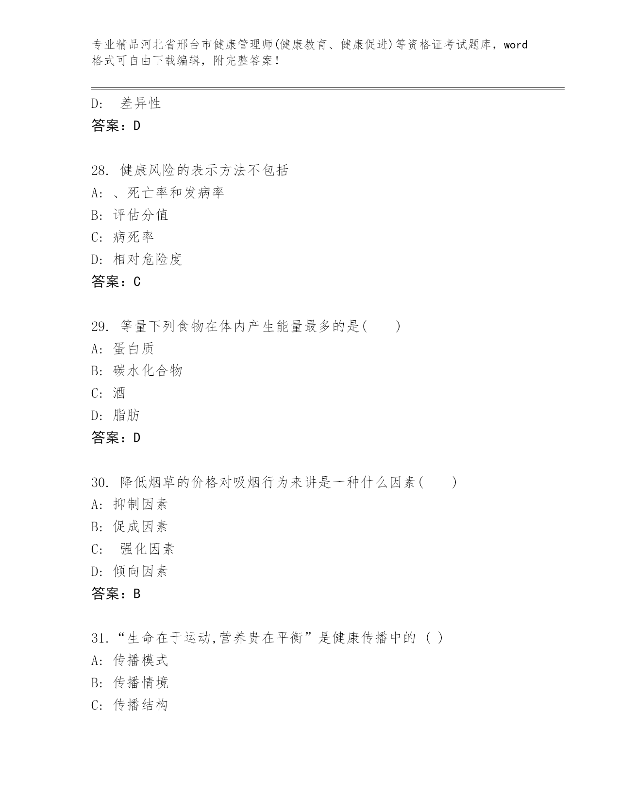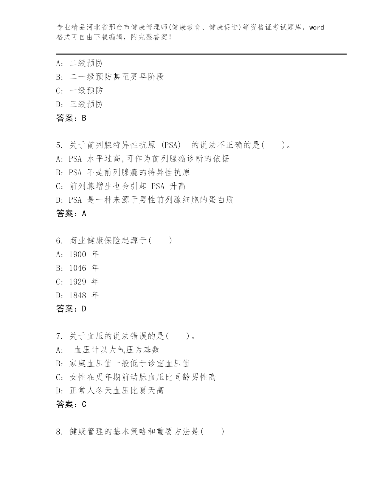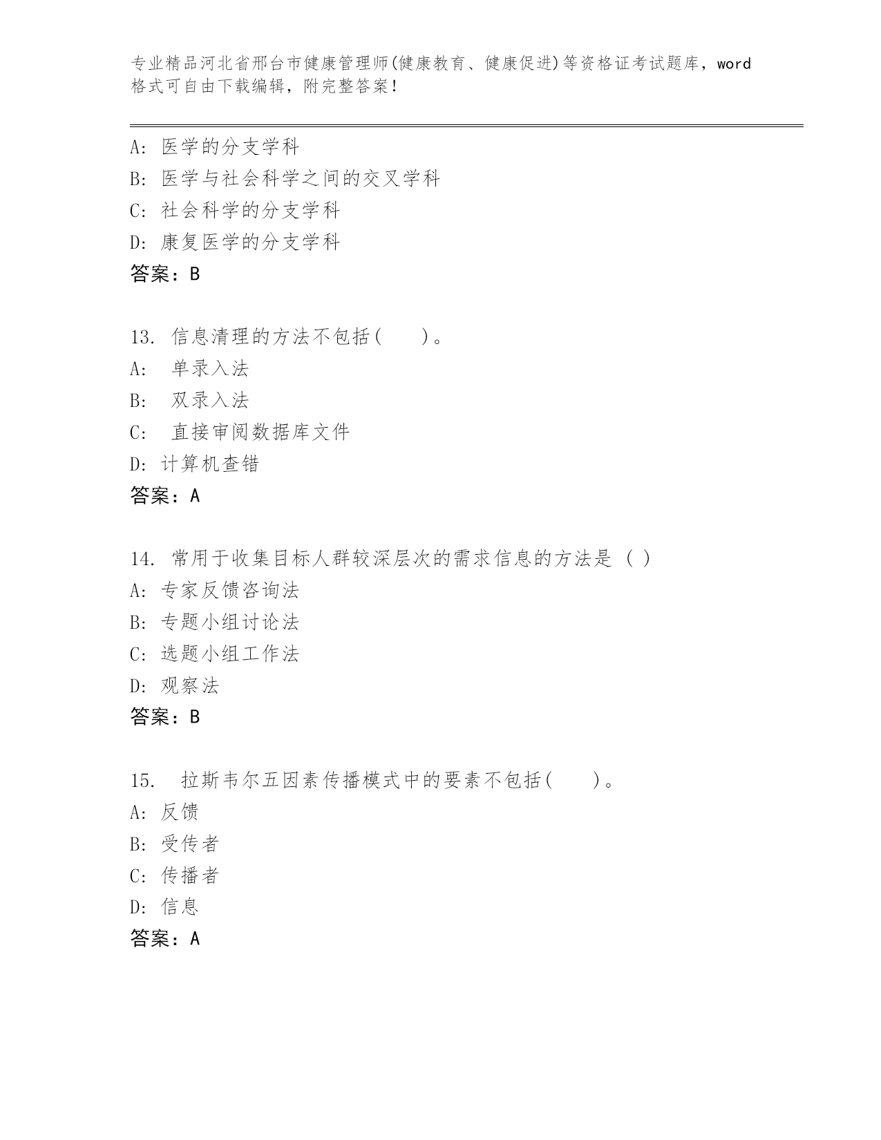 历年河北省邢台市健康管理师(健康教育、健康促进)等资格证考试大全精品(预热题)