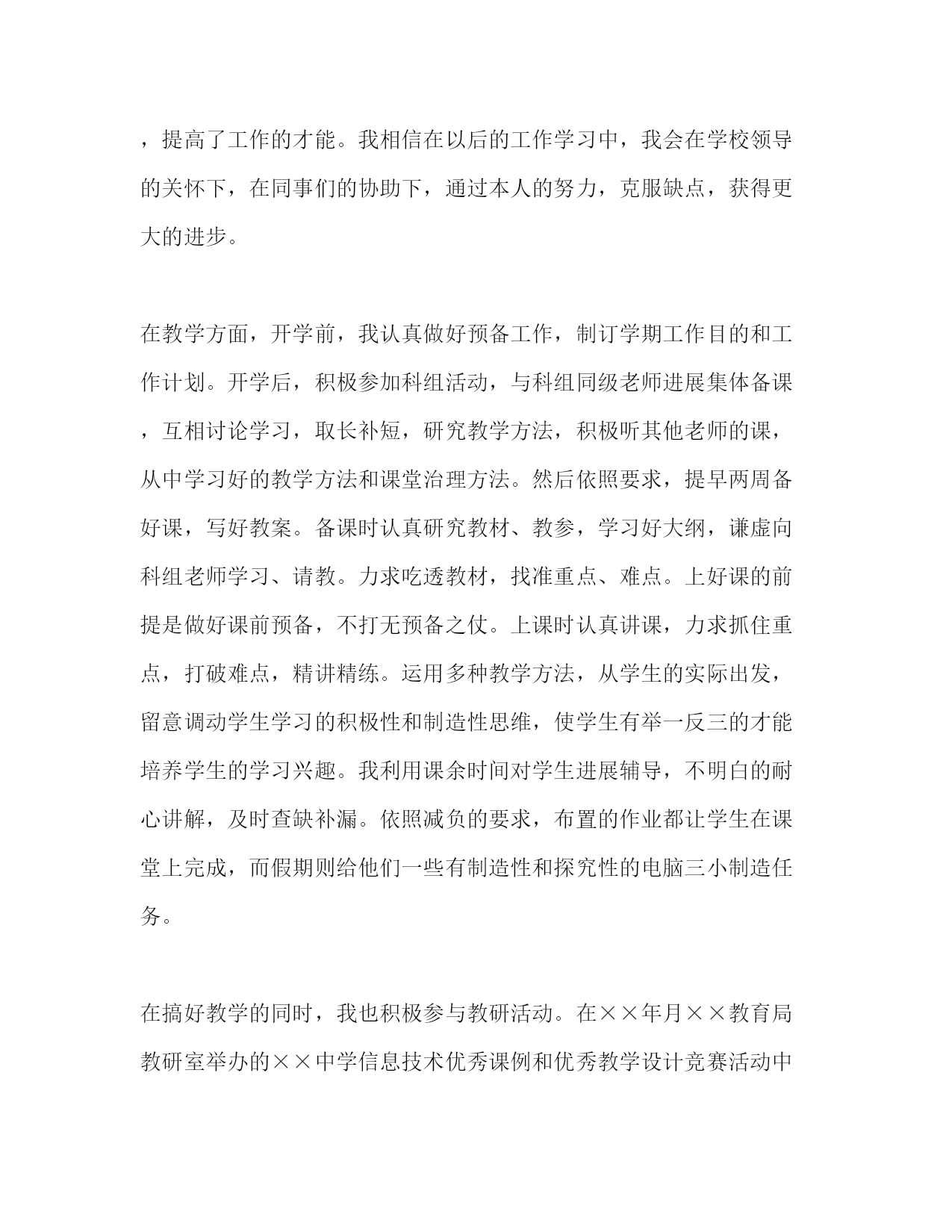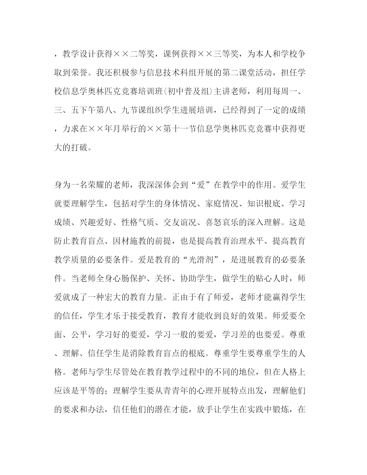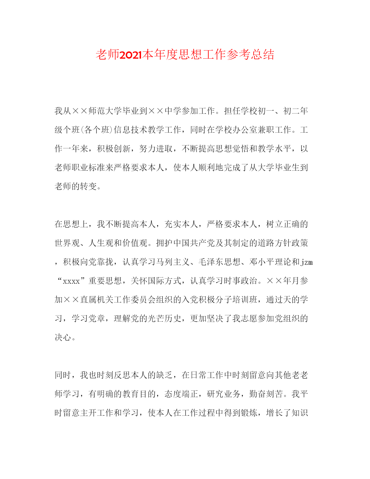 老师2021本年度思想工作参考总结我从××师范大学毕业到××中学参加工作。担任学校初一、初二年级个班(各个班)信息技术教学工作,同时在学校办公室兼职工作。工作一年来,积极创新,努力进取,不断提高思想觉悟和教学水平,以老师职业标准来严格要求本人,使本人顺利地完成了从大学毕业生到老师的转变。在思想上,我不断提高本人,充实本人,严格要求本人,树立正确的世界观、人生观和价值观。拥护中国共产党及其制定的道路方针政策,积极向党靠拢,认真学习马列主义、毛泽东思想、邓小平理论和jzm“xxxx”重要思想,关怀国际方式,认真学习时事政治。××年月参加××直属机关工作委员会组织的入党积极分子培训班,通过天的学习,学习党章,理解党的光芒历史,更加坚决了我志愿参加党组织的决心。同时,我也时刻反思本人的缺乏,在日常工作中时刻留意向其他老老师学习,有明确的教育目的,态度端正,研究业务,勤奋刻苦。我平时留意主开工作和学习,使本人在工作过程中得到锻炼,增长了知识,提高了工作的才能。我相信在以后的工作学习中,我会在学校领导的关怀下,在同事们的协助下,通过本人的努力,克服缺点,获得更大的进步。在教学方面,开学前,我认真做好预备工作,制订学期工作目的和工作计划。开学后,积极参加科组活动,与科组同级老师进展集体备课,互相讨论学习,取长补短,研究教学方法,积极听其他老师的课,从中学习好的教学方法和课堂治理方法。然后依照要求,提早两周备好课,写好教案。备课时认真研究教材、教参,学习好大纲,谦虚向科组老师学习、请教。力求吃透教材,找准重点、难点。上好课的前提是做好课前预备,不打无预备之仗。上课时认真讲课,力求抓住重点,打破难点,精讲精练。运用多种教学方法,从学生的实际出发,留意调动学生学习的积极性和制造性思维,使学生有举一反三的才能培养学生的学习兴趣。我利用课余时间对学生进展辅导,不明白的耐心讲解,及时查缺补漏。依照减负的要求,布置的作业都让学生在课堂上完成,而假期则给他们一些有制造性和探究性的电脑三小制造任务。在搞好教学的同时,我也积极参与教研活动。在××年月××教育局教研室举办的××中学信息技术优秀课例和优秀教学设计竞赛活动中,教学设计获得××二等奖,课例获得××三等奖,为本人和学校争取到荣誉。我还积极参与信息技术科组开展的第二课堂活动,担任学校信息学奥林匹克竞赛培训班(初中普及组)主讲老师,利用每周一、三、五下午第八、九节课组织学生进展培训,已经得到了一定的成绩,力求在××年月举行的××第十一节信息学奥林匹克竞赛中获得更大的打破。身为一名荣耀的老师,我深深体会到“爱”在教学中的作用。爱学生就要理解学生,包括对学生的身体情况、家庭情况、知识根底、学习成绩、兴趣爱好、性格气质、交友谊况、喜怒哀乐的深入理解。这是防止教育盲点、因材施教的前提,也是提高教育治理水平、提高教育教学质量的必要条件。爱是教育的“光滑剂”,是进展教育的必要条件。当老师全身心肠保护、关怀、协助学生,做学生的贴心人时,师爱就成了一种宏大的教育力量。正由于有了师爱,老师才能赢得学生的信任,学生才乐于接受教育,教育才能收到良好的效果。师爱要全面、公平,学习好的要爱,学习一般的要爱,学习差的也要爱。尊重、理解、信任学生是消除教育盲点的根底。尊重学生要尊重学生的人格。老师与学生尽管处在教育教学过程中的不同的地位,但在人格上应该是平等的;理解学生要从青青年的心理开展特点出发,理解他们的要求和办法,信任他们的潜在才能,放手让学生在实践中锻炼,在磨练中成长。只有如此,学生才能与老师缩小心理间隔,学生才会对老师产生情感。我更深入地认识到老师要热爱每一个学生,尤其是对待后进生要多给一些暖和,用“爱”字改变他们,理解尊重信任他们。爱学生确实是要严格要求学生,对其缺点错误,不纵容、不姑息、不放任。师爱既包含着强烈的情感色彩,又表现出深入的理智,不仅着眼于学生目前的得失和苦乐,更注重学生将来的开展和前途。