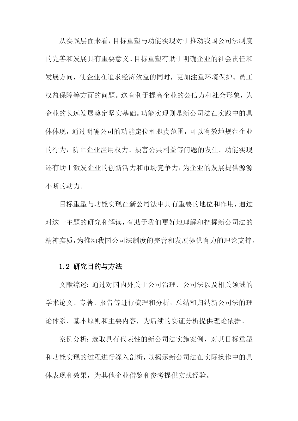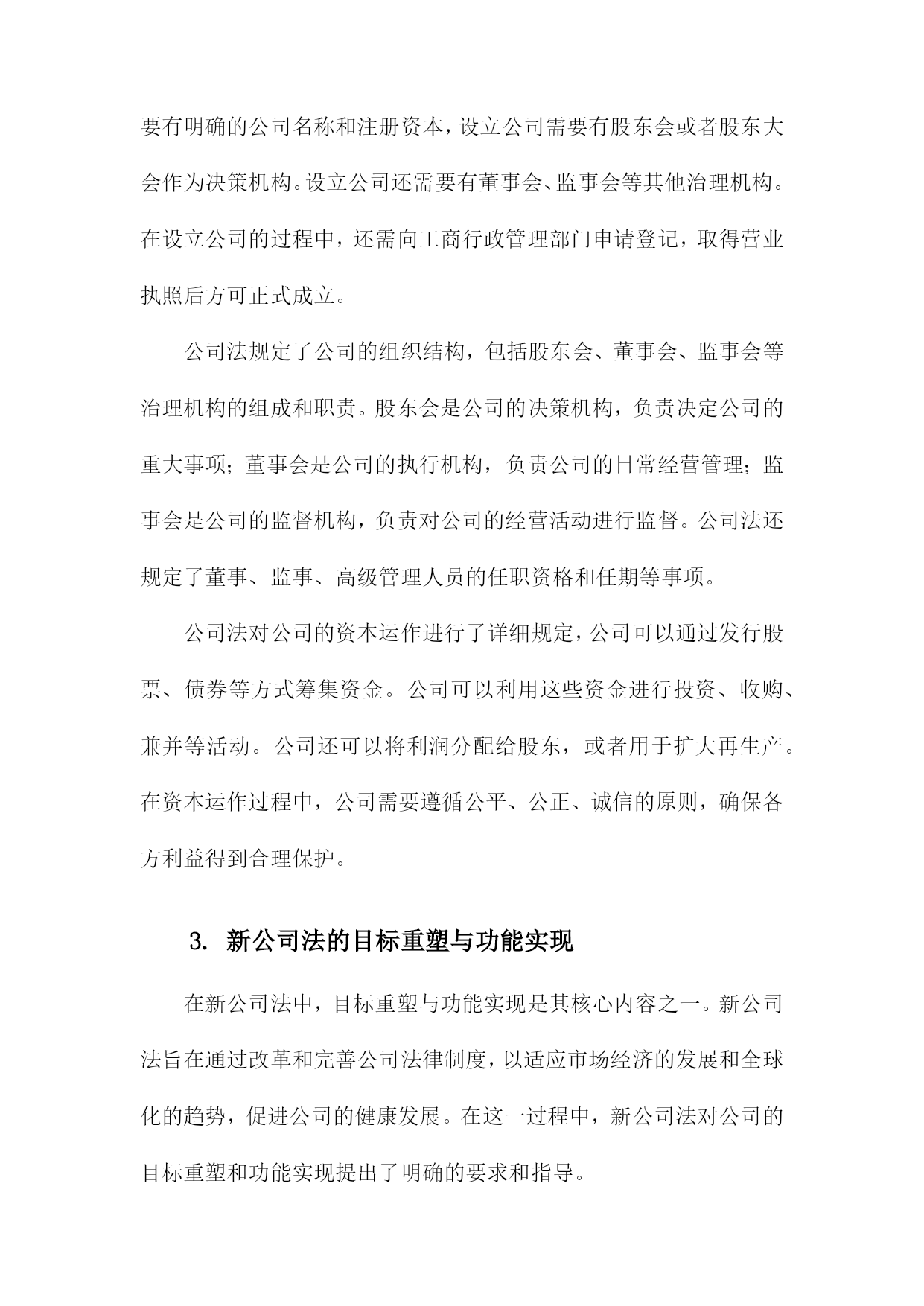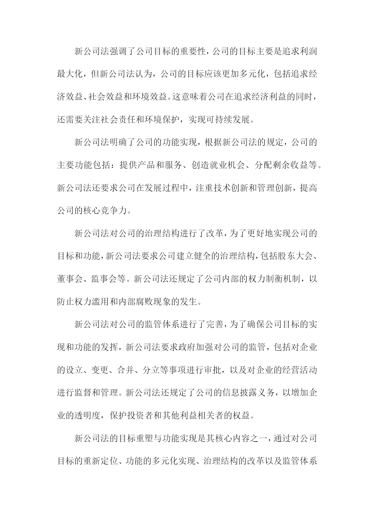 新公司法解读:目标重塑与功能实现1.内容概览本文档旨在对新公司法进行解读,重点关注目标重塑与功能实现两个方面。我们将对新公司法的背景和目的进行简要介绍,以便读者能够全面了解该法律的基本框架。我们将深入分析新公司法在目标重塑方面的主要变化,包括公司治理结构、股东权益保护、公司分立与合并等方面。我们将探讨新公司法在功能实现方面的主要措施,如加强监管、提高信息披露要求、优化税收政策等,以期为公司法的实施提供有益的参考和借鉴。1.1研究背景与意义从理论层面来看,目标重塑与功能实现是新公司法的重要创新点。在原有的公司法体系中,公司的目标主要体现在股东利益最大化、企业经济效益最大化等方面。随着市场经济的发展和社会进步,人们对企业的期望值也在不断提高。在这种情况下,仅仅追求股东利益最大化和企业经济效益最大化已经不能满足社会的需求。新公司法通过目标重塑,将企业的目标定位为服务于国家战略、维护公共利益、促进经济社会发展等更高层次的目标,从而使企业在追求经济效益的同时,更加注重社会责任和可持续发展。从实践层面来看,目标重塑与功能实现对于推动我国公司法制度的完善和发展具有重要意义。目标重塑有助于明确企业的社会责任和发展方向,使企业在追求经济效益的同时,更加注重环境保护、员工权益保障等方面的问题。这有利于提高企业的公信力和社会形象,为企业的长远发展奠定坚实基础。功能实现则是新公司法在实践中的具体体现,通过明确公司的功能定位和职责范围,可以有效地规范企业的行为,防止企业滥用权力、损害公共利益等问题的发生。功能实现还有助于激发企业的创新活力和市场竞争力,为企业的发展提供源源不断的动力。目标重塑与功能实现在新公司法中具有重要的地位和作用,通过对这一主题的研究和解读,有助于我们更好地理解和把握新公司法的精神实质,为推动我国公司法制度的完善和发展提供有力的理论支持。1.2研究目的与方法文献综述:通过对国内外关于公司治理、公司法以及相关领域的学术论文、专著、报告等进行梳理和分析,总结和归纳新公司法的理论体系、基本原则和主要内容,为后续的实证分析提供理论依据。案例分析:选取具有代表性的新公司法实施案例,对其目标重塑和功能实现的过程进行深入剖析,以揭示新公司法在实际操作中的具体表现和效果,为其他企业借鉴和参考提供实践经验。比较分析:通过对不同国家和地区新公司法的比较分析,探讨各国在新公司法实施过程中的经验教训,以期为我国新公司法的完善和发展提供有益借鉴。专家访谈:邀请新公司法领域的专家学者进行访谈,了解他们在新公司法研究和实践方面的观点和建议,为本文的研究提供专业支持。1.3研究框架与内容安排本节将简要介绍新公司法的背景、目的和意义,以及本文的研究目标、方法和结构。通过对新公司法的概述,为后续章节的内容奠定基础。本节将详细解读新公司法的基本原则,包括公平原则、诚信原则、自愿原则等。分析新公司法在公司设立、变更、解散等方面的制度设计,如有限责任公司、股份有限公司等不同类型的公司的设立条件、股权设置、股东权利与义务等。本节将探讨新公司法对企业治理的影响,包括董事会、监事会、经理层等企业治理结构的设立与运作,以及内部控制、信息披露、风险管理等方面的要求。结合实际案例分析新公司法对企业治理的实际效果和启示。本节将分析新公司法对投资者保护的规定,包括股东权益保护、上市公司信息披露、内幕交易防控等方面。结合国内外相关案例,探讨新公司法在保护投资者利益方面的实际效果和存在问题。本节将对新公司法进行国际比较,分析不同国家和地区在新公司法方面的异同点,以及各国在企业治理、投资者保护等方面的经验与教训。提出我国在新公司法实施过程中可以借鉴的国际经验和做法。本节将对全文进行总结,明确新公司法的主要特点和亮点,以及在实践中需要关注的问题和挑战。提出针对新公司法实施过程中的相关建议,以期为我国企业法治建设和投资者保护提供有益参考。2.公司法概述公司法是规范公司设立、经营、解散等活动的基本法律。公司法的制定和实施对于促进经济发展、保护投资者权益、维护社会稳定具有重要意义。新公司法自2006年1月1日起施行,对原有的公司法进行了全面修订,以适应市场经济和国际化发展的需要。公司设立原则:新公司法明确了公司的设立原则,包括自愿原则、公平原则、公开原则等。这有助于确保公司的合法性、合规性和透明度。公司组织结构:新公司法规定了公司的组织结构,包括股东会、董事会、监事会等。这些机构在公司治理中起到了关键作用,有助于实现公司的决策、管理和监督功能。股东权利和义务:新公司法明确了股东的权利和义务,包括投票权、表决权、知情权、利润分配权等。这有助于保护股东的合法权益,促进公司的健康发展。公司经营管理:新公司法对公司的经营管理进行了规范,包括公司的经营范围、资本构成