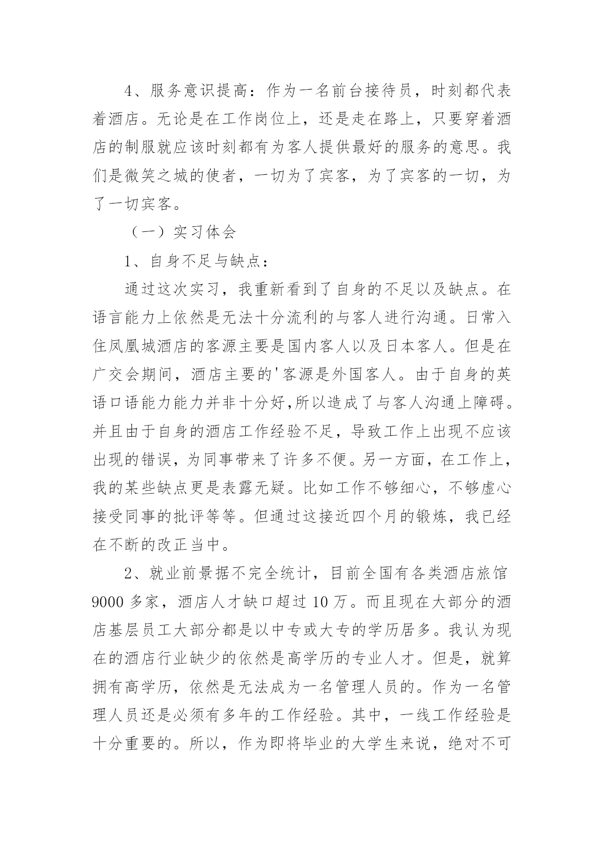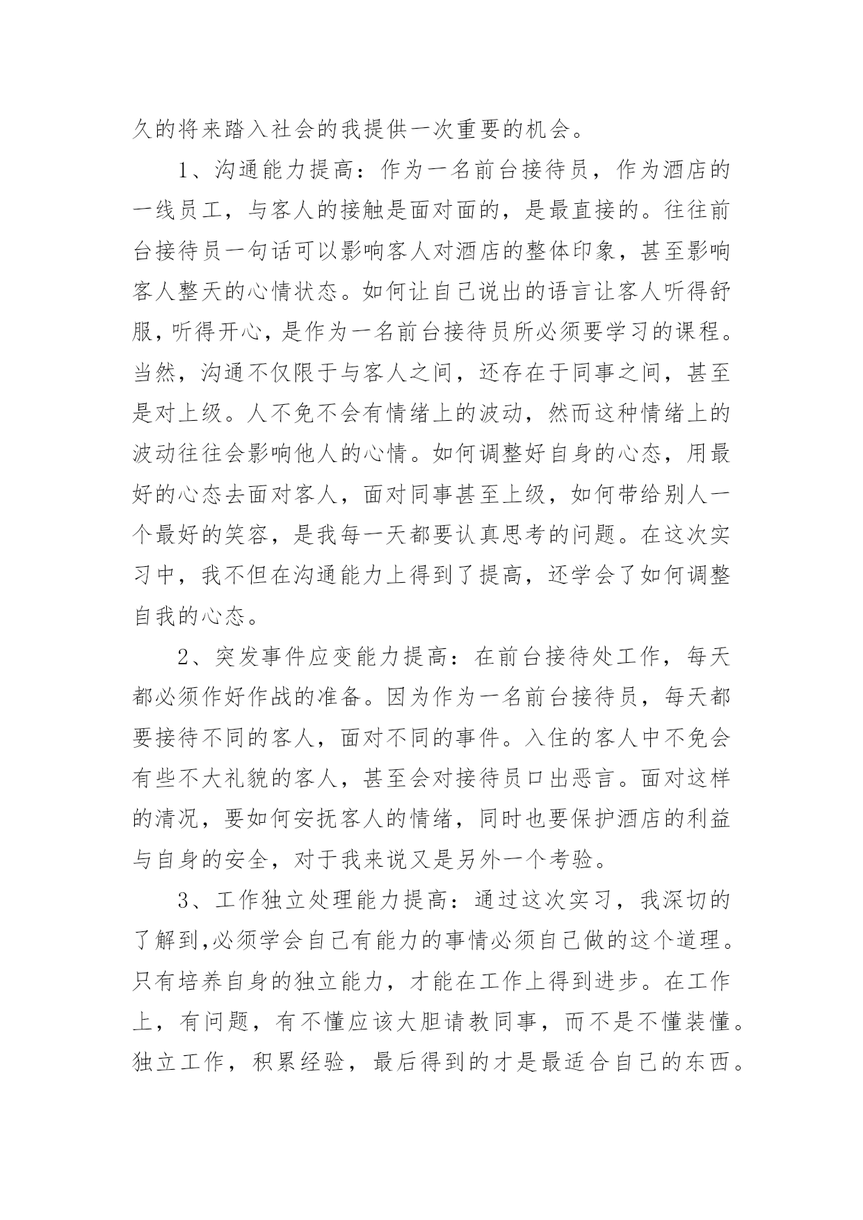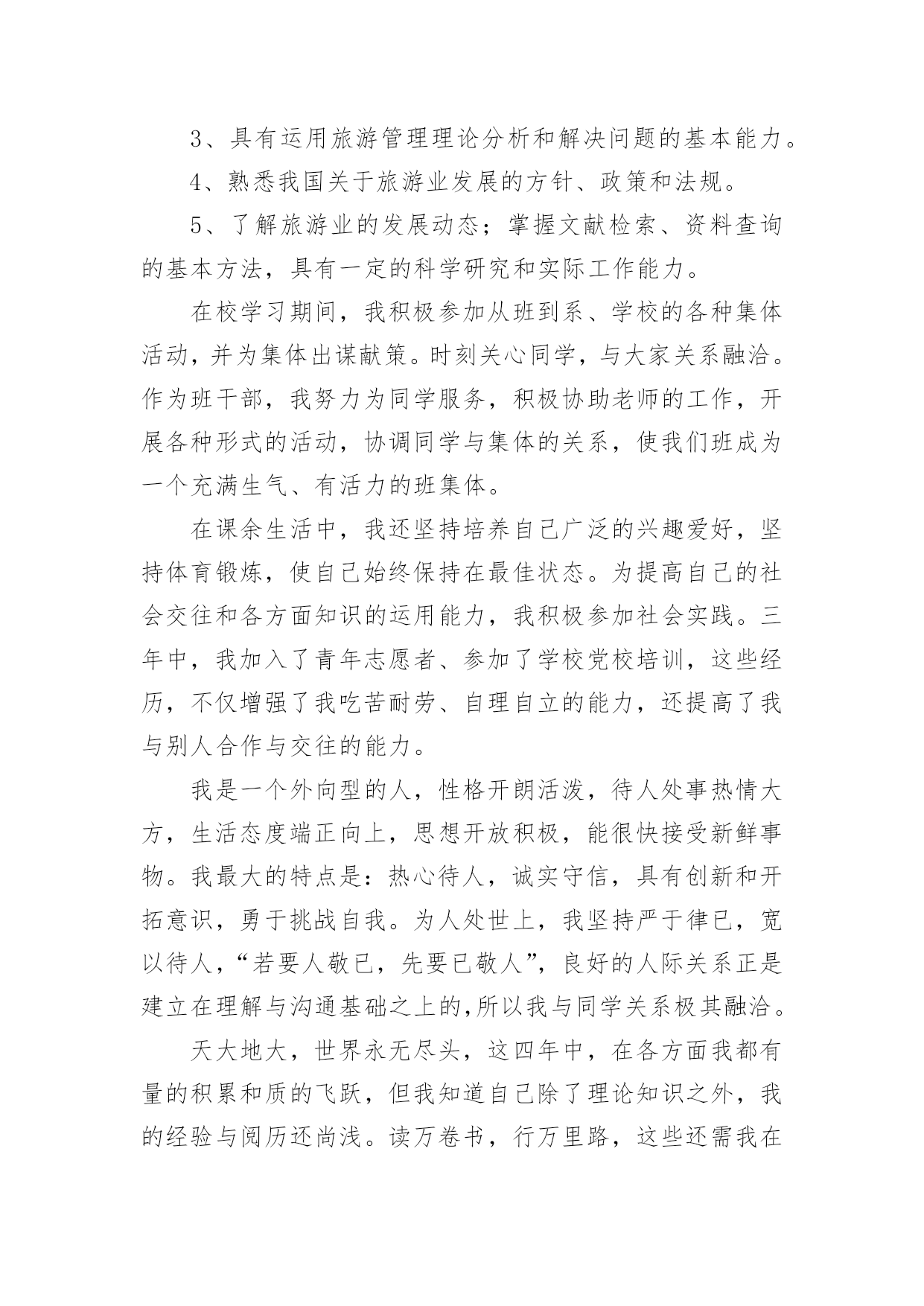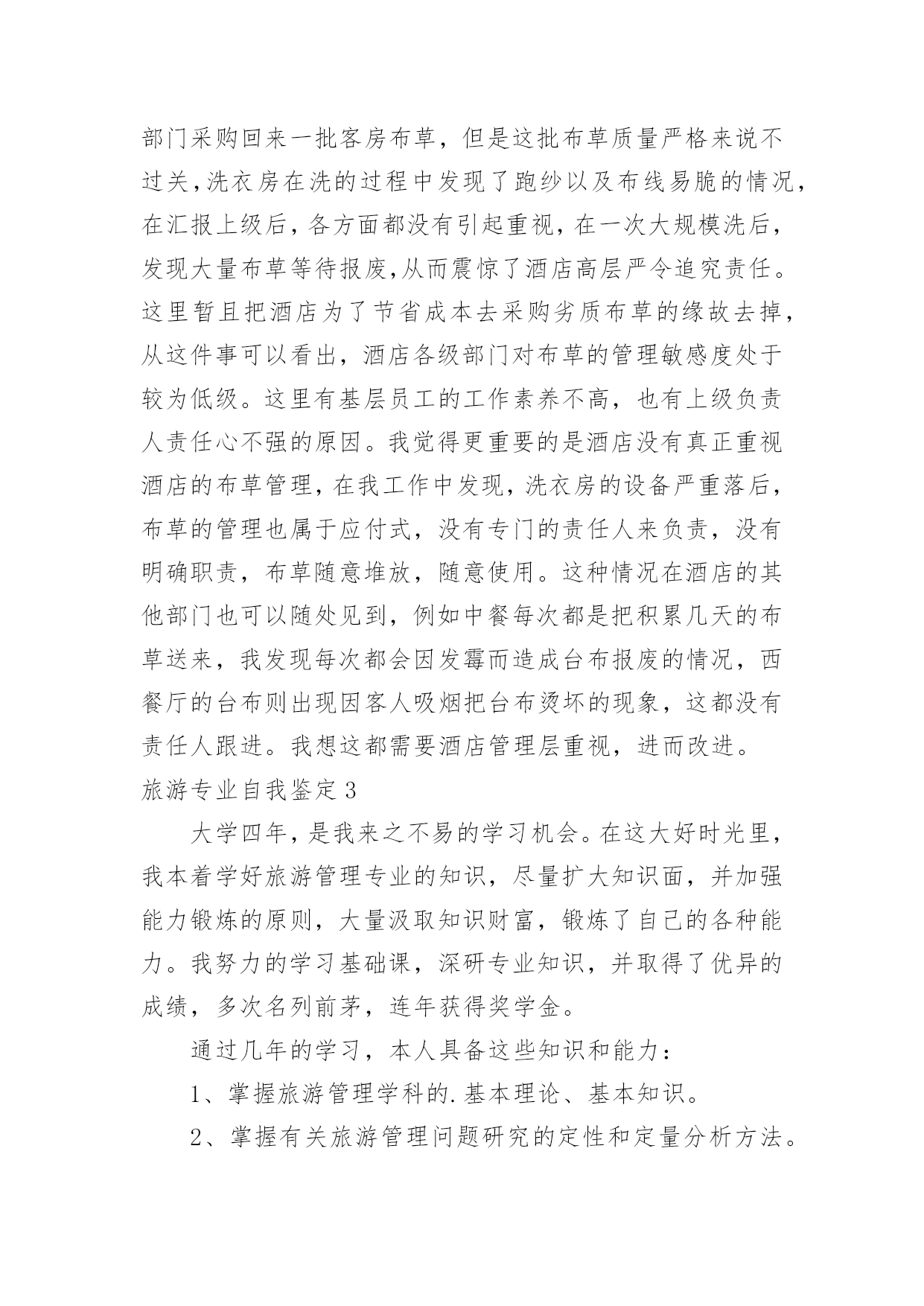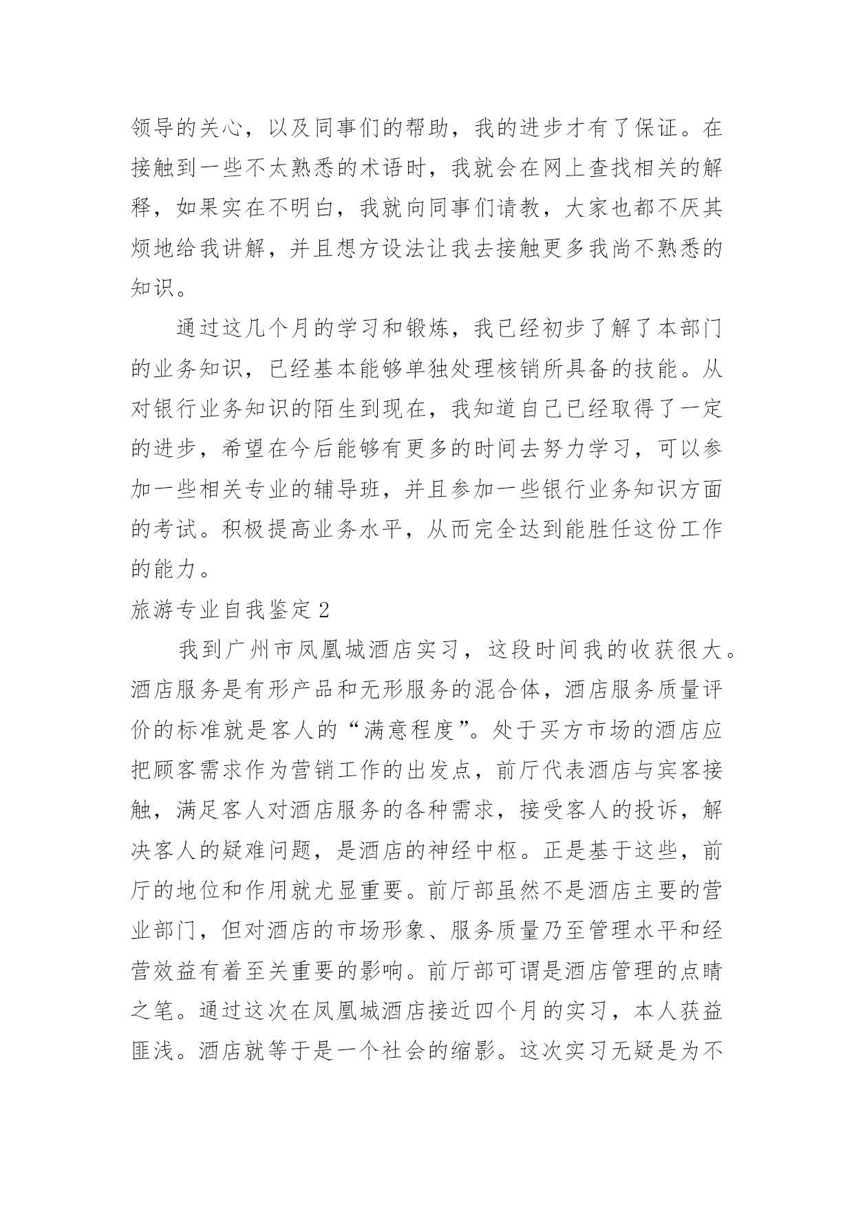 旅游专业自我鉴定旅游专业自我鉴定【荐】自我鉴定是个人对一个时间段的自我总结,写自我鉴定有利于我们工作能力的提高,因此,让我们写一份自我鉴定吧。自我鉴定怎么写才不会千篇一律呢?下面是小编整理的旅游专业自我鉴定,仅供参考,欢迎大家阅读。旅游专业自我鉴定1本次实习取得了非常大的收获,让我从多方面了解了自己与社会、与企业的需求差距的地方,以及需要保持的地方。同时,在实习期间,我也收获了很多的人生感性材料,相信在将来的学习工作中可以得以总结教训,积累经验。换一个角度来说,我重新修正了自己的定位,把自己的方向对准到正确的目标。我想在走出去工作之前,我还必须加强自己专业知识以及度过语言关,争取自己的社会竞争力有所提升。从集体的角度来说,我向组织承认错误,由于我个人的缘故,本次机场酒店的实习没有做到善始善终,出现了同学的.实习报告被遗失、同学的工资出现空拿的现象、离开酒店的最后两个小时内集体秩序混乱等等情况。在此,我会加强自己相应方面能力的提高,吸取教训,争取把将来的工作做好。自从去到XX银行实习,在行领导、部门领导和各位同事的帮助下,在政治思想、业务工作方面都取得了较大的进步。在一开始我对这里的一切都是如此的陌生,要感谢各级领导的关心,以及同事们的帮助,我的进步才有了保证。在接触到一些不太熟悉的术语时,我就会在网上查找相关的解释,如果实在不明白,我就向同事们请教,大家也都不厌其烦地给我讲解,并且想方设法让我去接触更多我尚不熟悉的知识。通过这几个月的学习和锻炼,我已经初步了解了本部门的业务知识,已经基本能够单独处理核销所具备的技能。从对银行业务知识的陌生到现在,我知道自己已经取得了一定的进步,希望在今后能够有更多的时间去努力学习,可以参加一些相关专业的辅导班,并且参加一些银行业务知识方面的考试。积极提高业务水平,从而完全达到能胜任这份工作的能力。旅游专业自我鉴定2我到广州市凤凰城酒店实习,这段时间我的收获很大。酒店服务是有形产品和无形服务的混合体,酒店服务质量评价的标准就是客人的“满意程度”。处于买方市场的酒店应把顾客需求作为营销工作的出发点,前厅代表酒店与宾客接触,满足客人对酒店服务的各种需求,接受客人的投诉,解决客人的疑难问题,是酒店的神经中枢。正是基于这些,前厅的地位和作用就尤显重要。前厅部虽然不是酒店主要的营业部门,但对酒店的市场形象、服务质量乃至管理水平和经营效益有着至关重要的影响。前厅部可谓是酒店管理的点睛之笔。通过这次在凤凰城酒店接近四个月的实习,本人获益匪浅。酒店就等于是一个社会的缩影。这次实习无疑是为不久的将来踏入社会的我提供一次重要的机会。1、沟通能力提高:作为一名前台接待员,作为酒店的一线员工,与客人的接触是面对面的,是最直接的。往往前台接待员一句话可以影响客人对酒店的整体印象,甚至影响客人整天的心情状态。如何让自己说出的语言让客人听得舒服,听得开心,是作为一名前台接待员所必须要学习的课程。当然,沟通不仅限于与客人之间,还存在于同事之间,甚至是对上级。人不免不会有情绪上的波动,然而这种情绪上的波动往往会影响他人的心情。如何调整好自身的心态,用最好的心态去面对客人,面对同事甚至上级,如何带给别人一个最好的笑容,是我每一天都要认真思考的问题。在这次实习中,我不但在沟通能力上得到了提高,还学会了如何调整自我的心态。2、突发事件应变能力提高:在前台接待处工作,每天都必须作好作战的准备。因为作为一名前台接待员,每天都要接待不同的客人,面对不同的事件。入住的客人中不免会有些不大礼貌的客人,甚至会对接待员口出恶言。面对这样的清况,要如何安抚客人的情绪,同时也要保护酒店的利益与自身的安全,对于我来说又是另外一个考验。3、工作独立处理能力提高:通过这次实习,我深切的了解到,必须学会自己有能力的事情必须自己做的这个道理。只有培养自身的独立能力,才能在工作上得到进步。在工作上,有问题,有不懂应该大胆请教同事,而不是不懂装懂。独立工作,积累经验,最后得到的才是最适合自己的东西。4、服务意识提高:作为一名前台接待员,时刻都代表着酒店。无论是在工作岗位上,还是走在路上,只要穿着酒店的制服就应该时刻都有为客人提供最好的服务的意思。我们是微笑之城的使者,一切为了宾客,为了宾客的一切,为了一切宾客。(一)实习体会1、自身不足与缺点:通过这次实习,我重新看到了自身的不足以及缺点。在语言能力上依然是无法十分流利的与客人进行沟通。日常入住凤凰城酒店的客源主要是国内客人以及日本客人。但是在广交会期间,酒店主要的'客源是外国客人。由于自身的英语口语能力能力并非十分好,所以造成了与客人沟通上障碍。并且由于自身的酒店工作经验不足,导致工作上出现不应该出现的错误,为同事带来了许多不便。另一方面,在工作上,我的某些缺点更是表露无疑。比如工作不够细心,不够虚心接受同事的