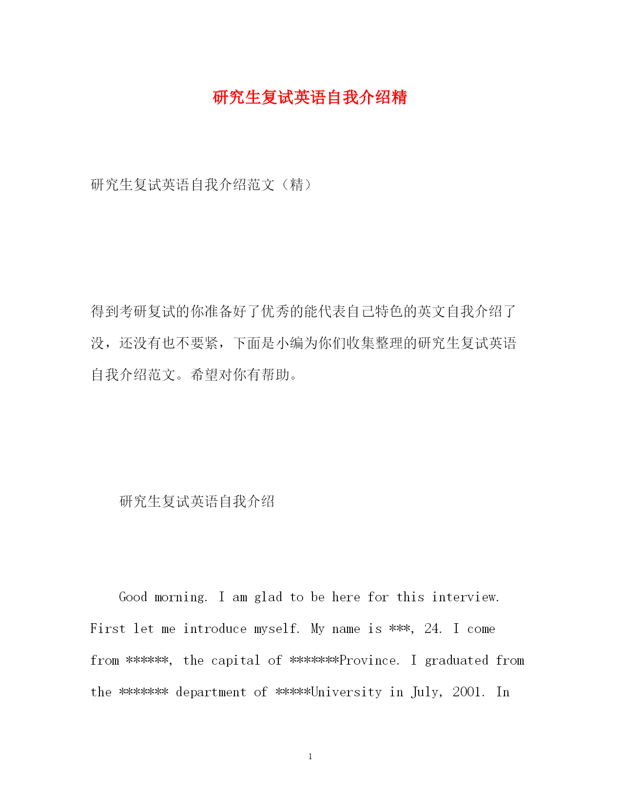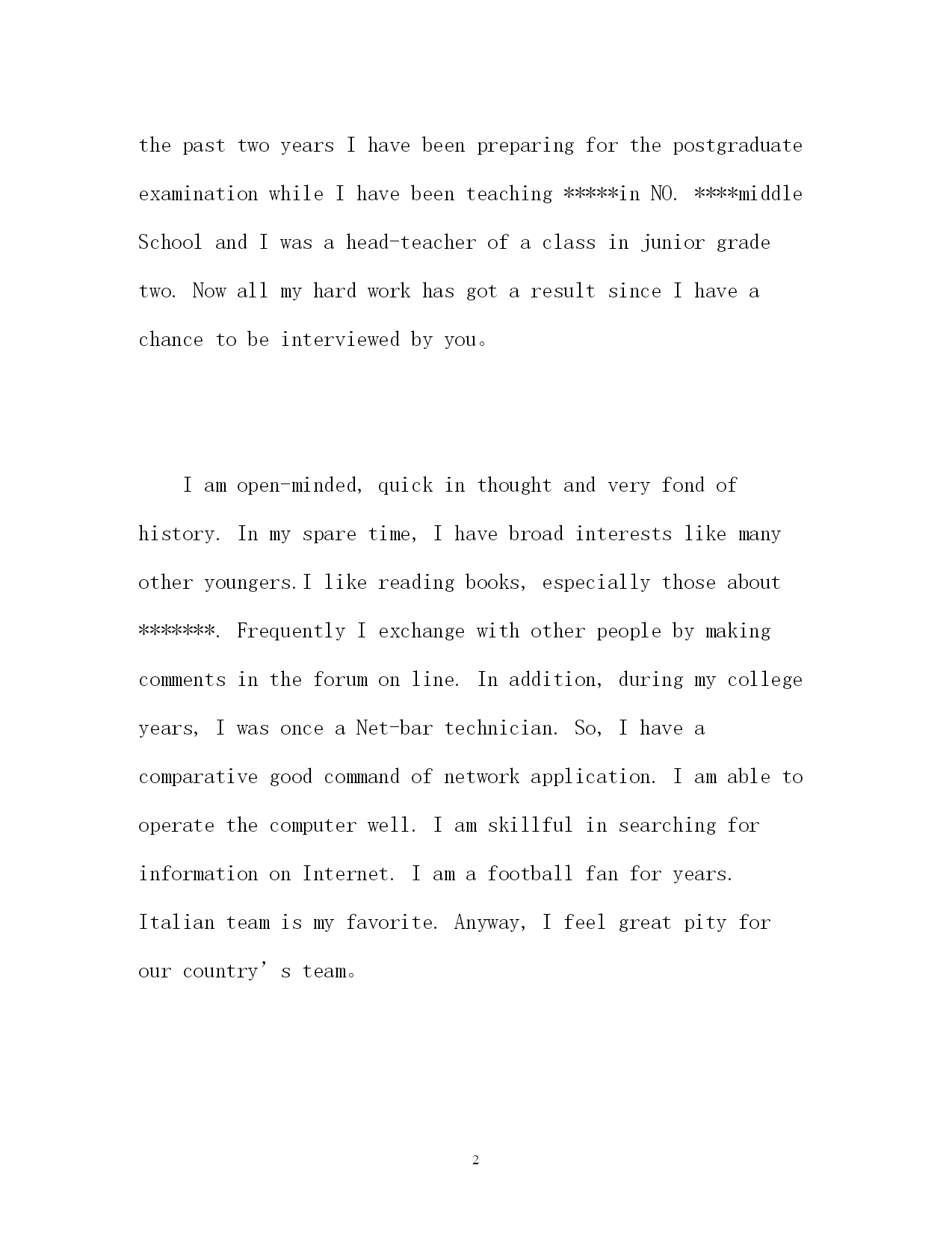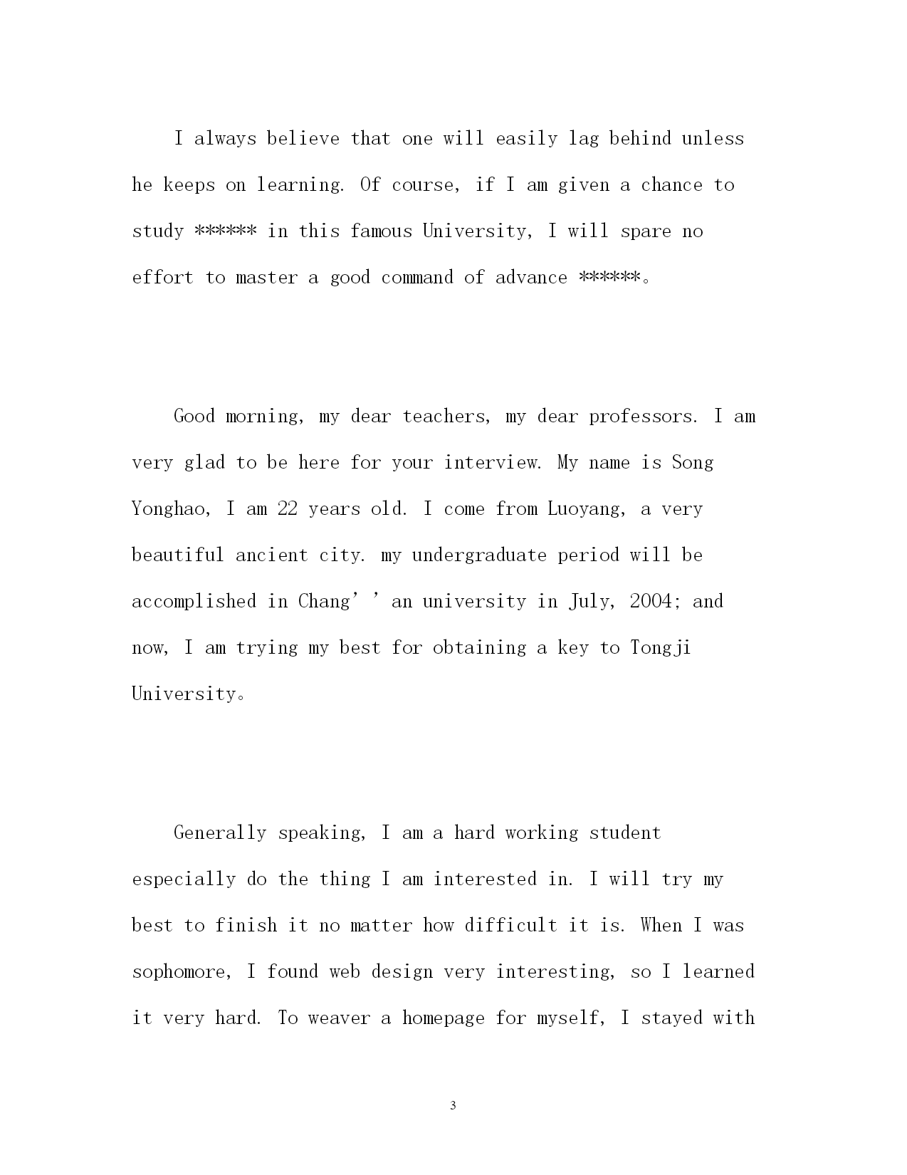 此资料由网络收集而来,如有侵权请告知上传者立即删除。资料共分享,我们负责传递知识。PAGEPAGE22研究生复试英语自我介绍精研究生复试英语自我介绍范文(精)得到考研复试的你准备好了优秀的能代表自己特色的英文自我介绍了没,还没有也不要紧,下面是小编为你们收集整理的研究生复试英语自我介绍范文。希望对你有帮助。研究生复试英语自我介绍Goodmorning.Iamgladtobehereforthisinterview.Firstletmeintroducemyself.Mynameis***,24.Icomefrom******,thecapitalof*******Province.Igraduatedfromthe*******departmentof*****UniversityinJuly,2001.InthepasttwoyearsIhavebeenpreparingforthepostgraduateexaminationwhileIhavebeenteaching*****inNO.****middleSchoolandIwasahead-teacherofaclassinjuniorgradetwo.NowallmyhardworkhasgotaresultsinceIhaveachancetobeinterviewedbyyou。Iamopen-minded,quickinthoughtandveryfondofhistory.Inmysparetime,Ihavebroadinterestslikemanyotheryoungers.Ilikereadingbooks,especiallythoseabout*******.FrequentlyIexchangewithotherpeoplebymakingcommentsintheforumonline.Inaddition,duringmycollegeyears,IwasonceaNet-bartechnician.So,Ihaveacomparativegoodcommandofnetworkapplication.Iamabletooperatethecomputerwell.IamskillfulinsearchingforinformationonInternet.Iamafootballfanforyears.Italianteamismyfavorite.Anyway,Ifeelgreatpityforourcountry’steam。Ialwaysbelievethatonewilleasilylagbehindunlesshekeepsonlearning.Ofcourse,ifIamgivenachancetostudy******inthisfamousUniversity,Iwillsparenoefforttomasteragoodcommandofadvance******。Goodmorning,mydearteachers,mydearprofessors.Iamverygladtobehereforyourinterview.MynameisSongYonghao,Iam22yearsold.IcomefromLuoyang,averybeautifulancientcity.myundergraduateperiodwillbeaccomplishedinChang’’anuniversityinJuly,2004;andnow,IamtryingmybestforobtainingakeytoTongjiUniversity。Generallyspeaking,IamahardworkingstudentespeciallydothethingIaminterestedin.Iwilltrymybesttofinishitnomatterhowdifficultitis.WhenIwassophomore,Ifoundwebdesignveryinteresting,soIlearneditveryhard.Toweaverahomepageformyself,Istayedwithmypersonalcomputerforhalfamonth,andIamthefirstoneinmyclasswhoownhishomepage.Furthermore,Iamapersonwithgreatperseverance.Duringthedayspreparingforthefirstexamination,Iinsistonrunningeveryda