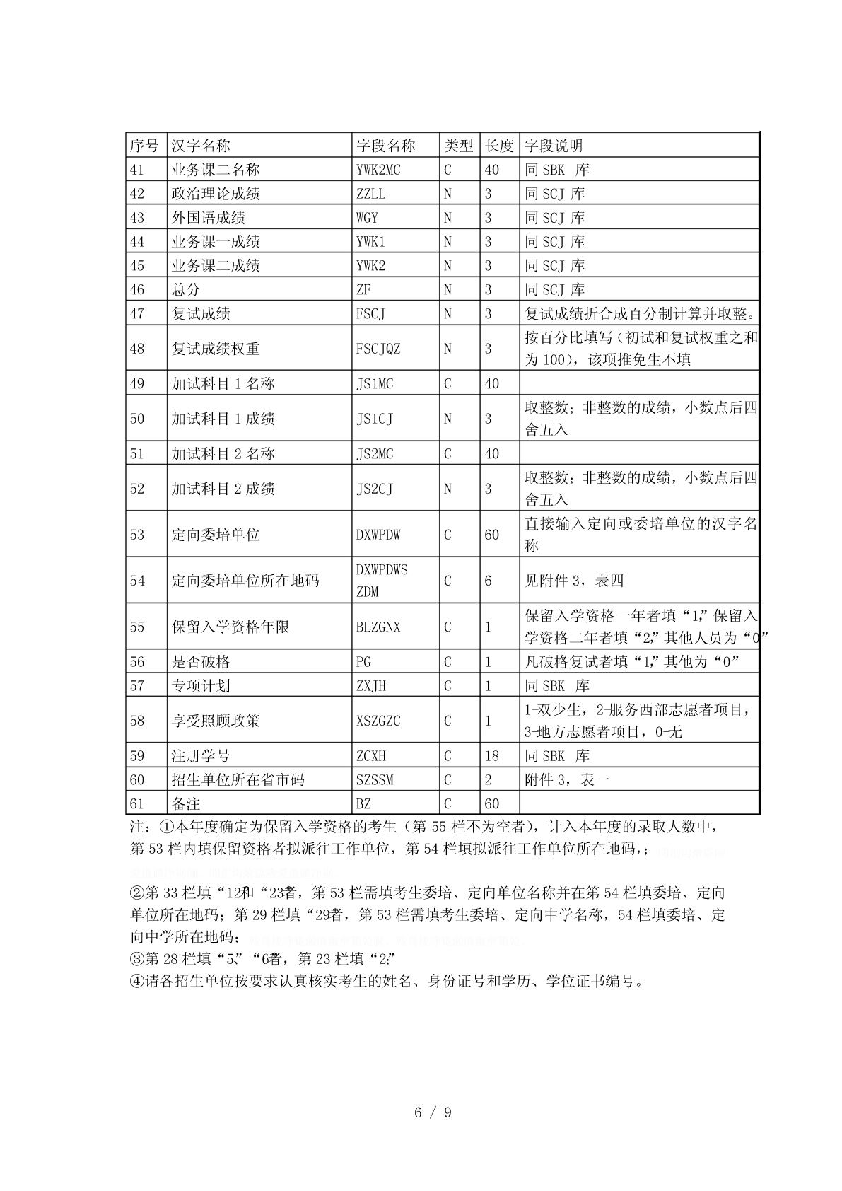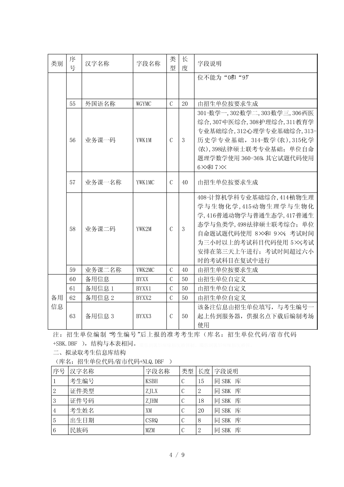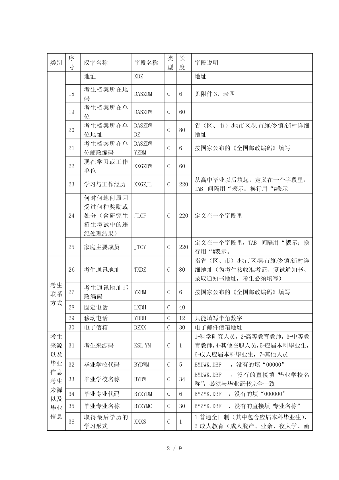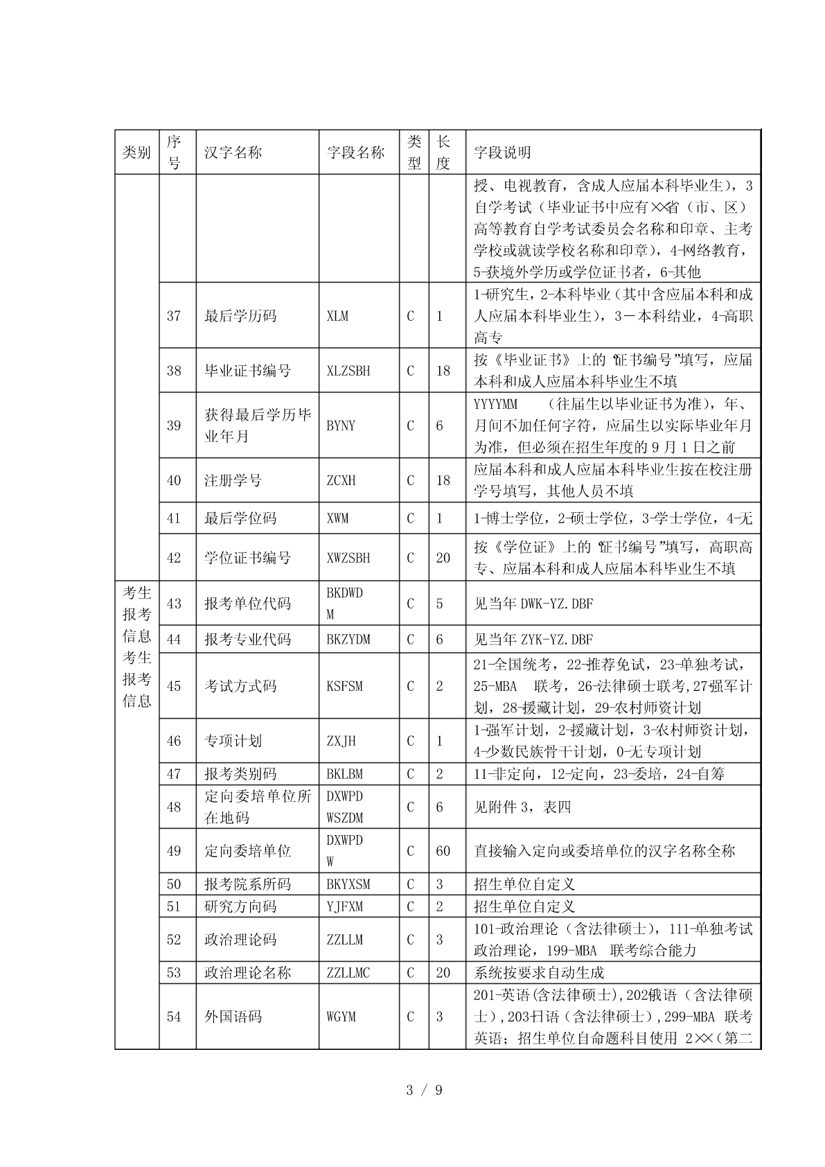 全国硕士研究生招生标准信息库结构一、考生报名信息库结构(库名:代码/省市代码+SBM.DBF))序类长类别汉字名称字段名称字段说明号型度考生省(区、市)代码(2位)+本省(区、市)1报名点代码BMDDMC4基本报名点序号(2位)信息报名点代码(4位)+报名序号(5位),由系2考生报名号BMHC9考生统随机生成基本按紧左原则(字库中没有的汉字用半角状态3考生姓名XMC20信息“??”代替)4考生姓名拼音XMPYC40按姓名的拼音的书写形式填写由招生单位编写,必须填满15位。编码规则:推免生编号为接收单位代码(5位)+入学年度尾数(1位)+推荐单位代码(5位)+接收5考生编号KSBHC15单位自编号;其他考生编号为单位代码(5位)+入学年度尾数(1位)+单位自编号;不准考考生填“不准考”三个汉字,不得填写其它字符01-内地身份证,02-军人证件(军官证或军队6证件类型ZJLXC2高校学员证),03-港澳台身份证,04-华侨身份证(无身份证者可填护照号)按本人身份证号填,内地身份证只有15位数字和18位数字(18位身份证最后一位可为X7证件号码ZJHMC18或x)两种格式,军人证件、港澳台身份证、护照按证件号码填写本人出生日期,即年(XXXX)月(XX)日8出生日期CSRQC8(XX),共8位,年、月、日间不加任何字符9民族码MZMC2见附件3,表三10性别码XBMC11-男,2-女11婚否码HFMC10-未婚,1-已婚1-军队在职干部,2-军校应届本科毕业生,3-12现役军人码XYJRMC1国防生,0-非军人13政治面貌码ZZMMMC2见附件3,表二14籍贯所在地码JGSZDMC6见附件3,表四15出生地码CSDMC6见附件3,表四16户口所在地码HKSZDMC6见附件3,表四17户口所在地详细HKSZDXC60省(区、市)/地市区/县市旗/乡镇/街村详细序类长类别汉字名称字段名称字段说明号型度地址XDZ地址考生档案所在地18DASZDMC6见附件3,表四码考生档案所在单19DASZDWC60位考生档案所在单DASZDW省(区、市)/地市区/县市旗/乡镇/街村详细20C80位地址DZ地址考生档案所在单DASZDW21C6按国家公布的《全国邮政编码》填写位邮政编码YZBM现在学习或工作22XXGZDWC60单位从高中毕业以后填起,定义在一个字段里,23学习与工作经历XXGZJLC220TAB间隔用“|”表示;换行用“#”表示何时何地何原因受过何种奖励或24处分(含研究生JLCFC220定义在一个字段里招生考试中的违纪处理结果)定义在一个字段里,TAB间隔用“|”表示;换25家庭主要成员JTCYC220行用“#”表示。指省(区、市)/地市区/县市旗/乡镇/街村详26考生通讯地址TXDZC80细地址(为考生接收准考证、复试通知书、录取通知书地址,考生必须填写)考生考生通讯地址邮27YZBMC6按国家公布的《全国邮政编码》填写联系政编码方式28固定电话LXDHC4029移动电话YDDHC12只能填写半角数字30电子信箱DZXXC30电子邮件信箱地址考生1-科学研究人员,2-高等教育教师,3-中等教来源31考生来源码KSLYMC1育教师,4-其他在职人员,5-应届本科毕业生,以及6-成人应届本科毕业生,7-其他人员毕业32毕业学校代码BYDWMC5BYDWK.DBF,没有的填“00000”信息BYDWK.DBF,没有的直接填“毕业学校名33毕业学校名称BYDWC34考生称”,必须与毕业证书完全一致来源34毕业专业代码BYZYDMC6BYZYK.DBF,没有的填“000000”以及毕业35毕业专业名称BYZYMCC30BYZYK.DBF,没有的直接填“专业名称”信息取得最后学历的1-普通全日制(其中包含应届本科毕业生),36XXXSC1学习形式2-成人教育(成人脱产、业余、夜大学、函2/9序类长类别汉字名称字段名称字段说明号型度授、电视教育,含成人应届本科毕业生),3自学考试(毕业证书中应有××省(市、区)高等教育自学考试委员会名称和印章、主考学校或就读学校名称和印章),4-网络教育,5-获境外学历或学位证书者,6-其他1-研究生,2-本科毕业(其中含应届本科和成37最后学历码XLMC1人应届本科毕业生),3-本科结业,4-高职高专按《毕业证书》上的“证书编号”填写,应届38毕业证书编号XLZSBHC18本科和成人应届本科毕业生不填YYYYMM(往届生以毕业证书为准),年、获得最后学历毕39BYNYC6月