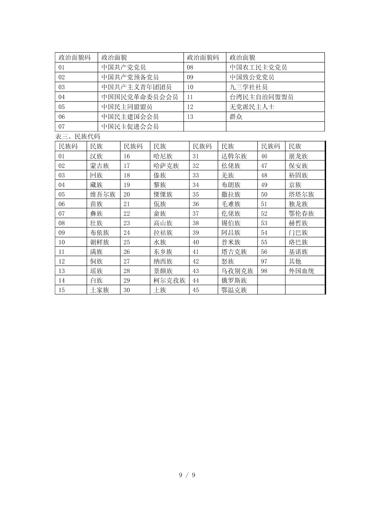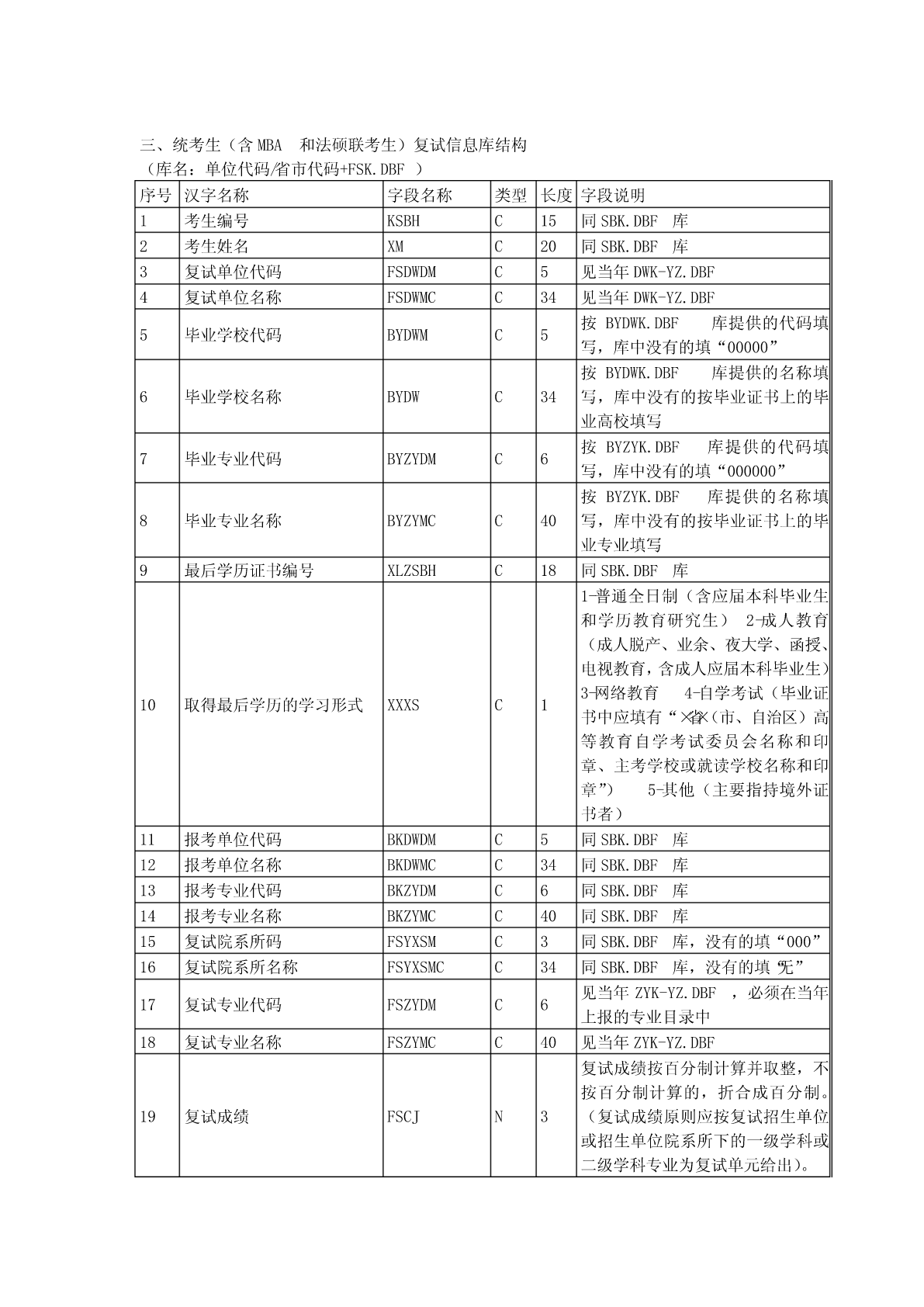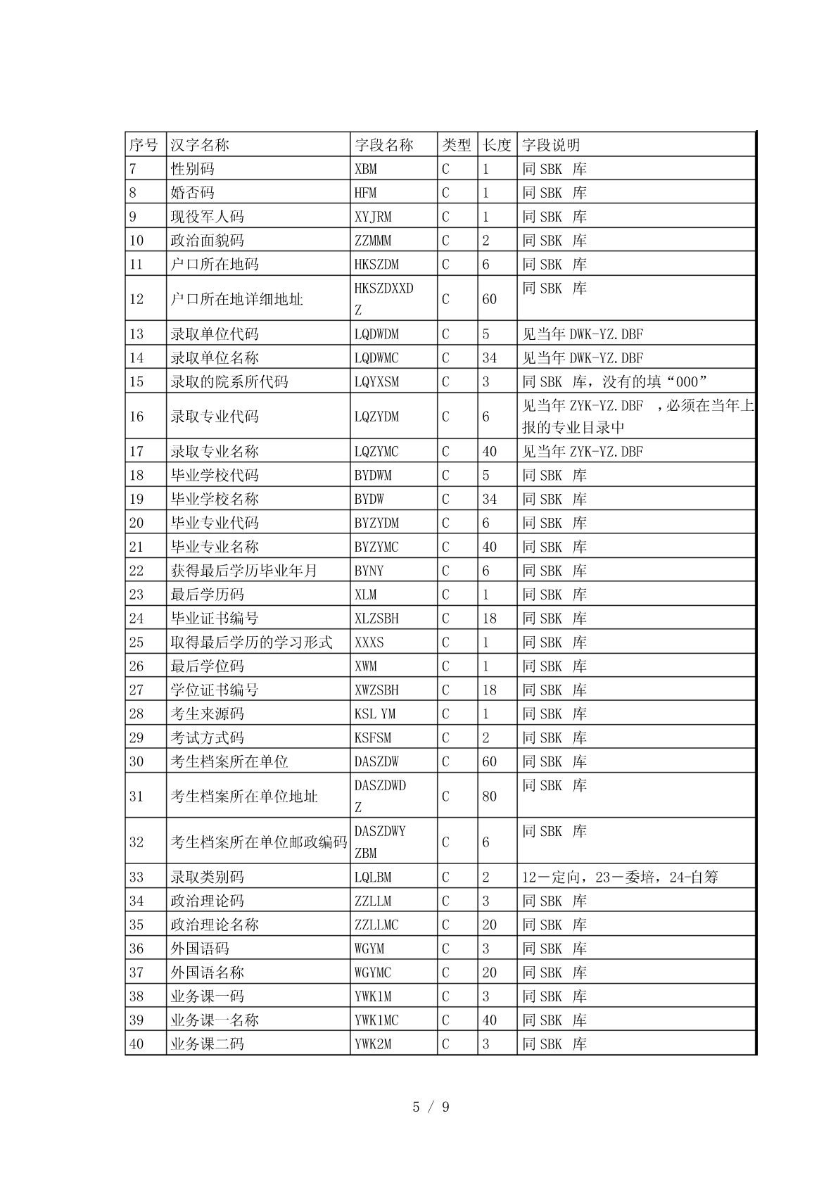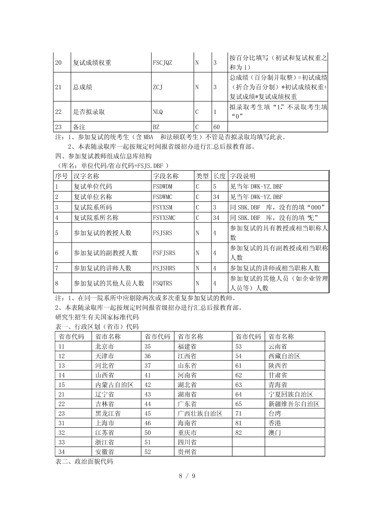 全国硕士研究生招生标准信息库结构一、考生报名信息库结构(库名:代码/省市代码+SBM.DBF))序类长类别汉字名称字段名称字段说明号型度考生省(区、市)代码(2位)+本省(区、市)1报名点代码BMDDMC4基本报名点序号(2位)信息报名点代码(4位)+报名序号(5位),由系2考生报名号BMHC9考生统随机生成基本按紧左原则(字库中没有的汉字用半角状态3考生姓名XMC20信息“??”代替)4考生姓名拼音XMPYC40按姓名的拼音的书写形式填写由招生单位编写,必须填满15位。编码规则:推免生编号为接收单位代码(5位)+入学年度尾数(1位)+推荐单位代码(5位)+接收5考生编号KSBHC15单位自编号;其他考生编号为单位代码(5位)+入学年度尾数(1位)+单位自编号;不准考考生填“不准考”三个汉字,不得填写其它字符01-内地身份证,02-军人证件(军官证或军队6证件类型ZJLXC2高校学员证),03-港澳台身份证,04-华侨身份证(无身份证者可填护照号)按本人身份证号填,内地身份证只有15位数字和18位数字(18位身份证最后一位可为X7证件号码ZJHMC18或x)两种格式,军人证件、港澳台身份证、护照按证件号码填写本人出生日期,即年(XXXX)月(XX)日8出生日期CSRQC8(XX),共8位,年、月、日间不加任何字符9民族码MZMC2见附件3,表三10性别码XBMC11-男,2-女11婚否码HFMC10-未婚,1-已婚1-军队在职干部,2-军校应届本科毕业生,3-12现役军人码XYJRMC1国防生,0-非军人13政治面貌码ZZMMMC2见附件3,表二14籍贯所在地码JGSZDMC6见附件3,表四15出生地码CSDMC6见附件3,表四16户口所在地码HKSZDMC6见附件3,表四17户口所在地详细HKSZDXC60省(区、市)/地市区/县市旗/乡镇/街村详细序类长类别汉字名称字段名称字段说明号型度地址XDZ地址考生档案所在地18DASZDMC6见附件3,表四码考生档案所在单19DASZDWC60位考生档案所在单DASZDW省(区、市)/地市区/县市旗/乡镇/街村详细20C80位地址DZ地址考生档案所在单DASZDW21C6按国家公布的《全国邮政编码》填写位邮政编码YZBM现在学习或工作22XXGZDWC60单位从高中毕业以后填起,定义在一个字段里,23学习与工作经历XXGZJLC220TAB间隔用“|”表示;换行用“#”表示何时何地何原因受过何种奖励或24处分(含研究生JLCFC220定义在一个字段里招生考试中的违纪处理结果)定义在一个字段里,TAB间隔用“|”表示;换25家庭主要成员JTCYC220行用“#”表示。指省(区、市)/地市区/县市旗/乡镇/街村详26考生通讯地址TXDZC80细地址(为考生接收准考证、复试通知书、录取通知书地址,考生必须填写)考生考生通讯地址邮27YZBMC6按国家公布的《全国邮政编码》填写联系政编码方式28固定电话LXDHC4029移动电话YDDHC12只能填写半角数字30电子信箱DZXXC30电子邮件信箱地址考生1-科学研究人员,2-高等教育教师,3-中等教来源31考生来源码KSLYMC1育教师,4-其他在职人员,5-应届本科毕业生,以及6-成人应届本科毕业生,7-其他人员毕业32毕业学校代码BYDWMC5BYDWK.DBF,没有的填“00000”信息BYDWK.DBF,没有的直接填“毕业学校名33毕业学校名称BYDWC34考生称”,必须与毕业证书完全一致来源34毕业专业代码BYZYDMC6BYZYK.DBF,没有的填“000000”以及毕业35毕业专业名称BYZYMCC30BYZYK.DBF,没有的直接填“专业名称”信息取得最后学历的1-普通全日制(其中包含应届本科毕业生),36XXXSC1学习形式2-成人教育(成人脱产、业余、夜大学、函2/9序类长类别汉字名称字段名称字段说明号型度授、电视教育,含成人应届本科毕业生),3自学考试(毕业证书中应有××省(市、区)高等教育自学考试委员会名称和印章、主考学校或就读学校名称和印章),4-网络教育,5-获境外学历或学位证书者,6-其他1-研究生,2-本科毕业(其中含应届本科和成37最后学历码XLMC1人应届本科毕业生),3-本科结业,4-高职高专按《毕业证书》上的“证书编号”填写,应届38毕业证书编号XLZSBHC18本科和成人应届本科毕业生不填YYYYMM(往届生以毕业证书为准),年、获得最后学历毕39BYNYC6月