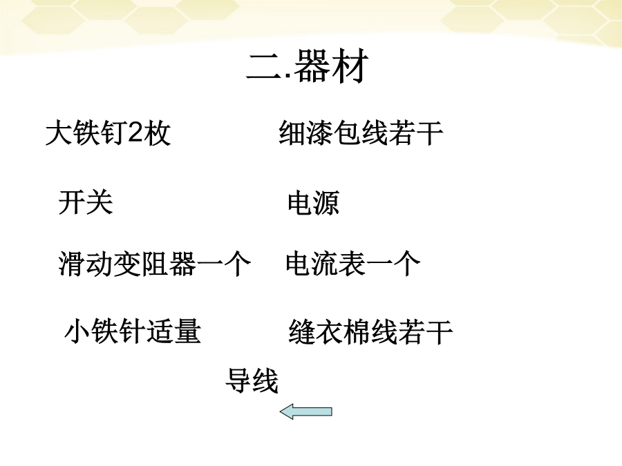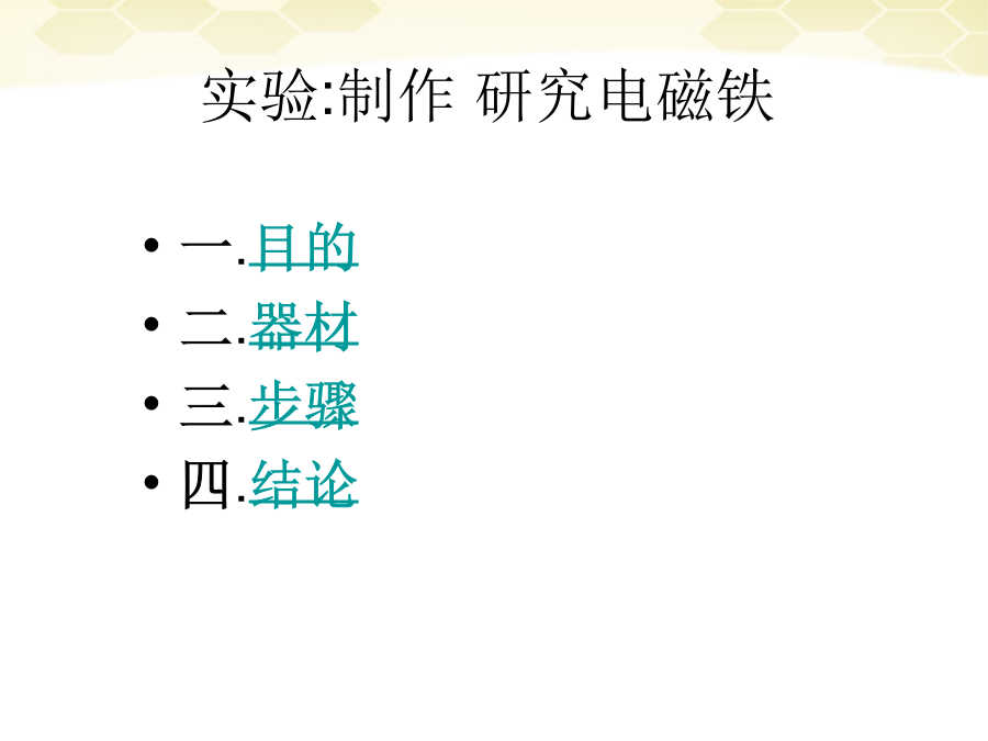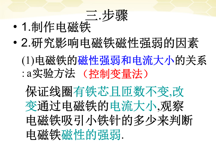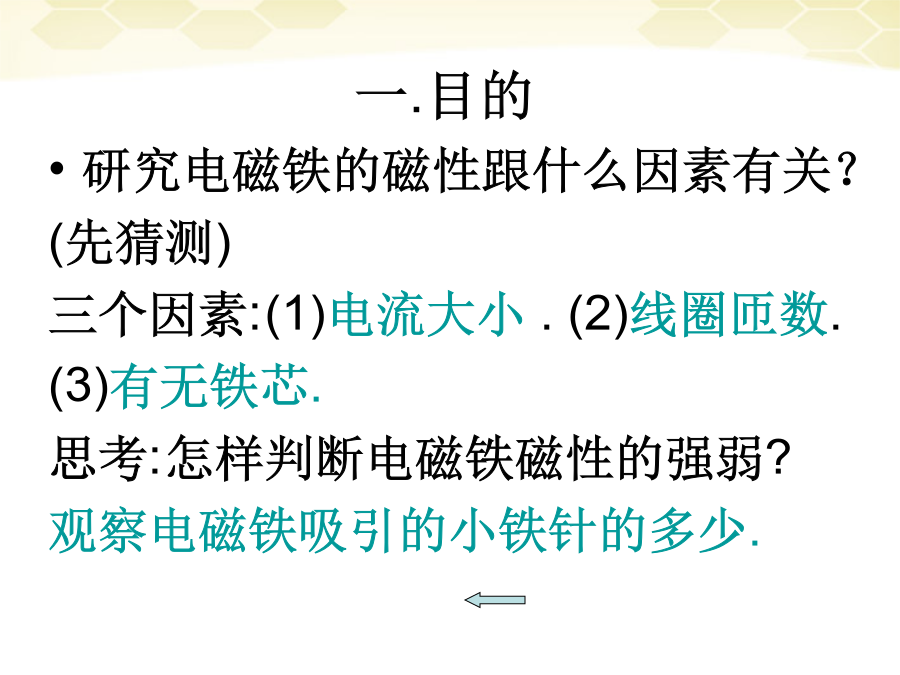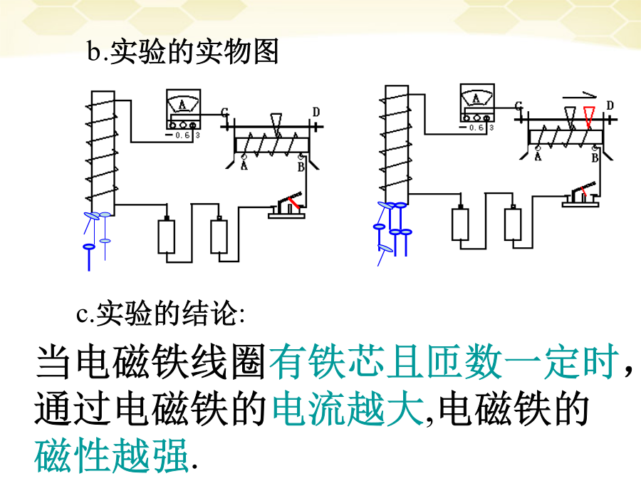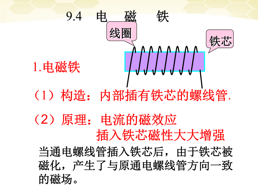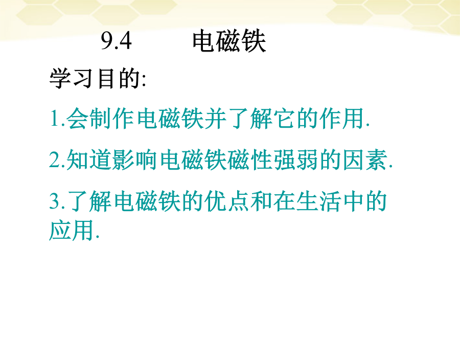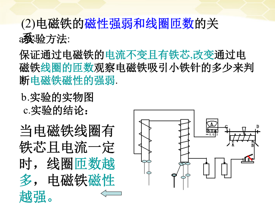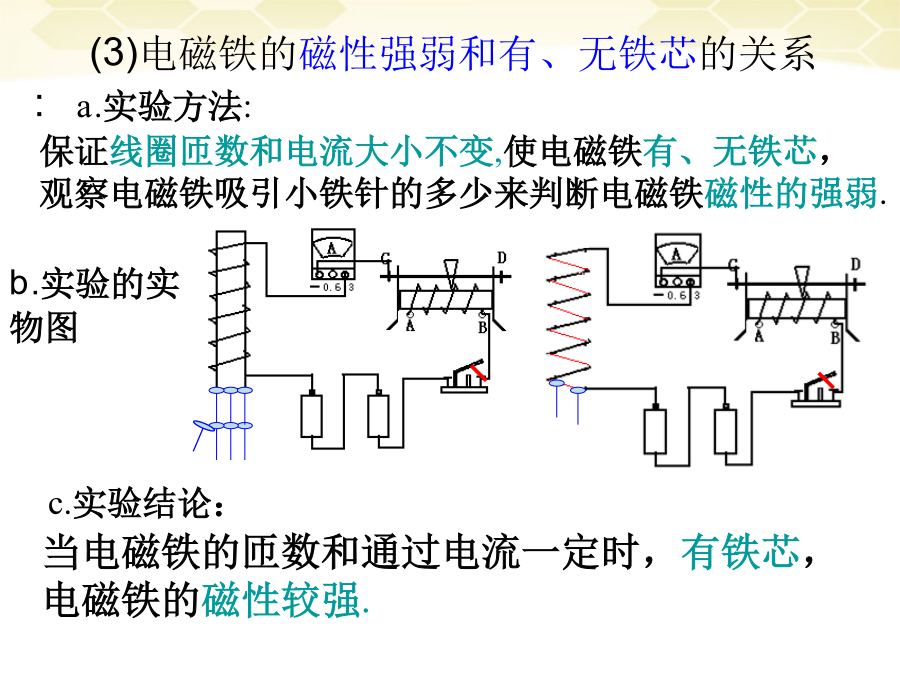 一.复习学习目的:1.会制作电磁铁并了解它的作用.2.知道影响电磁铁磁性强弱的因素.3.了解电磁铁的优点和在生活中的应用.9.4电磁铁实验:制作研究电磁铁一.目的二.器材三.步骤b.实验的实物图(3)电磁铁的磁性强弱和有、无铁芯的关系:四.实验的结论影响电磁铁磁性强弱的因素3.电磁铁的优点和应用(1)优点:(与永久磁体相比)小结练习练习