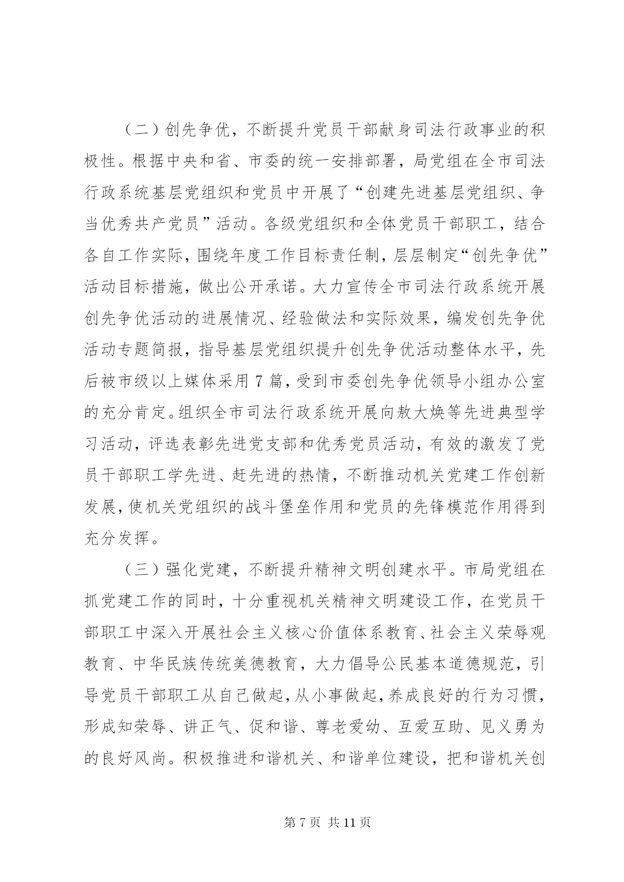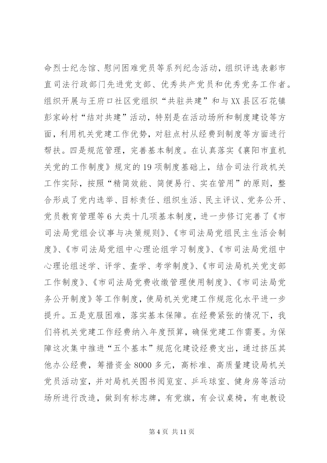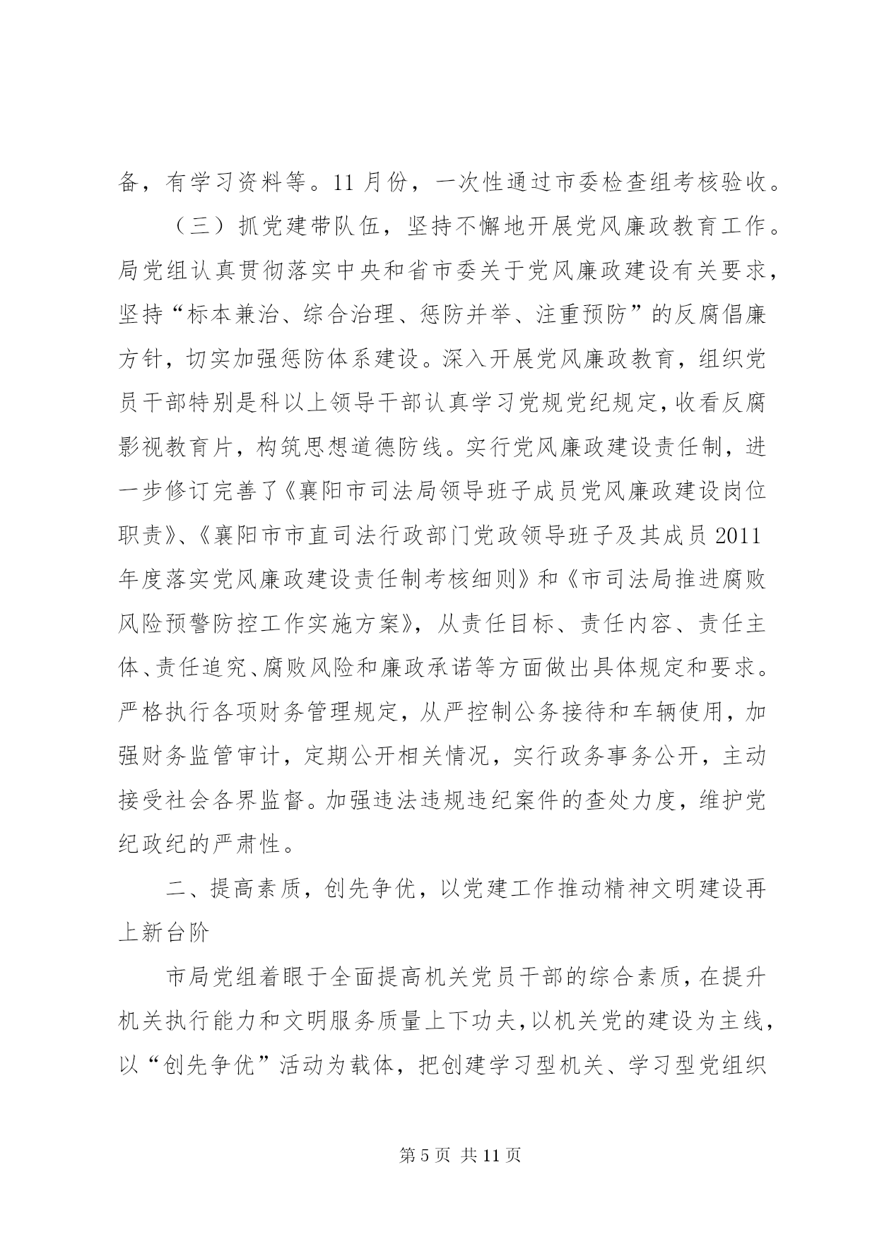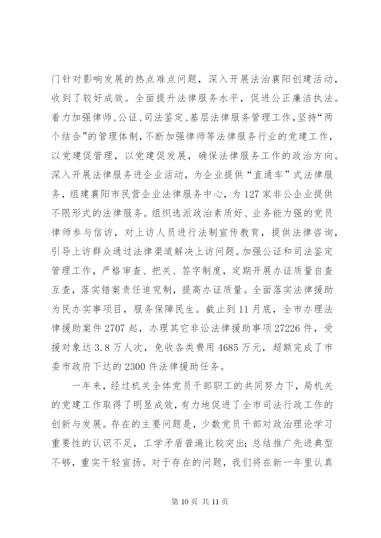 第PAGE\*Arabic\*MERGEFORMAT11页共NUMPAGES\*MERGEFORMAT11页司法局党建工作总结2011年度,市司法局党组在市委市政府的正确领导下,坚持以科学发展观为指导,认真学习贯彻党的xx届四中、五中全会精神,以党建工作为抓手,以“五个基本”建设为重点,以增强党组织的创造力、凝聚力和战斗力为目标,以加强党的执政能力建设和先进性建设为主线,以创先争优、创建学习型机关、学习型党组织活动为载体,紧紧围绕“三项重点工作”,全面加强机关党建工作,党员的思想政治觉悟进一步提高,基层党组织建设进一步加强,较好地发挥了党员的先锋模范作用和基层党组织的战斗堡垒作用,有力地促进了司法行政工作的创新与发展。一、提高认识,突出重点,努力实现机关党建工作的新突破局党组把机关党建工作纳入年度司法行政工作要点,进行安排部署,以机关党组织“五个基本”规范化建设为重点,进一步整合人力、物力、财力等资源,全面推进“五个基本”规范化建设工作,有力推动了局机关和二级单位党组织规范化建设的提档升级。(一)强化领导,确保“五个基本”规范化建设工作扎实有序开展。为加强对“五个基本”规范化建设工作的组织领导,局党组成立了“五个基本”规范化建设工作领导小组,办公室设在局直属机关党委办公室,负责活动的总体安排和具体工作。及时召开党员干部职工大会进行思想动员,组织党员干部认真学习领会市委组织部《关于全面落实“五个基本”要求大力推进基层组织规范化建设的工作方案》和市直机关工委《市直机关集中推进“五个基本”规范化建设的工作方案》等文件精神,安排部署“五个基本”规范化建设工作。同时,将“五个基本”建设内容在党务公开栏和局机关门户网站上公开,努力营造集中推进“五个基本”规范化建设氛围。局直属机关党委定期组织检查和抽查,督促指导机关党支部和二级单位党组织落实“五个基本”建设工作要求,及时修订完善各项工作制度,确保“建”有目标、“建”有措施、“建”有行动、“建”有成效。(二)选准方向,把“五个基本”建设作为党建工作的突破口。局党组把“五个基本”建设作为机关党建工作的突破口,集中精力狠抓落实。一是科学设置,健全基本组织。认真落实省、市委关于党的基层组织规范化建设工作指示精神,进一步规范设置机关党组织和群团组织,做到了组织健全,设置合理,党务干部队伍健强。根据人事变动情况,及时改选局直属机关党委书记和机关党支部组成人员。组织党务工作者进行培训,进一步规范组织管理,提高党务工作能力水平。在抓好局机关组织建设的同时,及时指导市劳教所进行支部换届选举工作,协助市律协党委抓好市直律师事务所党支部建设工作,加强对直属单位党组织建设的督促检查工作,进一步规范组织管理和党务工作程序。二是严格要求,建强基本队伍。党员队伍建设是基层党组织建设的主体,是推进“五个基本”规范化建设的关键。局党组坚持把基本队伍建设放在首要位置,按照《党章》的要求,严格执行党的组织制度,及时组织局直属机关党委换届选举工作,选好配强各级党组织领导班子。认真做好发展党员工作,按照“坚持标准、保证质量、改善结构、慎重发展”的方针,有计划、有步骤、有目标的发展新党员。特别注重从优秀律师队伍中吸收入党积极分子,把那些政治素质好、业务能力强、执业诚信度高、愿为共产主义事业奋斗终身的律师纳入重点培养对象。同时,建立发展党员推荐制、考察制、预审制、票决制、公示制和责任追究制,保证发展党员质量。加强教育培训工作,采取集中学习,专家辅导,举办报告会等形式,对全体党员干部职工进行政治理论、业务能力等综合素质培训。三是拓展载体,开展基本活动。坚持把学习培训、“三会一课”、民主评议、表彰纪念等日常教育管理活动作为“规定动作”常抓不懈,认真落实局党组中心理论组和局机关干部政治业务学习计划,确保中心组每月组织一次集中学习,党员每年参加集中学习时间累计不得少于12次。同时,组织开展富有特色的主题实践活动,使每个党员都能找到发挥先锋模范作用的舞台。先后组织开展“向玉树地震灾区群众献爱心”捐赠活动,“城乡互联共建”活动,政工干部“讲党性、重品行、做表率”活动,学习型机关、学习型党组织创建等活动。“七一”前夕,组织机关党员干部职工开展乒乓球比赛、登山比赛、参观革命烈士纪念馆、慰问困难党员等系列纪念活动,组织评选表彰市直司法行政部门先进党支部、优秀共产党员和优秀党务工作者。组织开展与王府口社区党组织“共驻共建”和与XX县区石花镇彭家岭村“结对共建”活动,特别是在活动场所和制度建设等方面,利用机关党建工作优势,对驻点村从经费到制度等方面进行帮扶。四是规范管理,完善基本制度。在认真落实《襄阳市直机关党的工作制度》规定的19项制度基础上,结合司法行政机关工作实际,按照“精简效能、简便易行、实在管用”的原则,整合形成了党内选
