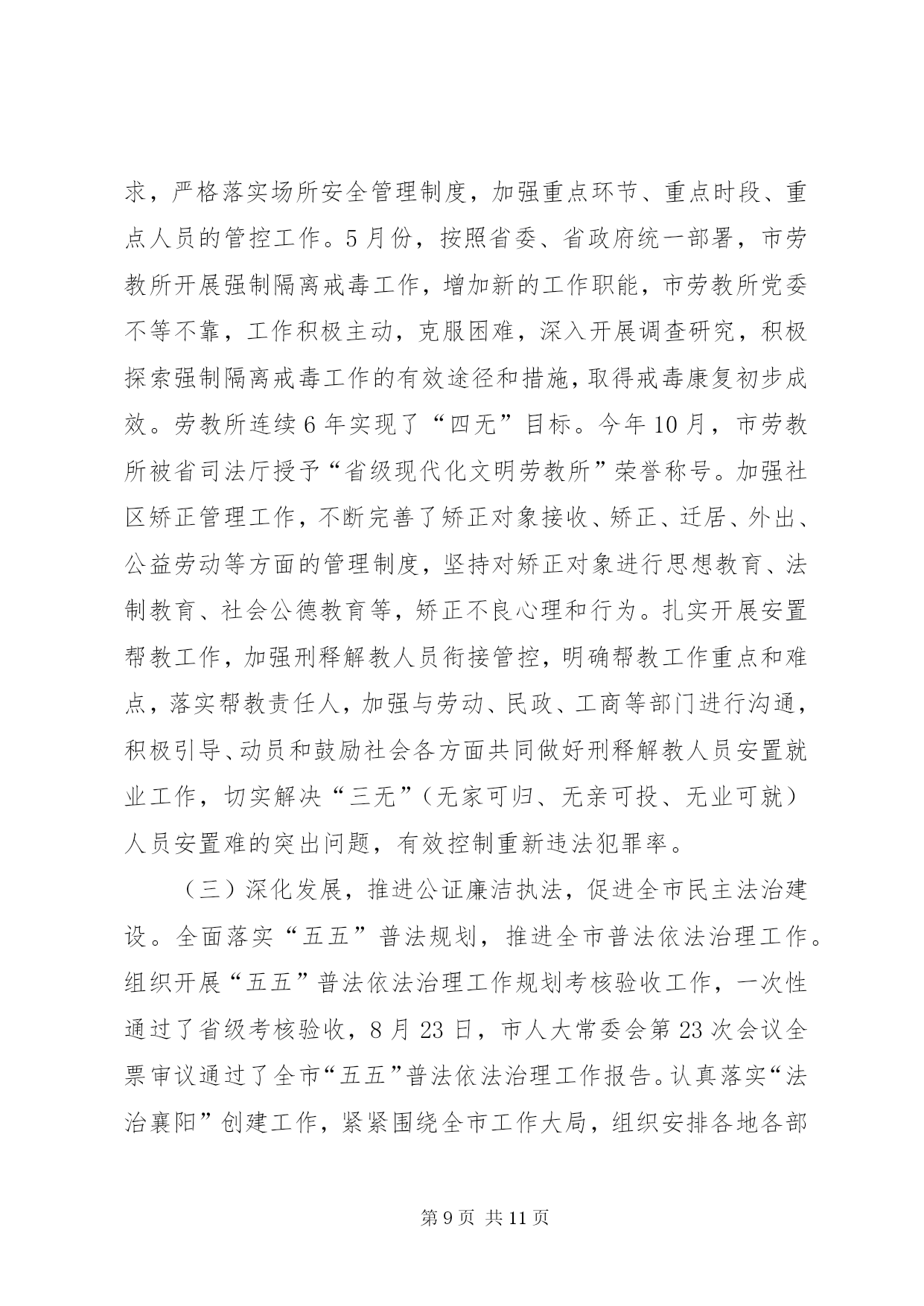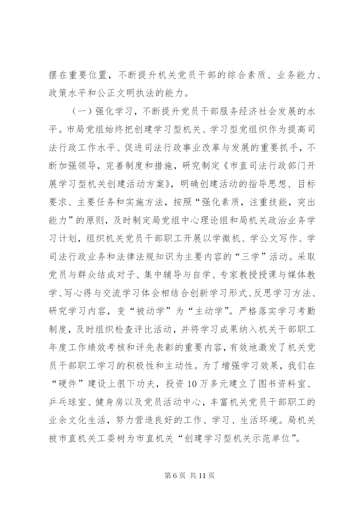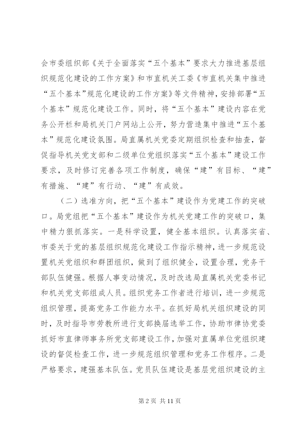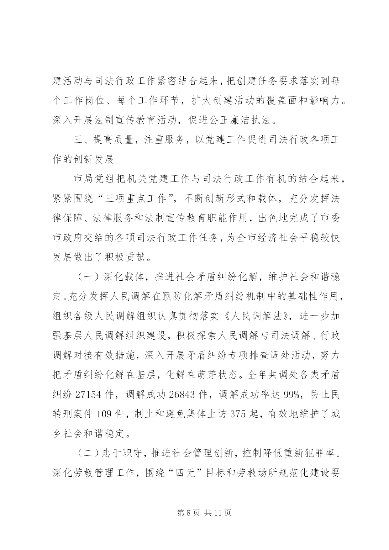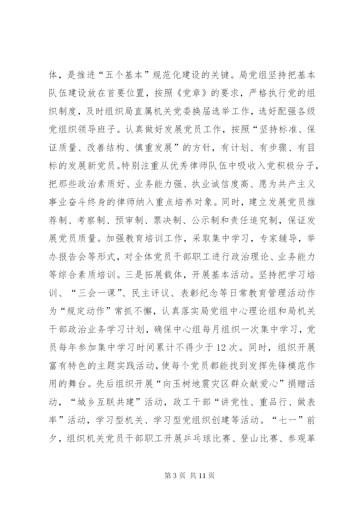 第PAGE\*Arabic\*MERGEFORMAT11页共NUMPAGES\*MERGEFORMAT11页司法局党建工作总结2011年度,市司法局党组在市委市政府的正确领导下,坚持以科学发展观为指导,认真学习贯彻党的xx届四中、五中全会精神,以党建工作为抓手,以“五个基本”建设为重点,以增强党组织的创造力、凝聚力和战斗力为目标,以加强党的执政能力建设和先进性建设为主线,以创先争优、创建学习型机关、学习型党组织活动为载体,紧紧围绕“三项重点工作”,全面加强机关党建工作,党员的思想政治觉悟进一步提高,基层党组织建设进一步加强,较好地发挥了党员的先锋模范作用和基层党组织的战斗堡垒作用,有力地促进了司法行政工作的创新与发展。一、提高认识,突出重点,努力实现机关党建工作的新突破局党组把机关党建工作纳入年度司法行政工作要点,进行安排部署,以机关党组织“五个基本”规范化建设为重点,进一步整合人力、物力、财力等资源,全面推进“五个基本”规范化建设工作,有力推动了局机关和二级单位党组织规范化建设的提档升级。(一)强化领导,确保“五个基本”规范化建设工作扎实有序开展。为加强对“五个基本”规范化建设工作的组织领导,局党组成立了“五个基本”规范化建设工作领导小组,办公室设在局直属机关党委办公室,负责活动的总体安排和具体工作。及时召开党员干部职工大会进行思想动员,组织党员干部认真学习领会市委组织部《关于全面落实“五个基本”要求大力推进基层组织规范化建设的工作方案》和市直机关工委《市直机关集中推进“五个基本”规范化建设的工作方案》等文件精神,安排部署“五个基本”规范化建设工作。同时,将“五个基本”建设内容在党务公开栏和局机关门户网站上公开,努力营造集中推进“五个基本”规范化建设氛围。局直属机关党委定期组织检查和抽查,督促指导机关党支部和二级单位党组织落实“五个基本”建设工作要求,及时修订完善各项工作制度,确保“建”有目标、“建”有措施、“建”有行动、“建”有成效。(二)选准方向,把“五个基本”建设作为党建工作的突破口。局党组把“五个基本”建设作为机关党建工作的突破口,集中精力狠抓落实。一是科学设置,健全基本组织。认真落实省、市委关于党的基层组织规范化建设工作指示精神,进一步规范设置机关党组织和群团组织,做到了组织健全,设置合理,党务干部队伍健强。根据人事变动情况,及时改选局直属机关党委书记和机关党支部组成人员。组织党务工作者进行培训,进一步规范组织管理,提高党务工作能力水平。在抓好局机关组织建设的同时,及时指导市劳教所进行支部换届选举工作,协助市律协党委抓好市直律师事务所党支部建设工作,加强对直属单位党组织建设的督促检查工作,进一步规范组织管理和党务工作程序。二是严格要求,建强基本队伍。党员队伍建设是基层党组织建设的主体,是推进“五个基本”规范化建设的关键。局党组坚持把基本队伍建设放在首要位置,按照《党章》的要求,严格执行党的组织制度,及时组织局直属机关党委换届选举工作,选好配强各级党组织领导班子。认真做好发展党员工作,按照“坚持标准、保证质量、改善结构、慎重发展”的方针,有计划、有步骤、有目标的发展新党员。特别注重从优秀律师队伍中吸收入党积极分子,把那些政治素质好、业务能力强、执业诚信度高、愿为共产主义事业奋斗终身的律师纳入重点培养对象。同时,建立发展党员推荐制、考察制、预审制、票决制、公示制和责任追究制,保证发展党员质量。加强教育培训工作,采取集中学习,专家辅导,举办报告会等形式,对全体党员干部职工进行政治理论、业务能力等综合素质培训。三是拓展载体,开展基本活动。坚持把学习培训、“三会一课”、民主评议、表彰纪念等日常教育管理活动作为“规定动作”常抓不懈,认真落实局党组中心理论组和局机关干部政治业务学习计划,确保中心组每月组织一次集中学习,党员每年参加集中学习时间累计不得少于12次。同时,组织开展富有特色的主题实践活动,使每个党员都能找到发挥先锋模范作用的舞台。先后组织开展“向玉树地震灾区群众献爱心”捐赠活动,“城乡互联共建”活动,政工干部“讲党性、重品行、做表率”活动,学习型机关、学习型党组织创建等活动。“七一”前夕,组织机关党员干部职工开展乒乓球比赛、登山比赛、参观革命烈士纪念馆、慰问困难党员等系列纪念活动,组织评选表彰市直司法行政部门先进党支部、优秀共产党员和优秀党务工作者。组织开展与王府口社区党组织“共驻共建”和与XX县区石花镇彭家岭村“结对共建”活动,特别是在活动场所和制度建设等方面,利用机关党建工作优势,对驻点村从经费到制度等方面进行帮扶。四是规范管理,完善基本制度。在认真落实《襄阳市直机关党的工作制度》规定的19项制度基础上,结合司法行政机关工作实际,按照“精简效能、简便易行、实在管用”的原则,整合形成了党内选