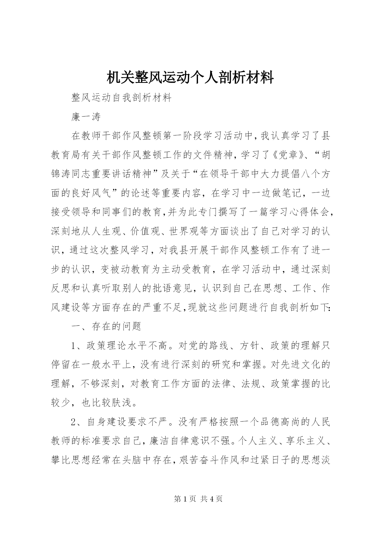 第PAGE\*Arabic\*MERGEFORMAT4页共NUMPAGES\*MERGEFORMAT4页机关整风运动个人剖析材料整风运动自我剖析材料廉一涛在教师干部作风整顿第一阶段学习活动中,我认真学习了县教育局有关干部作风整顿工作的文件精神,学习了《党章》、“胡锦涛同志重要讲话精神”及关于“在领导干部中大力提倡八个方面的良好风气”的论述等重要内容,在学习中一边做笔记,一边接受领导和同事们的教育,并为此专门撰写了一篇学习心得体会,深刻地从人生观、价值观、世界观等方面谈出了自己对学习的认识,通过这次整风学习,对我县开展干部作风整顿工作有了进一步的认识,变被动教育为主动受教育,在学习活动中,通过深刻反思和认真听取别人的批语意见,认识到自己在思想、工作、作风建设等方面存在的严重不足,现就这些问题进行自我剖析如下:一、存在的问题1、政策理论水平不高。对党的路线、方针、政策的理解只停留在一般水平上,没有进行深刻的研究和掌握。对先进文化的理解,不够深刻,对教育工作方面的法律、法规、政策掌握的比较少,也比较肤浅。2、自身建设要求不严。没有严格按照一个品德高尚的人民教师的标准要求自己,廉洁自律意识不强。个人主义、享乐主义、攀比思想经常在头脑中存在,艰苦奋斗作风和过紧日子的思想淡化,有个人名利思想。3、对工作责任心不强。在工作中,不严格要求自己,组织观念落后,集体思想不强,对原则性的东西,思想不敏感,听不得人说好话。4、联系学生不够紧密。坚持全心全意为学生服务,学生事情无小事原则做得不够,没有真正同群众打成一片,特别是在扶贫助残,捐次救困、助学等方面,没有完全尽到自己最大的努力,没有做到时刻为学生之所想,急学校之所急。二、存在问题的原因1、理论学习不够。对马克思、列宁主义、毛泽东思想和邓小平理论、胡锦涛同志关于“八荣八耻”等重要论述学习不够深入,对其科学的观点理解得不深透,对建设社会主义和谐社会和落实科学发展观的基本思想没有完整的认识,平时学习只是流于形式,掌握的也只是只言片语,学习缺乏深刻的思考,没有做到真正用马克思列宁主义的立场、观点和方法观察事物,研究新情况、处理新问题。思想和工作存在有主观性、局限性和片面性,站的不高,想的不远。2.原则意识不强。总是错误的认识,只要是自己做了好事,就应该对得起别人,对得对学校,往往在做好事的同时,也是做着着有损原则的坏事。在对待什么是好事,什么是坏事上,自己没有一个原则性的思考,想当然,好人主义思想严重,导致事出了一些有损单位形象,有损集体利益的事。3、主动意识不够。工作中只注重对自己份内的事情的考虑,没有站在更的立场想问题。总是认识自己的工作能完成,不拖学校的后腿就行,不会积极主动的去为学校着想,不会主动地为别人着想,干点工作就会想到报酬,或者就是得过且过,不思进取,不精益求精。三、初步整改措施1、进一步坚持定政治信念。要通过干部作风整顿学习活动,系统地学习马列主义、毛泽东思想、“胡锦涛同志重要讲话精神”及关于“在领导干部中大力提倡八个方面的良好风气”、构建和谐社会和“八荣八耻”的重要文献和思想精髓,系统掌握其基本观点、基本方法。除尘滤布牢固树立科学的世界观、方法论;牢固树立全心全意为人民服务的思想,进一步增强共产党员的先锋模范意识,明确思想要求,树立先进形象。2、加强学习,提高素质。牢固树立终身学习的观念,即要学政治、学理论,又要学业务、学法律、学科技。要坚持理论联系实际,把所学的理论与实际工作相结合,不断提高自身综合素质,提高政策理论水平和业务能力。3、进一步加强自身建设。要以这次干部作风整顿为契机,牢固树立五种态度:一是共产党人先进意识;二是解放思想,开拓创新意识;三是真抓实干,勇挑重担;四是严以待已,廉洁自律;五是服务群众,奉献社会。通过树立和发扬五种意识,努力把自己培养成为为人师表的人民教师。4、振奋精神,务实创新。彻底改变落后的思想观念,积极主动的接受新思想,新信息;进一步加强政策法规学习,严格遵守各项规章制度,一切以集体利益为出发点,坚持原则,公正办事,服务和服从于大局。