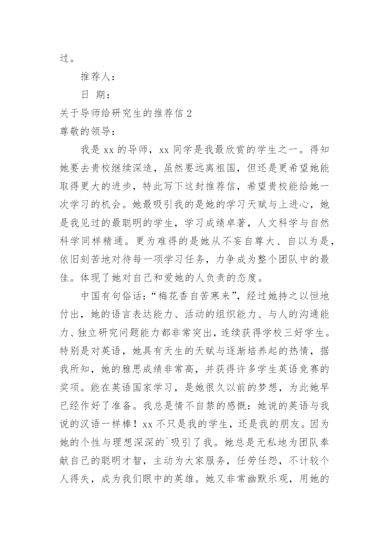 导师给研究生的推荐信关于导师给研究生的推荐信随着个人的素质不断提高,推荐信与我们的生活息息相关,不同种类的推荐信具有不同的用途。写起推荐信来就毫无头绪?以下是小编精心整理的关于导师给研究生的推荐信,欢迎阅读,希望大家能够喜欢。关于导师给研究生的推荐信1尊敬的领导:您好!本人应xx同学请求,推荐该生到xx大学进行研究生阶段的学习。本人是该生在xx大学本科生阶段的系主任,曾指导该生参加第十届“挑战杯”大学生课外学术科技作品竞赛。在指导该生创作作品的过程中,可以发现,该生做事刻苦勤奋,认真负责,有极强的.责任心;思维活跃,能运用现有知识,并查阅相关文献来解决研究中出现的问题;总结分析能力和文字表达能力极强,工作能力十分出色。在个人品质方面,该生谦虚礼貌,坚定执着,在困难面前不轻言放弃,而且善于沟通交流,乐于助人,能与团队中不同年级、不同背景的同学进行良好高效地沟通与合作。经过近一年的了解,可以看出,该生对科研有一定兴趣,并逐渐获得了科研的素质与能力,故推荐到贵校,望审核通过。推荐人:日期:关于导师给研究生的推荐信2尊敬的领导:我是xx的导师,xx同学是我最欣赏的学生之一。得知她要去贵校继续深造,虽然要远离祖国,但还是更希望她能取得更大的进步,特此写下这封推荐信,希望贵校能给她一次学习的机会。她最吸引我的是她的学习天赋与上进心,她是我见过的最聪明的学生,学习成绩卓著,人文科学与自然科学同样精通。更为难得的是她从不妄自尊大、自以为是,依旧刻苦地对待每一项学习任务,力争成为整个团队中的最佳。体现了她对自己和爱她的人负责的态度。中国有句俗话:“梅花香自苦寒来”,经过她持之以恒地付出,她的语言表达能力、活动的组织能力、与人的沟通能力、独立研究问题能力都非常突出,连续获得学校三好学生。特别是对英语,她具有天生的天赋与逐渐培养起的热情,据我所知,她的雅思成绩非常高,并获得许多学生英语竞赛的奖项。能在英语国家学习,是她很久以前的梦想,为此她早已经作好了准备。我总是情不自禁的感慨:她说的英语与我说的汉语一样棒!xx不只是我的学生,还是我的朋友。因为她的个性与理想深深的`吸引了我。她总是无私地为团队奉献自己的聪明才智,主动为大家服务,任劳任怨,不计较个人得失,成为我们眼中的英雄。她又非常幽默乐观,用她的微笑传递给大家一天的好心情。她又是一名体育健将,长跑、游泳、野外探险是她生活的一部分,从中她的意志得到了锻炼。我们交往非常愉快,她特别乐于与我一起分享她成长中的喜怒哀乐。还常常与我谈论电影艺术和旅游,美国的文化与风景深深地吸引了她,那里有她一个梦想。真舍不得她离开祖国,但我尊重她的选择,相信她会学有所成,正如我相信我们的友谊天长地久一样。谢谢!此致敬礼推荐人:xxxxx年xx月xx日
