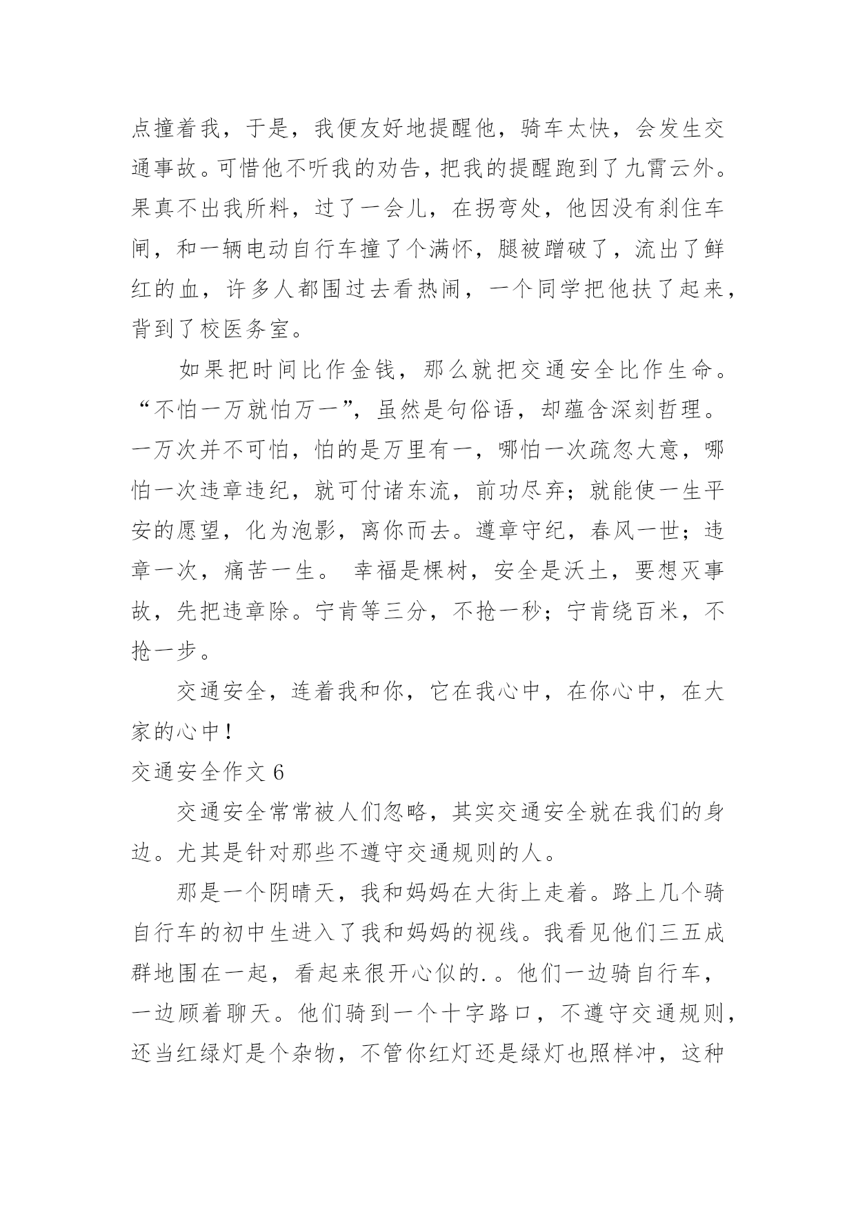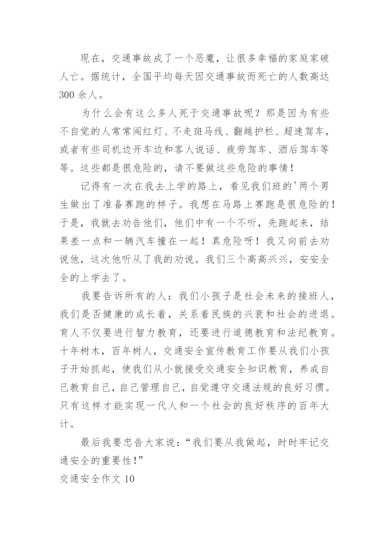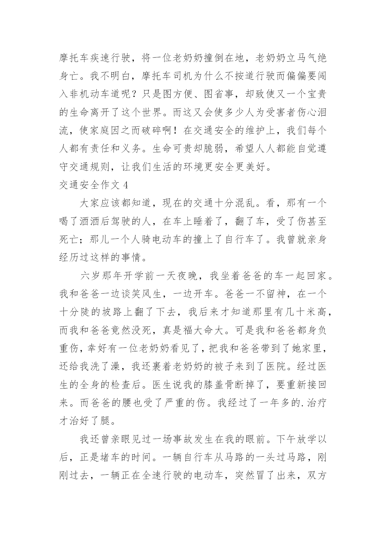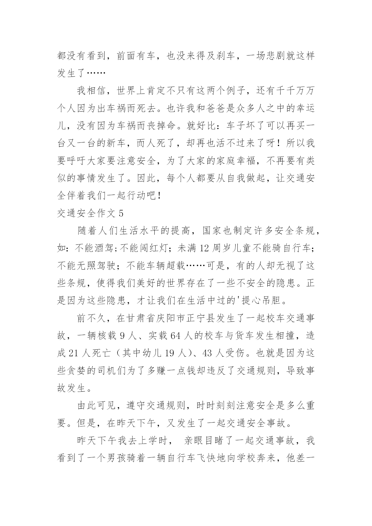 交通安全作文交通安全作文在平日的学习、工作和生活里,大家都写过作文吧,作文是人们把记忆中所存储的有关知识、经验和思想用书面形式表达出来的记叙方式。如何写一篇有思想、有文采的作文呢?下面是小编精心整理的交通安全作文,希望能够帮助到大家。交通安全作文1随着社会的不断发展进步,汽车已经成了很常见的交通工具。但是,它在给人们带来方便的同时,也给人们带来了许多灾难,而诸多事故的发生,是由于人们违反交通规则造成的。暑假里的一天,我在街上闲逛时,突然看见一个小男孩骑着自行车狂奔而来,他嘴里哼着小曲,脸上还不时露出得意的笑容。我想:他这样做不是很危险吗?果不其然,当我路过操场时,看到一群人围在一起,我挤进去一看,原来是刚才那个小男孩骑车太猛,在拐弯处突然迎面驶来一辆大货车,面对突如其来的意外,他还没来得急刹车,就撞向了大货车,连人带车一起摔了出去。小男孩的父母闻讯赶来,抱着躺在地上的小男孩,哭得死去活来……我陷入了深思:如果他遵守交通规则,悲剧还会发生吗?上帝是公平的,也是吝啬的.,它只给每个人一次生命,如果谁不珍惜,失去了,就不会再有第二次机会,让交通安全牢记在我们心中吧!在日常生活中,交通事故就像一颗威力十足的“炸弹”,隐藏在人们的身边,一旦爆炸,就会毁掉一个个幸福美满的家庭,如果我们每个人心中装着交通规则,每个人都自觉遵守交通法规,就一定可以避免悲惨事故的发生,让交通法规在我们每个人心中生根,让我们所有人都牢牢记住,遵守交通规则就是珍爱生命。同学们,行动起来吧!让交通安全永远铭记在我们心间,让每个人都做珍爱生命的文明小公民。交通安全作文2交通安全是我们生活中的必然条件,是每个生活在这个世界里都面临的。交通安全影响到了我们生活中的出行,交通安全是生活的必须,是要用我们的安全来影响所有的人,这样才能让生活过的开心快乐。我亲身体会到交通,交通如果是我们每个人都遵守的话,也不一定能够给我们带来多大安全隐患,只是有好多不懂得交通规则的人,不把安全放到第一位所造成的,如果我们都按照规则行驶的话,也不会带来那么多的麻烦。其实生活里好多事情是都不能够越位的,如果要是越位了,那么你就得承担好大的`风险,这样就会给生活,给交通带来麻烦。这样的生活就是侵犯了他人的健康,也影响了你自己的健康,是用你的违反换来的,是对人对己都不利得。生活中的规则是给我们自己定的,是我们大家来遵守的,是所有生活中都应遵守的,这个红线是不允许超越的,是一个铜墙铁壁,在这里是什么都大不了安全的。在生活中什么都比不了安全,是安全让人变得有知识,安全让人们懂得这是个禁行线。有我们的遵守带来的就是大家的安全,安全最重要了,安全面年前什么都是渺小不值得一提是。安全最大。安全带给人的是平安,是福分。交通安全影响大家,影响我们的出行,让我们遵守规则,让交通安全伴我行。交通安全作文3交通安全宽阔的马路,先进的道路安全设施,一直在更新的交通法规,难道真能对交通安全起到持久稳固的作用吗?如果是,那为何交通事故还是年年不断的频繁发生?可见交通安全保障并没有达到真正的效果。而这究竟又是谁的错呢?这是人们的错。国家给了我们交通安全的保障,得失我们往往却只顾自己的方便,只顾自己的利益,并未能好好的遵守交通法规。大家想过如此的`后果会是怎样的吗?看!那辆超载的大卡车正吃力的前进着,司机见了红灯也不停车,随意乱闯,只是为了赶交差,得一笔工钱,不顾违章的后果。可这位司机知道吗?只是为了这么一笔工钱违反交规,一刹那间就很有可能会葬送生命,而这无价的生命又岂是金钱可以买到的?看!那场悲剧终究还是上演了,鲜血染红了车轮,受害者的亲人悲痛万分……啊!又是一场悲剧!人行道上,一辆摩托车疾速行驶,将一位老奶奶撞倒在地,老奶奶立马气绝身亡。我不明白,摩托车司机为什么不按道行驶而偏偏要闯入非机动车道呢?只是图方便、图省事,却致使又一个宝贵的生命离开了这个世界。而这又会使多少人为受害者伤心泪流,使家庭因之而破碎啊!在交通安全的维护上,我们每个人都有责任和义务。生命可贵却脆弱,希望人人都能自觉遵守交通规则,让我们生活的环境更安全更美好。交通安全作文4大家应该都知道,现在的交通十分混乱。看,那有一个喝了酒酒后驾驶的人,在车上睡着了,翻了车,受了伤甚至死亡;那儿一个人骑电动车的撞上了自行车了。我曾就亲身经历过这样的事情。六岁那年开学前一天夜晚,我坐着爸爸的车一起回家。我和爸爸一边谈笑风生,一边开车。爸爸一不留神,在一个十分陡的坡路上翻了下去,我后来才知道那里有几十米高,而我和爸爸竟然没死,真是福大命大。可是我和爸爸都身负重伤,幸好有一位老奶奶看见了,把我和爸爸带到了她家里,还给我洗了澡,我还裹着老奶奶的被子来到了医院。经过医生的全身的检查后。医生说我的膝盖骨断掉了,要重新接回来。而爸爸的腰也受了严重的伤。我经过了一年多的.治疗才治好了