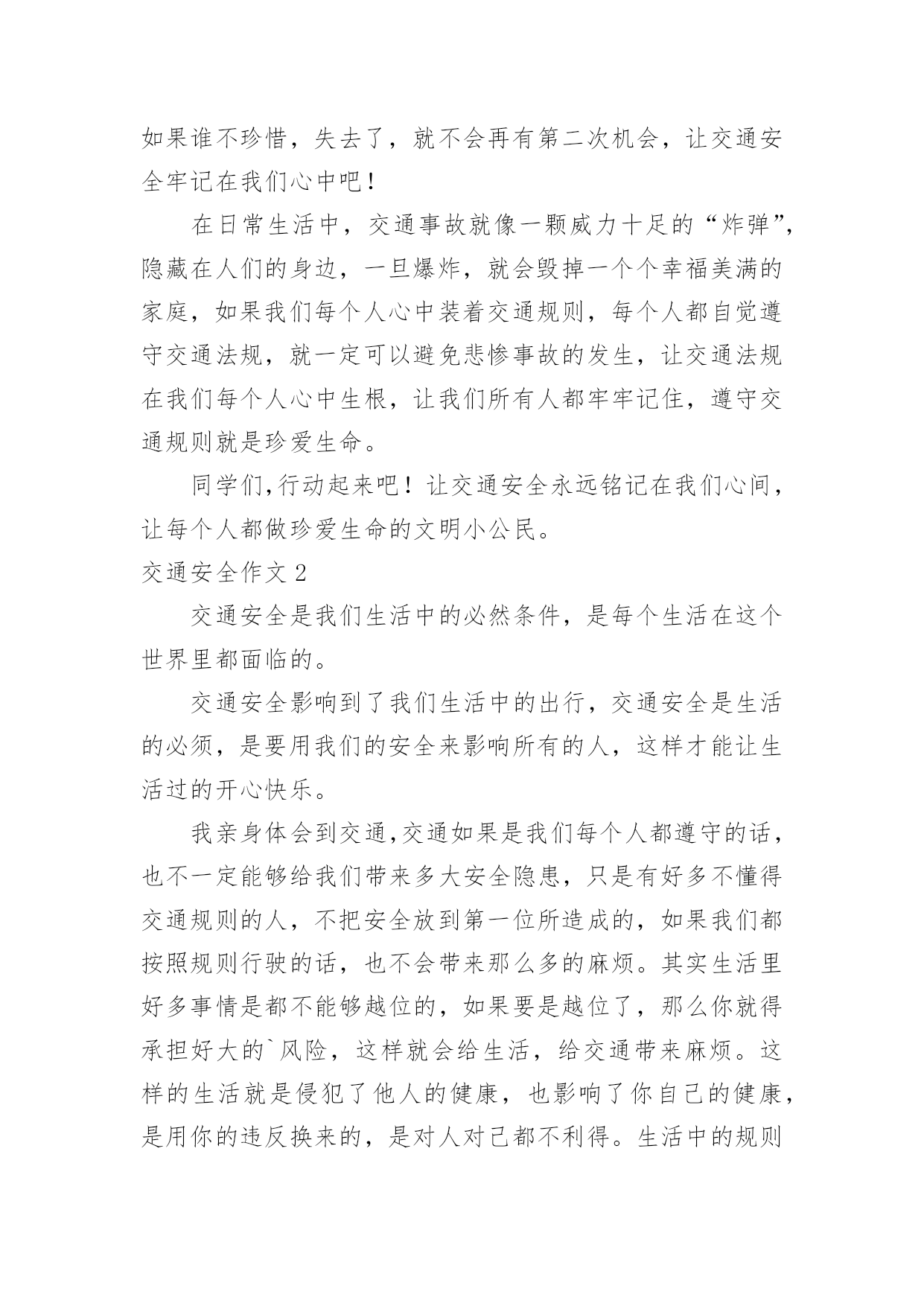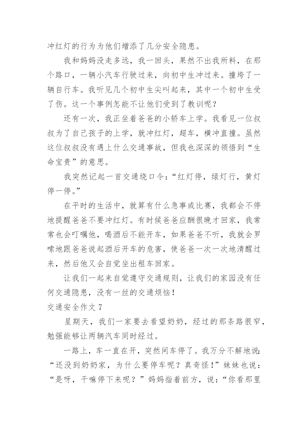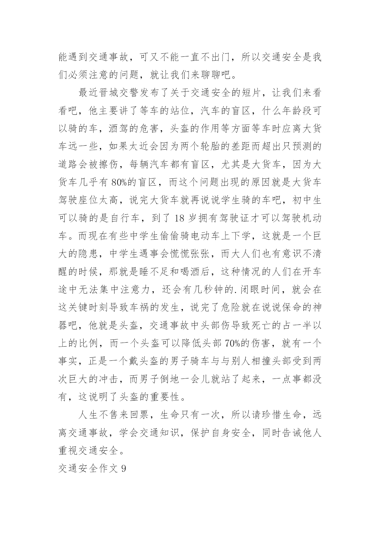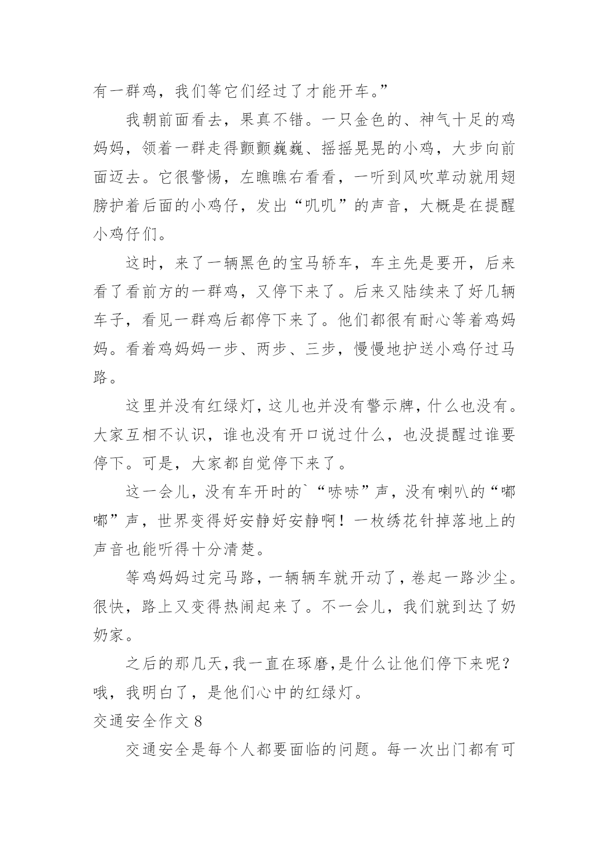 交通安全作文交通安全作文在平日的学习、工作和生活里,大家都写过作文吧,作文是人们把记忆中所存储的有关知识、经验和思想用书面形式表达出来的记叙方式。如何写一篇有思想、有文采的作文呢?下面是小编精心整理的交通安全作文,希望能够帮助到大家。交通安全作文1随着社会的不断发展进步,汽车已经成了很常见的交通工具。但是,它在给人们带来方便的同时,也给人们带来了许多灾难,而诸多事故的发生,是由于人们违反交通规则造成的。暑假里的一天,我在街上闲逛时,突然看见一个小男孩骑着自行车狂奔而来,他嘴里哼着小曲,脸上还不时露出得意的笑容。我想:他这样做不是很危险吗?果不其然,当我路过操场时,看到一群人围在一起,我挤进去一看,原来是刚才那个小男孩骑车太猛,在拐弯处突然迎面驶来一辆大货车,面对突如其来的意外,他还没来得急刹车,就撞向了大货车,连人带车一起摔了出去。小男孩的父母闻讯赶来,抱着躺在地上的小男孩,哭得死去活来……我陷入了深思:如果他遵守交通规则,悲剧还会发生吗?上帝是公平的,也是吝啬的.,它只给每个人一次生命,如果谁不珍惜,失去了,就不会再有第二次机会,让交通安全牢记在我们心中吧!在日常生活中,交通事故就像一颗威力十足的“炸弹”,隐藏在人们的身边,一旦爆炸,就会毁掉一个个幸福美满的家庭,如果我们每个人心中装着交通规则,每个人都自觉遵守交通法规,就一定可以避免悲惨事故的发生,让交通法规在我们每个人心中生根,让我们所有人都牢牢记住,遵守交通规则就是珍爱生命。同学们,行动起来吧!让交通安全永远铭记在我们心间,让每个人都做珍爱生命的文明小公民。交通安全作文2交通安全是我们生活中的必然条件,是每个生活在这个世界里都面临的。交通安全影响到了我们生活中的出行,交通安全是生活的必须,是要用我们的安全来影响所有的人,这样才能让生活过的开心快乐。我亲身体会到交通,交通如果是我们每个人都遵守的话,也不一定能够给我们带来多大安全隐患,只是有好多不懂得交通规则的人,不把安全放到第一位所造成的,如果我们都按照规则行驶的话,也不会带来那么多的麻烦。其实生活里好多事情是都不能够越位的,如果要是越位了,那么你就得承担好大的`风险,这样就会给生活,给交通带来麻烦。这样的生活就是侵犯了他人的健康,也影响了你自己的健康,是用你的违反换来的,是对人对己都不利得。生活中的规则是给我们自己定的,是我们大家来遵守的,是所有生活中都应遵守的,这个红线是不允许超越的,是一个铜墙铁壁,在这里是什么都大不了安全的。在生活中什么都比不了安全,是安全让人变得有知识,安全让人们懂得这是个禁行线。有我们的遵守带来的就是大家的安全,安全最重要了,安全面年前什么都是渺小不值得一提是。安全最大。安全带给人的是平安,是福分。交通安全影响大家,影响我们的出行,让我们遵守规则,让交通安全伴我行。交通安全作文3交通安全宽阔的马路,先进的道路安全设施,一直在更新的交通法规,难道真能对交通安全起到持久稳固的作用吗?如果是,那为何交通事故还是年年不断的频繁发生?可见交通安全保障并没有达到真正的效果。而这究竟又是谁的错呢?这是人们的错。国家给了我们交通安全的保障,得失我们往往却只顾自己的方便,只顾自己的利益,并未能好好的遵守交通法规。大家想过如此的`后果会是怎样的吗?看!那辆超载的大卡车正吃力的前进着,司机见了红灯也不停车,随意乱闯,只是为了赶交差,得一笔工钱,不顾违章的后果。可这位司机知道吗?只是为了这么一笔工钱违反交规,一刹那间就很有可能会葬送生命,而这无价的生命又岂是金钱可以买到的?看!那场悲剧终究还是上演了,鲜血染红了车轮,受害者的亲人悲痛万分……啊!又是一场悲剧!人行道上,一辆摩托车疾速行驶,将一位老奶奶撞倒在地,老奶奶立马气绝身亡。我不明白,摩托车司机为什么不按道行驶而偏偏要闯入非机动车道呢?只是图方便、图省事,却致使又一个宝贵的生命离开了这个世界。而这又会使多少人为受害者伤心泪流,使家庭因之而破碎啊!在交通安全的维护上,我们每个人都有责任和义务。生命可贵却脆弱,希望人人都能自觉遵守交通规则,让我们生活的环境更安全更美好。交通安全作文4大家应该都知道,现在的交通十分混乱。看,那有一个喝了酒酒后驾驶的人,在车上睡着了,翻了车,受了伤甚至死亡;那儿一个人骑电动车的撞上了自行车了。我曾就亲身经历过这样的事情。六岁那年开学前一天夜晚,我坐着爸爸的车一起回家。我和爸爸一边谈笑风生,一边开车。爸爸一不留神,在一个十分陡的坡路上翻了下去,我后来才知道那里有几十米高,而我和爸爸竟然没死,真是福大命大。可是我和爸爸都身负重伤,幸好有一位老奶奶看见了,把我和爸爸带到了她家里,还给我洗了澡,我还裹着老奶奶的被子来到了医院。经过医生的全身的检查后。医生说我的膝盖骨断掉了,要重新接回来。而爸爸的腰也受了严重的伤。我经过了一年多的.治疗才治好了
