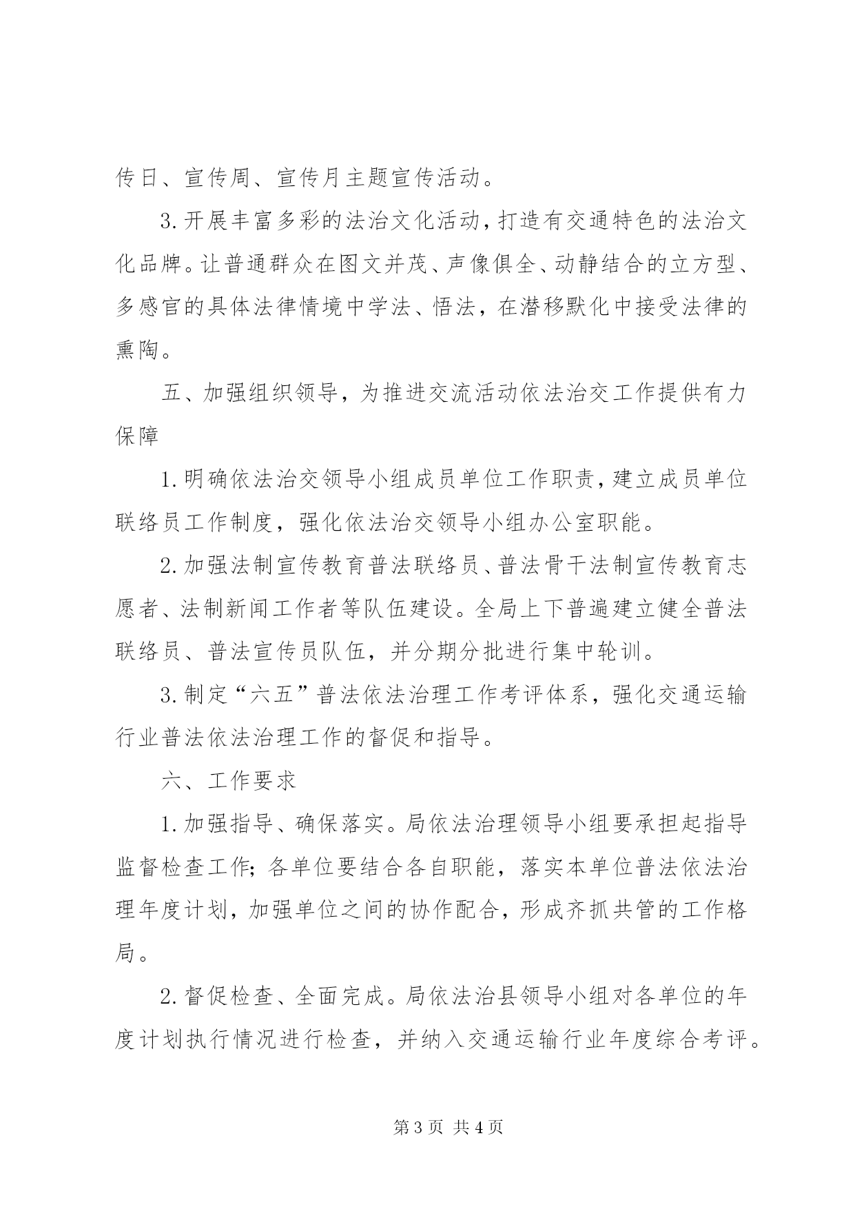 第PAGE\*Arabic\*MERGEFORMAT4页共NUMPAGES\*MERGEFORMAT4页交通系统普法工作计划根据2012年全县普法依法治理工作要求,我局以邓小平理论和“三个代表”重要思想为指导,全面贯彻落实科学发展观和“十二五”规划,坚持普治并举,加大法制宣传教育力度,推进普法依法治交工作深入开展,为交通运输业的健康平稳发展提供坚强的法治保障。一、认真做好“六五”法制宣传教育启动工作,立足于推动交通运输行业普法依法治理新局面1.制定《关于在交通运输行业中开展第六个五年法制宣传教育规划》。2、指导督促交通运输系统内各单位的“六五”普法启动工作,组织好《规划》和《决议》的学习宣传贯彻落实工作,形成领导重视、全员参与的工作氛围。3.抓好“六五”法制宣传教育教材征订工作。二、扎实推进依法治理,促进管理创新,提高法治化管理水平1.全面推进依法治理交通工作,指导组织开展各种形式的依法治理活动,促进依法行政,提高交通运输行业依法管理和依法办事水平。3.扎实推进基层法治创建活动,继续开展法治示范单位、诚信守法企业,促进基层各单位民主法治建设。三、深化“法律六进”活动,服务交通运输经济和谐发展1.大力加强法律学习宣传,进一步增强交通系统干群的学法意识,树立和维护法律的权威;继续加强交通运输行业发展、保障和改善民生以及社会管理相关法规的宣传,做好《中华人民共和国公路保护条例》、《省农村公路条例》等法规的宣贯工作,不断提高法治意识和法律素质。2.深化“法律六进”主题活动,扎实推进基层法制宣传教育工作的开展。深化“法律进机关、进乡村、进社区、进学校、进企业、进单位”主题活动。3.加强领导干部、公务员法制宣传教育,制定培训计划,增设新的学习内容,采取集中培训、辅导学习、写体会、考试考核的方法,促使树立依法行政、依法办事的理念,使领导干部和公务员学法制度化、经常化、规范化。四、加强法制宣传教育阵地建设,创新工作新思路,推进法治文化建设1.搭起具有本行业特色的法制宣传平台,在完善中抓提高,在提高中求创新。一是开展常规性纪念活动,适时开展宣传教育活动。二是办好“法治广场”交通橱窗。三是充分利用公开栏,开设“法律专栏”,宣传相关法律法规。2.组织开展2012年“江淮普法行”和“12.4”全国法制宣传日系列主题宣传活动,集中时间,组织人员,开展专项法律宣传日、宣传周、宣传月主题宣传活动。3.开展丰富多彩的法治文化活动,打造有交通特色的法治文化品牌。让普通群众在图文并茂、声像俱全、动静结合的立方型、多感官的具体法律情境中学法、悟法,在潜移默化中接受法律的熏陶。五、加强组织领导,为推进交流活动依法治交工作提供有力保障1.明确依法治交领导小组成员单位工作职责,建立成员单位联络员工作制度,强化依法治交领导小组办公室职能。2.加强法制宣传教育普法联络员、普法骨干法制宣传教育志愿者、法制新闻工作者等队伍建设。全局上下普遍建立健全普法联络员、普法宣传员队伍,并分期分批进行集中轮训。3.制定“六五”普法依法治理工作考评体系,强化交通运输行业普法依法治理工作的督促和指导。六、工作要求1.加强指导、确保落实。局依法治理领导小组要承担起指导监督检查工作;各单位要结合各自职能,落实本单位普法依法治理年度计划,加强单位之间的协作配合,形成齐抓共管的工作格局。2.督促检查、全面完成。局依法治县领导小组对各单位的年度计划执行情况进行检查,并纳入交通运输行业年度综合考评。3.责任落实、奖惩分明。各单位对年度计划执行要明确责任,落实到位,对工作开展好的单位和个人,适时进行表彰和奖励;对工作不力,敷衍塞责的单位和个人,给予通报批评,限期整改,对整改不力的责任人给予行政处分,确保今年普法计划顺利实施。