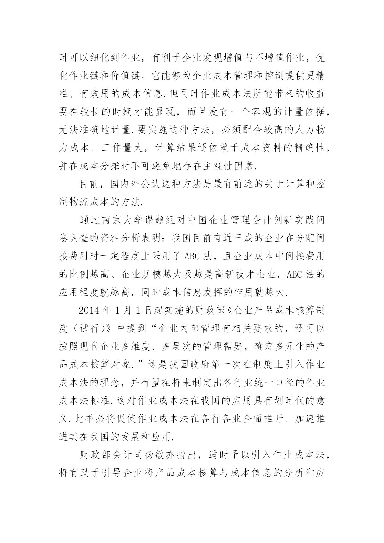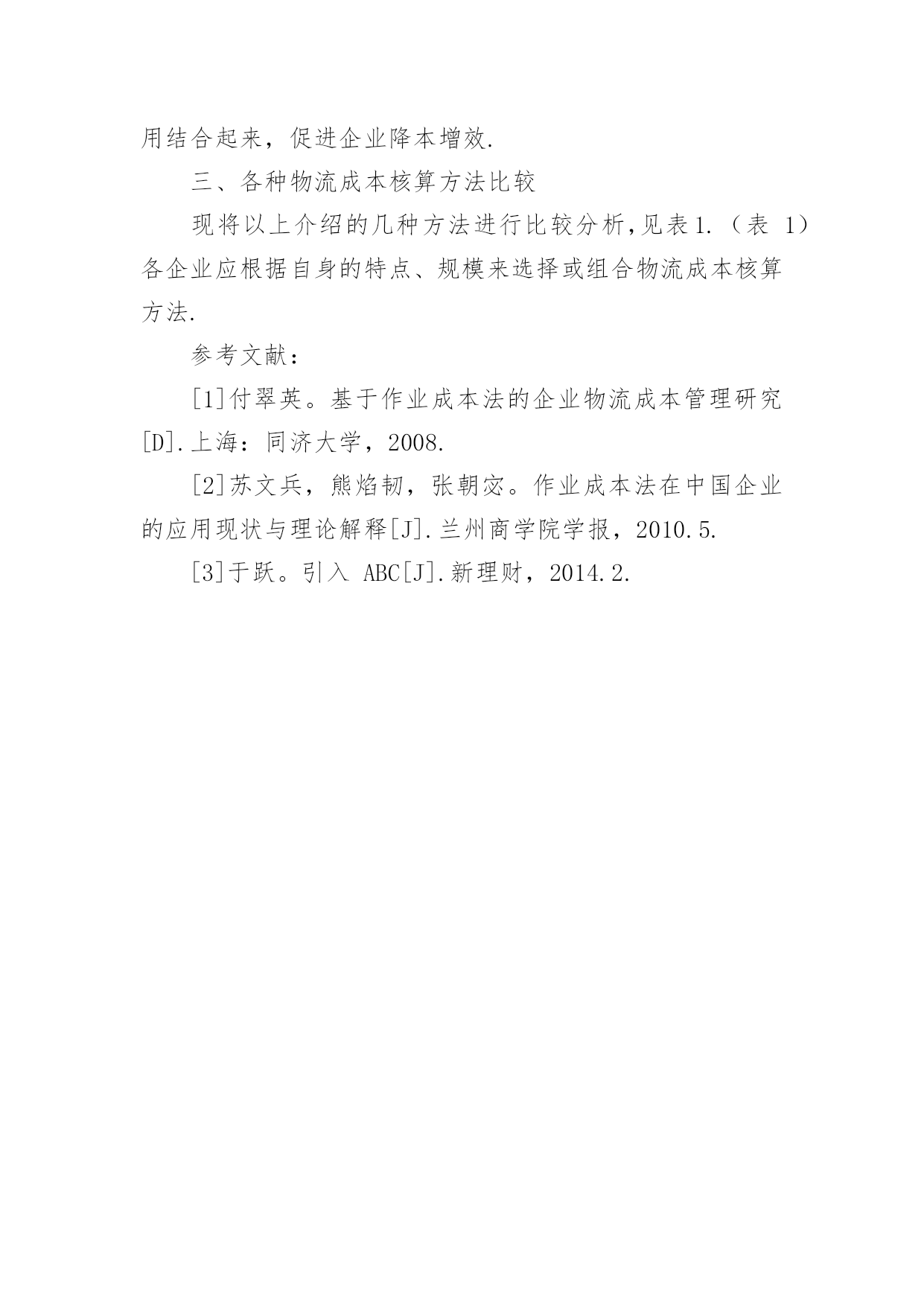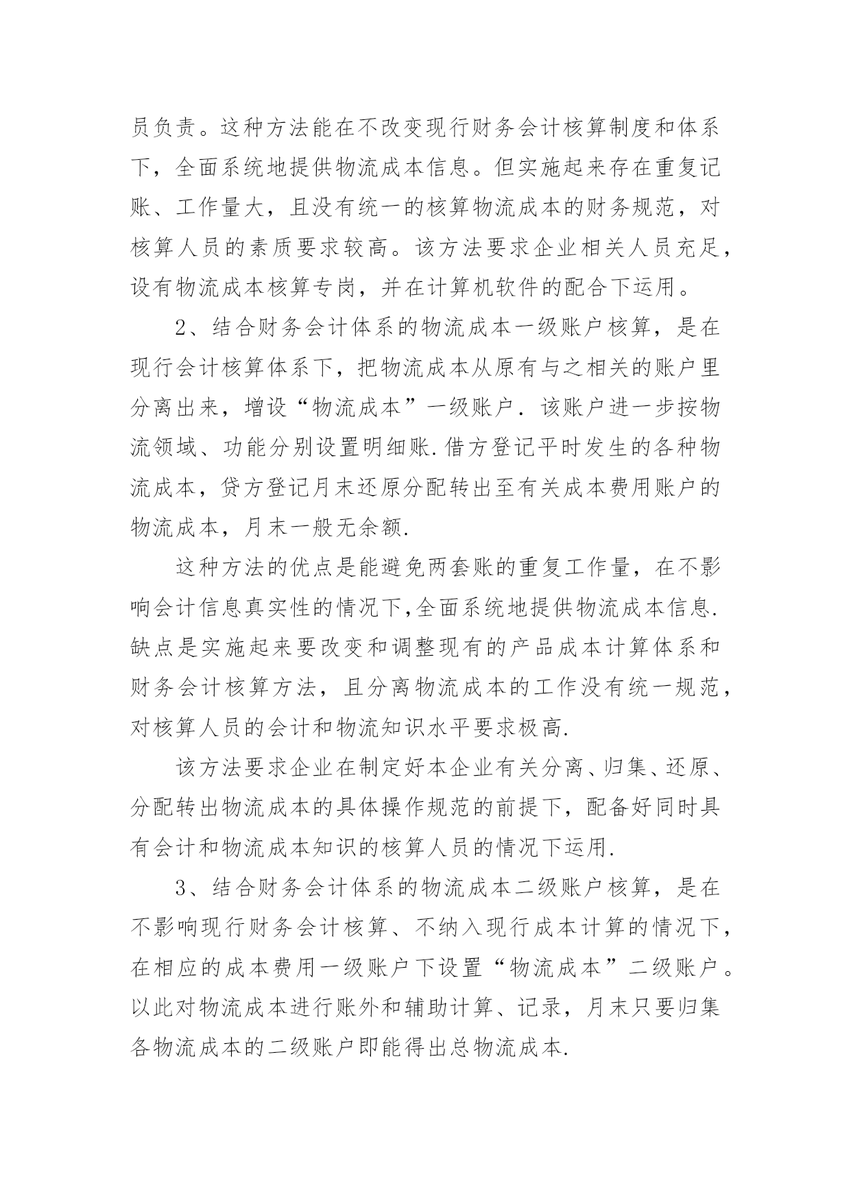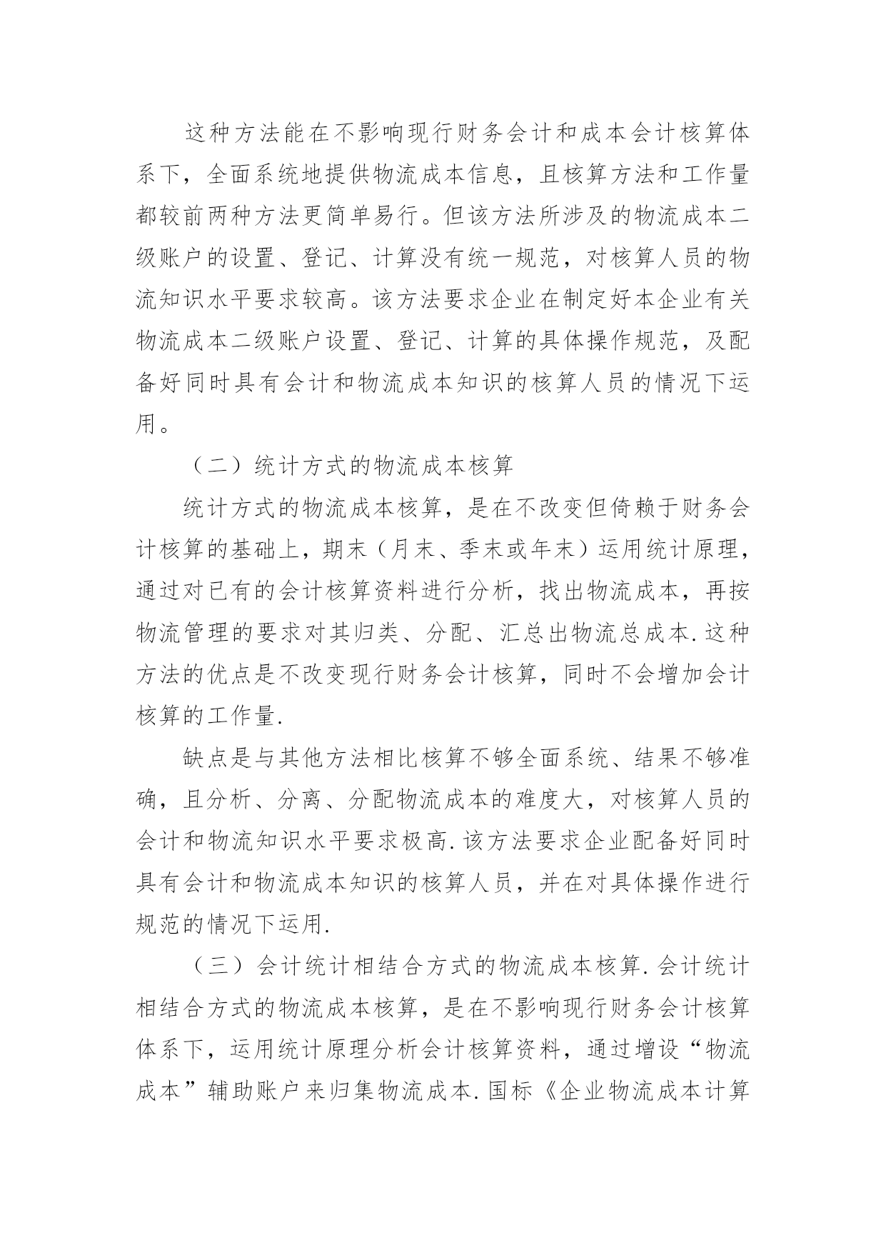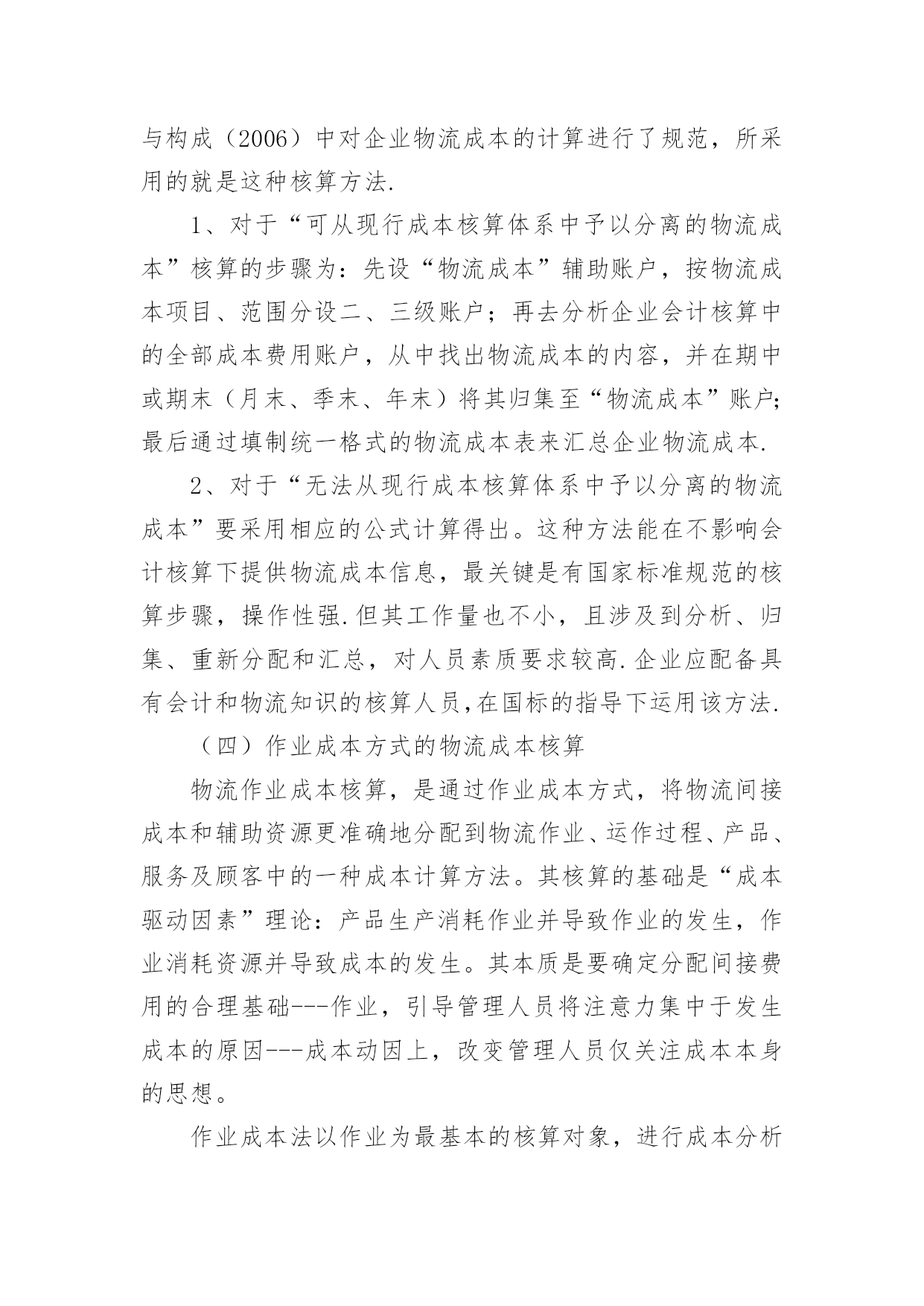物流成本核算的方法介绍物流成本核算的方法介绍一、物流成本及核算我国新修订的《国家标准---物流术语》(2006)中对物流成本的定义是:物流活动中所消耗的物化劳动和活劳动的货币表现.《企业物流成本计算与构成》中进一步说明“即产品在包装、运输、储存、装卸搬运、流通加工、物流信息、物流管理等过程中所耗费的人力、物力和财力的总和以及与存货有关的资金占用成本、物品损耗成本、保险和税收成本”.由于物流成本具有隐匿性这个突出的特点,也就意味着物流成本的核算难度大.这是目前存在于企业物流成本核算和管理控制中的主要问题.本文较系统全面的介绍并比较我国先后出现的四类六种物流成本核算方法,以供不同的企业根据自身情况选用.二、物流成本核算方法(一)会计方式的物流成本核算会计方式的物流成本核算,按照操作模式不同可进一步细分为以下三种具体方法:1、建立独立的物流成本核算体系,指的是独立于现行会计核算体系之外,建立专属于物流成本的凭证、账户和报表体系。即企业实行两套账管理。一套为会计账,由记账会计人员负责;一套为专门的物流成本账,由物流成本核算人员负责。这种方法能在不改变现行财务会计核算制度和体系下,全面系统地提供物流成本信息。但实施起来存在重复记账、工作量大,且没有统一的核算物流成本的财务规范,对核算人员的素质要求较高。该方法要求企业相关人员充足,设有物流成本核算专岗,并在计算机软件的配合下运用。2、结合财务会计体系的物流成本一级账户核算,是在现行会计核算体系下,把物流成本从原有与之相关的账户里分离出来,增设“物流成本”一级账户.该账户进一步按物流领域、功能分别设置明细账.借方登记平时发生的各种物流成本,贷方登记月末还原分配转出至有关成本费用账户的物流成本,月末一般无余额.这种方法的优点是能避免两套账的重复工作量,在不影响会计信息真实性的情况下,全面系统地提供物流成本信息.缺点是实施起来要改变和调整现有的产品成本计算体系和财务会计核算方法,且分离物流成本的工作没有统一规范,对核算人员的会计和物流知识水平要求极高.该方法要求企业在制定好本企业有关分离、归集、还原、分配转出物流成本的具体操作规范的前提下,配备好同时具有会计和物流成本知识的核算人员的情况下运用.3、结合财务会计体系的物流成本二级账户核算,是在不影响现行财务会计核算、不纳入现行成本计算的情况下,在相应的成本费用一级账户下设置“物流成本”二级账户。以此对物流成本进行账外和辅助计算、记录,月末只要归集各物流成本的二级账户即能得出总物流成本.这种方法能在不影响现行财务会计和成本会计核算体系下,全面系统地提供物流成本信息,且核算方法和工作量都较前两种方法更简单易行。但该方法所涉及的物流成本二级账户的设置、登记、计算没有统一规范,对核算人员的物流知识水平要求较高。该方法要求企业在制定好本企业有关物流成本二级账户设置、登记、计算的具体操作规范,及配备好同时具有会计和物流成本知识的核算人员的情况下运用。(二)统计方式的物流成本核算统计方式的物流成本核算,是在不改变但倚赖于财务会计核算的基础上,期末(月末、季末或年末)运用统计原理,通过对已有的会计核算资料进行分析,找出物流成本,再按物流管理的要求对其归类、分配、汇总出物流总成本.这种方法的优点是不改变现行财务会计核算,同时不会增加会计核算的工作量.缺点是与其他方法相比核算不够全面系统、结果不够准确,且分析、分离、分配物流成本的难度大,对核算人员的会计和物流知识水平要求极高.该方法要求企业配备好同时具有会计和物流成本知识的核算人员,并在对具体操作进行规范的情况下运用.(三)会计统计相结合方式的物流成本核算.会计统计相结合方式的物流成本核算,是在不影响现行财务会计核算体系下,运用统计原理分析会计核算资料,通过增设“物流成本”辅助账户来归集物流成本.国标《企业物流成本计算与构成(2006)中对企业物流成本的计算进行了规范,所采用的就是这种核算方法.1、对于“可从现行成本核算体系中予以分离的物流成本”核算的步骤为:先设“物流成本”辅助账户,按物流成本项目、范围分设二、三级账户;再去分析企业会计核算中的全部成本费用账户,从中找出物流成本的内容,并在期中或期末(月末、季末、年末)将其归集至“物流成本”账户;最后通过填制统一格式的物流成本表来汇总企业物流成本.2、对于“无法从现行成本核算体系中予以分离的物流成本”要采用相应的公式计算得出。这种方法能在不影响会计核算下提供物流成本信息,最关键是有国家标准规范的核算步骤,操作性强.但其工作量也不小,且涉及到分析、归集、重新分配和汇总,对人员素质要求较高.企业应配备具有会计和物流知识的核算人员,在国标的指导下运用该方法.(四)作业成本方式的物流成本核算物流作业成本核算,是通过作业成本方式,将物流间接成本和辅助资源更准确地分配到