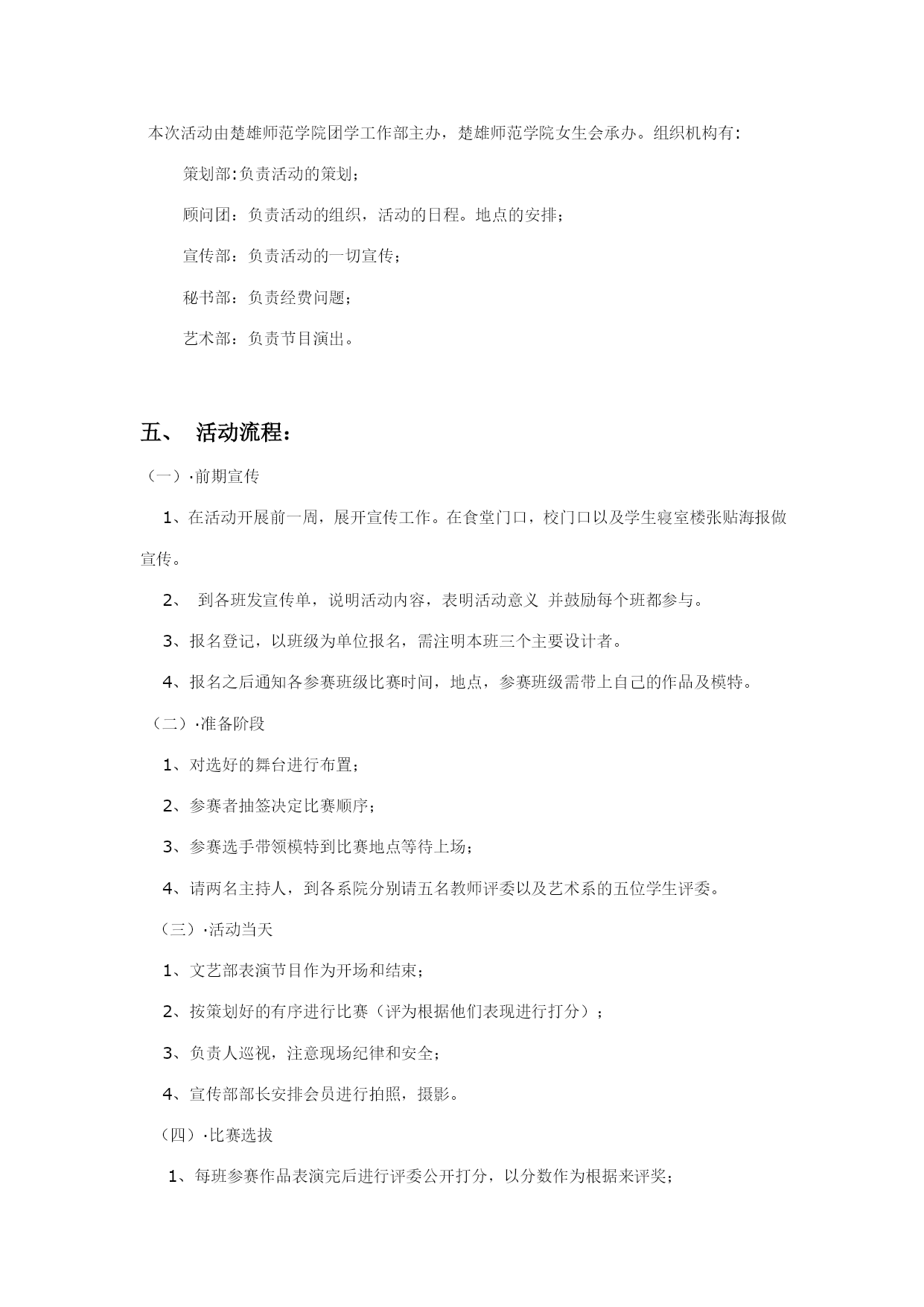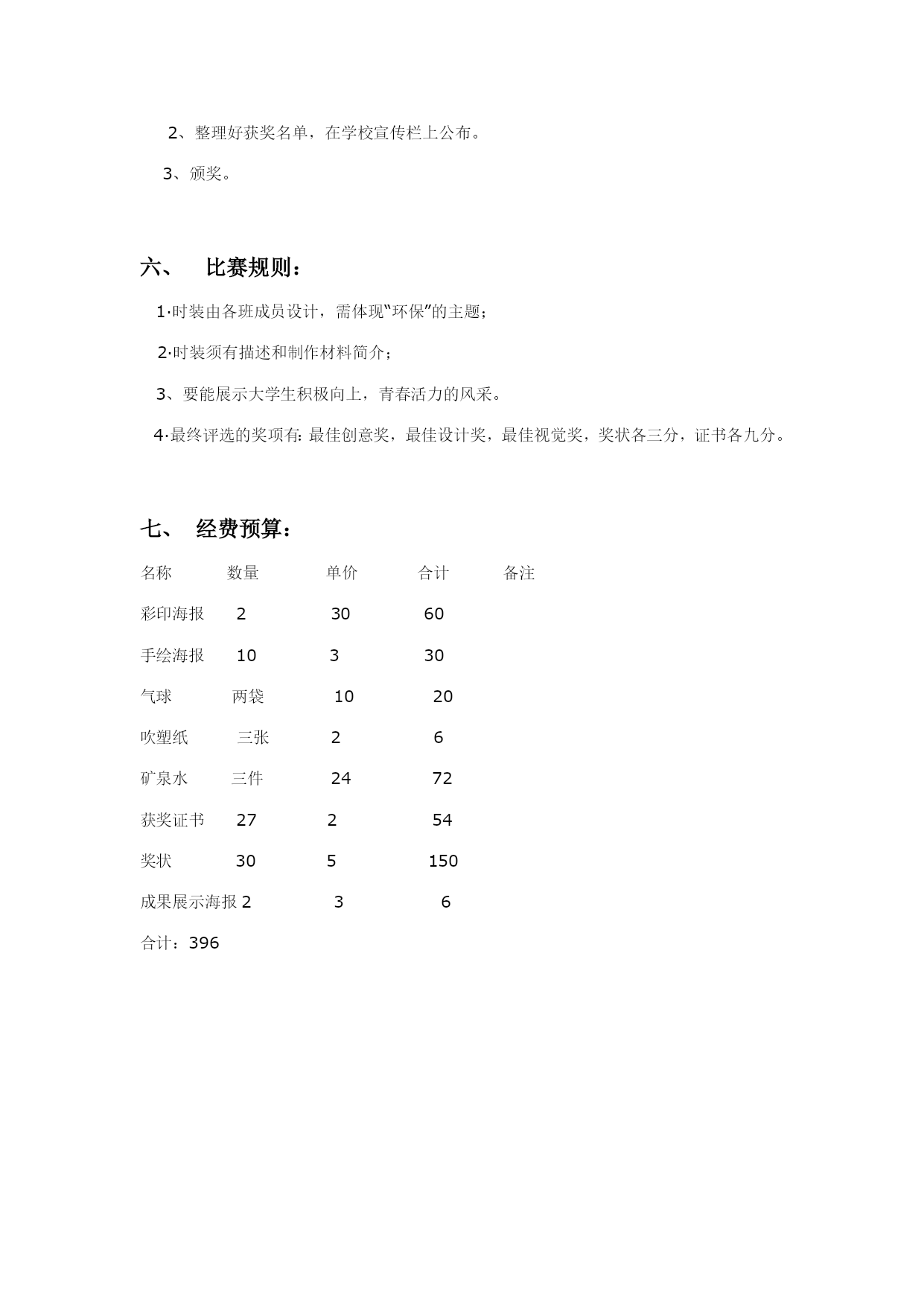 楚雄师院环保时装大赛策划书活动背景:服装是人类发展到一定历史阶段的产物,早在智人时期,人类就用兽皮裹身御寒。原始社会时期服装形成配套:冠帽,衣裳,套裤,护腿,鞋靴,首饰等。古代的人们以服饰分贵贱,别等威。时装能展现个人魅力与气质,随着社会的发展,越来越多的大学生追求时尚与个性,希望自己与众不同。然而,环境污染也越来越严重。作为大学生在追求时尚的同时也应该为保护环境而贡献自己的一份力量。可行性分析:当代学生在相对单调的生活之余,的确需要一些文化元素,特别是时尚文化元素调节校园生活,这样做并非是所谓的“学荒于嬉”,相反,一些高品味、高档次的服装秀,可充分展示当今的文化氛围和发展速度、体现“百家争鸣、百花齐放”多元化诠释。二:活动主旨:活动是以时尚服装展示为主题,借此向全校师生展现学生青春、健康、自信的新时代学生形象。此次活动融入了一定的个性元素,也是体现学生追求的的多元化文化氛围中的另类元素。展现大学生的风采,活跃校园文化气氛,培养同学之间的互助合作精神,旨在“保护环境,展现大学生风采”。三、活动目的:1、通过这次活动能充分表现自我,展现自我,认识自我。体现新时代大学生审美态度,诠释自我审美观地点,提高大学生的资信度,展现大学生风范。2、提供时尚美丽的咨讯,丰富校园文化生活,为大学生的生活提供一道极具特色的视觉盛宴。3、提高学生的动手实践能力,增强学生综合素质,提高社会竞争力。四、活动组织机构:本次活动由楚雄师范学院团学工作部主办,楚雄师范学院女生会承办。组织机构有:策划部:负责活动的策划;顾问团:负责活动的组织,活动的日程。地点的安排;宣传部:负责活动的一切宣传;秘书部:负责经费问题;艺术部:负责节目演出。活动流程:(一)·前期宣传1、在活动开展前一周,展开宣传工作。在食堂门口,校门口以及学生寝室楼张贴海报做宣传。2、到各班发宣传单,说明活动内容,表明活动意义并鼓励每个班都参与。3、报名登记,以班级为单位报名,需注明本班三个主要设计者。4、报名之后通知各参赛班级比赛时间,地点,参赛班级需带上自己的作品及模特。(二)·准备阶段1、对选好的舞台进行布置;2、参赛者抽签决定比赛顺序;3、参赛选手带领模特到比赛地点等待上场;4、请两名主持人,到各系院分别请五名教师评委以及艺术系的五位学生评委。(三)·活动当天1、文艺部表演节目作为开场和结束;2、按策划好的有序进行比赛(评为根据他们表现进行打分);3、负责人巡视,注意现场纪律和安全;4、宣传部部长安排会员进行拍照,摄影。(四)·比赛选拔1、每班参赛作品表演完后进行评委公开打分,以分数作为根据来评奖;2、整理好获奖名单,在学校宣传栏上公布。3、颁奖。比赛规则:1·时装由各班成员设计,需体现“环保”的主题;2·时装须有描述和制作材料简介;3、要能展示大学生积极向上,青春活力的风采。4·最终评选的奖项有:最佳创意奖,最佳设计奖,最佳视觉奖,奖状各三分,证书各九分。经费预算:名称数量单价合计备注彩印海报23060手绘海报10330气球两袋1020吹塑纸三张26矿泉水三件2472获奖证书27254奖状305150成果展示海报236合计:396