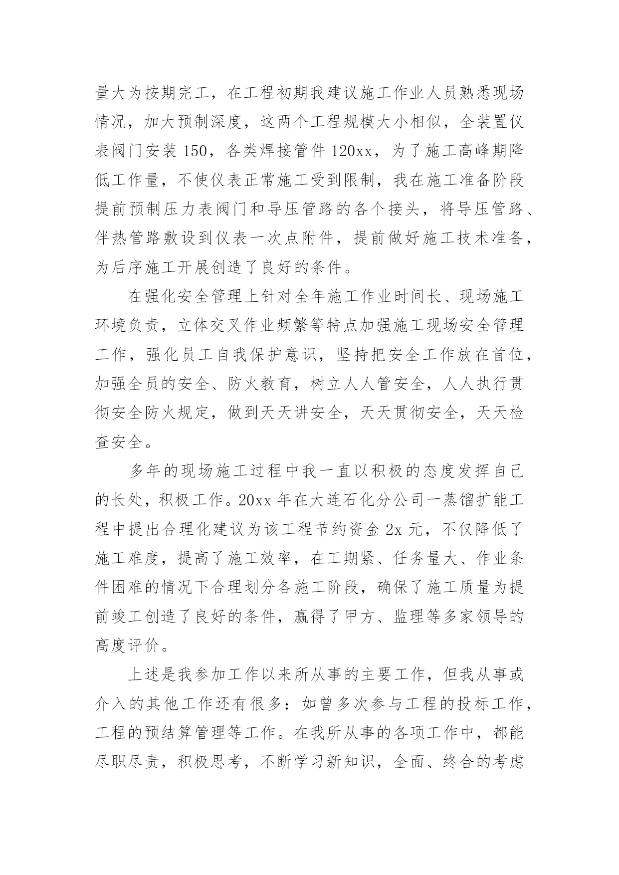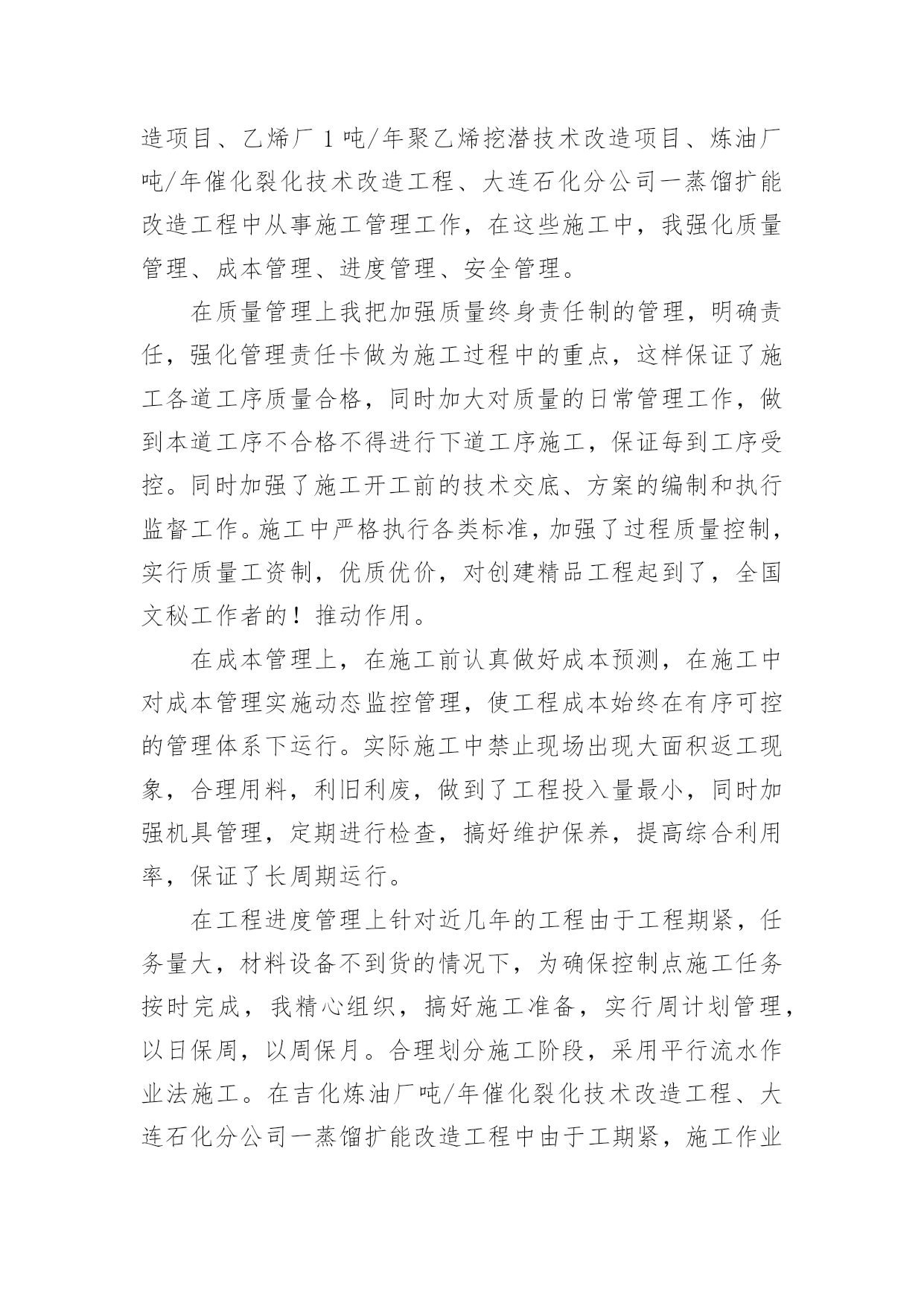 炼油厂技术员个人工作总结炼油厂技术员个人工作总结范文总结是事后对某一阶段的学习、工作或其完成情况加以回顾和分析的一种书面材料,它能够使头脑更加清醒,目标更加明确,因此好好准备一份总结吧。如何把总结做到重点突出呢?下面是小编帮大家整理的炼油厂技术员个人工作总结范文,供大家参考借鉴,希望可以帮助到有需要的朋友。20xx年7月毕业参加工作以来,我已从一名幼稚的学生逐步成长为一名合格的技术人员,经过几年的现场实际工作,我已总结出一套适合自己、适合各工程的施工程序。这几年来我先后从事过蜡化10吨/年催化裂化工程、电石厂吨/年有机硅扩能改造工程、化肥厂1吨/年丁锌醇扩建工程、炼油厂三机组移位改造工程、石化分公司二蒸馏扩能改造工程,乙烯厂1吨/年乙烯挖潜技术改造项目、乙烯厂1吨/年聚乙烯挖潜技术改造项目、x炼油厂吨/年催化裂化技术改造工程、石化分公司一蒸馏扩能改造工程、炼油厂10吨/年延迟焦化工程等1工程。在上述工程中我负责技术管理工作,在工作中一直兢兢业业,对待工作一丝不苟,一直奉行科学管理,严格要求施工质量,保证了施工一次校验合格率100,部分工程已获国家优质工程。20xx年到20xx年先后在乙烯厂1吨/年乙烯挖潜技术改造项目、乙烯厂1吨/年聚乙烯挖潜技术改造项目、炼油厂吨/年催化裂化技术改造工程、大连石化分公司一蒸馏扩能改造工程中从事施工管理工作,在这些施工中,我强化质量管理、成本管理、进度管理、安全管理。在质量管理上我把加强质量终身责任制的管理,明确责任,强化管理责任卡做为施工过程中的重点,这样保证了施工各道工序质量合格,同时加大对质量的日常管理工作,做到本道工序不合格不得进行下道工序施工,保证每到工序受控。同时加强了施工开工前的技术交底、方案的编制和执行监督工作。施工中严格执行各类标准,加强了过程质量控制,实行质量工资制,优质优价,对创建精品工程起到了,全国文秘工作者的!推动作用。在成本管理上,在施工前认真做好成本预测,在施工中对成本管理实施动态监控管理,使工程成本始终在有序可控的管理体系下运行。实际施工中禁止现场出现大面积返工现象,合理用料,利旧利废,做到了工程投入量最小,同时加强机具管理,定期进行检查,搞好维护保养,提高综合利用率,保证了长周期运行。在工程进度管理上针对近几年的工程由于工程期紧,任务量大,材料设备不到货的情况下,为确保控制点施工任务按时完成,我精心组织,搞好施工准备,实行周计划管理,以日保周,以周保月。合理划分施工阶段,采用平行流水作业法施工。在吉化炼油厂吨/年催化裂化技术改造工程、大连石化分公司一蒸馏扩能改造工程中由于工期紧,施工作业量大为按期完工,在工程初期我建议施工作业人员熟悉现场情况,加大预制深度,这两个工程规模大小相似,全装置仪表阀门安装150,各类焊接管件120xx,为了施工高峰期降低工作量,不使仪表正常施工受到限制,我在施工准备阶段提前预制压力表阀门和导压管路的各个接头,将导压管路、伴热管路敷设到仪表一次点附件,提前做好施工技术准备,为后序施工开展创造了良好的条件。在强化安全管理上针对全年施工作业时间长、现场施工环境负责,立体交叉作业频繁等特点加强施工现场安全管理工作,强化员工自我保护意识,坚持把安全工作放在首位,加强全员的安全、防火教育,树立人人管安全,人人执行贯彻安全防火规定,做到天天讲安全,天天贯彻安全,天天检查安全。多年的现场施工过程中我一直以积极的态度发挥自己的长处,积极工作。20xx年在大连石化分公司一蒸馏扩能工程中提出合理化建议为该工程节约资金2x元,不仅降低了施工难度,提高了施工效率,在工期紧、任务量大、作业条件困难的情况下合理划分各施工阶段,确保了施工质量为提前竣工创造了良好的条件,赢得了甲方、监理等多家领导的高度评价。上述是我参加工作以来所从事的主要工作,但我从事或介入的其他工作还有很多:如曾多次参与工程的投标工作,工程的预结算管理等工作。在我所从事的各项工作中,都能尽职尽责,积极思考,不断学习新知识,全面、终合的考虑工程施工,圆满的完成了领导所交给的各项任务。多年来我被公司评为十佳青年、优秀员工、撰写的论文、合理化建议、施工技术方案多次被评为优秀作品。