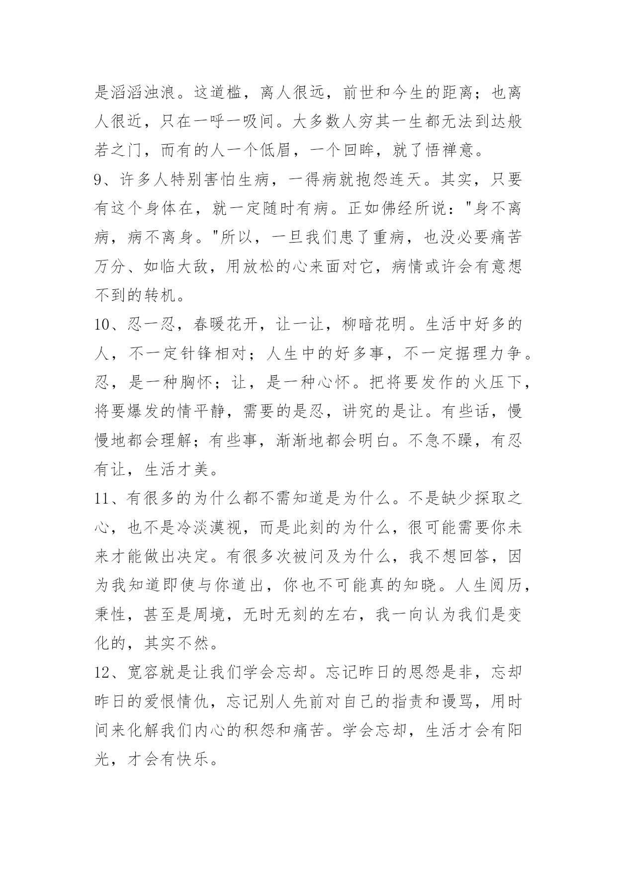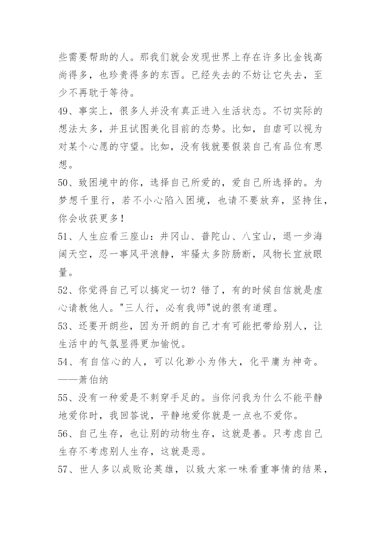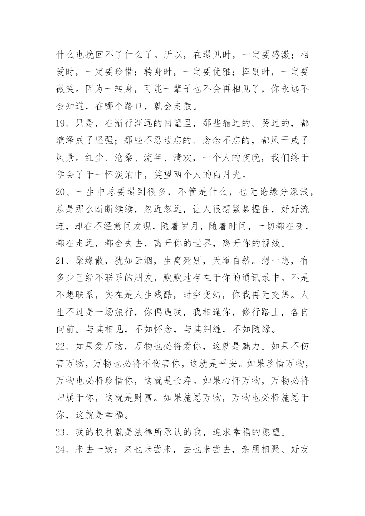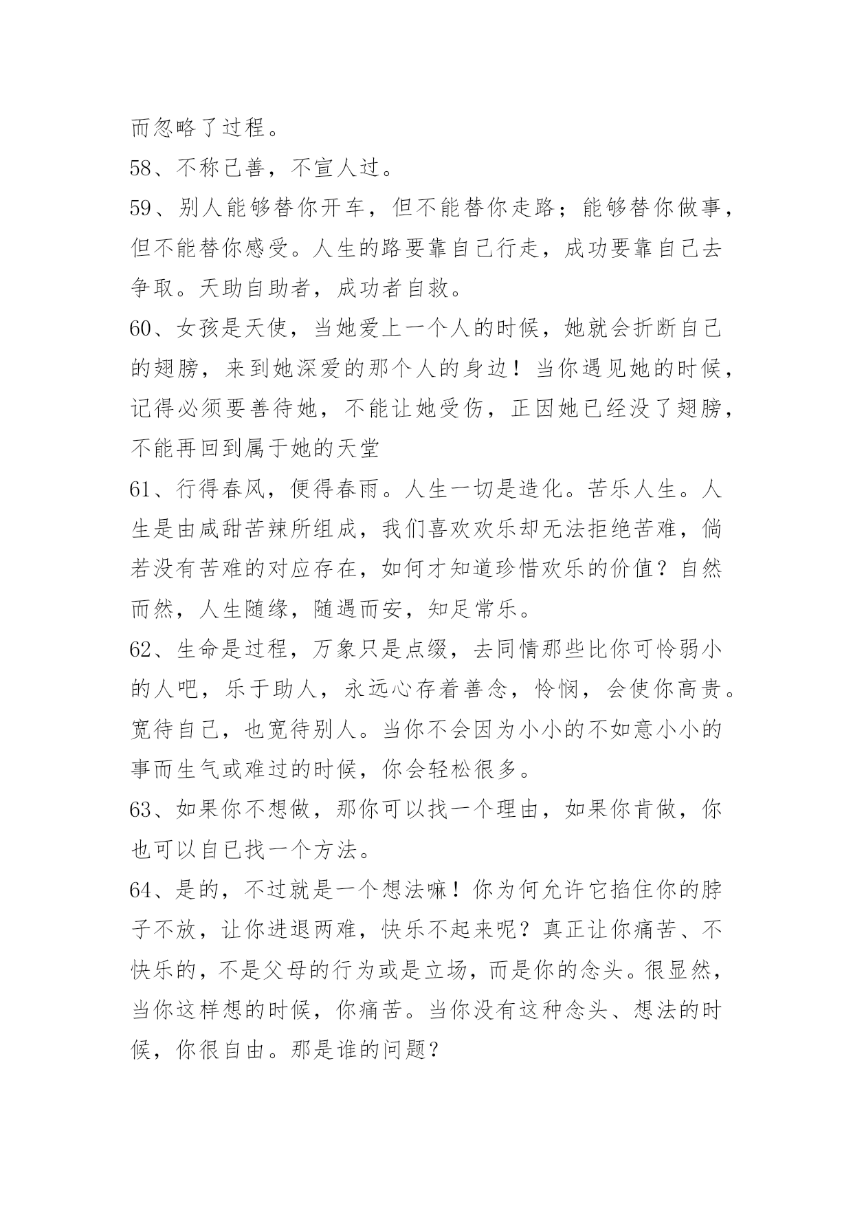 人生感悟名句65条【必备】2022年人生感悟名句合集65条喜怒哀乐是生活,悲欢离合是人生。下面是小编为大家准备的人生感悟名句65条,大家快来看看吧。1、不要为已消逝的年华叹息,而应面对正在匆匆溜走的时光。2、真正的告别,都是不告而别。3、男孩子20岁左右的时候是他最暗淡的日子,这时什么都没有,没有事业。没有风度。不能独立又不想依赖,挣扎着彷徨着,寻找着自己的位置,所以如果一个女孩子在他[xx]岁左右的时候遇见了与他,那一定要珍惜他,因为这个男孩子是最需要关爱和鼓励的时候。女孩只有陪他走过。男孩将会铭记终生。4、想要让生命变的更坚强,这样你回来的时候,才不会让你心生疼惜,因为我舍不得,你快乐,我就快乐了,我一个人可以把自己照顾的好好的。5、一个人树立目标很容易,坚持这个目标不变是很难的。6、乐观者在灾难中看到机会;悲观者在机会中看到灾难。7、生活的禅法是心的历程,它是从内心去除那些复杂的负担,接受生活的棒喝,叩问内在的迷惑,去告诫我们关于生活里能够伤害的负面情绪,还有面对得失所秉持的态度,充满信念的去生活,不要挑剔生活是个什么样子。8、红尘与佛界,只隔着一道门槛,槛内是云水禅心,槛外是滔滔浊浪。这道槛,离人很远,前世和今生的距离;也离人很近,只在一呼一吸间。大多数人穷其一生都无法到达般若之门,而有的人一个低眉,一个回眸,就了悟禅意。9、许多人特别害怕生病,一得病就抱怨连天。其实,只要有这个身体在,就一定随时有病。正如佛经所说:"身不离病,病不离身。"所以,一旦我们患了重病,也没必要痛苦万分、如临大敌,用放松的心来面对它,病情或许会有意想不到的转机。10、忍一忍,春暖花开,让一让,柳暗花明。生活中好多的人,不一定针锋相对;人生中的好多事,不一定据理力争。忍,是一种胸怀;让,是一种心怀。把将要发作的火压下,将要爆发的情平静,需要的是忍,讲究的是让。有些话,慢慢地都会理解;有些事,渐渐地都会明白。不急不躁,有忍有让,生活才美。11、有很多的为什么都不需知道是为什么。不是缺少探取之心,也不是冷淡漠视,而是此刻的为什么,很可能需要你未来才能做出决定。有很多次被问及为什么,我不想回答,因为我知道即使与你道出,你也不可能真的知晓。人生阅历,秉性,甚至是周境,无时无刻的左右,我一向认为我们是变化的,其实不然。12、宽容就是让我们学会忘却。忘记昨日的恩怨是非,忘却昨日的爱恨情仇,忘记别人先前对自己的指责和谩骂,用时间来化解我们内心的积怨和痛苦。学会忘却,生活才会有阳光,才会有快乐。13、不尽责任、不尽义务,这是罪过。真正能尽到责任、尽到义务,这是修行,这是功德。14、一些受过伤的人会显得更加勇敢,因为他们知道,最痛不过如此,因为他们依然相信,每一个用心去爱的人,都会得到命运最温柔的眷顾。15、只是,在寂寞的等待中消逝了时光,在寂寞的等待中错过了机遇;在寂寞的等待中流失了花期;最终花为谁开,伊为谁憔悴,汝为谁化蝶,唯有月老知道!16、我是多么喜欢这样的感觉。提笔写下几句直抵心扉的话,心里涌动着的是怎样的情怀啊?听着轻松、欢快的音乐,感受着冬日里乍寒还暖的气息,该是一件多么幸福而又奢侈的事情。安逸的感觉,我想就是这样的感觉。你喜欢吗?相信你一定会喜欢的,因为我们都是那么热爱文字而又钟情文字的人。17、淡定需要无所谓的态度,更需要一种有所为的、积极向上的力量。面对生活的得失、经济的巨变,陈光标都是一样平静地经历着,仿佛一切本就该这样,那样不值得一提,却又时时令人对他刮目相看。做一个淡然面对得失成败但不甘现状的人,永远保持向上努力的精神,才能平中出奇,平淡而不平庸,低调而不低头,拥有不断向上的朝气和不同凡响的人生历程。18、人为什么总是做让自己后悔的事呢?为什么不能在拥有的时候就珍惜呢?也许人只有在真正失去以后才会懂得什么才是最重要吧……人,常常是失去什么才明白什么,明白什么也挽回不了什么了。所以,在遇见时,一定要感激;相爱时,一定要珍惜;转身时,一定要优雅;挥别时,一定要微笑。因为一转身,可能一辈子也不会再相见了,你永远不会知道,在哪个路口,就会走散。19、只是,在渐行渐远的回望里,那些痛过的、哭过的,都演绎成了坚强;那些不忍遗忘的、念念不忘的,都风干成了风景。红尘、沧桑、流年、清欢,一个人的夜晚,我们终于学会了于一怀淡泊中,笑望两个人的白月光。20、一生中总要遇到很多,不管是什么,也无论缘分深浅,总是那么断断续续,忽近忽远,让人很想紧紧握住,好好流连,却在不经意间发现,随着岁月,随着时间,一切都在变,都在走远,都会失去,离开你的世界,离开你的视线。21、聚缘散,犹如云烟,生离死别,天道自然。想一想,有多少已经不联系的朋友,默默地存在于你的通讯录中。不是不想联系,实在是人生残酷,时空变幻,你我再无交集。人生不过是一场旅行,你偶遇我,我相逢你,修行路