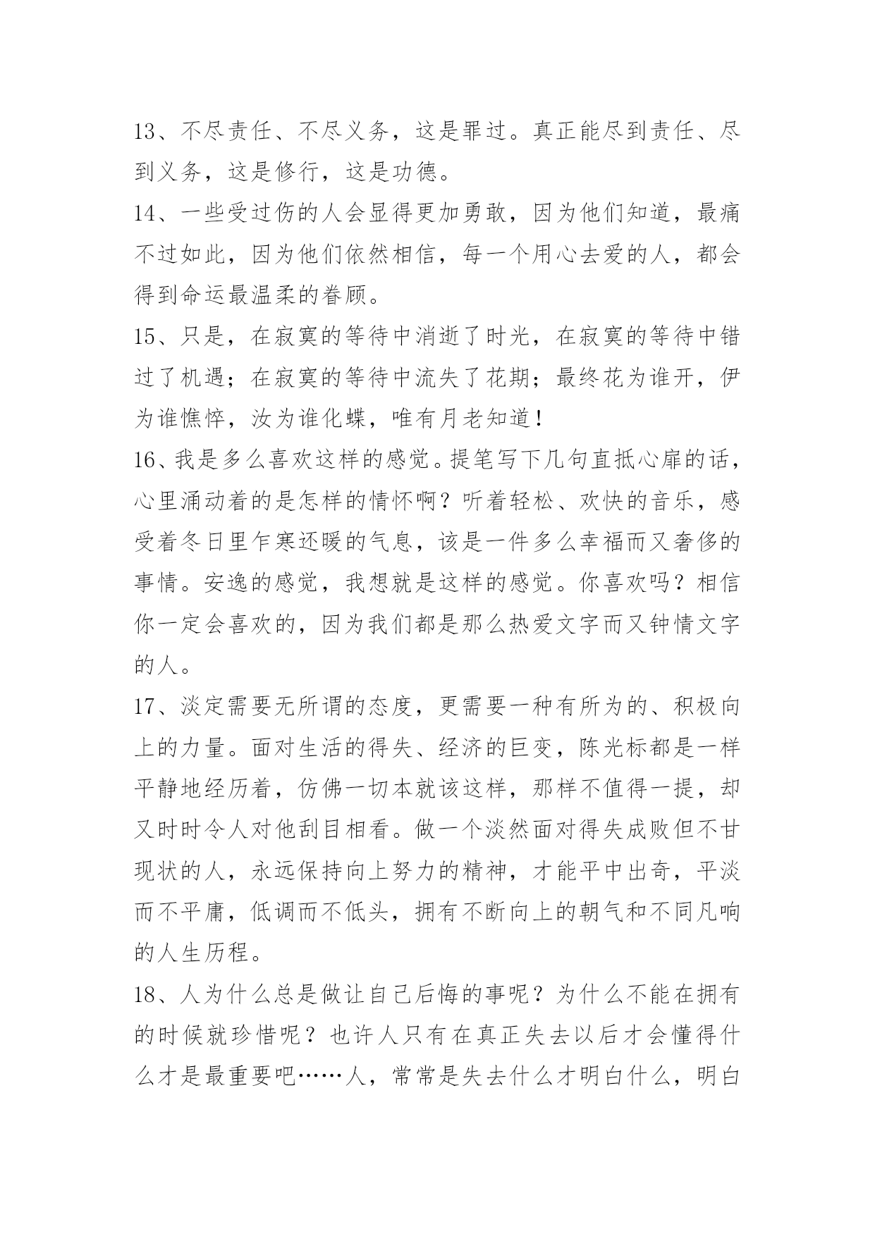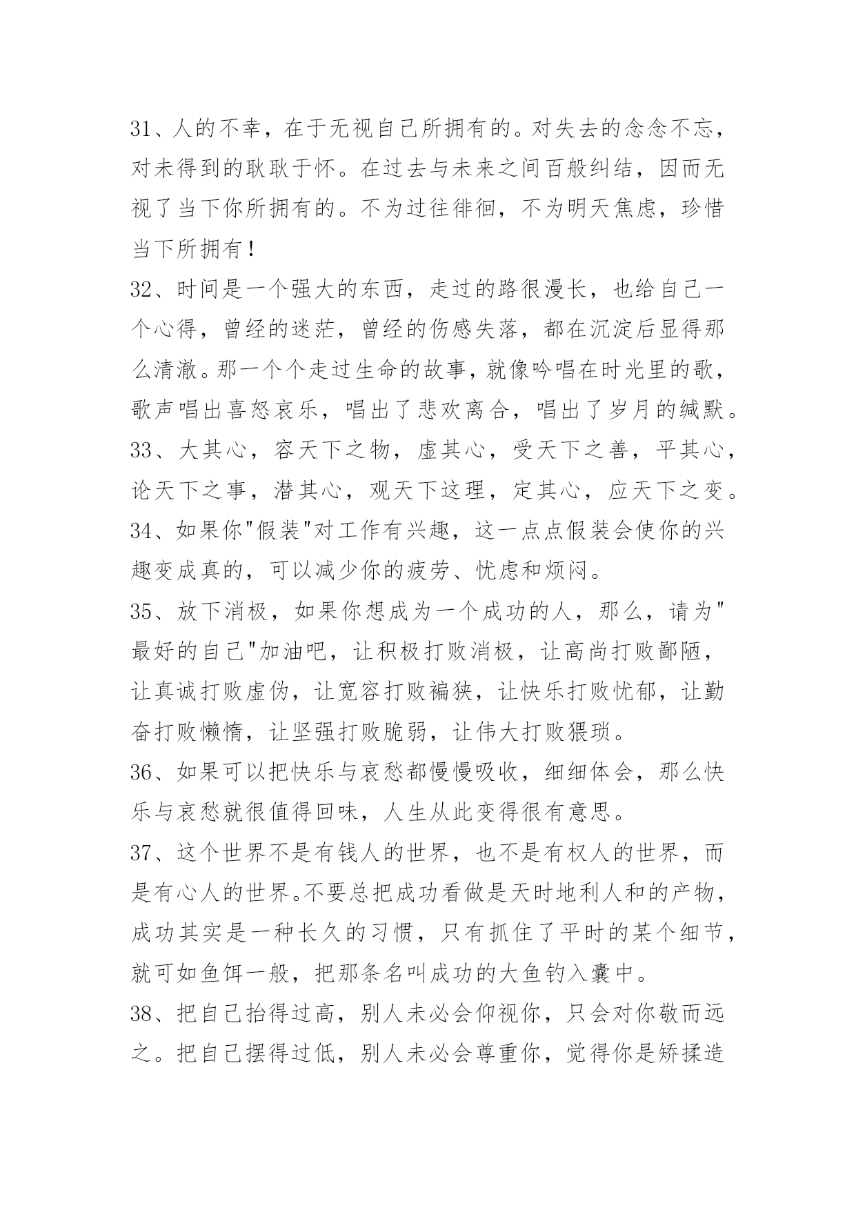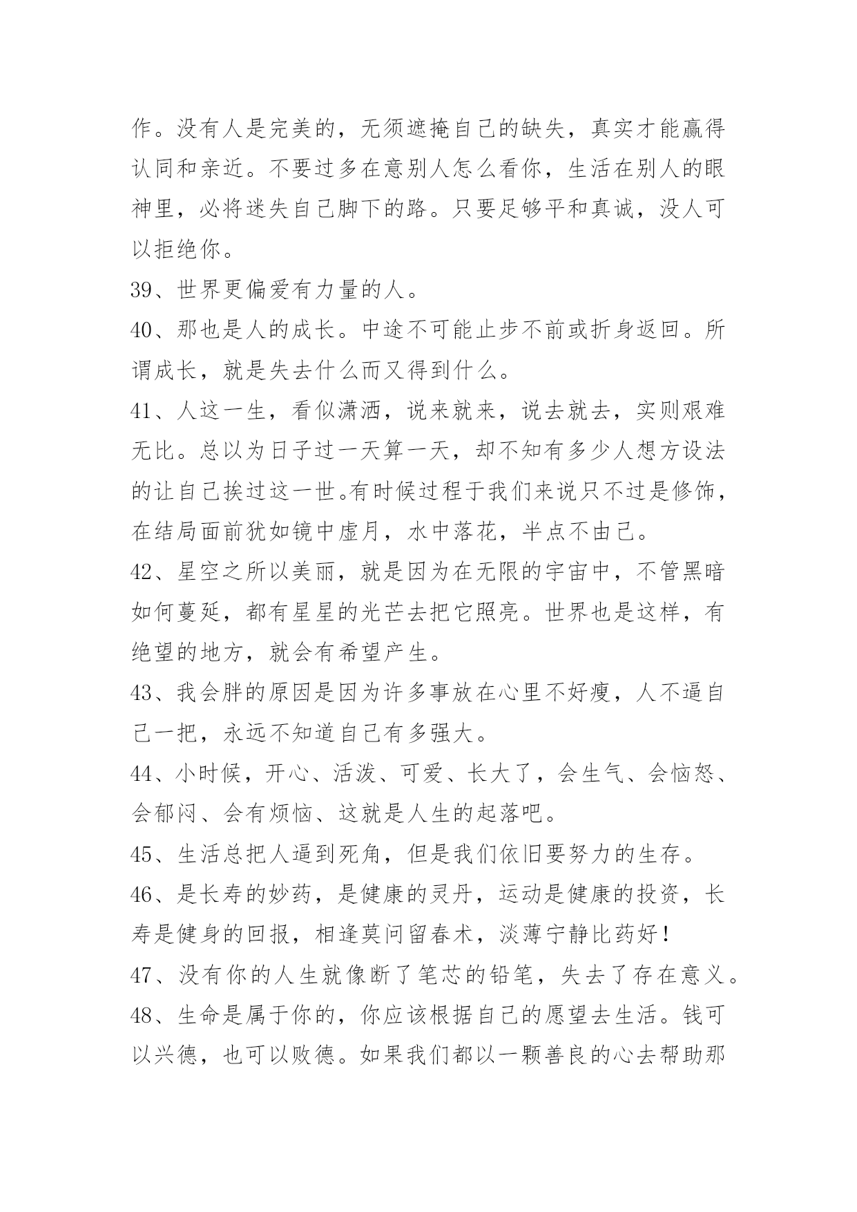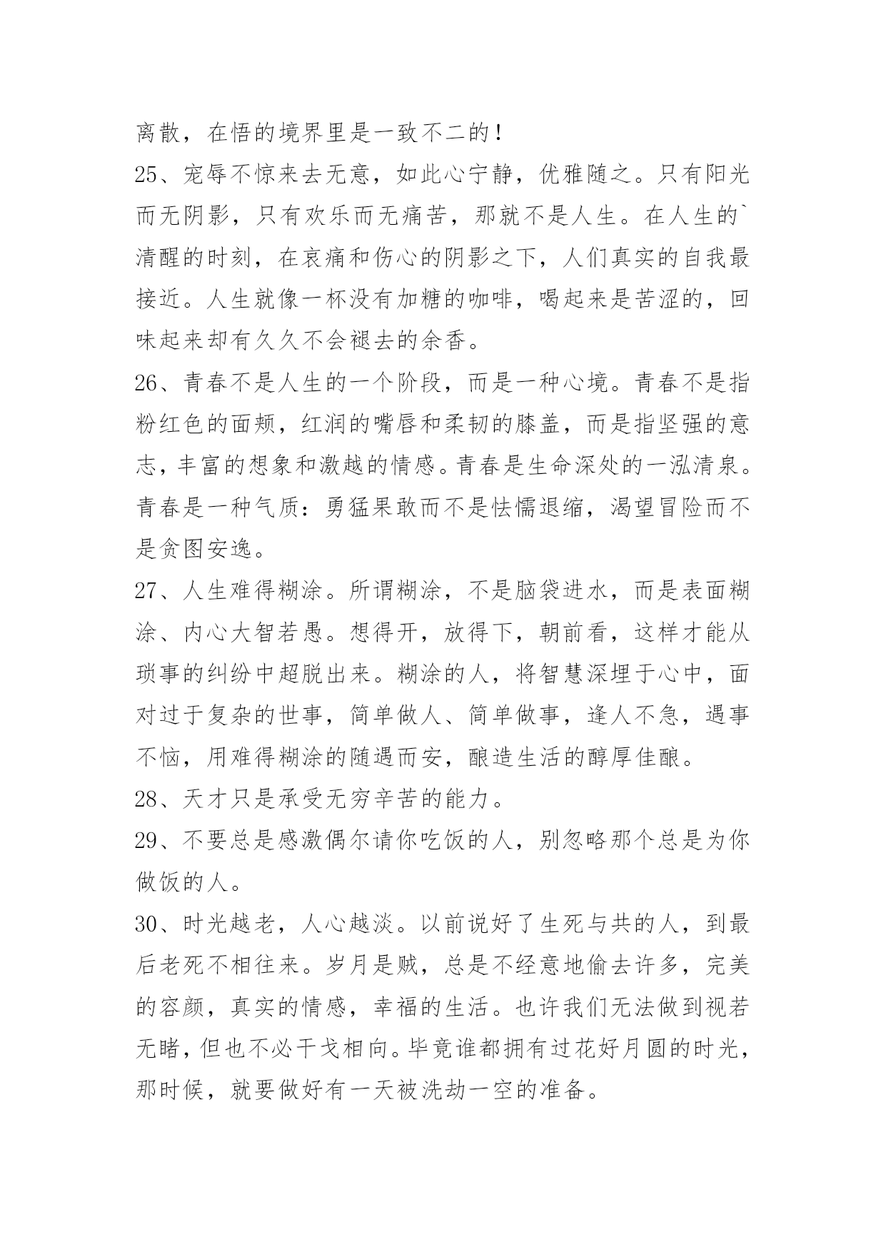 人生感悟名句65条【必备】2022年人生感悟名句合集65条喜怒哀乐是生活,悲欢离合是人生。下面是小编为大家准备的人生感悟名句65条,大家快来看看吧。1、不要为已消逝的年华叹息,而应面对正在匆匆溜走的时光。2、真正的告别,都是不告而别。3、男孩子20岁左右的时候是他最暗淡的日子,这时什么都没有,没有事业。没有风度。不能独立又不想依赖,挣扎着彷徨着,寻找着自己的位置,所以如果一个女孩子在他[xx]岁左右的时候遇见了与他,那一定要珍惜他,因为这个男孩子是最需要关爱和鼓励的时候。女孩只有陪他走过。男孩将会铭记终生。4、想要让生命变的更坚强,这样你回来的时候,才不会让你心生疼惜,因为我舍不得,你快乐,我就快乐了,我一个人可以把自己照顾的好好的。5、一个人树立目标很容易,坚持这个目标不变是很难的。6、乐观者在灾难中看到机会;悲观者在机会中看到灾难。7、生活的禅法是心的历程,它是从内心去除那些复杂的负担,接受生活的棒喝,叩问内在的迷惑,去告诫我们关于生活里能够伤害的负面情绪,还有面对得失所秉持的态度,充满信念的去生活,不要挑剔生活是个什么样子。8、红尘与佛界,只隔着一道门槛,槛内是云水禅心,槛外是滔滔浊浪。这道槛,离人很远,前世和今生的距离;也离人很近,只在一呼一吸间。大多数人穷其一生都无法到达般若之门,而有的人一个低眉,一个回眸,就了悟禅意。9、许多人特别害怕生病,一得病就抱怨连天。其实,只要有这个身体在,就一定随时有病。正如佛经所说:"身不离病,病不离身。"所以,一旦我们患了重病,也没必要痛苦万分、如临大敌,用放松的心来面对它,病情或许会有意想不到的转机。10、忍一忍,春暖花开,让一让,柳暗花明。生活中好多的人,不一定针锋相对;人生中的好多事,不一定据理力争。忍,是一种胸怀;让,是一种心怀。把将要发作的火压下,将要爆发的情平静,需要的是忍,讲究的是让。有些话,慢慢地都会理解;有些事,渐渐地都会明白。不急不躁,有忍有让,生活才美。11、有很多的为什么都不需知道是为什么。不是缺少探取之心,也不是冷淡漠视,而是此刻的为什么,很可能需要你未来才能做出决定。有很多次被问及为什么,我不想回答,因为我知道即使与你道出,你也不可能真的知晓。人生阅历,秉性,甚至是周境,无时无刻的左右,我一向认为我们是变化的,其实不然。12、宽容就是让我们学会忘却。忘记昨日的恩怨是非,忘却昨日的爱恨情仇,忘记别人先前对自己的指责和谩骂,用时间来化解我们内心的积怨和痛苦。学会忘却,生活才会有阳光,才会有快乐。13、不尽责任、不尽义务,这是罪过。真正能尽到责任、尽到义务,这是修行,这是功德。14、一些受过伤的人会显得更加勇敢,因为他们知道,最痛不过如此,因为他们依然相信,每一个用心去爱的人,都会得到命运最温柔的眷顾。15、只是,在寂寞的等待中消逝了时光,在寂寞的等待中错过了机遇;在寂寞的等待中流失了花期;最终花为谁开,伊为谁憔悴,汝为谁化蝶,唯有月老知道!16、我是多么喜欢这样的感觉。提笔写下几句直抵心扉的话,心里涌动着的是怎样的情怀啊?听着轻松、欢快的音乐,感受着冬日里乍寒还暖的气息,该是一件多么幸福而又奢侈的事情。安逸的感觉,我想就是这样的感觉。你喜欢吗?相信你一定会喜欢的,因为我们都是那么热爱文字而又钟情文字的人。17、淡定需要无所谓的态度,更需要一种有所为的、积极向上的力量。面对生活的得失、经济的巨变,陈光标都是一样平静地经历着,仿佛一切本就该这样,那样不值得一提,却又时时令人对他刮目相看。做一个淡然面对得失成败但不甘现状的人,永远保持向上努力的精神,才能平中出奇,平淡而不平庸,低调而不低头,拥有不断向上的朝气和不同凡响的人生历程。18、人为什么总是做让自己后悔的事呢?为什么不能在拥有的时候就珍惜呢?也许人只有在真正失去以后才会懂得什么才是最重要吧……人,常常是失去什么才明白什么,明白什么也挽回不了什么了。所以,在遇见时,一定要感激;相爱时,一定要珍惜;转身时,一定要优雅;挥别时,一定要微笑。因为一转身,可能一辈子也不会再相见了,你永远不会知道,在哪个路口,就会走散。19、只是,在渐行渐远的回望里,那些痛过的、哭过的,都演绎成了坚强;那些不忍遗忘的、念念不忘的,都风干成了风景。红尘、沧桑、流年、清欢,一个人的夜晚,我们终于学会了于一怀淡泊中,笑望两个人的白月光。20、一生中总要遇到很多,不管是什么,也无论缘分深浅,总是那么断断续续,忽近忽远,让人很想紧紧握住,好好流连,却在不经意间发现,随着岁月,随着时间,一切都在变,都在走远,都会失去,离开你的世界,离开你的视线。21、聚缘散,犹如云烟,生离死别,天道自然。想一想,有多少已经不联系的朋友,默默地存在于你的通讯录中。不是不想联系,实在是人生残酷,时空变幻,你我再无交集。人生不过是一场旅行,你偶遇我,我相逢你,修行路