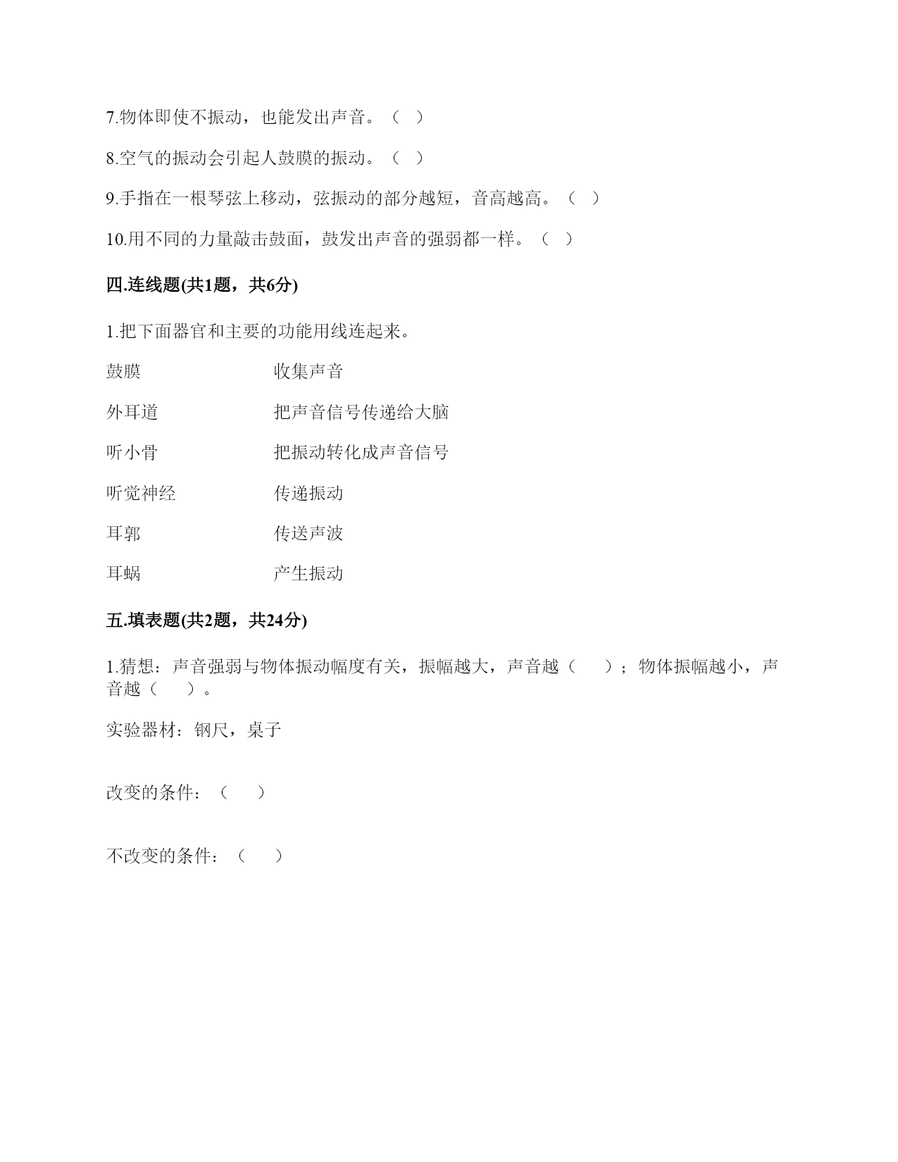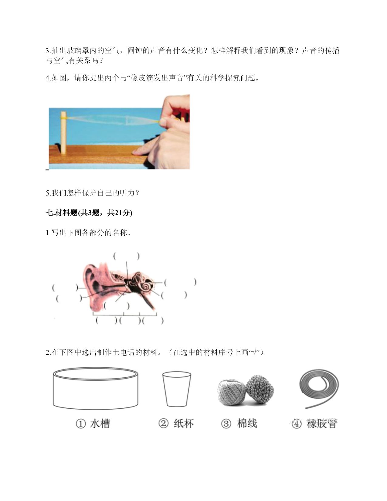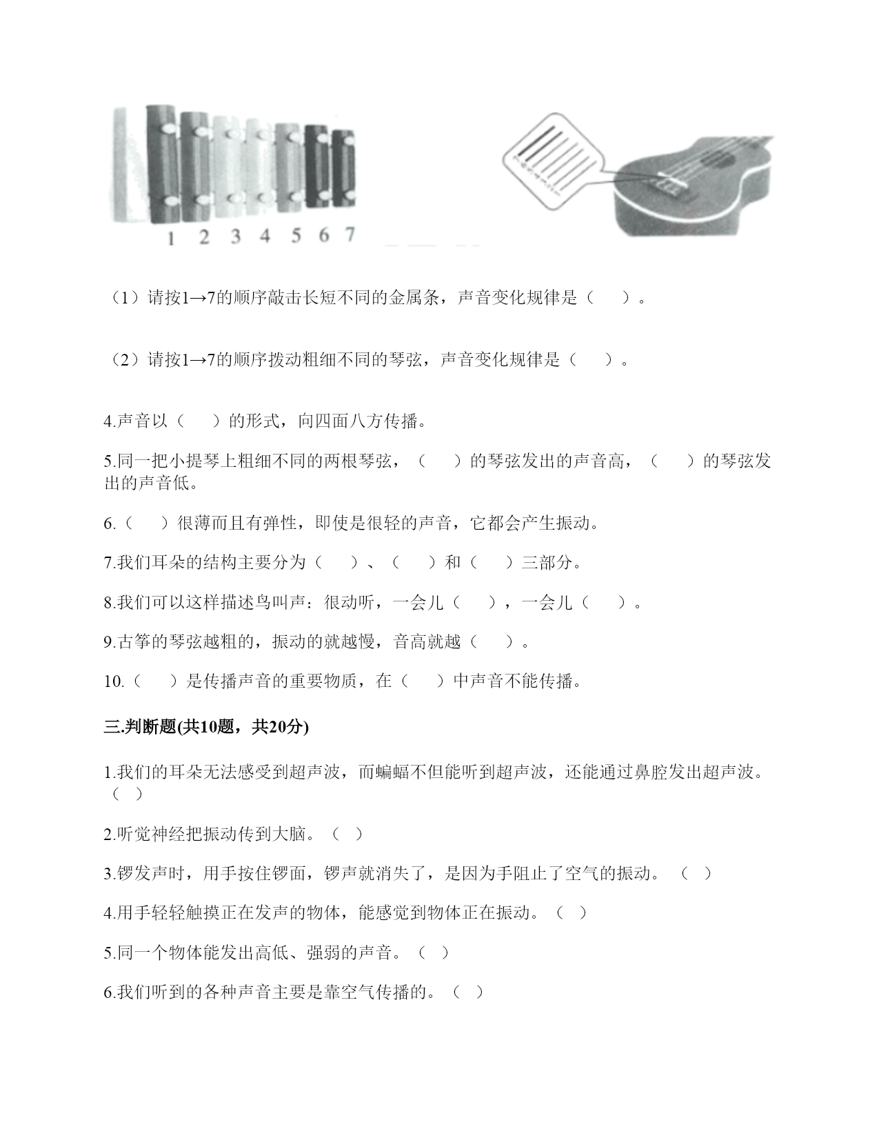 小学科学《声音》综合练习题一.选择题(共10题,共22分)1.下列对音高描述错误的是()。A.振动越快,声音越高B.振动幅度越小声音越弱C.长、松、粗的物体发出的声音低2.在弹吉他时,若想要使它发出的声音强一些,可以()。A.换新吉他B.用的力气大一些C.调节弦的松紧度3.风声是由()产生的。A.树枝振动B.空气振动C.喇叭振动4.小金的爸爸给他买了一个吉他,小金非常高兴,他拿过吉他仔细研究,发现吉他的弦有的粗有的细,松紧不同,声音也不一样。①拨动吉他弦,声音最高的是()。A.最粗的弦B.最细的弦C.中等粗细的弦②小金发现有一根琴弦声音有些低,他应该()。A.将这根琴弦调紧一些B.将这根琴弦调松一些C.用力弹5.不是耳朵的结构是()。A.耳郭B.外耳C.中耳D.内耳6.我们耳朵里的()即使是轻微的声音,它都会产生振动。A.听小骨B.鼓膜C.耳蜗7.音量与物体振动之间的关系是()。A.物体振动的幅度越大,声音越强B.物体振动的幅度越小,声音越强C.物体振动的速度越快,声音越强8.尺子振动的频率和尺子伸出桌面部分的()有关。A.高度B.长度C.刻度9.如图所示,外界声音传到大脑的路径正确的是()。A.外耳道—听小骨—耳蜗—鼓膜—大脑—听觉神经B.外耳道—鼓膜—听小骨—耳蜗—听觉神经—大脑C.外耳道—耳蜗—听小骨—鼓膜—大脑—听觉神经D.外耳道—鼓膜—耳蜗—听小骨—听觉神经—大脑10.月球上没有传播声音的(),所以人们不能直接听到对方说话的声音。A.空气B.电子通信设备C.任何物质二.填空题(共10题,共40分)1.人的耳朵分为()、()、()。2.通常声音在()中的传播速度最大,在()中的传播速度之,在()中的传播速度最小。(均填“固体”“液体”或“气体”)3.根据下图所示,用“高→低”或者“低→高”来表示声音的变化规律。(1)请按1→7的顺序敲击长短不同的金属条,声音变化规律是()。(2)请按1→7的顺序拨动粗细不同的琴弦,声音变化规律是()。4.声音以()的形式,向四面八方传播。5.同一把小提琴上粗细不同的两根琴弦,()的琴弦发出的声音高,()的琴弦发出的声音低。6.()很薄而且有弹性,即使是很轻的声音,它都会产生振动。7.我们耳朵的结构主要分为()、()和()三部分。8.我们可以这样描述鸟叫声:很动听,一会儿(),一会儿()。9.古筝的琴弦越粗的,振动的就越慢,音高就越()。10.()是传播声音的重要物质,在()中声音不能传播。三.判断题(共10题,共20分)1.我们的耳朵无法感受到超声波,而蝙蝠不但能听到超声波,还能通过鼻腔发出超声波。()2.听觉神经把振动传到大脑。()3.锣发声时,用手按住锣面,锣声就消失了,是因为手阻止了空气的振动。()4.用手轻轻触摸正在发声的物体,能感觉到物体正在振动。()5.同一个物体能发出高低、强弱的声音。()6.我们听到的各种声音主要是靠空气传播的。()7.物体即使不振动,也能发出声音。()8.空气的振动会引起人鼓膜的振动。()9.手指在一根琴弦上移动,弦振动的部分越短,音高越高。()10.用不同的力量敲击鼓面,鼓发出声音的强弱都一样。()四.连线题(共1题,共6分)1.把下面器官和主要的功能用线连起来。鼓膜收集声音外耳道把声音信号传递给大脑听小骨把振动转化成声音信号听觉神经传递振动耳郭传送声波耳蜗产生振动五.填表题(共2题,共24分)1.猜想:声音强弱与物体振动幅度有关,振幅越大,声音越();物体振幅越小,声音越()。实验器材:钢尺,桌子改变的条件:()不改变的条件:()填写表格。实验结论是什么?2.完成声音强弱与振动物体的关系记录表。六.简答题(共5题,共26分)1.自制小乐器分为几个步骤?依次是什么?2.我们可以从哪几个方面对自制的小乐器进行评价?3.抽出玻璃罩内的空气,闹钟的声音有什么变化?怎样解释我们看到的现象?声音的传播与空气有关系吗?4.如图,请你提出两个与“橡皮筋发出声音”有关的科学探究问题。5.我们怎样保护自己的听力?七.材料题(共3题,共21分)1.写出下图各部分的名称。2.在下图中选出制作土电话的材料。(在选中的材料序号上画“√”)思考:在玩土电话游戏时,对方讲话的声音是通过什么物体传到听话人的耳朵里的?用什么方法能够使土电话中的声音更大一些?3.唐朝著名诗人白居易在《琵琶行》中有“大弦嘈嘈如急雨,小弦切切如私语”的诗句。意思是粗弦嘈嘈,好像是疾风骤雨,细弦切切,好像是儿女私语。根据所学的知识,说一说弦的粗细对音高有什么影响?还有哪些因素能影响音高?八.综合题(共5题,共34分)1.探究钢尺发声强弱