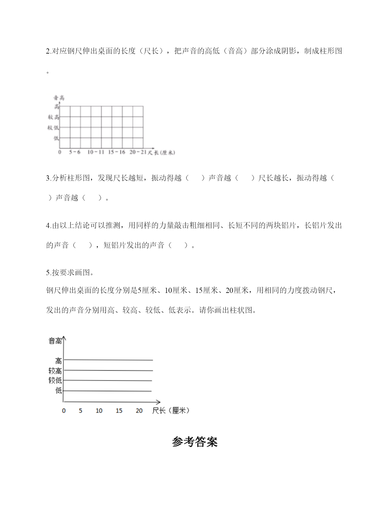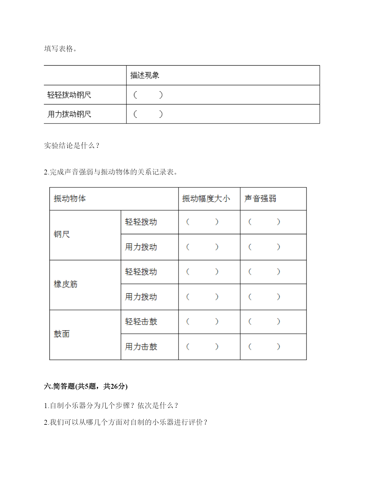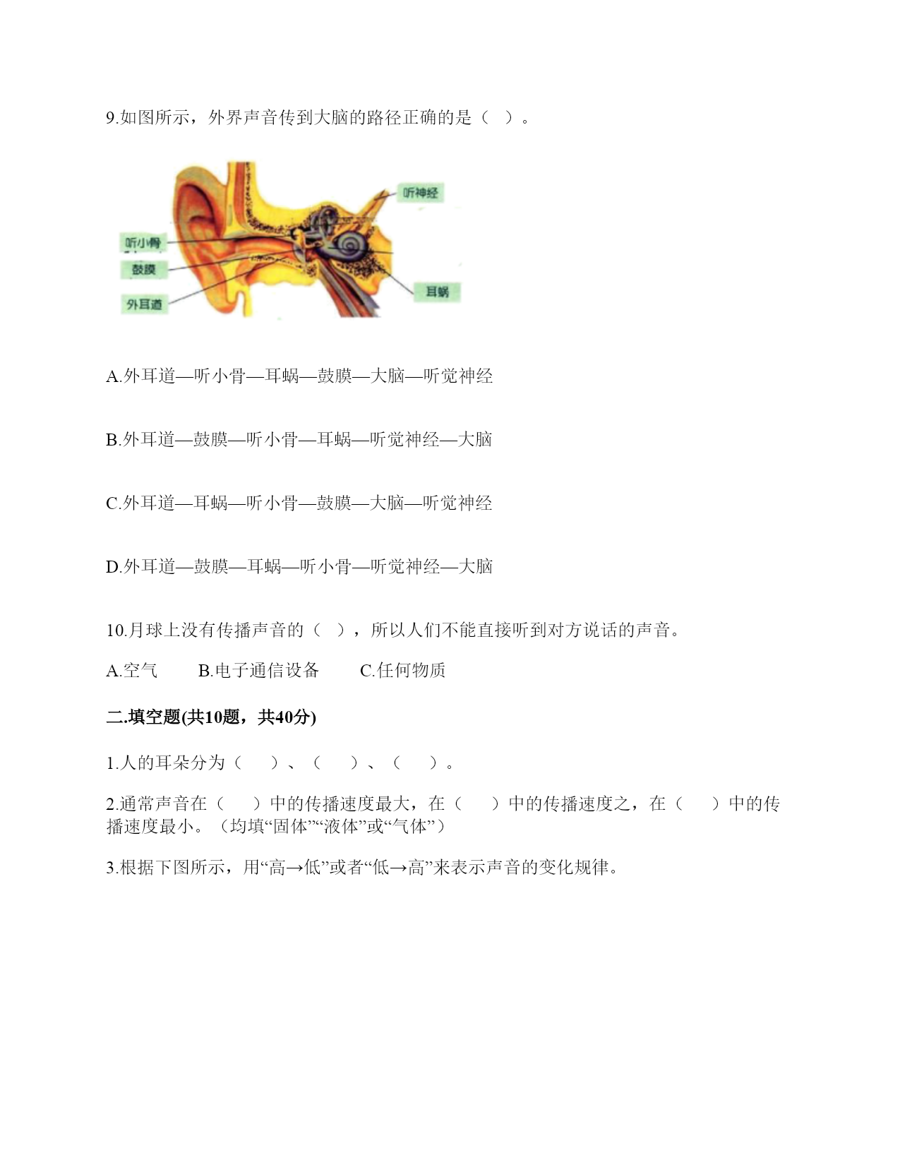 小学科学《声音》综合练习题一.选择题(共10题,共22分)1.下列对音高描述错误的是()。A.振动越快,声音越高B.振动幅度越小声音越弱C.长、松、粗的物体发出的声音低2.在弹吉他时,若想要使它发出的声音强一些,可以()。A.换新吉他B.用的力气大一些C.调节弦的松紧度3.风声是由()产生的。A.树枝振动B.空气振动C.喇叭振动4.小金的爸爸给他买了一个吉他,小金非常高兴,他拿过吉他仔细研究,发现吉他的弦有的粗有的细,松紧不同,声音也不一样。①拨动吉他弦,声音最高的是()。A.最粗的弦B.最细的弦C.中等粗细的弦②小金发现有一根琴弦声音有些低,他应该()。A.将这根琴弦调紧一些B.将这根琴弦调松一些C.用力弹5.不是耳朵的结构是()。A.耳郭B.外耳C.中耳D.内耳6.我们耳朵里的()即使是轻微的声音,它都会产生振动。A.听小骨B.鼓膜C.耳蜗7.音量与物体振动之间的关系是()。A.物体振动的幅度越大,声音越强B.物体振动的幅度越小,声音越强C.物体振动的速度越快,声音越强8.尺子振动的频率和尺子伸出桌面部分的()有关。A.高度B.长度C.刻度9.如图所示,外界声音传到大脑的路径正确的是()。A.外耳道—听小骨—耳蜗—鼓膜—大脑—听觉神经B.外耳道—鼓膜—听小骨—耳蜗—听觉神经—大脑C.外耳道—耳蜗—听小骨—鼓膜—大脑—听觉神经D.外耳道—鼓膜—耳蜗—听小骨—听觉神经—大脑10.月球上没有传播声音的(),所以人们不能直接听到对方说话的声音。A.空气B.电子通信设备C.任何物质二.填空题(共10题,共40分)1.人的耳朵分为()、()、()。2.通常声音在()中的传播速度最大,在()中的传播速度之,在()中的传播速度最小。(均填“固体”“液体”或“气体”)3.根据下图所示,用“高→低”或者“低→高”来表示声音的变化规律。(1)请按1→7的顺序敲击长短不同的金属条,声音变化规律是()。(2)请按1→7的顺序拨动粗细不同的琴弦,声音变化规律是()。4.声音以()的形式,向四面八方传播。5.同一把小提琴上粗细不同的两根琴弦,()的琴弦发出的声音高,()的琴弦发出的声音低。6.()很薄而且有弹性,即使是很轻的声音,它都会产生振动。7.我们耳朵的结构主要分为()、()和()三部分。8.我们可以这样描述鸟叫声:很动听,一会儿(),一会儿()。9.古筝的琴弦越粗的,振动的就越慢,音高就越()。10.()是传播声音的重要物质,在()中声音不能传播。三.判断题(共10题,共20分)1.我们的耳朵无法感受到超声波,而蝙蝠不但能听到超声波,还能通过鼻腔发出超声波。()2.听觉神经把振动传到大脑。()3.锣发声时,用手按住锣面,锣声就消失了,是因为手阻止了空气的振动。()4.用手轻轻触摸正在发声的物体,能感觉到物体正在振动。()5.同一个物体能发出高低、强弱的声音。()6.我们听到的各种声音主要是靠空气传播的。()7.物体即使不振动,也能发出声音。()8.空气的振动会引起人鼓膜的振动。()9.手指在一根琴弦上移动,弦振动的部分越短,音高越高。()10.用不同的力量敲击鼓面,鼓发出声音的强弱都一样。()四.连线题(共1题,共6分)1.把下面器官和主要的功能用线连起来。鼓膜收集声音外耳道把声音信号传递给大脑听小骨把振动转化成声音信号听觉神经传递振动耳郭传送声波耳蜗产生振动五.填表题(共2题,共24分)1.猜想:声音强弱与物体振动幅度有关,振幅越大,声音越();物体振幅越小,声音越()。实验器材:钢尺,桌子改变的条件:()不改变的条件:()填写表格。实验结论是什么?2.完成声音强弱与振动物体的关系记录表。六.简答题(共5题,共26分)1.自制小乐器分为几个步骤?依次是什么?2.我们可以从哪几个方面对自制的小乐器进行评价?3.抽出玻璃罩内的空气,闹钟的声音有什么变化?怎样解释我们看到的现象?声音的传播与空气有关系吗?4.如图,请你提出两个与“橡皮筋发出声音”有关的科学探究问题。5.我们怎样保护自己的听力?七.材料题(共3题,共21分)1.写出下图各部分的名称。2.在下图中选出制作土电话的材料。(在选中的材料序号上画“√”)思考:在玩土电话游戏时,对方讲话的声音是通过什么物体传到听话人的耳朵里的?用什么方法能够使土电话中的声音更大一些?3.唐朝著名诗人白居易在《琵琶行》中有“大弦嘈嘈如急雨,小弦切切如私语”的诗句。意思是粗弦嘈嘈,好像是疾风骤雨,细弦切切,好像是儿女私语。根据所学的知识,说一说弦的粗细对音高有什么影响?还有哪些因素能影响音高?八.综合题(共5题,共34分)1.探究钢尺发声强弱