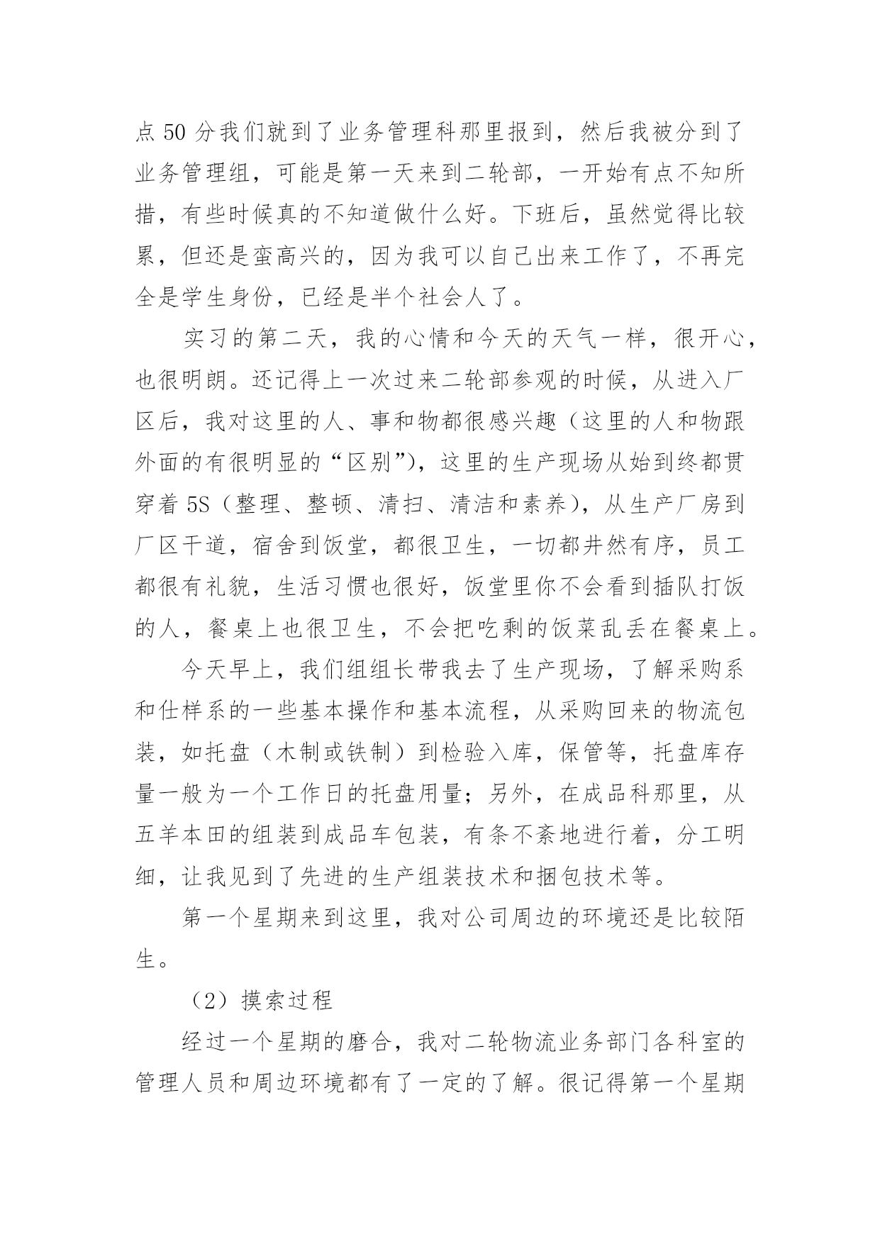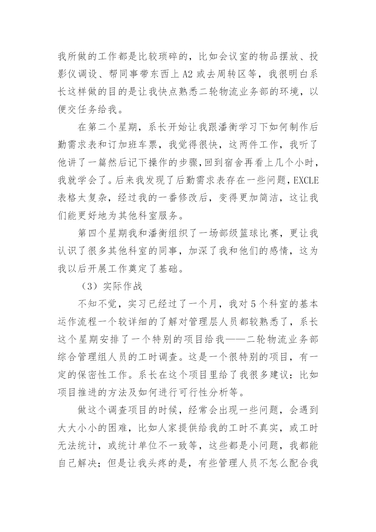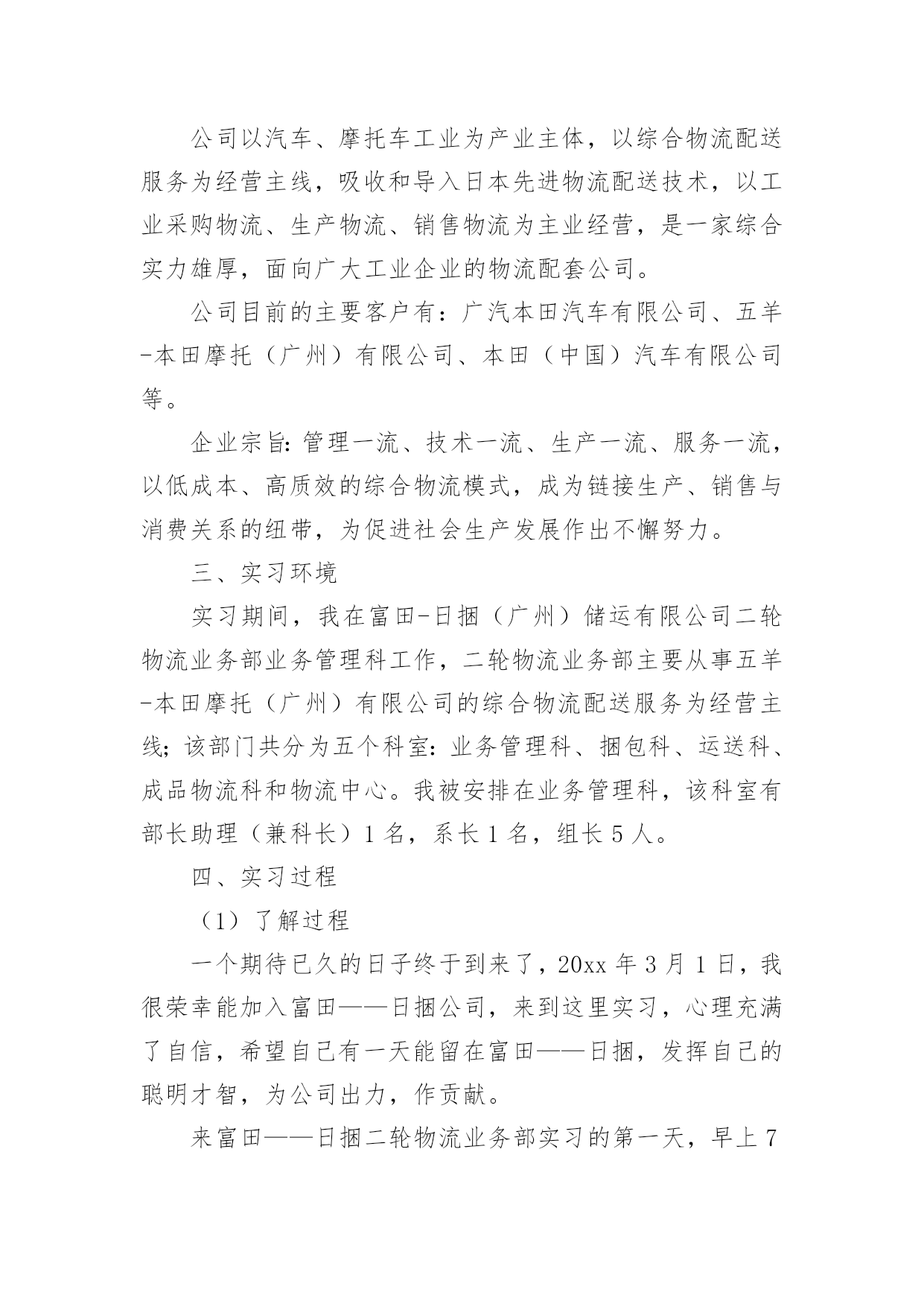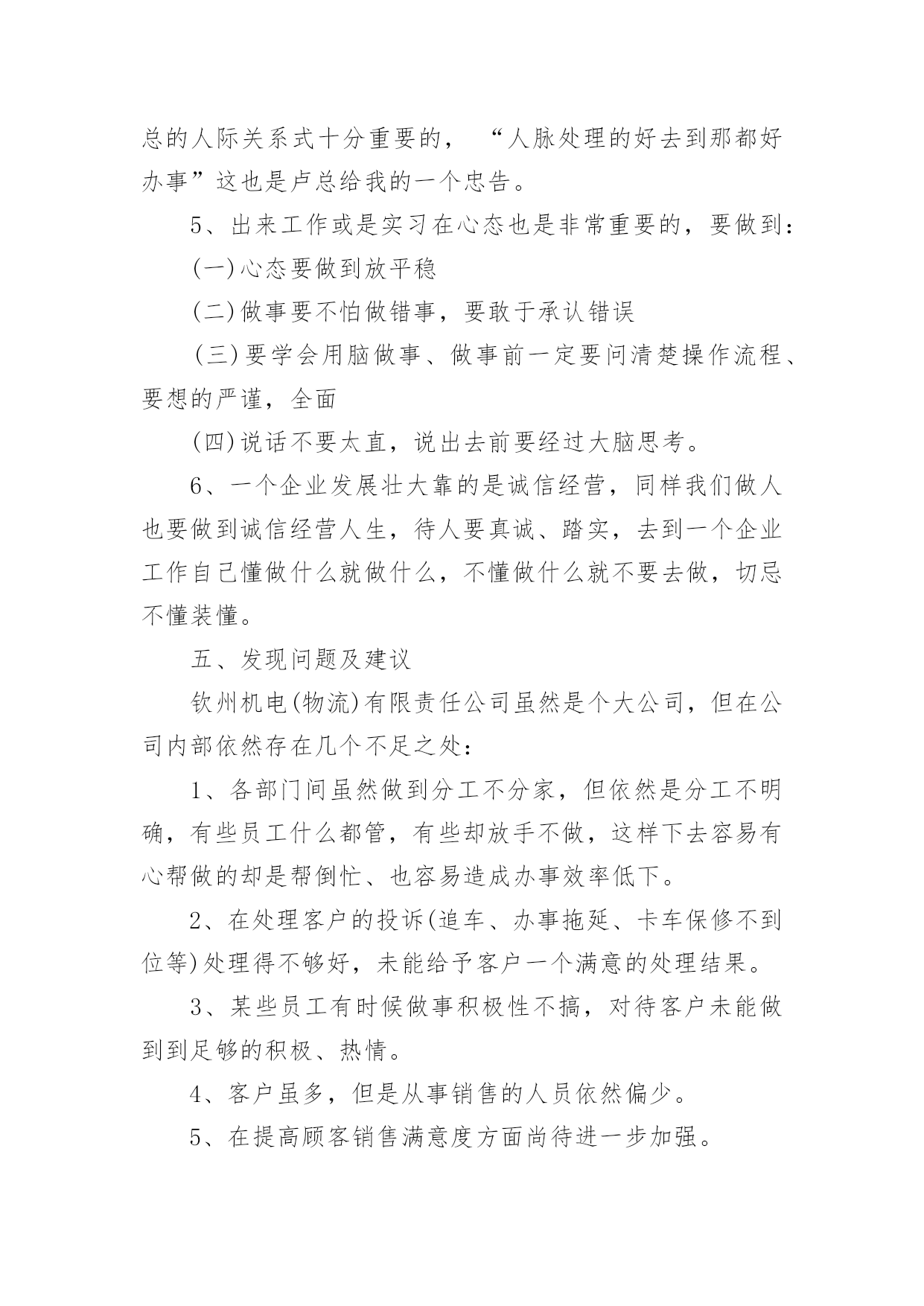 物流顶岗实习报告物流顶岗实习报告15篇在日常生活和工作中,报告的使用成为日常生活的常态,我们在写报告的时候要避免篇幅过长。我们应当如何写报告呢?以下是小编精心整理的物流顶岗实习报告,希望能够帮助到大家。物流顶岗实习报告1一、企业概况1、钦州**(机电)物流有限公司是一家主营现代汽车和各类重型卡车销售及物流营运的综合性公司。2、公司员工不多,只有14个人,虽然看似公司规模小,但是其业务量十分可观,每天都有来洽谈、购买咨询和办理各项业务的客户络绎不绝。3、职能部门分布:经理室、财务室、档案室、办公室、展厅、停车场。4、公司理念:信念远比黄金贵。5、发展方向:奋战100天,进军钦州港保税区。二、我们从事的主要工作内容有1、每天必做工作:开、关公司门、扫地,倒垃圾、清理烟灰缸,并帮忙整理员工办公桌上的凌乱的资料。2、整理档案室的档案,并对资料进行抽拿、放回去、打印、分顺序摆放等工作。3、接待客户,为客户倒杯水、引导客户办理手续、并帮忙复印他们需要办手续的资料,如:身份证、保险单、行驶证、购置证、户口本……4、从事一些简单的验车工作,在一旁帮忙递、拿东西、熟悉验车的流程。5、为客户准备办理贷款的合同资料,协助客户办理签字、办卡等业务。6、公司员工没空业务繁忙时候帮忙接听下电话、传真、在电脑上录机电、物流台帐、帮忙办理车辆入户、年审、购置证、营运证……工作。三、实习收获1、工作并不是公司员工、老总下达命令说要做什么工作、而是自己要自觉、主动去做、认为该做什么工作就要大胆去做不要犹豫。2、通过每天接触的购车过程中的与公司同事、客户沟通使我对卡车知识有了一定得了解、不仅知晓了卡车的一般构造、还学会了如何去验车、验车该验什么,如何去验。3、让我懂得了礼仪礼节的方面重要性,与同事相处要注意什么,什么话应该说、什么事不可以问也不可以做、如何与客户沟通好,特别是在打电话时学会礼貌用语的重要性,知道接电话首要该说第一句话是:“你好,钦州**”;客户来了能上这几句话:“老板,你好,想要什么车”、“坐下先吧”、“请喝杯水”之类的话。4、学会了使用复印机、打印机和传真机、在复印时双面复印也学会了。5、**现在的口号是:**动力,绿色动力。6、做事除了要大胆、积极、主动外还要谦虚问同事,要学会虚心求教,不懂话就问,做事前一定要问明白,切忌还没弄清楚怎么做就盲目的去做,这样很容易做错事,甚至造成难以修改的错误。四、实习体会1、凡事从底层做起,比如:对卡车销售不了解就必须从基础知识抓起,熟悉卡车的综合知识,不仅要熟背价格外面,更要懂一点卡车的构造知识。2、在公司内部沟通是很重要的,要多注意沟通,只要你肯问,多与同事沟通你会发现其实他是很容易沟通的,更能从他的口中学习到许多课本上没有的知识。3、“任何工作只要你肯去认真去学,去多问,都不会是很难的”,这是卢总给我的忠告,让我认识到了做事只要抱着谦虚的学习态度去做一件事,肯多去问,任何工作都会变得容易。4、人际关系的处理也是非常重要的。我在那里实习这么久发现公司内部的员工与员工之间,老总与员工的关系都是处理得很好,经常看到他们有说有笑,即使是经理也能与员工打成一片,工作地时候能相互合作,休息的时候能一起打牌、“吹水”有说有笑的。可见在工作当中处理同事及老总的人际关系式十分重要的,“人脉处理的好去到那都好办事”这也是卢总给我的一个忠告。5、出来工作或是实习在心态也是非常重要的,要做到:(一)心态要做到放平稳(二)做事要不怕做错事,要敢于承认错误(三)要学会用脑做事、做事前一定要问清楚操作流程、要想的严谨,全面(四)说话不要太直,说出去前要经过大脑思考。6、一个企业发展壮大靠的是诚信经营,同样我们做人也要做到诚信经营人生,待人要真诚、踏实,去到一个企业工作自己懂做什么就做什么,不懂做什么就不要去做,切忌不懂装懂。五、发现问题及建议钦州机电(物流)有限责任公司虽然是个大公司,但在公司内部依然存在几个不足之处:1、各部门间虽然做到分工不分家,但依然是分工不明确,有些员工什么都管,有些却放手不做,这样下去容易有心帮做的却是帮倒忙、也容易造成办事效率低下。2、在处理客户的投诉(追车、办事拖延、卡车保修不到位等)处理得不够好,未能给予客户一个满意的处理结果。3、某些员工有时候做事积极性不搞,对待客户未能做到到足够的积极、热情。4、客户虽多,但是从事销售的人员依然偏少。5、在提高顾客销售满意度方面尚待进一步加强。针对以上的问题我在这里不作建议,不过针对每天都有客户来追车,甚至场面一度非常紧张,在这方面我们在这里提出一些建议:1、向厂家(柳汽)催货、督促其加快生产进度,派人实时监控完工情况。2、在购车签署合同之前能与客户达成宽裕的交车时间。3、尽量向客户推销格尔发,因为霸龙交车时间长。4、车的完工情况、进度都能如实汇报给客户。5、可