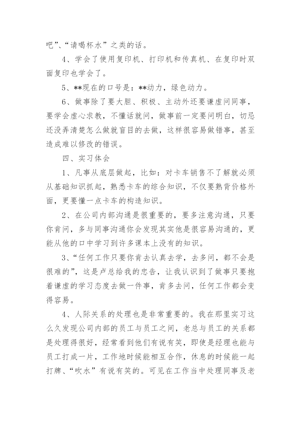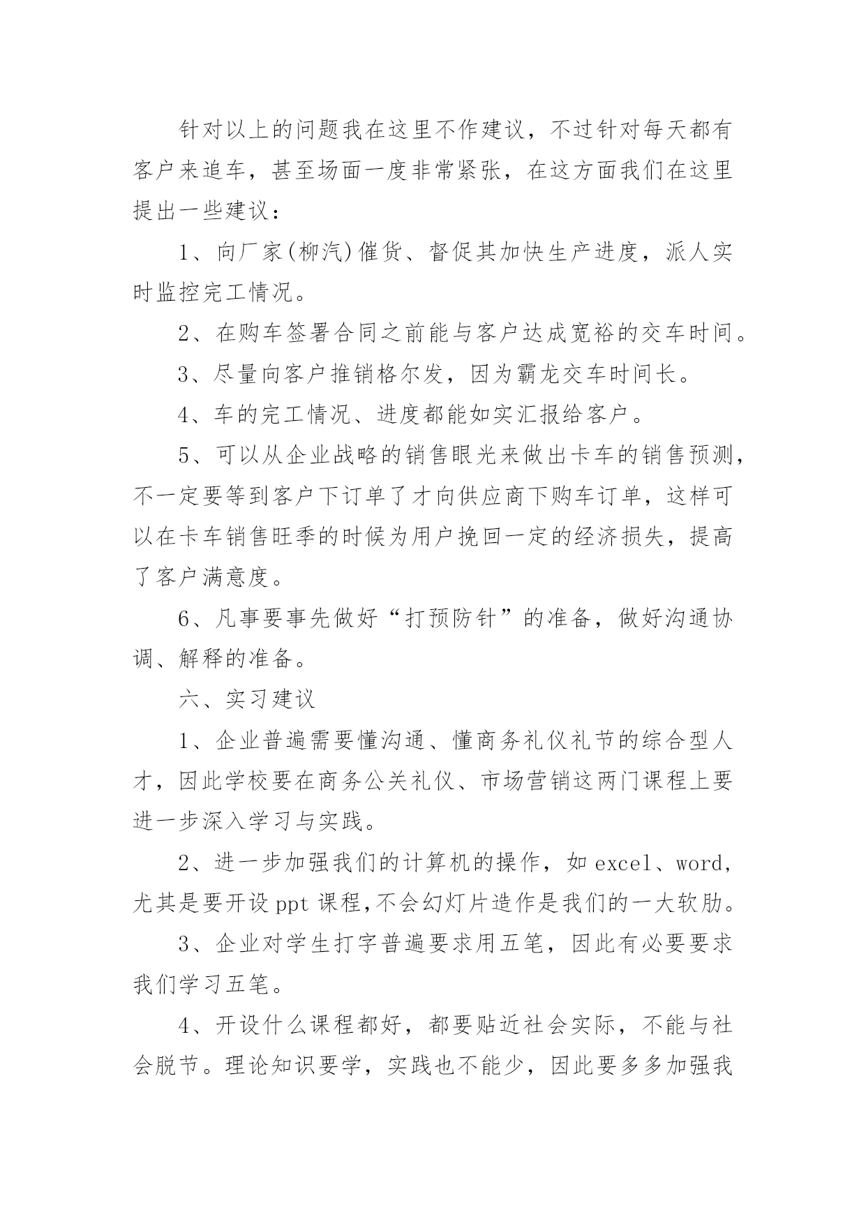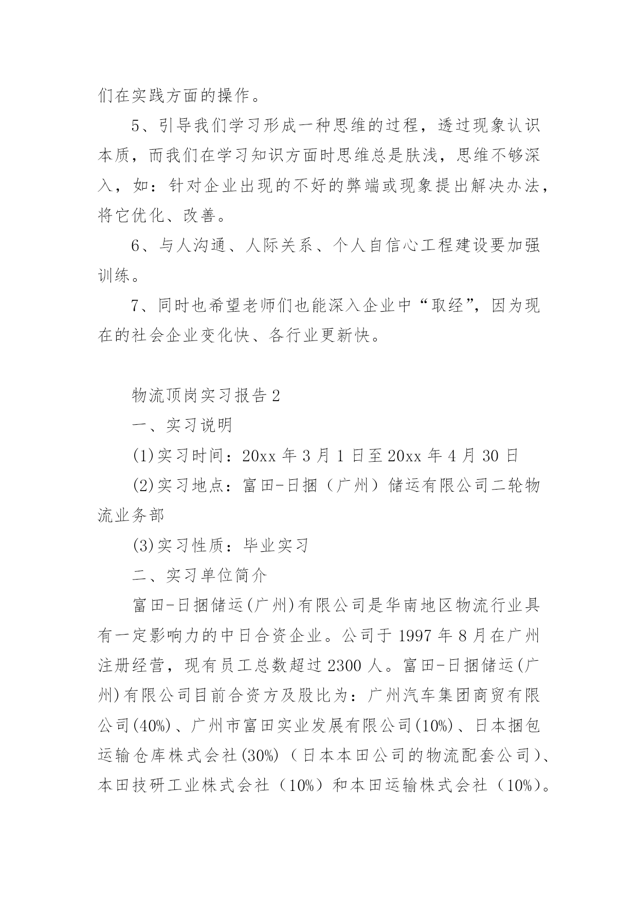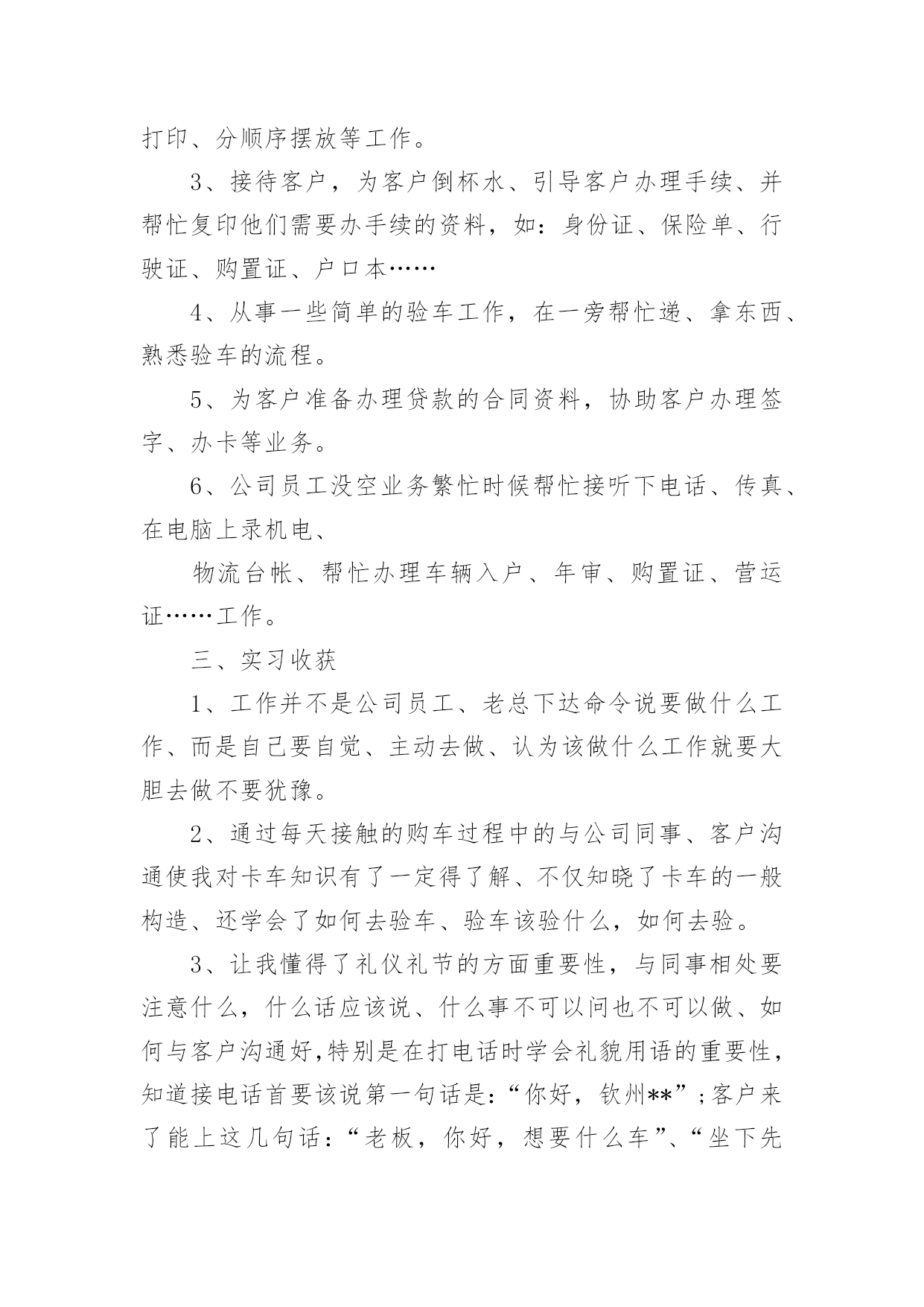 物流顶岗实习报告物流顶岗实习报告15篇在日常生活和工作中,报告的使用成为日常生活的常态,我们在写报告的时候要避免篇幅过长。我们应当如何写报告呢?以下是小编精心整理的物流顶岗实习报告,希望能够帮助到大家。物流顶岗实习报告1一、企业概况1、钦州**(机电)物流有限公司是一家主营现代汽车和各类重型卡车销售及物流营运的综合性公司。2、公司员工不多,只有14个人,虽然看似公司规模小,但是其业务量十分可观,每天都有来洽谈、购买咨询和办理各项业务的客户络绎不绝。3、职能部门分布:经理室、财务室、档案室、办公室、展厅、停车场。4、公司理念:信念远比黄金贵。5、发展方向:奋战100天,进军钦州港保税区。二、我们从事的主要工作内容有1、每天必做工作:开、关公司门、扫地,倒垃圾、清理烟灰缸,并帮忙整理员工办公桌上的凌乱的资料。2、整理档案室的档案,并对资料进行抽拿、放回去、打印、分顺序摆放等工作。3、接待客户,为客户倒杯水、引导客户办理手续、并帮忙复印他们需要办手续的资料,如:身份证、保险单、行驶证、购置证、户口本……4、从事一些简单的验车工作,在一旁帮忙递、拿东西、熟悉验车的流程。5、为客户准备办理贷款的合同资料,协助客户办理签字、办卡等业务。6、公司员工没空业务繁忙时候帮忙接听下电话、传真、在电脑上录机电、物流台帐、帮忙办理车辆入户、年审、购置证、营运证……工作。三、实习收获1、工作并不是公司员工、老总下达命令说要做什么工作、而是自己要自觉、主动去做、认为该做什么工作就要大胆去做不要犹豫。2、通过每天接触的购车过程中的与公司同事、客户沟通使我对卡车知识有了一定得了解、不仅知晓了卡车的一般构造、还学会了如何去验车、验车该验什么,如何去验。3、让我懂得了礼仪礼节的方面重要性,与同事相处要注意什么,什么话应该说、什么事不可以问也不可以做、如何与客户沟通好,特别是在打电话时学会礼貌用语的重要性,知道接电话首要该说第一句话是:“你好,钦州**”;客户来了能上这几句话:“老板,你好,想要什么车”、“坐下先吧”、“请喝杯水”之类的话。4、学会了使用复印机、打印机和传真机、在复印时双面复印也学会了。5、**现在的口号是:**动力,绿色动力。6、做事除了要大胆、积极、主动外还要谦虚问同事,要学会虚心求教,不懂话就问,做事前一定要问明白,切忌还没弄清楚怎么做就盲目的去做,这样很容易做错事,甚至造成难以修改的错误。四、实习体会1、凡事从底层做起,比如:对卡车销售不了解就必须从基础知识抓起,熟悉卡车的综合知识,不仅要熟背价格外面,更要懂一点卡车的构造知识。2、在公司内部沟通是很重要的,要多注意沟通,只要你肯问,多与同事沟通你会发现其实他是很容易沟通的,更能从他的口中学习到许多课本上没有的知识。3、“任何工作只要你肯去认真去学,去多问,都不会是很难的”,这是卢总给我的忠告,让我认识到了做事只要抱着谦虚的学习态度去做一件事,肯多去问,任何工作都会变得容易。4、人际关系的处理也是非常重要的。我在那里实习这么久发现公司内部的员工与员工之间,老总与员工的关系都是处理得很好,经常看到他们有说有笑,即使是经理也能与员工打成一片,工作地时候能相互合作,休息的时候能一起打牌、“吹水”有说有笑的。可见在工作当中处理同事及老总的人际关系式十分重要的,“人脉处理的好去到那都好办事”这也是卢总给我的一个忠告。5、出来工作或是实习在心态也是非常重要的,要做到:(一)心态要做到放平稳(二)做事要不怕做错事,要敢于承认错误(三)要学会用脑做事、做事前一定要问清楚操作流程、要想的严谨,全面(四)说话不要太直,说出去前要经过大脑思考。6、一个企业发展壮大靠的是诚信经营,同样我们做人也要做到诚信经营人生,待人要真诚、踏实,去到一个企业工作自己懂做什么就做什么,不懂做什么就不要去做,切忌不懂装懂。五、发现问题及建议钦州机电(物流)有限责任公司虽然是个大公司,但在公司内部依然存在几个不足之处:1、各部门间虽然做到分工不分家,但依然是分工不明确,有些员工什么都管,有些却放手不做,这样下去容易有心帮做的却是帮倒忙、也容易造成办事效率低下。2、在处理客户的投诉(追车、办事拖延、卡车保修不到位等)处理得不够好,未能给予客户一个满意的处理结果。3、某些员工有时候做事积极性不搞,对待客户未能做到到足够的积极、热情。4、客户虽多,但是从事销售的人员依然偏少。5、在提高顾客销售满意度方面尚待进一步加强。针对以上的问题我在这里不作建议,不过针对每天都有客户来追车,甚至场面一度非常紧张,在这方面我们在这里提出一些建议:1、向厂家(柳汽)催货、督促其加快生产进度,派人实时监控完工情况。2、在购车签署合同之前能与客户达成宽裕的交车时间。3、尽量向客户推销格尔发,因为霸龙交车时间长。4、车的完工情况、进度都能如实汇报给客户。5、可