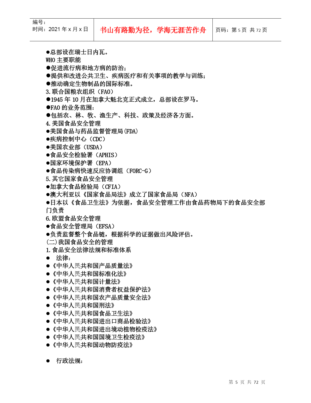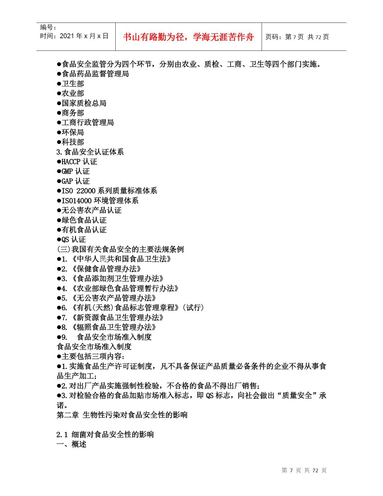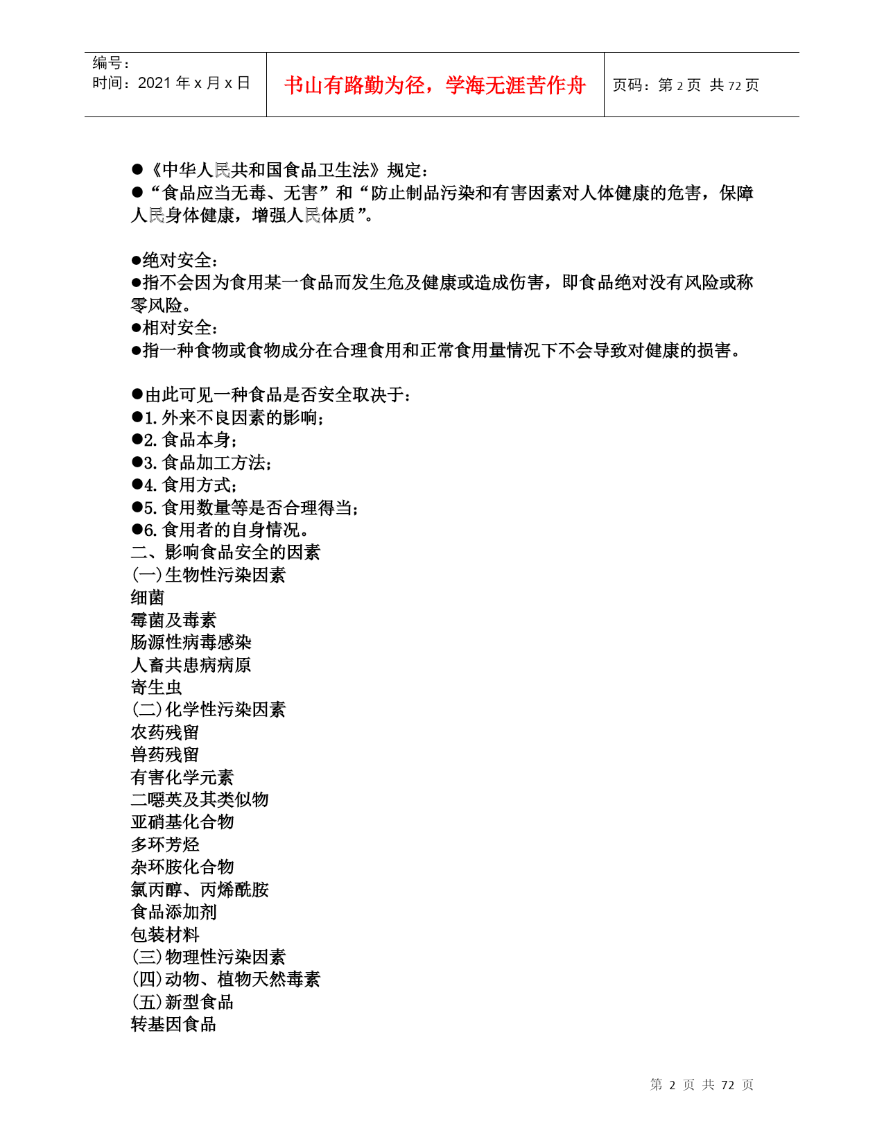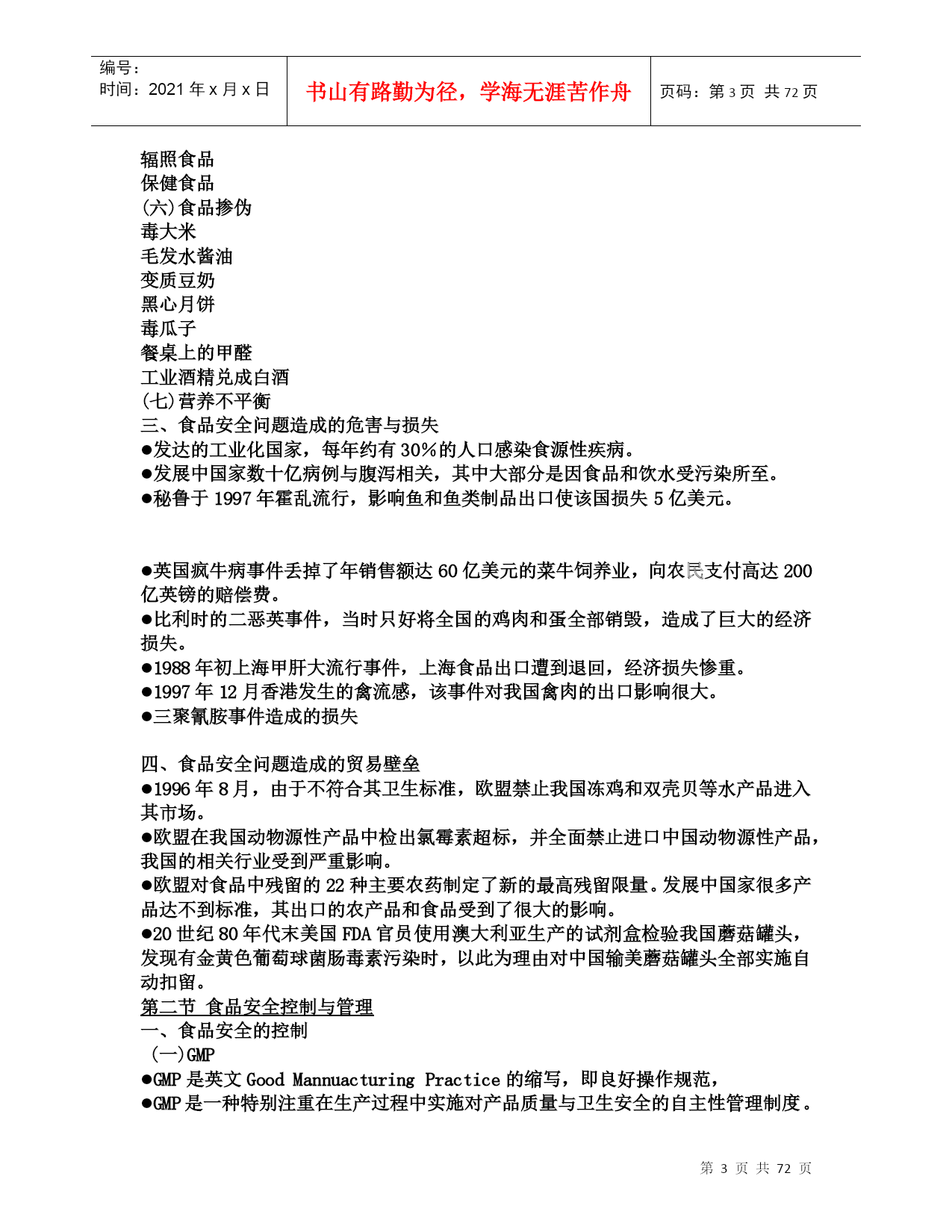 编号:时间:2021年x月x日书山有路勤为径,学海无涯苦作舟页码:第PAGE72页共NUMPAGES72页第PAGE\*MERGEFORMAT72页共NUMPAGES\*MERGEFORMAT72页食品安全学授课学时:56学时学分:3分学期:4授课内容:第一章食品安全概论第二章生物性污染对食品安全的影响第三章化学物质对食品安全的影响第四章放射性物质对食品安全的影响第五章天然有毒物质对食品安全的影响第六章转基因食品的安全问题实验:五个食品安全学实践:(一周)参考书[1]杨洁彬等.《食品安全性》中国轻工业出版社,1999.1[2]陈炳卿.《营养与食品卫生学》人民卫生出版社,2000.5[3]何计国等.《食品卫生学》中国农业出版社,2003.1[4]吴永宁.《现代食品安全科学》化学工业出版社,2003.5[5]许牡丹.《食品安全性与分析检测》化学工业出版社,2003.6第一章食品安全学概论第一节食品安全现状一、食品安全1.foodsecurity一个国家或社会的食物保障,即是否具有足够的食品供应。2.foodsafety食品中有毒、有害物质对人体健康影响的公共卫生问题。1997年WHO在题为《加强国家级食品安全计划指南》的文件中定义为:食品卫生:为了确保食品的安全性和适用性在食物链的所有阶段必须采取的一切条件和措施。食品安全:对食品按其原定用途进行制作和/或食用时不会使消费者健康受到损害的一种担保。食品安全概念食品(食物)的种植、养殖、加工、包装、贮藏、运输、销售、消费等活动符合国家强制标准和要求,不存在可能损害或威胁人体健康的有毒有害物质以导致消费者病亡或者危及消费者及其后代的隐患。《中华人民共和国食品卫生法》规定:“食品应当无毒、无害”和“防止制品污染和有害因素对人体健康的危害,保障人民身体健康,增强人民体质”。绝对安全:指不会因为食用某一食品而发生危及健康或造成伤害,即食品绝对没有风险或称零风险。相对安全:指一种食物或食物成分在合理食用和正常食用量情况下不会导致对健康的损害。由此可见一种食品是否安全取决于:1.外来不良因素的影响;2.食品本身;3.食品加工方法;4.食用方式;5.食用数量等是否合理得当;6.食用者的自身情况。二、影响食品安全的因素(一)生物性污染因素细菌霉菌及毒素肠源性病毒感染人畜共患病病原寄生虫(二)化学性污染因素农药残留兽药残留有害化学元素二噁英及其类似物亚硝基化合物多环芳烃杂环胺化合物氯丙醇、丙烯酰胺食品添加剂包装材料(三)物理性污染因素(四)动物、植物天然毒素(五)新型食品转基因食品辐照食品保健食品(六)食品掺伪毒大米毛发水酱油变质豆奶黑心月饼毒瓜子餐桌上的甲醛工业酒精兑成白酒(七)营养不平衡三、食品安全问题造成的危害与损失发达的工业化国家,每年约有30%的人口感染食源性疾病。发展中国家数十亿病例与腹泻相关,其中大部分是因食品和饮水受污染所至。秘鲁于1997年霍乱流行,影响鱼和鱼类制品出口使该国损失5亿美元。英国疯牛病事件丢掉了年销售额达60亿美元的菜牛饲养业,向农民支付高达200亿英镑的赔偿费。比利时的二恶英事件,当时只好将全国的鸡肉和蛋全部销毁,造成了巨大的经济损失。1988年初上海甲肝大流行事件,上海食品出口遭到退回,经济损失惨重。1997年12月香港发生的禽流感,该事件对我国禽肉的出口影响很大。三聚氰胺事件造成的损失四、食品安全问题造成的贸易壁垒1996年8月,由于不符合其卫生标准,欧盟禁止我国冻鸡和双壳贝等水产品进入其市场。欧盟在我国动物源性产品中检出氯霉素超标,并全面禁止进口中国动物源性产品,我国的相关行业受到严重影响。欧盟对食品中残留的22种主要农药制定了新的最高残留限量。发展中国家很多产品达不到标准,其出口的农产品和食品受到了很大的影响。20世纪80年代末美国FDA官员使用澳大利亚生产的试剂盒检验我国蘑菇罐头,发现有金黄色葡萄球菌肠毒素污染时,以此为理由对中国输美蘑菇罐头全部实施自动扣留。第二节食品安全控制与管理一、食品安全的控制(一)GMPGMP是英文GoodMannuacturingPractice的缩写,即良好操作规范,GMP是一种特别注重在生产过程中实施对产品质量与卫生安全的自主性管理制度。是一套适用于制药、食品等行业的强制性标准。(二)SSOPSSOP是SanitationStandardOperatingProcedure的缩写,即卫生标准操作程序用于指导食品生产加工过程中如何实施清洗、消毒和卫生保持。SSOP必须形成文件