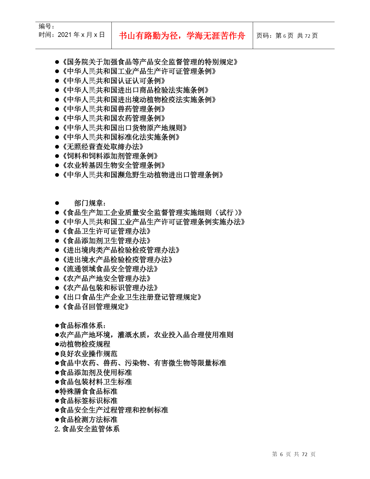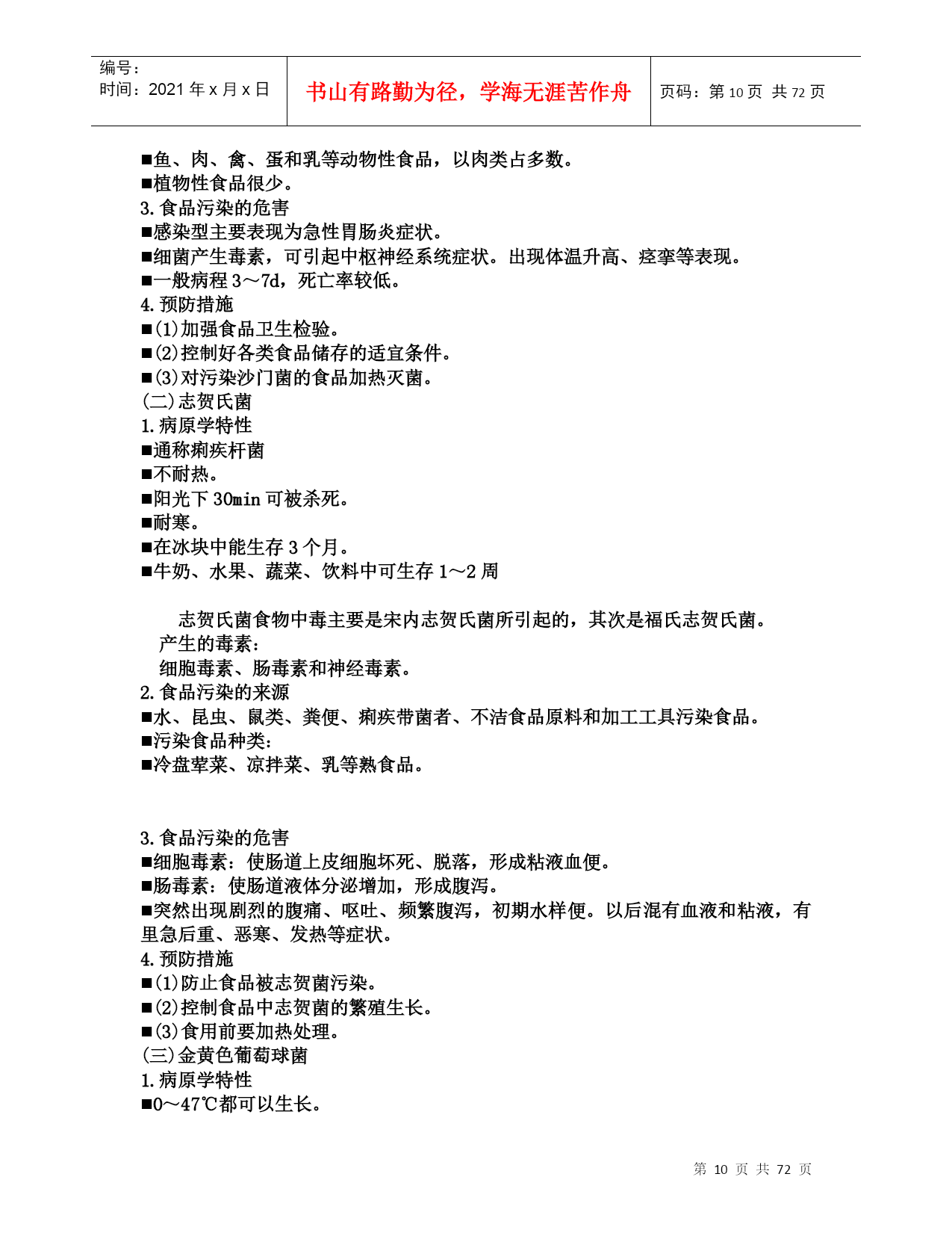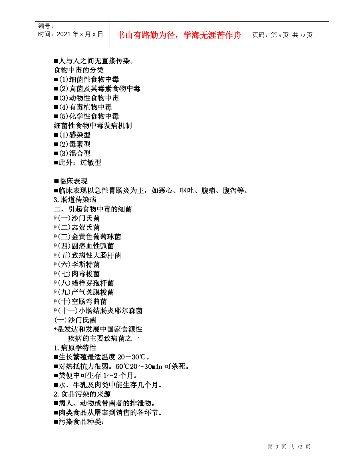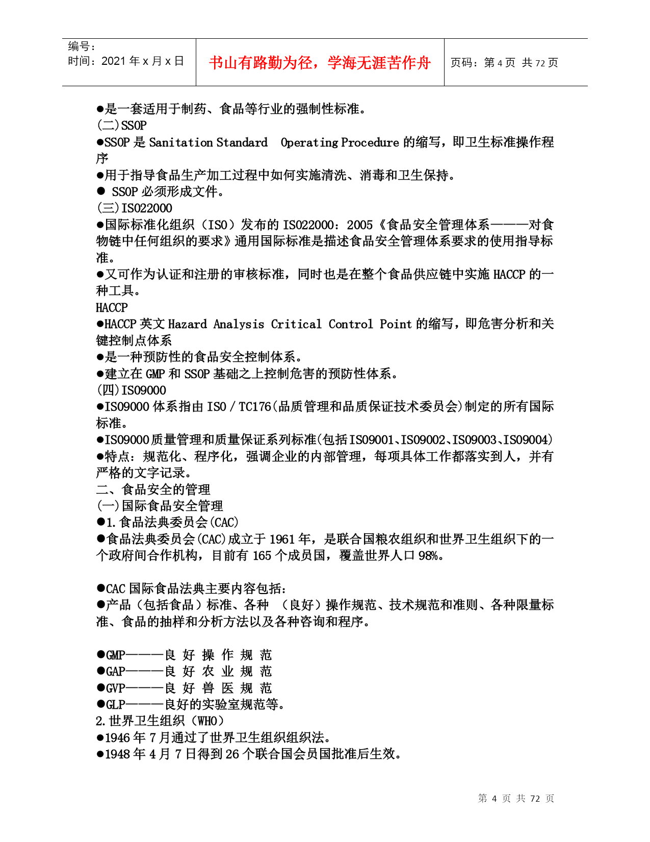 编号:时间:2021年x月x日书山有路勤为径,学海无涯苦作舟页码:第PAGE72页共NUMPAGES72页第PAGE\*MERGEFORMAT72页共NUMPAGES\*MERGEFORMAT72页食品安全学授课学时:56学时学分:3分学期:4授课内容:第一章食品安全概论第二章生物性污染对食品安全的影响第三章化学物质对食品安全的影响第四章放射性物质对食品安全的影响第五章天然有毒物质对食品安全的影响第六章转基因食品的安全问题实验:五个食品安全学实践:(一周)参考书[1]杨洁彬等.《食品安全性》中国轻工业出版社,1999.1[2]陈炳卿.《营养与食品卫生学》人民卫生出版社,2000.5[3]何计国等.《食品卫生学》中国农业出版社,2003.1[4]吴永宁.《现代食品安全科学》化学工业出版社,2003.5[5]许牡丹.《食品安全性与分析检测》化学工业出版社,2003.6第一章食品安全学概论第一节食品安全现状一、食品安全1.foodsecurity一个国家或社会的食物保障,即是否具有足够的食品供应。2.foodsafety食品中有毒、有害物质对人体健康影响的公共卫生问题。1997年WHO在题为《加强国家级食品安全计划指南》的文件中定义为:食品卫生:为了确保食品的安全性和适用性在食物链的所有阶段必须采取的一切条件和措施。食品安全:对食品按其原定用途进行制作和/或食用时不会使消费者健康受到损害的一种担保。食品安全概念食品(食物)的种植、养殖、加工、包装、贮藏、运输、销售、消费等活动符合国家强制标准和要求,不存在可能损害或威胁人体健康的有毒有害物质以导致消费者病亡或者危及消费者及其后代的隐患。《中华人民共和国食品卫生法》规定:“食品应当无毒、无害”和“防止制品污染和有害因素对人体健康的危害,保障人民身体健康,增强人民体质”。绝对安全:指不会因为食用某一食品而发生危及健康或造成伤害,即食品绝对没有风险或称零风险。相对安全:指一种食物或食物成分在合理食用和正常食用量情况下不会导致对健康的损害。由此可见一种食品是否安全取决于:1.外来不良因素的影响;2.食品本身;3.食品加工方法;4.食用方式;5.食用数量等是否合理得当;6.食用者的自身情况。二、影响食品安全的因素(一)生物性污染因素细菌霉菌及毒素肠源性病毒感染人畜共患病病原寄生虫(二)化学性污染因素农药残留兽药残留有害化学元素二噁英及其类似物亚硝基化合物多环芳烃杂环胺化合物氯丙醇、丙烯酰胺食品添加剂包装材料(三)物理性污染因素(四)动物、植物天然毒素(五)新型食品转基因食品辐照食品保健食品(六)食品掺伪毒大米毛发水酱油变质豆奶黑心月饼毒瓜子餐桌上的甲醛工业酒精兑成白酒(七)营养不平衡三、食品安全问题造成的危害与损失发达的工业化国家,每年约有30%的人口感染食源性疾病。发展中国家数十亿病例与腹泻相关,其中大部分是因食品和饮水受污染所至。秘鲁于1997年霍乱流行,影响鱼和鱼类制品出口使该国损失5亿美元。英国疯牛病事件丢掉了年销售额达60亿美元的菜牛饲养业,向农民支付高达200亿英镑的赔偿费。比利时的二恶英事件,当时只好将全国的鸡肉和蛋全部销毁,造成了巨大的经济损失。1988年初上海甲肝大流行事件,上海食品出口遭到退回,经济损失惨重。1997年12月香港发生的禽流感,该事件对我国禽肉的出口影响很大。三聚氰胺事件造成的损失四、食品安全问题造成的贸易壁垒1996年8月,由于不符合其卫生标准,欧盟禁止我国冻鸡和双壳贝等水产品进入其市场。欧盟在我国动物源性产品中检出氯霉素超标,并全面禁止进口中国动物源性产品,我国的相关行业受到严重影响。欧盟对食品中残留的22种主要农药制定了新的最高残留限量。发展中国家很多产品达不到标准,其出口的农产品和食品受到了很大的影响。20世纪80年代末美国FDA官员使用澳大利亚生产的试剂盒检验我国蘑菇罐头,发现有金黄色葡萄球菌肠毒素污染时,以此为理由对中国输美蘑菇罐头全部实施自动扣留。第二节食品安全控制与管理一、食品安全的控制(一)GMPGMP是英文GoodMannuacturingPractice的缩写,即良好操作规范,GMP是一种特别注重在生产过程中实施对产品质量与卫生安全的自主性管理制度。是一套适用于制药、食品等行业的强制性标准。(二)SSOPSSOP是SanitationStandardOperatingProcedure的缩写,即卫生标准操作程序用于指导食品生产加工过程中如何实施清洗、消毒和卫生保持。SSOP必须形成文件