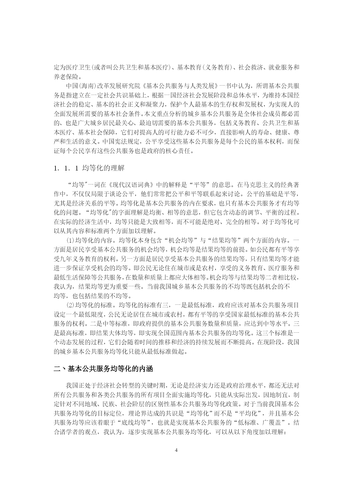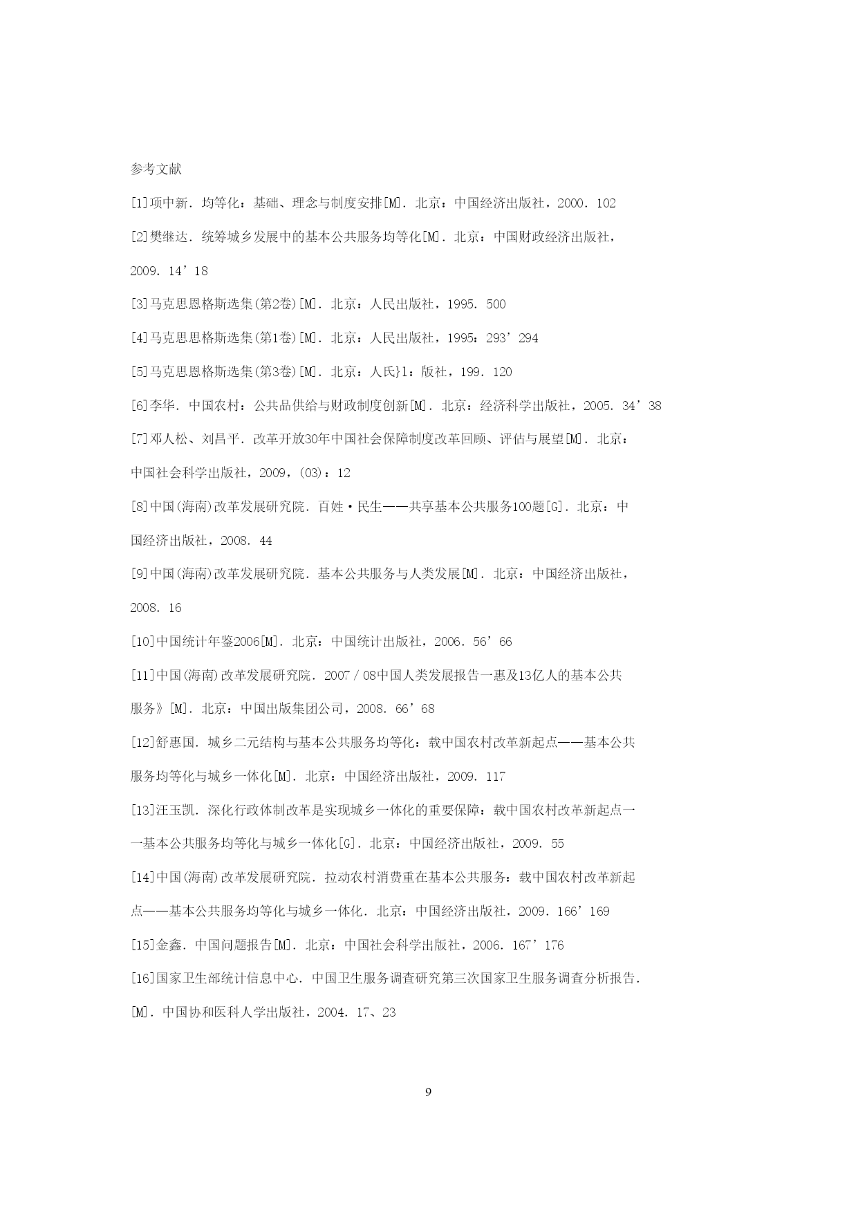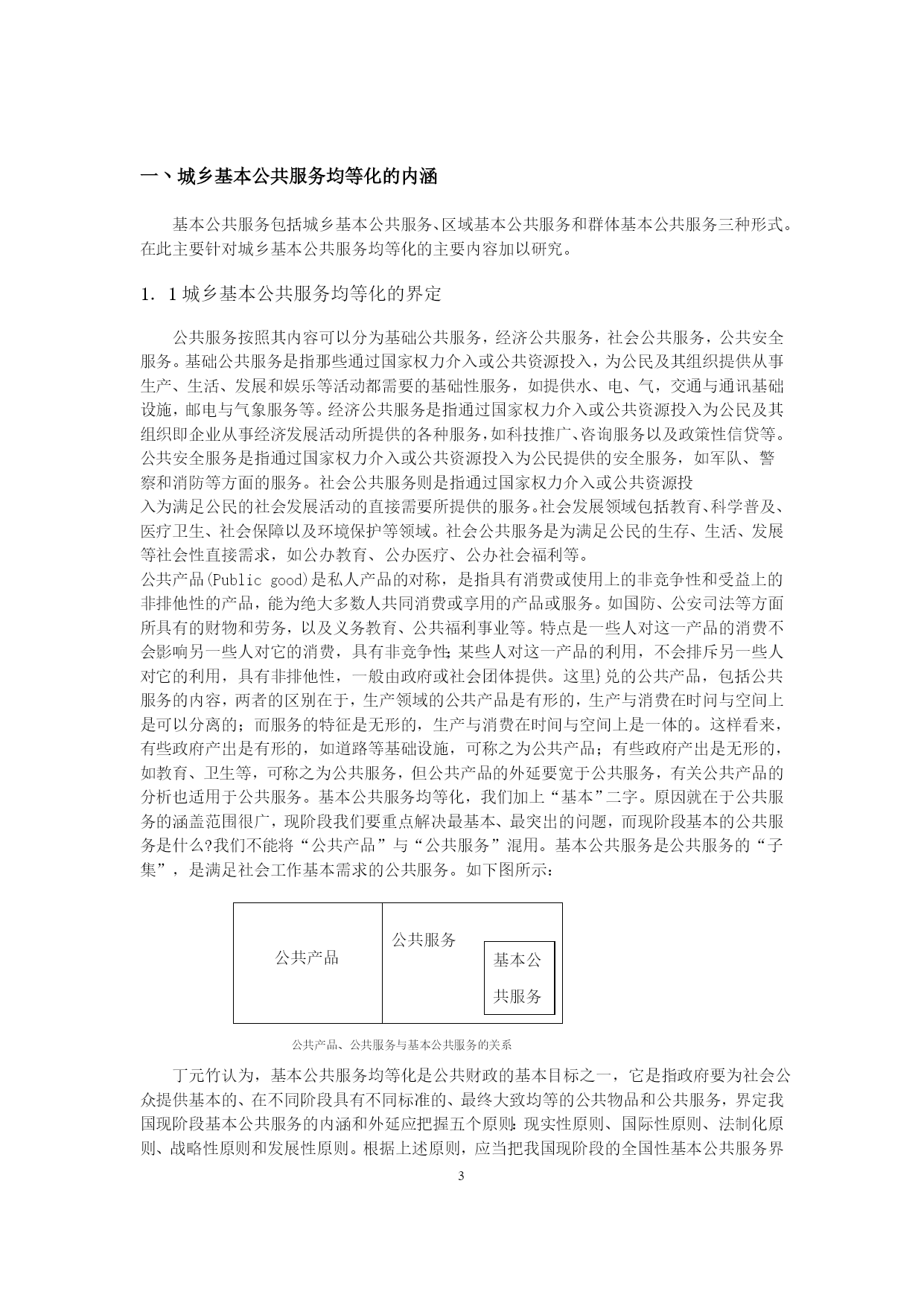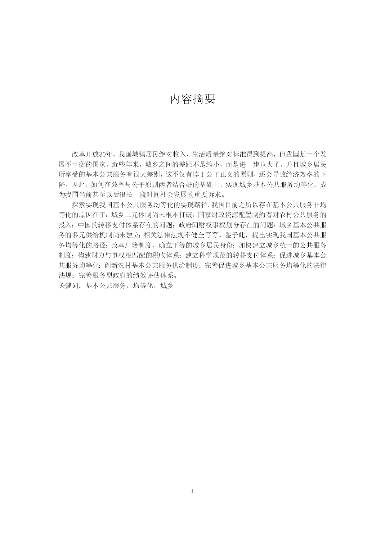 PAGE\*MERGEFORMAT9201601届行政管理专业毕业生论文课题名称:城乡公共服务均等化问题研究学生姓名:池海指导教师:HYPERLINK"http://jwstu.jiangnan.edu.cn:8080/student/thesis/ThesisApply/ThesisTeacherDetail.asp?TeacherID=wcj"汪春劼江南大学网络教育学院2015年8月5日内容摘要改革开放30年,我国城镇居民绝对收入、生活质量绝对标准得到提高,但我国是一个发展不平衡的国家,近些年来,城乡之间的差距不是缩小,而是进一步拉大了,并且城乡居民所享受的基本公共服务有很大差别,这不仅有悖于公平正义的原则,还会导致经济效率的下降。因此,如何在效率与公平原则两者结合好的基础上,实现城乡基本公共服务均等化,成为我国当前甚至以后很长一段时间社会发展的重要诉求。探索实现我国基本公共服务均等化的实现路径。我国目前之所以存在基本公共服务非均等化的原因在于:城乡二元体制尚未根本打破;国家财政资源配置制约着对农村公共服务的投入;中国的转移支付体系存在的问题;政府间财权事权划分存在的问题:城乡基本公共服务的多元供给机制尚未建立;相关法律法规不健全等等。鉴于此,提出实现我国基本公共服务均等化的路径:改革户籍制度,确立平等的城乡居民身份;加快建立城乡统一的公共服务制度;构建财力与事权相匹配的税收体系;建立科学规范的转移支付体系;促进城乡基本公共服务均等化;创新农村基本公共服务供给制度;完善促进城乡基本公共服务均等化的法律法规;完善服务型政府的绩效评估体系。关键词:基本公共服务,均等化,城乡目录HYPERLINK\l"_Toc432702388"内容摘要1HYPERLINK\l"_Toc432702388"一丶基本公共服务均等化的内涵3TOC\o"1-3"\h\z\uHYPERLINK\l"_Toc432702386"1.1城乡基本公共服务均等化的界定PAGEREF_Toc432702386\h3HYPERLINK\l"_Toc432702387"1.1.1均等化的理解PAGEREF_Toc432702387\h4HYPERLINK\l"_Toc432702388"二丶基本公共服务均等化的内涵5HYPERLINK\l"_Toc432702389"三丶改变城乡结构的二元制度安排PAGEREF_Toc432702389\h5HYPERLINK\l"_Toc432702390"3.1改革户籍制度,确立平等的城乡居民身份PAGEREF_Toc432702390\h5HYPERLINK\l"_Toc432702391"四丶加快建立城乡统一的公共服务制度PAGEREF_Toc432702391\h6HYPERLINK\l"_Toc432702392"五丶完善公共财政体系促进城乡基本公共服务均等PAGEREF_Toc432702392\h7HYPERLINK\l"_Toc432702393"5.1构建财力与事权相匹配的税收体系PAGEREF_Toc432702393\h7一丶城乡基本公共服务均等化的内涵基本公共服务包括城乡基本公共服务、区域基本公共服务和群体基本公共服务三种形式。在此主要针对城乡基本公共服务均等化的主要内容加以研究。1.1城乡基本公共服务均等化的界定公共服务按照其内容可以分为基础公共服务,经济公共服务,社会公共服务,公共安全服务。基础公共服务是指那些通过国家权力介入或公共资源投入,为公民及其组织提供从事生产、生活、发展和娱乐等活动都需要的基础性服务,如提供水、电、气,交通与通讯基础设施,邮电与气象服务等。经济公共服务是指通过国家权力介入或公共资源投入为公民及其组织即企业从事经济发展活动所提供的各种服务,如科技推广、咨询服务以及政策性信贷等。公共安全服务是指通过国家权力介入或公共资源投入为公民提供的安全服务,如军队、警察和消防等方面的服务。社会公共服务则是指通过国家权力介入或公共资源投入为满足公民的社会发展活动的直接需要所提供的服务。社会发展领域包括教育、科学普及、医疗卫生、社会保障以及环境保护等领域。社会公共服务是为满足公民的生存、生活、发展等社会性直接需求,如公办教育、公办医疗、公办社会福利等。公共产品(Publicgood)是私人产品的对称,是指具有消费或使用上的非竞争性和受益上的非排他性的产品,能为绝大多数人共同消费或享用的产品或服务。如国防