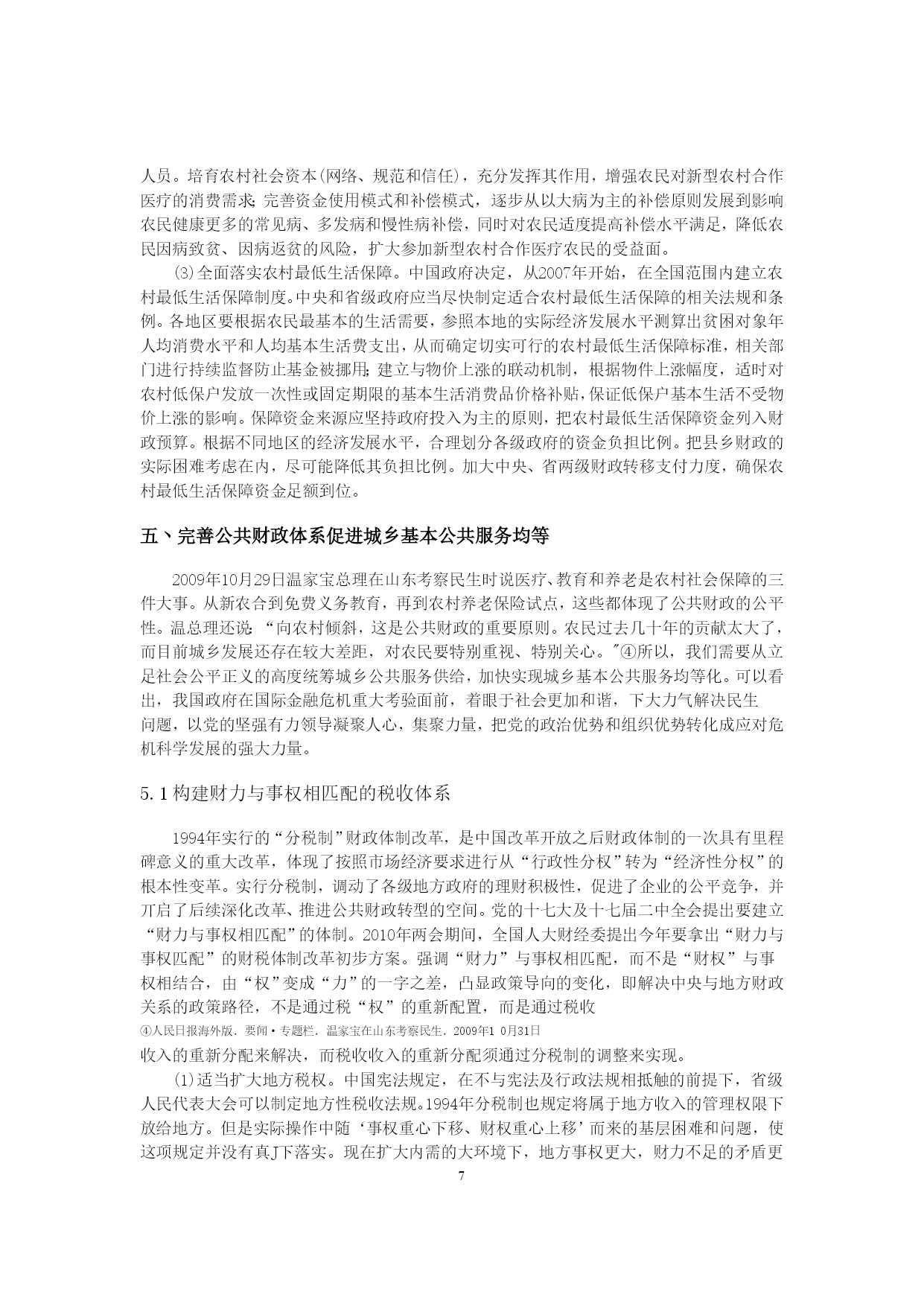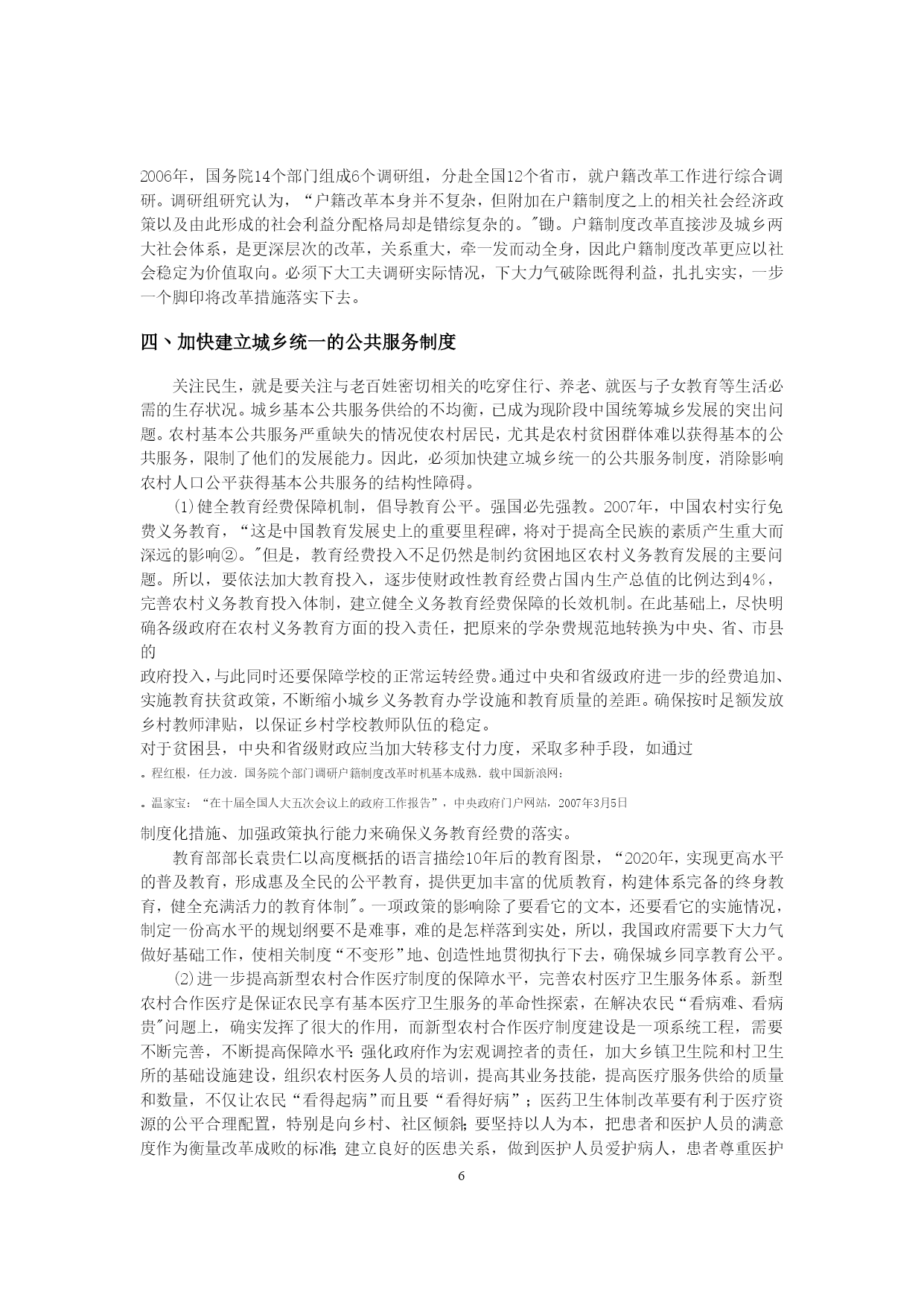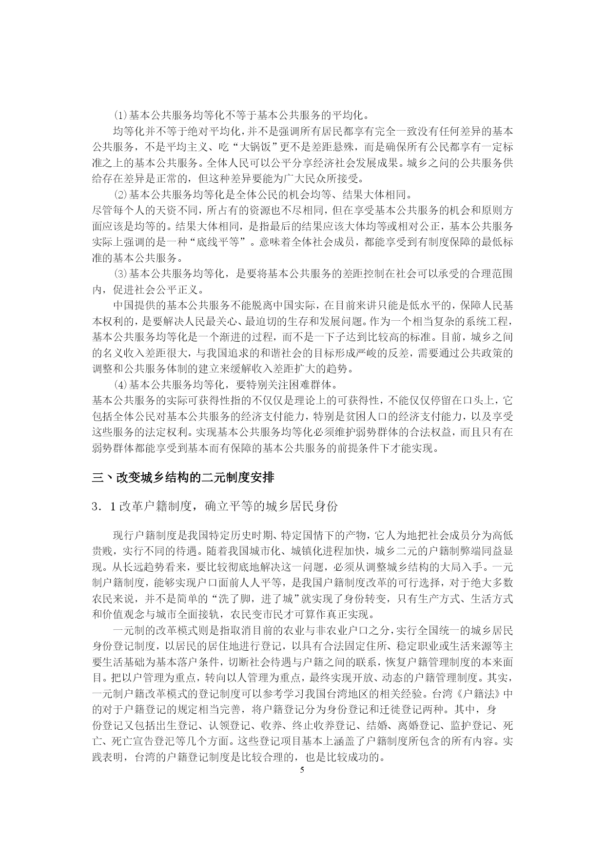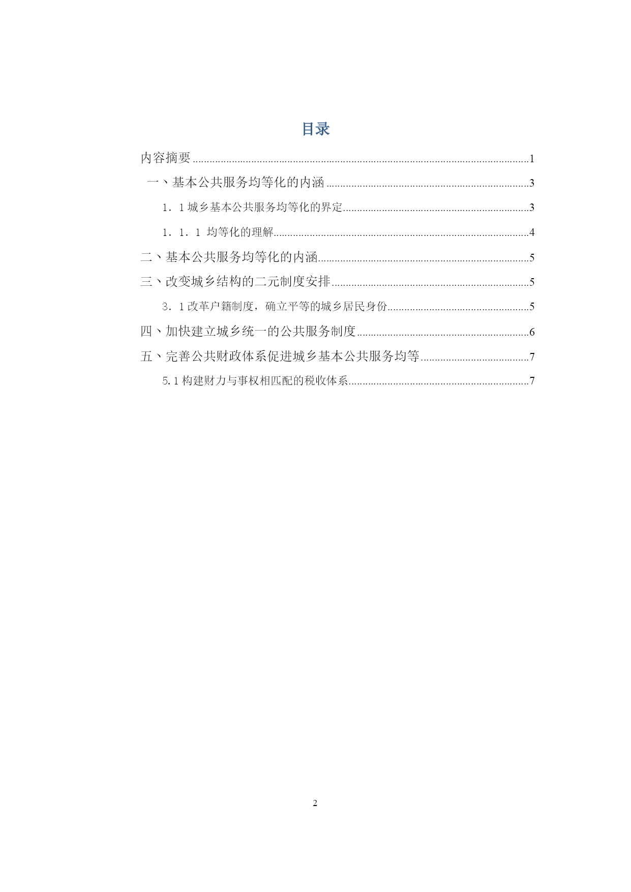 PAGE\*MERGEFORMAT9201601届行政管理专业毕业生论文课题名称:城乡公共服务均等化问题研究学生姓名:池海指导教师:HYPERLINK"http://jwstu.jiangnan.edu.cn:8080/student/thesis/ThesisApply/ThesisTeacherDetail.asp?TeacherID=wcj"汪春劼江南大学网络教育学院2015年8月5日内容摘要改革开放30年,我国城镇居民绝对收入、生活质量绝对标准得到提高,但我国是一个发展不平衡的国家,近些年来,城乡之间的差距不是缩小,而是进一步拉大了,并且城乡居民所享受的基本公共服务有很大差别,这不仅有悖于公平正义的原则,还会导致经济效率的下降。因此,如何在效率与公平原则两者结合好的基础上,实现城乡基本公共服务均等化,成为我国当前甚至以后很长一段时间社会发展的重要诉求。探索实现我国基本公共服务均等化的实现路径。我国目前之所以存在基本公共服务非均等化的原因在于:城乡二元体制尚未根本打破;国家财政资源配置制约着对农村公共服务的投入;中国的转移支付体系存在的问题;政府间财权事权划分存在的问题:城乡基本公共服务的多元供给机制尚未建立;相关法律法规不健全等等。鉴于此,提出实现我国基本公共服务均等化的路径:改革户籍制度,确立平等的城乡居民身份;加快建立城乡统一的公共服务制度;构建财力与事权相匹配的税收体系;建立科学规范的转移支付体系;促进城乡基本公共服务均等化;创新农村基本公共服务供给制度;完善促进城乡基本公共服务均等化的法律法规;完善服务型政府的绩效评估体系。关键词:基本公共服务,均等化,城乡目录HYPERLINK\l"_Toc432702388"内容摘要1HYPERLINK\l"_Toc432702388"一丶基本公共服务均等化的内涵3TOC\o"1-3"\h\z\uHYPERLINK\l"_Toc432702386"1.1城乡基本公共服务均等化的界定PAGEREF_Toc432702386\h3HYPERLINK\l"_Toc432702387"1.1.1均等化的理解PAGEREF_Toc432702387\h4HYPERLINK\l"_Toc432702388"二丶基本公共服务均等化的内涵5HYPERLINK\l"_Toc432702389"三丶改变城乡结构的二元制度安排PAGEREF_Toc432702389\h5HYPERLINK\l"_Toc432702390"3.1改革户籍制度,确立平等的城乡居民身份PAGEREF_Toc432702390\h5HYPERLINK\l"_Toc432702391"四丶加快建立城乡统一的公共服务制度PAGEREF_Toc432702391\h6HYPERLINK\l"_Toc432702392"五丶完善公共财政体系促进城乡基本公共服务均等PAGEREF_Toc432702392\h7HYPERLINK\l"_Toc432702393"5.1构建财力与事权相匹配的税收体系PAGEREF_Toc432702393\h7一丶城乡基本公共服务均等化的内涵基本公共服务包括城乡基本公共服务、区域基本公共服务和群体基本公共服务三种形式。在此主要针对城乡基本公共服务均等化的主要内容加以研究。1.1城乡基本公共服务均等化的界定公共服务按照其内容可以分为基础公共服务,经济公共服务,社会公共服务,公共安全服务。基础公共服务是指那些通过国家权力介入或公共资源投入,为公民及其组织提供从事生产、生活、发展和娱乐等活动都需要的基础性服务,如提供水、电、气,交通与通讯基础设施,邮电与气象服务等。经济公共服务是指通过国家权力介入或公共资源投入为公民及其组织即企业从事经济发展活动所提供的各种服务,如科技推广、咨询服务以及政策性信贷等。公共安全服务是指通过国家权力介入或公共资源投入为公民提供的安全服务,如军队、警察和消防等方面的服务。社会公共服务则是指通过国家权力介入或公共资源投入为满足公民的社会发展活动的直接需要所提供的服务。社会发展领域包括教育、科学普及、医疗卫生、社会保障以及环境保护等领域。社会公共服务是为满足公民的生存、生活、发展等社会性直接需求,如公办教育、公办医疗、公办社会福利等。公共产品(Publicgood)是私人产品的对称,是指具有消费或使用上的非竞争性和受益上的非排他性的产品,能为绝大多数人共同消费或享用的产品或服务。如国防