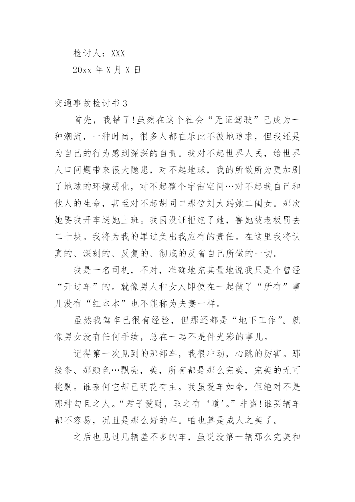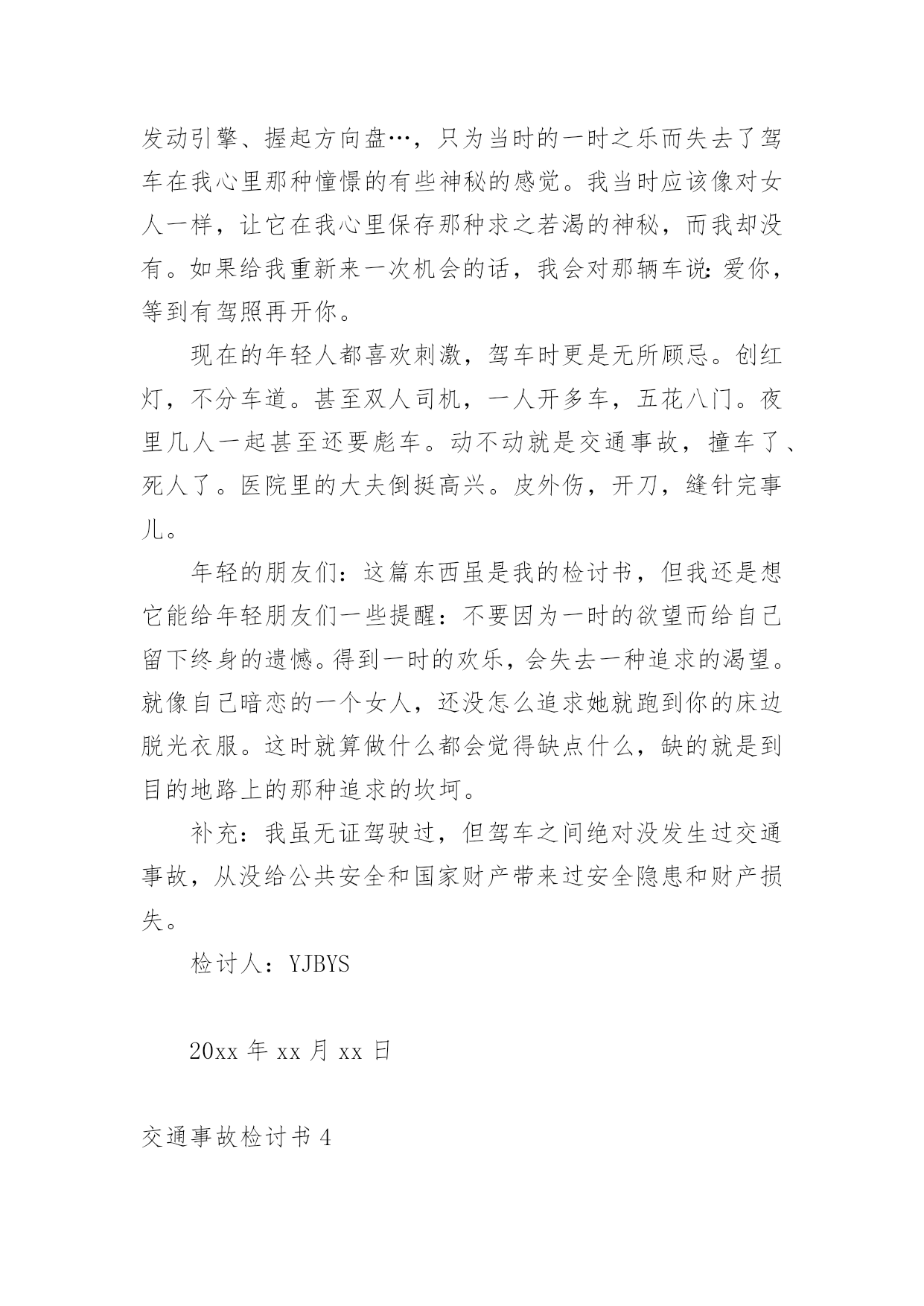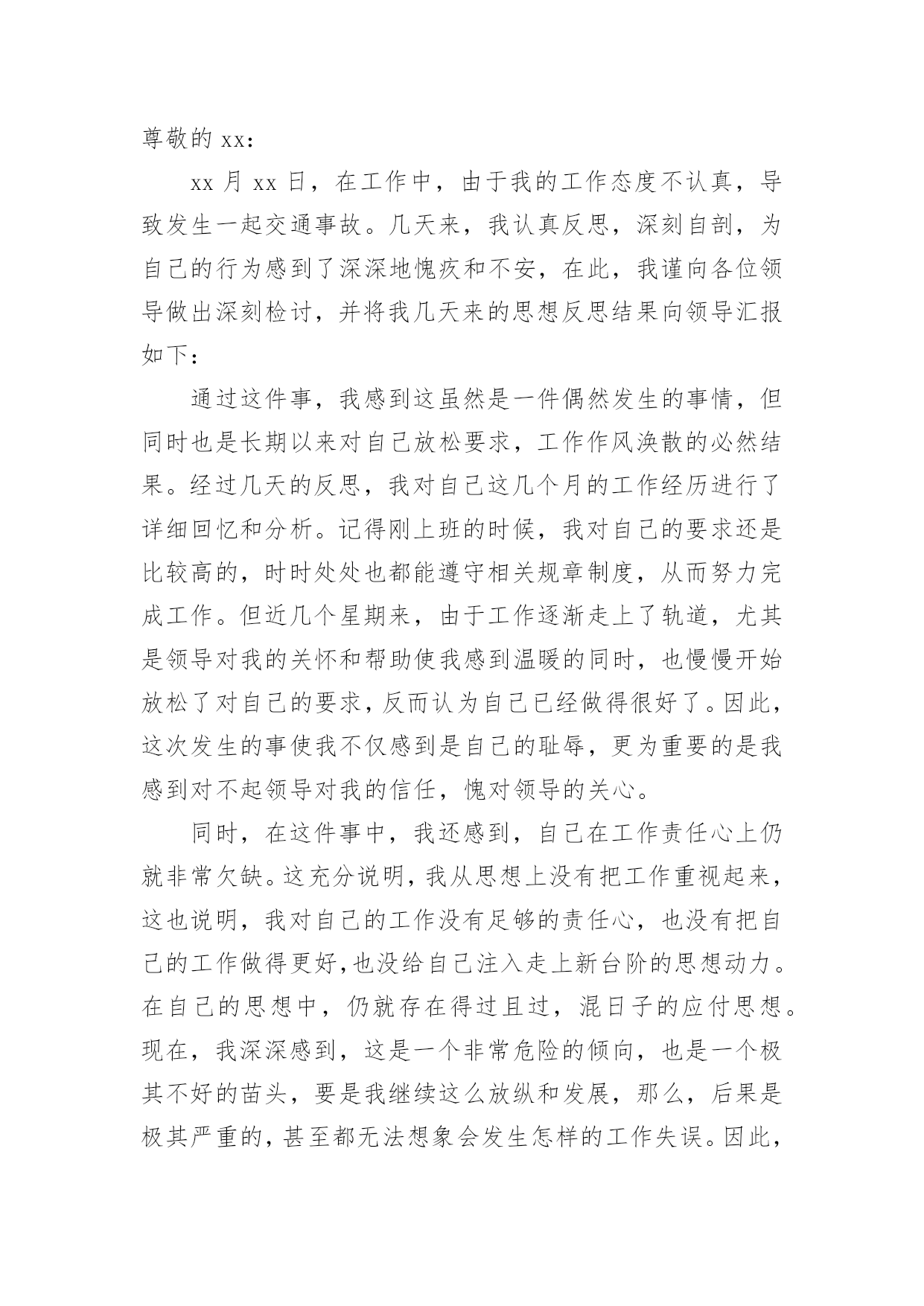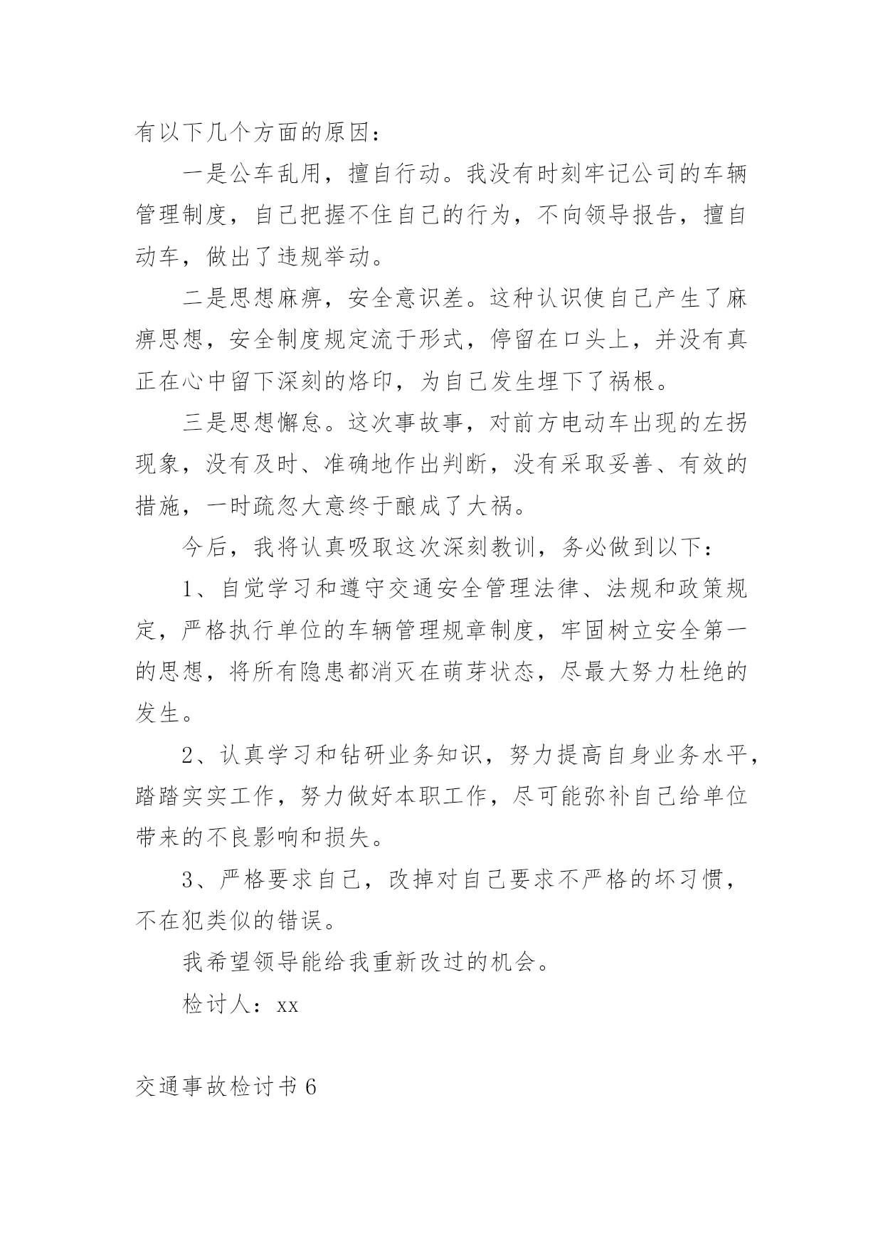 交通事故检讨书交通事故检讨书13篇在某件事出现失误后,为了避免再次出现相同情况,往往被要求写检讨书来自我悔过,写检讨书是为了能够不断提醒自己。什么样的检讨书才是好的检讨书呢?下面是小编整理的交通事故检讨书,欢迎大家借鉴与参考,希望对大家有所帮助。交通事故检讨书1尊敬的xx:我是运输部服务车队驾驶员xxx,于xxxx年xxx月xx日下午xx点xx分驾驶闽C去(xxx厂家)外装途中行驶至xxxx路段,发生交通事故。这次交通事故给对方、同事及自己带来惊吓和不安,同时也给公司造成了一定损失。直到现在我仍然惊魂未定,想起发生事故的一刹那就有种担惊受怕的感觉。经过这几天来的认真反思,深刻自剖,为自己的行为感到了深深地愧疚和不安,在此,我谨向各位公司做出深刻检讨和保证,并将我几天来的思想反思结果向领导汇报如下:1、深刻反省自己,提高事故的认识力。2、努力学习道路交通安全法律法规,遵守交通规则。3、向的公司的老驾驶员虚心学习钻研驾驶技术,提高自身的驾驶操作水平。4、不开英雄车,不酒后驾车,不强行超车,杜绝一切交通违章行为的发生。检讨人:xxxxxx年xx月xx日交通事故检讨书2尊敬的单位领导:您好!今天中午,因为我的一时大意,驾驶单位用车在中山北路交叉口与小货车相撞,导致双方车辆相当程度的损坏,给单位造成了严重的损失。在此,我就自己给单位带来了麻烦以及给您造成的困扰,向您表示深深的悔意。深刻反思当时的事故原因,我也已经跟交警陈述过了,我没有任何的饮酒行为。仅仅是因为经过一上午的工作,精神有些疲倦,在拐弯路段没有降速,造成的本次事故。虽然事故对方货车司机有超重嫌疑,但是主要原因是我的车速快了。发生车祸后,我追悔莫及。这起事故发生以后,我痛恨自己的不谨慎、不小心。我想这起事故,肯定会在今后很长时间里给带来了阴影,是一快疤痕,让我纠结痛苦。现在,我深刻地意识到错了,并且表示愿意接受单位上的批评与处罚。最后,我只请求领导能够给我一个改过自新的机会,我会在今后加倍努力工作,以弥补我的过错。检讨人:XXX20xx年X月X日交通事故检讨书3首先,我错了!虽然在这个社会“无证驾驶”已成为一种潮流,一种时尚,很多人都在乐此不彼地追求,但我还是为自己的行为感到深深的自责。我对不起世界人民,给世界人口问题带来很大隐患,对不起地球,我的所做所为更加剧了地球的环境恶化,对不起整个宇宙空间…对不起我自己和他人的生命,甚至对不起胡同口那位刘大妈她二闺女。那次她要我开车送她上班。我因没证拒绝了她,害她被老板罚去二十块。我将为我的罪过负出我应有的责任。在这里我将认真的、深刻的、反复的、彻底的反省自己所做的一切。我是一名司机,不对,准确地充其量地说我只是个曾经“开过车”的。就像男人和女人即使在一起做了“所有”事儿没有“红本本”也不能称为夫妻一样。虽然我驾车已很有经验,但那还都是“地下工作”。就像男女没有任何手续,总在一起不是件光彩的事儿。记得第一次见到的那部车,我很冲动,心跳的厉害。那线条、那颜色…飘亮,美,所有都是那么完美,完美的无可挑剔。谁奈何它却已明花有主。我虽爱车如命,但绝对不是那种勾且之人。“君子爱财,取之有‘道’。”非盗!谁买辆车都不容易,况且是那么好的车。咱也算是成人之美了。之后也见过几辆差不多的车,虽说没第一辆那么完美和心动的感觉,但我也想要一辆,却还是囊中羞涩,与之擦肩。我真正的车手生涯还要从大概三年前开始说起。那是一个深手不见五指的黑夜。我喜欢了两年的那辆车就停在路边。两年了,扔在路边,应该是还没有主人。于是我把它开回了家。不过有些遗憾,它好像是台二手车,之前虽说没开过车,可感觉它都已经磨合好了。算了,既然自己喜欢它,何必计较。老车还容易上路呢!那是我第一次体验做一个司机驾车的感觉,而且仅此一辆。那感觉很美,就像见到第一部车的那种感觉!慢慢的,开车经验有了,可是好景不常;虽说是无证驾驶,不用年检和挂牌,但维护的费用也是一笔不扉的开销;不过爱就是要付出的,这道理我懂,总不能有匹好马而不舍不得买马鞍吧。接下来的一段时间,我和它还算容恰,就像热恋中的男女一样。我对它说诺言、讲情话…对着一部车子讲情话,还真是笑话!……我到现在都还不知道它是被人偷走的,还是因为我没停好车它自己溜走的?原因就不追究了。总之,我失去了它。之后的一段时间,我很迷惘、消极。看到路上别人跑的车子,总会想起它。罢了,只不过一辆车子,有钱在哪里都能买到,虽然这样说,但心里还是隐有一丝伤心和眷恋。现在我很后悔,后悔;后悔当初拉开车门、拧下钥匙、发动引擎、握起方向盘…,只为当时的一时之乐而失去了驾车在我心里那种憧憬的有些神秘的感觉。我当时应该像对女人一样,让它在我心里保存那种求之若渴的神秘,而我却没有。如果给我重新来一次机会的话,我会对那辆车说:爱你,等到有驾照再开你。现在的年轻人都喜欢刺激,驾车
