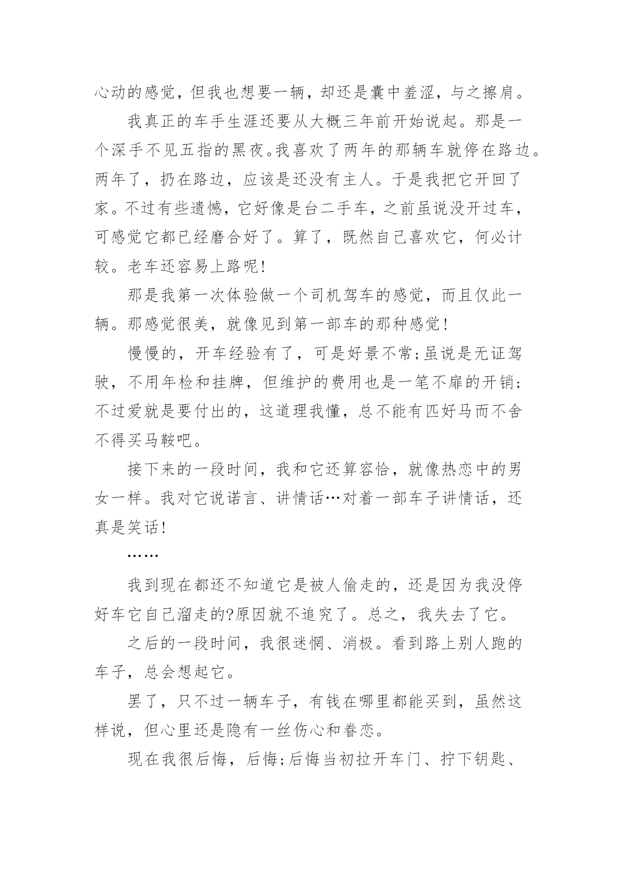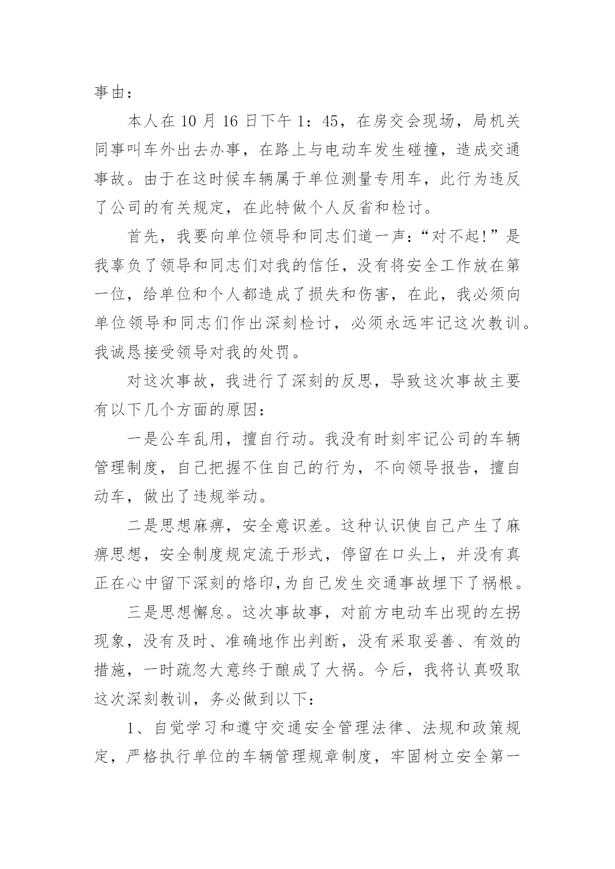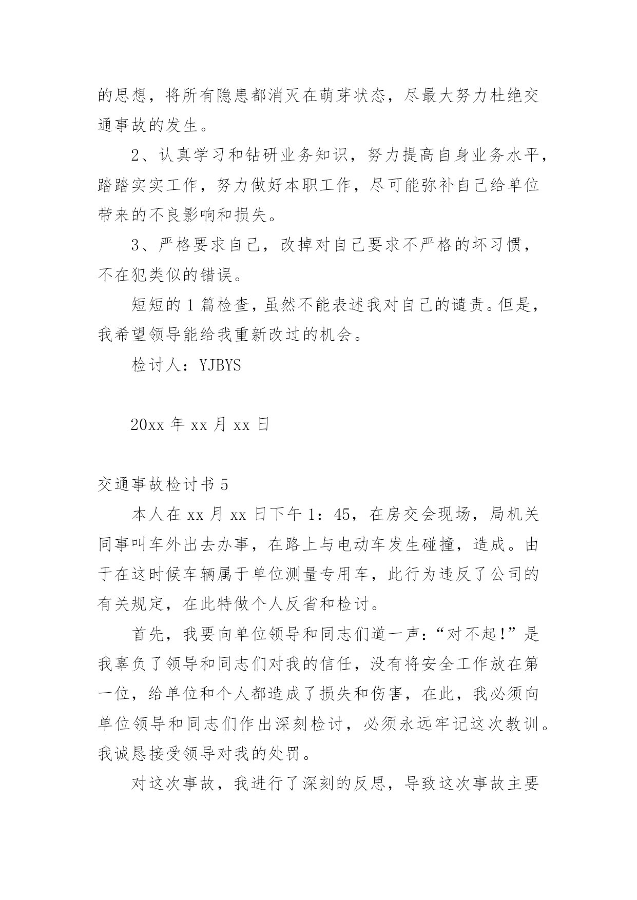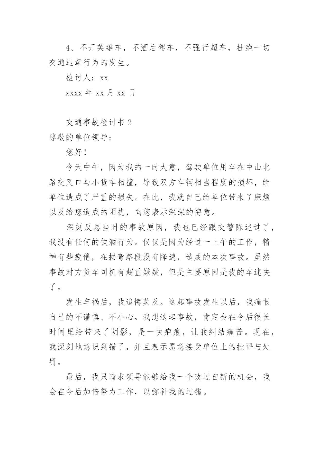 交通事故检讨书交通事故检讨书13篇在某件事出现失误后,为了避免再次出现相同情况,往往被要求写检讨书来自我悔过,写检讨书是为了能够不断提醒自己。什么样的检讨书才是好的检讨书呢?下面是小编整理的交通事故检讨书,欢迎大家借鉴与参考,希望对大家有所帮助。交通事故检讨书1尊敬的xx:我是运输部服务车队驾驶员xxx,于xxxx年xxx月xx日下午xx点xx分驾驶闽C去(xxx厂家)外装途中行驶至xxxx路段,发生交通事故。这次交通事故给对方、同事及自己带来惊吓和不安,同时也给公司造成了一定损失。直到现在我仍然惊魂未定,想起发生事故的一刹那就有种担惊受怕的感觉。经过这几天来的认真反思,深刻自剖,为自己的行为感到了深深地愧疚和不安,在此,我谨向各位公司做出深刻检讨和保证,并将我几天来的思想反思结果向领导汇报如下:1、深刻反省自己,提高事故的认识力。2、努力学习道路交通安全法律法规,遵守交通规则。3、向的公司的老驾驶员虚心学习钻研驾驶技术,提高自身的驾驶操作水平。4、不开英雄车,不酒后驾车,不强行超车,杜绝一切交通违章行为的发生。检讨人:xxxxxx年xx月xx日交通事故检讨书2尊敬的单位领导:您好!今天中午,因为我的一时大意,驾驶单位用车在中山北路交叉口与小货车相撞,导致双方车辆相当程度的损坏,给单位造成了严重的损失。在此,我就自己给单位带来了麻烦以及给您造成的困扰,向您表示深深的悔意。深刻反思当时的事故原因,我也已经跟交警陈述过了,我没有任何的饮酒行为。仅仅是因为经过一上午的工作,精神有些疲倦,在拐弯路段没有降速,造成的本次事故。虽然事故对方货车司机有超重嫌疑,但是主要原因是我的车速快了。发生车祸后,我追悔莫及。这起事故发生以后,我痛恨自己的不谨慎、不小心。我想这起事故,肯定会在今后很长时间里给带来了阴影,是一快疤痕,让我纠结痛苦。现在,我深刻地意识到错了,并且表示愿意接受单位上的批评与处罚。最后,我只请求领导能够给我一个改过自新的机会,我会在今后加倍努力工作,以弥补我的过错。检讨人:XXX20xx年X月X日交通事故检讨书3首先,我错了!虽然在这个社会“无证驾驶”已成为一种潮流,一种时尚,很多人都在乐此不彼地追求,但我还是为自己的行为感到深深的自责。我对不起世界人民,给世界人口问题带来很大隐患,对不起地球,我的所做所为更加剧了地球的环境恶化,对不起整个宇宙空间…对不起我自己和他人的生命,甚至对不起胡同口那位刘大妈她二闺女。那次她要我开车送她上班。我因没证拒绝了她,害她被老板罚去二十块。我将为我的罪过负出我应有的责任。在这里我将认真的、深刻的、反复的、彻底的反省自己所做的一切。我是一名司机,不对,准确地充其量地说我只是个曾经“开过车”的。就像男人和女人即使在一起做了“所有”事儿没有“红本本”也不能称为夫妻一样。虽然我驾车已很有经验,但那还都是“地下工作”。就像男女没有任何手续,总在一起不是件光彩的事儿。记得第一次见到的那部车,我很冲动,心跳的厉害。那线条、那颜色…飘亮,美,所有都是那么完美,完美的无可挑剔。谁奈何它却已明花有主。我虽爱车如命,但绝对不是那种勾且之人。“君子爱财,取之有‘道’。”非盗!谁买辆车都不容易,况且是那么好的车。咱也算是成人之美了。之后也见过几辆差不多的车,虽说没第一辆那么完美和心动的感觉,但我也想要一辆,却还是囊中羞涩,与之擦肩。我真正的车手生涯还要从大概三年前开始说起。那是一个深手不见五指的黑夜。我喜欢了两年的那辆车就停在路边。两年了,扔在路边,应该是还没有主人。于是我把它开回了家。不过有些遗憾,它好像是台二手车,之前虽说没开过车,可感觉它都已经磨合好了。算了,既然自己喜欢它,何必计较。老车还容易上路呢!那是我第一次体验做一个司机驾车的感觉,而且仅此一辆。那感觉很美,就像见到第一部车的那种感觉!慢慢的,开车经验有了,可是好景不常;虽说是无证驾驶,不用年检和挂牌,但维护的费用也是一笔不扉的开销;不过爱就是要付出的,这道理我懂,总不能有匹好马而不舍不得买马鞍吧。接下来的一段时间,我和它还算容恰,就像热恋中的男女一样。我对它说诺言、讲情话…对着一部车子讲情话,还真是笑话!……我到现在都还不知道它是被人偷走的,还是因为我没停好车它自己溜走的?原因就不追究了。总之,我失去了它。之后的一段时间,我很迷惘、消极。看到路上别人跑的车子,总会想起它。罢了,只不过一辆车子,有钱在哪里都能买到,虽然这样说,但心里还是隐有一丝伤心和眷恋。现在我很后悔,后悔;后悔当初拉开车门、拧下钥匙、发动引擎、握起方向盘…,只为当时的一时之乐而失去了驾车在我心里那种憧憬的有些神秘的感觉。我当时应该像对女人一样,让它在我心里保存那种求之若渴的神秘,而我却没有。如果给我重新来一次机会的话,我会对那辆车说:爱你,等到有驾照再开你。现在的年轻人都喜欢刺激,驾车