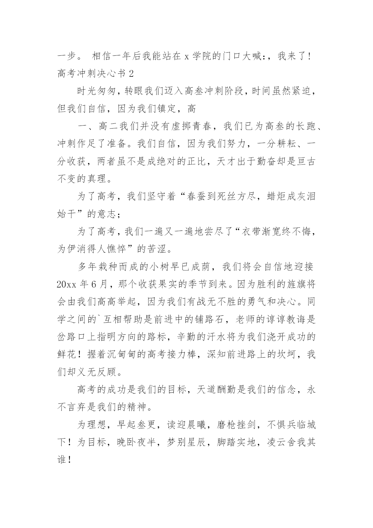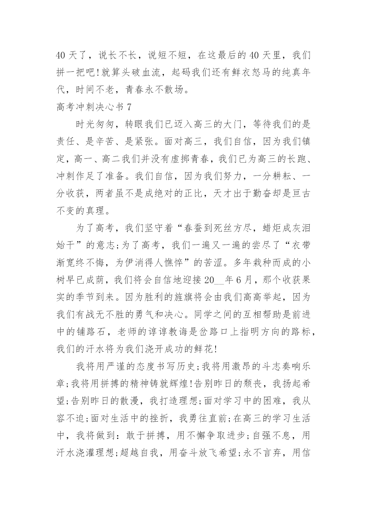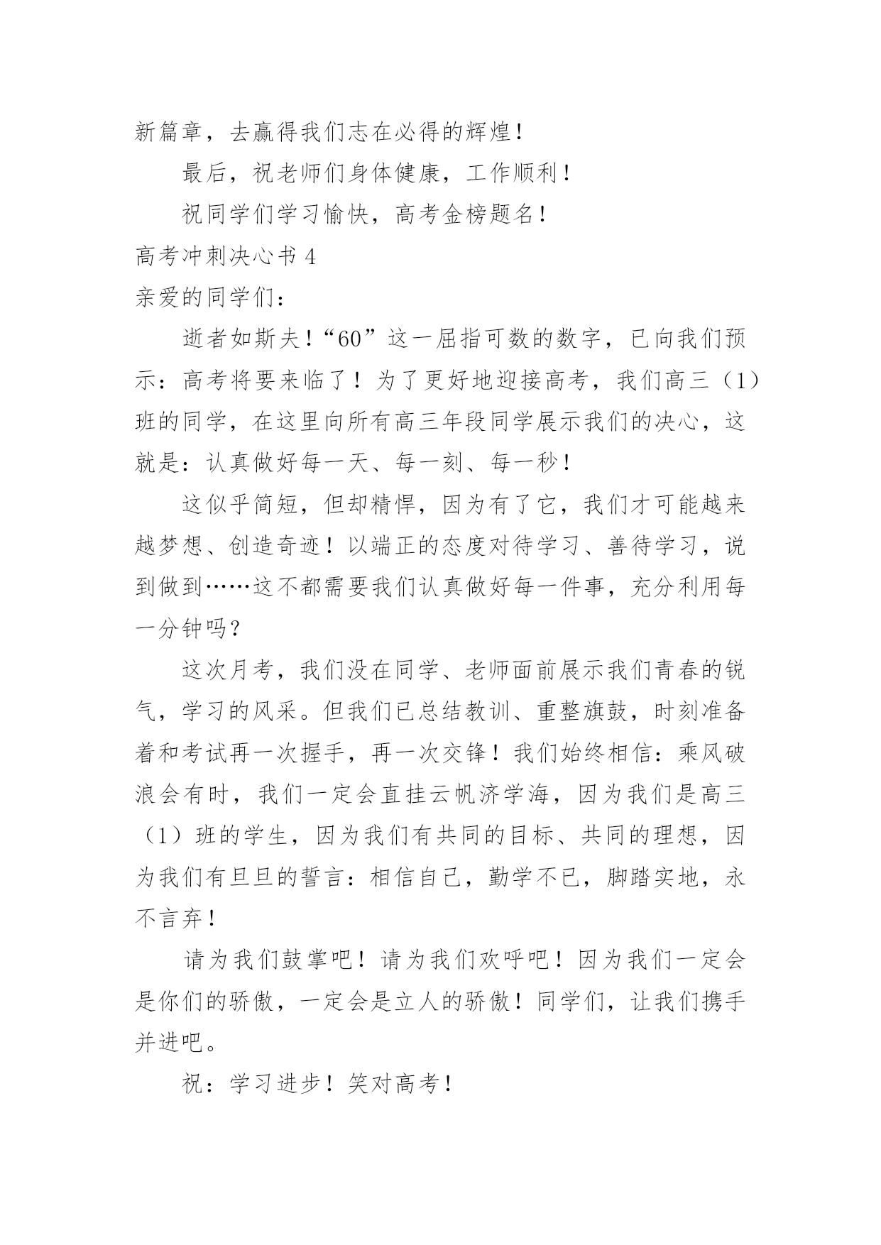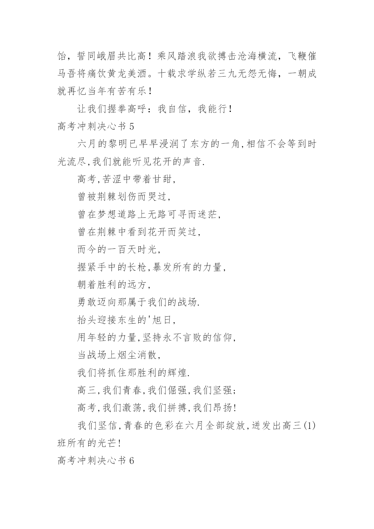 高考冲刺决心书高考冲刺决心书(15篇)高考冲刺决心书1高三的拼搏在此时此刻开始。高三,不同寻常的一年,其实并没有那么久了。高三的到来依旧对我存在一个很大的威胁(睡觉)!这似乎已成为习惯,明知不好却又难以更正。很清楚,自己如果不克服这个问题,学习便难以进步。x学院的信息科学与技术学院便是我的理想,只有自己努力拼搏,付出的比别人多才能离理想更近一步!不成功便成仁!立定一个好的计划,坚持下去,自己知道自己懒惰,所以我所需要的'便是坚持。坚持就是胜利,向着理想以及手提电脑的诱惑前进。尽管现在的成绩还有距离,不过付出便有回报。不管结果如何不后悔就行,至少自己付出过努力!数学、英语不知如何是好,数学加减乘除都有困难。这两科是一早就放弃了的科目。现在要重新拾起真的很难。不过这次会尽力,对数学和英语提起兴趣,尽管有点晚,但至少会吸取到知识。文科便是多背,每天立个目标,一小步完成到高考便是一大步!1%运气+99%汗水=100%成功克服最大的困难(睡觉)。一切从现在改变,用尽方法也要克服,最大的敌人就是自己。知道了缺点便要使尽全力去改正,尽管路程很艰难。高三克服了睡觉那便是迈出的关键一步。相信一年后我能站在x学院的门口大喊:,我来了!高考冲刺决心书2时光匆匆,转眼我们迈入高叁冲刺阶段,时间虽然紧迫,但我们自信,因为我们镇定,高一、高二我们并没有虚掷青春,我们已为高叁的长跑、冲刺作足了准备。我们自信,因为我们努力,一分耕耘、一分收获,两者虽不是成绝对的正比,天才出于勤奋却是亘古不变的真理。为了高考,我们坚守着“春蚕到死丝方尽,蜡炬成灰泪始干”的意志;为了高考,我们一遍又一遍地尝尽了“衣带渐宽终不悔,为伊消得人憔悴”的苦涩。多年栽种而成的小树早已成荫,我们将会自信地迎接20xx年6月,那个收获果实的季节到来。因为胜利的旌旗将会由我们高高举起,因为我们有战无不胜的勇气和决心。同学之间的`互相帮助是前进中的铺路石,老师的谆谆教诲是岔路口上指明方向的路标,辛勤的汗水将为我们浇开成功的鲜花!握着沉甸甸的高考接力棒,深知前进路上的坎坷,我们却义无反顾。高考的成功是我们的目标,天道酬勤是我们的信念,永不言弃是我们的精神。为理想,早起叁更,读迎晨曦,磨枪挫剑,不惧兵临城下!为目标,晚卧夜半,梦别星辰,脚踏实地,凌云舍我其谁!在这神圣的时刻,我们以青春的名义宣誓:不负父母的期盼,不负老师的厚望,不负青春的理想!我们承诺:我将用严谨的态度书写历史;我将用激昂的斗志奏响乐章;我将用拼搏的精神铸就辉煌!告别昨日的颓丧,我扬起希望;告别昨日的散漫,我打造理想;面对学习中的困难,我从容不迫;面对生活中的挫折,我勇往直前;在高叁的学习生活中,我将做到:敢于拼搏,用不懈争取进步;自强不息,用汗水浇灌理想;超越自我,用奋斗放飞希望;永不言弃,用信念实现梦想。让青春绽放最美丽的光芒!高考冲刺决心书3亲爱的老师们、同学们,今天是一个特殊的日子,一百天后,我们将步入高考考场,书写我们十几年来寒窗苦读准备的试卷;今天是一个充满希望和挑战的日子,因为战场的硝烟已经弥漫,决战冲锋的号角已经吹响。让我们扬起自信的风帆,亮出勇者的宝剑,奋战百日;以有限的时间挑战内在的潜能,以不懈的努力铸就无悔的青春!在仅剩的100天里,我一定做到:一、瞄准目标,坚定信念。不言败,不言弃,不达目的.决不罢休,时刻保持最佳的竞技状态。二、刻苦学习,分秒必争。上课不分神,课后不分心,作业不抄袭,考试不作弊,不打被动战,不放弃任何一个疑难知识点,认真对待每一堂课、每一次考试与练习,努力提高复习的效率与效果。三、严守纪律,心无旁骛。不迟到,不早退,不谈恋爱,不进网吧,不使用手机、mp4等通讯娱乐工具,不看与学习无关的书,不滥交朋友,不与社会上不三不四的人来往,保证全身心地投入到学习中去。四、劳逸结合,精力充沛。确保午睡、晚就寝睡眠质量,不打疲劳战,不低效学习,保证良好的身体素质,保持旺盛的学习精力。五、精诚团结,和谐竞争。不为小事斤斤计较,不拉帮结派,不说三道四,互帮互助,携手共进,共同创设浓烈的学习氛围,保证最佳的学习情绪和最优的学习环境。六、调整心态,心如止水。能坦然面对过程中的成功与失败,胜不骄,败不馁,只为高考的最后胜利。我一定会以最刻苦的精神,最坚韧的毅力,最饱满的热情,最昂扬的斗志,勤奋苦读,珍惜分秒,勇于拼搏,敢于竞争。不到最后一刻,绝不放弃希望,绝不放弃努力!我将诚信做人,履行诺言,请老师们、同学们监督我,帮助我。我相信所有高三的同学都应也都能能做到这些,因为只有这样,我们才能梦圆高考,铸就辉煌。所以我提议,大家跟我在这一同承诺:明确心中目标,刻苦守纪拼搏,把握最后分秒,携手共创辉煌!亲爱的同学们,十年寒窗苦读,百日决战在即。让我们向着理想和目标发出勇猛的呐喊,以傲视群雄的信心投入到高考的竞争中,以百分
