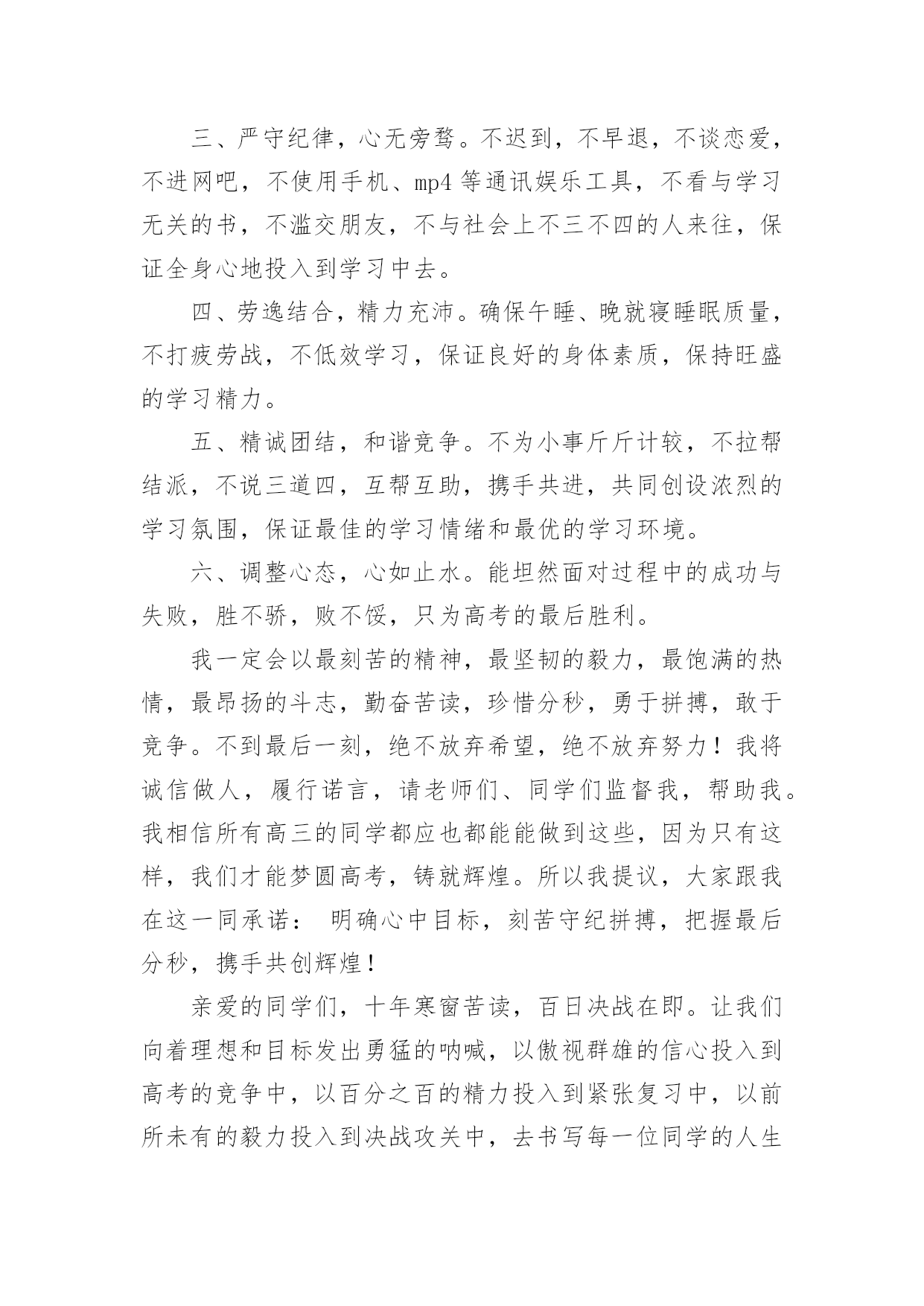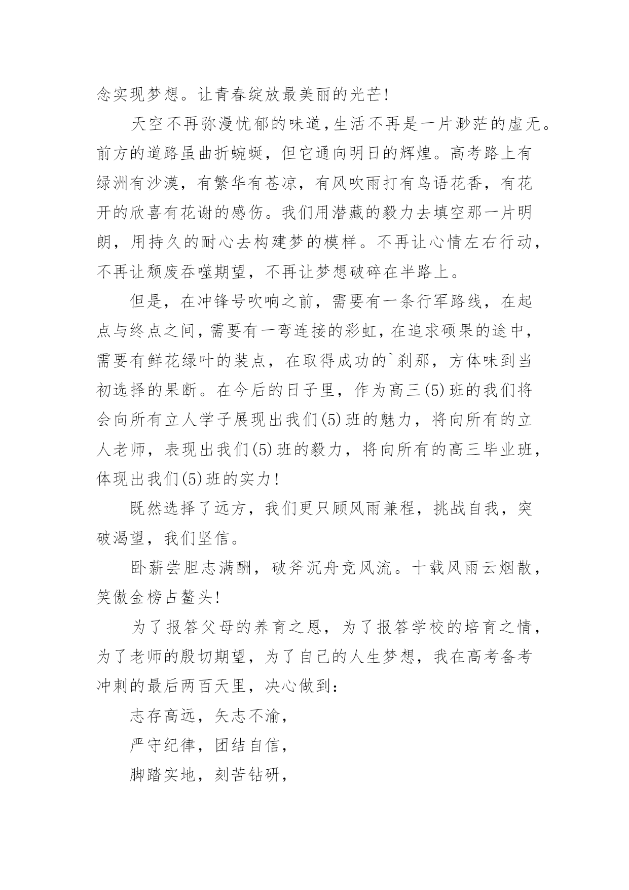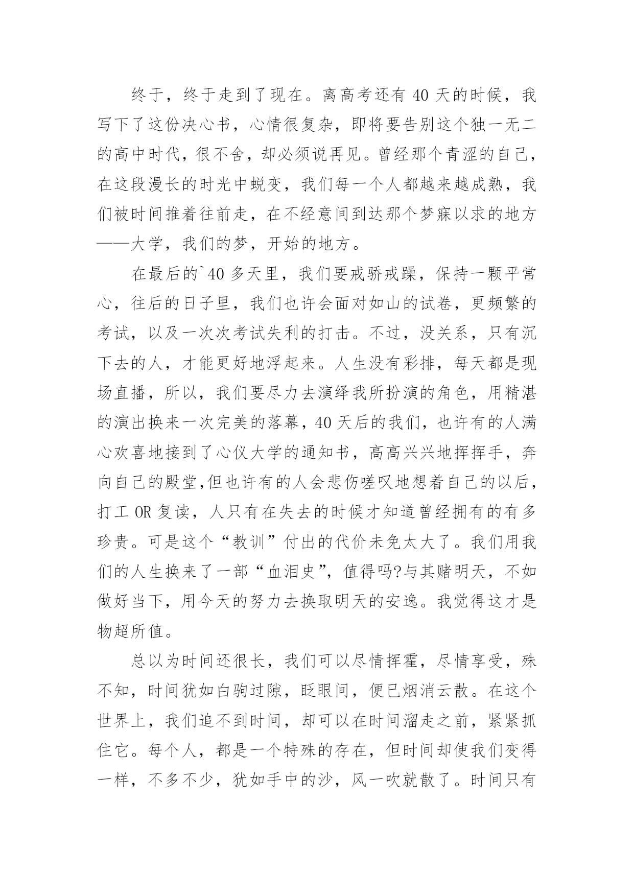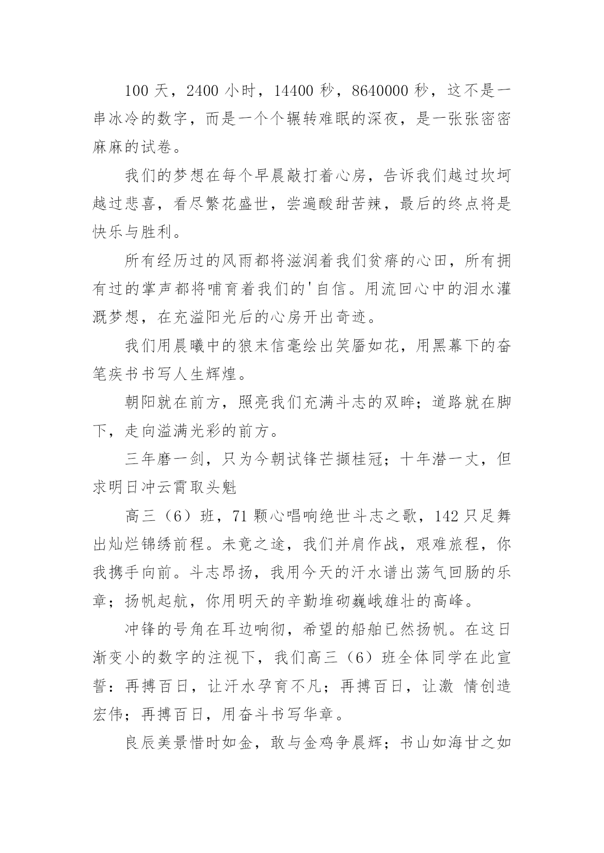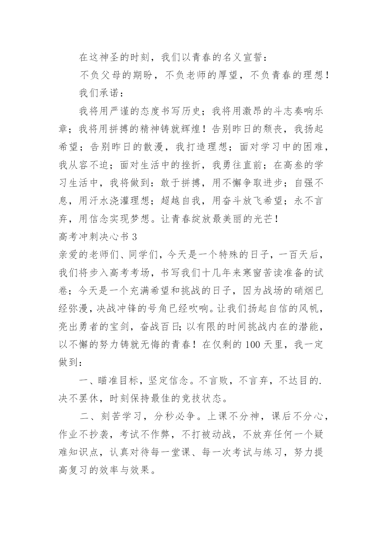 高考冲刺决心书高考冲刺决心书(15篇)高考冲刺决心书1高三的拼搏在此时此刻开始。高三,不同寻常的一年,其实并没有那么久了。高三的到来依旧对我存在一个很大的威胁(睡觉)!这似乎已成为习惯,明知不好却又难以更正。很清楚,自己如果不克服这个问题,学习便难以进步。x学院的信息科学与技术学院便是我的理想,只有自己努力拼搏,付出的比别人多才能离理想更近一步!不成功便成仁!立定一个好的计划,坚持下去,自己知道自己懒惰,所以我所需要的'便是坚持。坚持就是胜利,向着理想以及手提电脑的诱惑前进。尽管现在的成绩还有距离,不过付出便有回报。不管结果如何不后悔就行,至少自己付出过努力!数学、英语不知如何是好,数学加减乘除都有困难。这两科是一早就放弃了的科目。现在要重新拾起真的很难。不过这次会尽力,对数学和英语提起兴趣,尽管有点晚,但至少会吸取到知识。文科便是多背,每天立个目标,一小步完成到高考便是一大步!1%运气+99%汗水=100%成功克服最大的困难(睡觉)。一切从现在改变,用尽方法也要克服,最大的敌人就是自己。知道了缺点便要使尽全力去改正,尽管路程很艰难。高三克服了睡觉那便是迈出的关键一步。相信一年后我能站在x学院的门口大喊:,我来了!高考冲刺决心书2时光匆匆,转眼我们迈入高叁冲刺阶段,时间虽然紧迫,但我们自信,因为我们镇定,高一、高二我们并没有虚掷青春,我们已为高叁的长跑、冲刺作足了准备。我们自信,因为我们努力,一分耕耘、一分收获,两者虽不是成绝对的正比,天才出于勤奋却是亘古不变的真理。为了高考,我们坚守着“春蚕到死丝方尽,蜡炬成灰泪始干”的意志;为了高考,我们一遍又一遍地尝尽了“衣带渐宽终不悔,为伊消得人憔悴”的苦涩。多年栽种而成的小树早已成荫,我们将会自信地迎接20xx年6月,那个收获果实的季节到来。因为胜利的旌旗将会由我们高高举起,因为我们有战无不胜的勇气和决心。同学之间的`互相帮助是前进中的铺路石,老师的谆谆教诲是岔路口上指明方向的路标,辛勤的汗水将为我们浇开成功的鲜花!握着沉甸甸的高考接力棒,深知前进路上的坎坷,我们却义无反顾。高考的成功是我们的目标,天道酬勤是我们的信念,永不言弃是我们的精神。为理想,早起叁更,读迎晨曦,磨枪挫剑,不惧兵临城下!为目标,晚卧夜半,梦别星辰,脚踏实地,凌云舍我其谁!在这神圣的时刻,我们以青春的名义宣誓:不负父母的期盼,不负老师的厚望,不负青春的理想!我们承诺:我将用严谨的态度书写历史;我将用激昂的斗志奏响乐章;我将用拼搏的精神铸就辉煌!告别昨日的颓丧,我扬起希望;告别昨日的散漫,我打造理想;面对学习中的困难,我从容不迫;面对生活中的挫折,我勇往直前;在高叁的学习生活中,我将做到:敢于拼搏,用不懈争取进步;自强不息,用汗水浇灌理想;超越自我,用奋斗放飞希望;永不言弃,用信念实现梦想。让青春绽放最美丽的光芒!高考冲刺决心书3亲爱的老师们、同学们,今天是一个特殊的日子,一百天后,我们将步入高考考场,书写我们十几年来寒窗苦读准备的试卷;今天是一个充满希望和挑战的日子,因为战场的硝烟已经弥漫,决战冲锋的号角已经吹响。让我们扬起自信的风帆,亮出勇者的宝剑,奋战百日;以有限的时间挑战内在的潜能,以不懈的努力铸就无悔的青春!在仅剩的100天里,我一定做到:一、瞄准目标,坚定信念。不言败,不言弃,不达目的.决不罢休,时刻保持最佳的竞技状态。二、刻苦学习,分秒必争。上课不分神,课后不分心,作业不抄袭,考试不作弊,不打被动战,不放弃任何一个疑难知识点,认真对待每一堂课、每一次考试与练习,努力提高复习的效率与效果。三、严守纪律,心无旁骛。不迟到,不早退,不谈恋爱,不进网吧,不使用手机、mp4等通讯娱乐工具,不看与学习无关的书,不滥交朋友,不与社会上不三不四的人来往,保证全身心地投入到学习中去。四、劳逸结合,精力充沛。确保午睡、晚就寝睡眠质量,不打疲劳战,不低效学习,保证良好的身体素质,保持旺盛的学习精力。五、精诚团结,和谐竞争。不为小事斤斤计较,不拉帮结派,不说三道四,互帮互助,携手共进,共同创设浓烈的学习氛围,保证最佳的学习情绪和最优的学习环境。六、调整心态,心如止水。能坦然面对过程中的成功与失败,胜不骄,败不馁,只为高考的最后胜利。我一定会以最刻苦的精神,最坚韧的毅力,最饱满的热情,最昂扬的斗志,勤奋苦读,珍惜分秒,勇于拼搏,敢于竞争。不到最后一刻,绝不放弃希望,绝不放弃努力!我将诚信做人,履行诺言,请老师们、同学们监督我,帮助我。我相信所有高三的同学都应也都能能做到这些,因为只有这样,我们才能梦圆高考,铸就辉煌。所以我提议,大家跟我在这一同承诺:明确心中目标,刻苦守纪拼搏,把握最后分秒,携手共创辉煌!亲爱的同学们,十年寒窗苦读,百日决战在即。让我们向着理想和目标发出勇猛的呐喊,以傲视群雄的信心投入到高考的竞争中,以百分