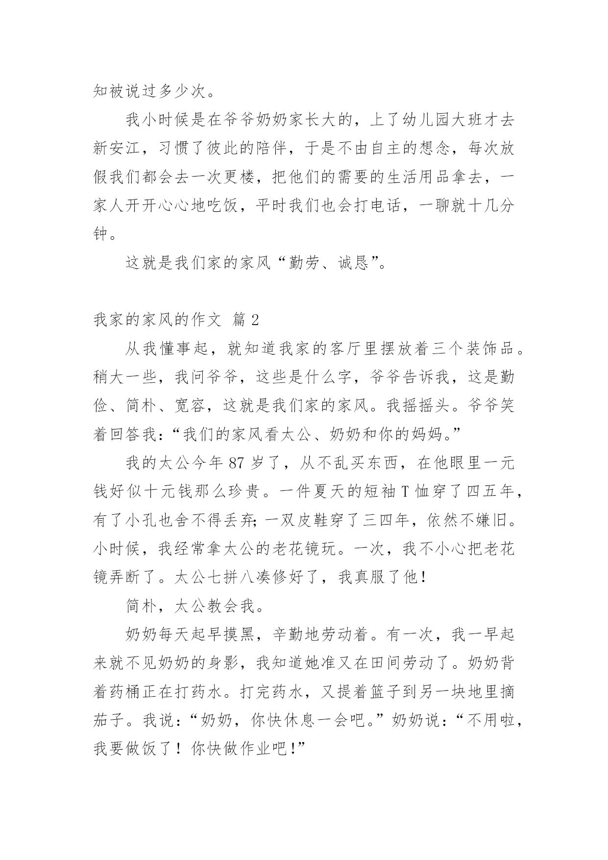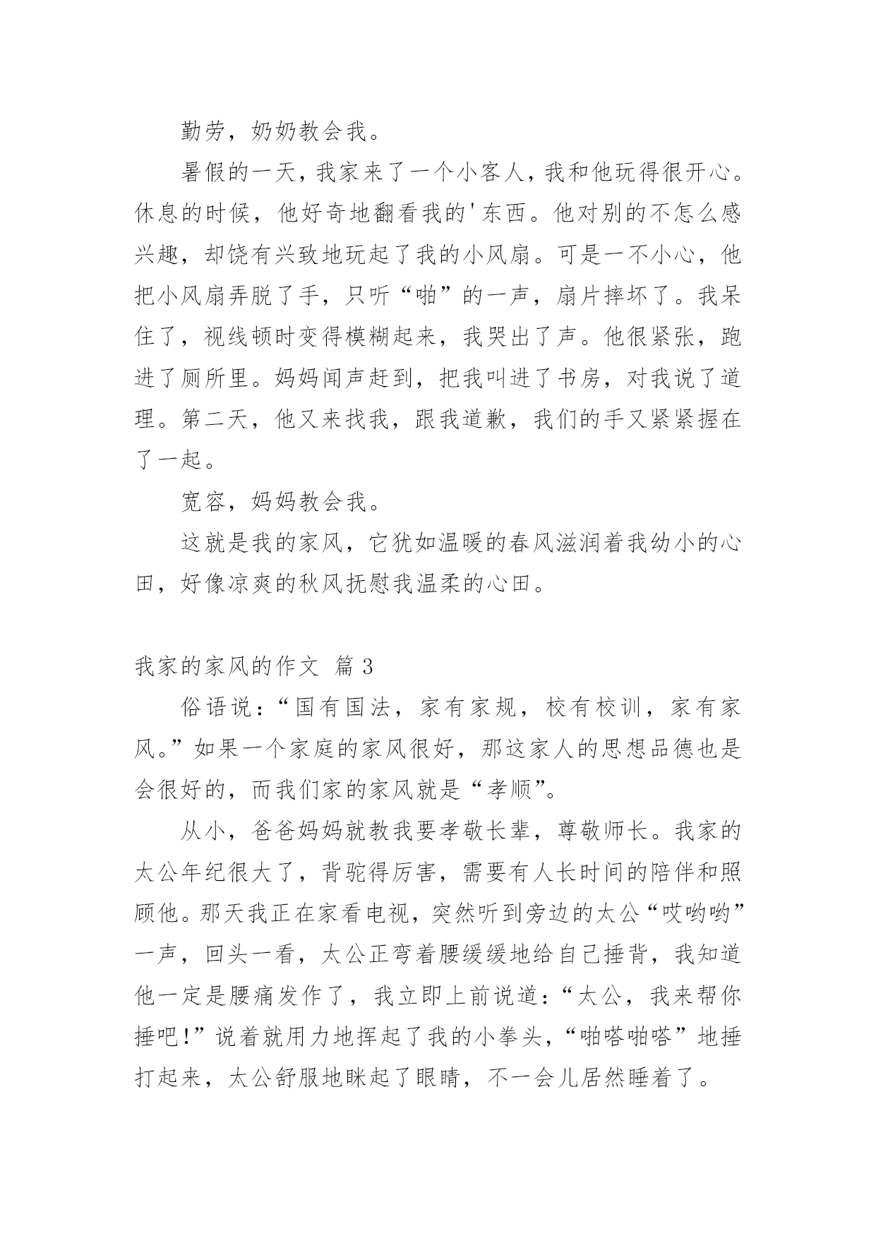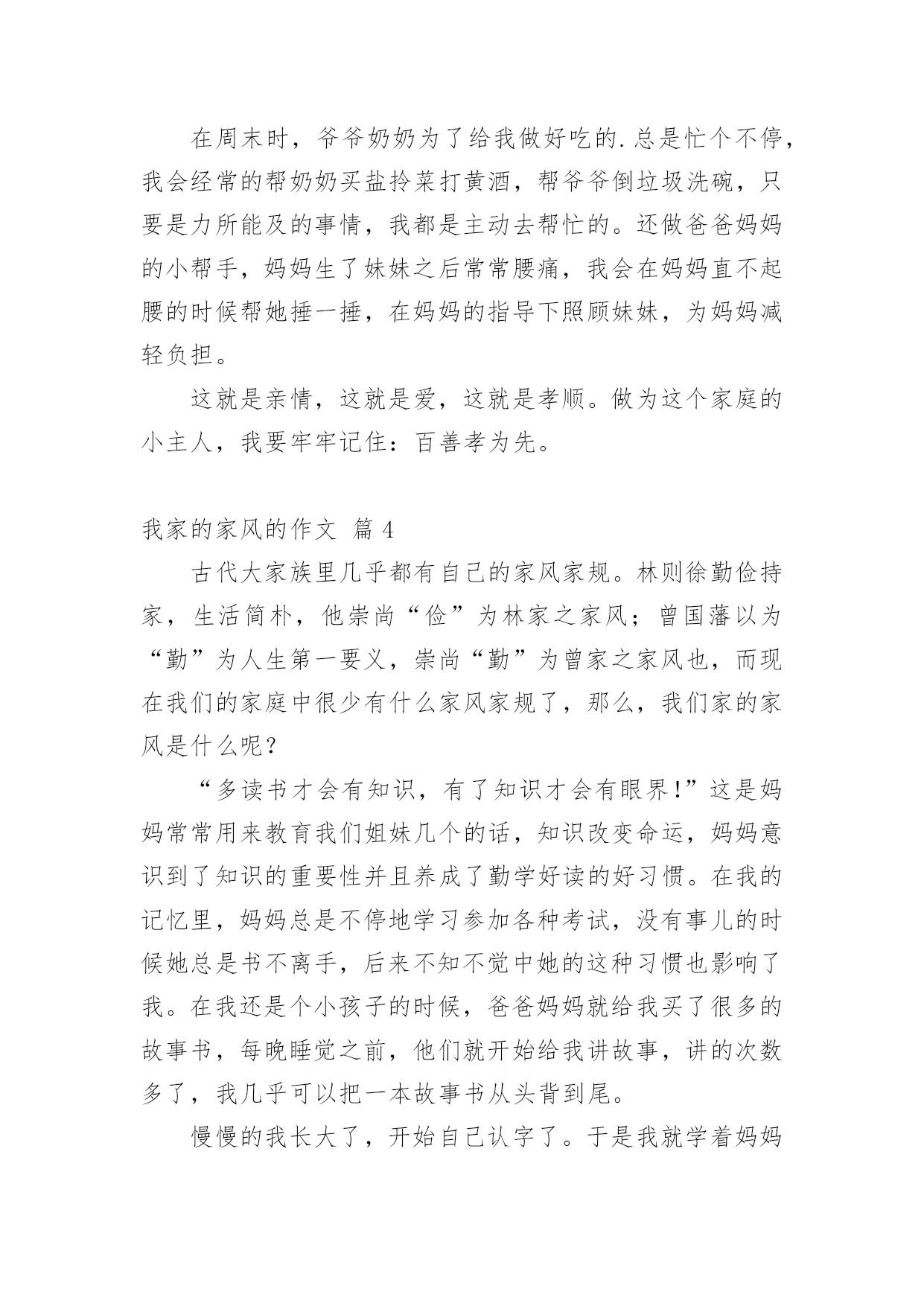 我家的家风的作文我家的家风的作文精选5篇在日常学习、工作抑或是生活中,大家都不可避免地会接触到作文吧,作文是由文字组成,经过人的思想考虑,通过语言组织来表达一个主题意义的文体。你写作文时总是无从下笔?以下是小编为大家整理的我家的家风的作文5篇,欢迎阅读,希望大家能够喜欢。我家的家风的作文篇1俗话说“无规矩不成方圆”,在父母的叮咛,长辈的唠叨下,我渐渐地养成了一种行为习惯,这就是所谓的家风吧!我爷爷是一个非常勤劳、老实的人,以前家,必须要有干燥易烧的柴火,家里的大人都有很多活儿要做,顾不上砍柴、做饭。所以,这个活就交给予我爷爷,每次回家,都要先爬上山,那时候不有上山的`台阶,找一些干净,干燥的木条,砍下来,背到家里去。长大以后,由于太爷爷很早过世的缘故,爷爷被迫开始工作。他做过的事可多了,从砍柴开始,先是油漆匠然后是木匠,拖拉机手,当过工人,管过生产,还差点成了厂长。现在他已经七十多岁了,可还是每天六点多起床,拖地、扫地、整理家具。爷爷奶奶对自己家里人有严格的要求,时常要求我们要守规矩,比如要一家人到齐了才开始吃饭,我们也时不时“偷吃”点,可免不了被骂,爷爷也一样,吸烟和打麻将不知被说过多少次。我小时候是在爷爷奶奶家长大的,上了幼儿园大班才去新安江,习惯了彼此的陪伴,于是不由自主的想念,每次放假我们都会去一次更楼,把他们的需要的生活用品拿去,一家人开开心心地吃饭,平时我们也会打电话,一聊就十几分钟。这就是我们家的家风“勤劳、诚恳”。我家的家风的作文篇2从我懂事起,就知道我家的客厅里摆放着三个装饰品。稍大一些,我问爷爷,这些是什么字,爷爷告诉我,这是勤俭、简朴、宽容,这就是我们家的家风。我摇摇头。爷爷笑着回答我:“我们的家风看太公、奶奶和你的妈妈。”我的太公今年87岁了,从不乱买东西,在他眼里一元钱好似十元钱那么珍贵。一件夏天的短袖T恤穿了四五年,有了小孔也舍不得丢弃;一双皮鞋穿了三四年,依然不嫌旧。小时候,我经常拿太公的老花镜玩。一次,我不小心把老花镜弄断了。太公七拼八凑修好了,我真服了他!简朴,太公教会我。奶奶每天起早摸黑,辛勤地劳动着。有一次,我一早起来就不见奶奶的身影,我知道她准又在田间劳动了。奶奶背着药桶正在打药水。打完药水,又提着篮子到另一块地里摘茄子。我说:“奶奶,你快休息一会吧。”奶奶说:“不用啦,我要做饭了!你快做作业吧!”勤劳,奶奶教会我。暑假的一天,我家来了一个小客人,我和他玩得很开心。休息的时候,他好奇地翻看我的'东西。他对别的不怎么感兴趣,却饶有兴致地玩起了我的小风扇。可是一不小心,他把小风扇弄脱了手,只听“啪”的一声,扇片摔坏了。我呆住了,视线顿时变得模糊起来,我哭出了声。他很紧张,跑进了厕所里。妈妈闻声赶到,把我叫进了书房,对我说了道理。第二天,他又来找我,跟我道歉,我们的手又紧紧握在了一起。宽容,妈妈教会我。这就是我的家风,它犹如温暖的春风滋润着我幼小的心田,好像凉爽的秋风抚慰我温柔的心田。我家的家风的作文篇3俗语说:“国有国法,家有家规,校有校训,家有家风。”如果一个家庭的家风很好,那这家人的思想品德也是会很好的,而我们家的家风就是“孝顺”。从小,爸爸妈妈就教我要孝敬长辈,尊敬师长。我家的太公年纪很大了,背驼得厉害,需要有人长时间的陪伴和照顾他。那天我正在家看电视,突然听到旁边的太公“哎哟哟”一声,回头一看,太公正弯着腰缓缓地给自己捶背,我知道他一定是腰痛发作了,我立即上前说道:“太公,我来帮你捶吧!”说着就用力地挥起了我的小拳头,“啪嗒啪嗒”地捶打起来,太公舒服地眯起了眼睛,不一会儿居然睡着了。在周末时,爷爷奶奶为了给我做好吃的.总是忙个不停,我会经常的帮奶奶买盐拎菜打黄酒,帮爷爷倒垃圾洗碗,只要是力所能及的事情,我都是主动去帮忙的。还做爸爸妈妈的小帮手,妈妈生了妹妹之后常常腰痛,我会在妈妈直不起腰的时候帮她捶一捶,在妈妈的指导下照顾妹妹,为妈妈减轻负担。这就是亲情,这就是爱,这就是孝顺。做为这个家庭的小主人,我要牢牢记住:百善孝为先。我家的家风的作文篇4古代大家族里几乎都有自己的家风家规。林则徐勤俭持家,生活简朴,他崇尚“俭”为林家之家风;曾国藩以为“勤”为人生第一要义,崇尚“勤”为曾家之家风也,而现在我们的家庭中很少有什么家风家规了,那么,我们家的家风是什么呢?“多读书才会有知识,有了知识才会有眼界!”这是妈妈常常用来教育我们姐妹几个的话,知识改变命运,妈妈意识到了知识的重要性并且养成了勤学好读的好习惯。在我的记忆里,妈妈总是不停地学习参加各种考试,没有事儿的时候她总是书不离手,后来不知不觉中她的这种习惯也影响了我。在我还是个小孩子的时候,爸爸妈妈就给我买了很多的故事书,每晚睡觉之前,他们就开始给我讲故事,讲的次数多了,我几乎可以把一本故事书从头背到尾。慢慢的我长大了,开始自己认字了。于