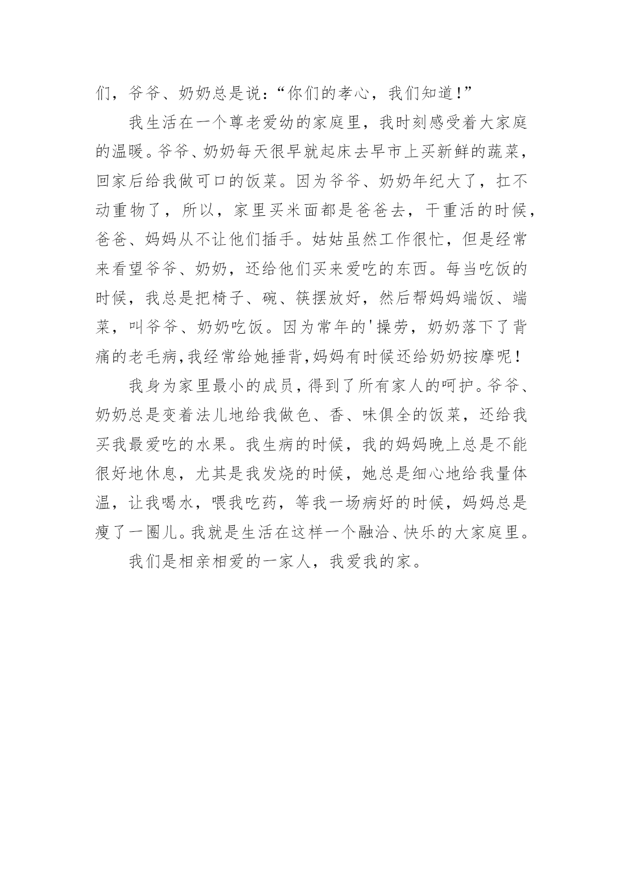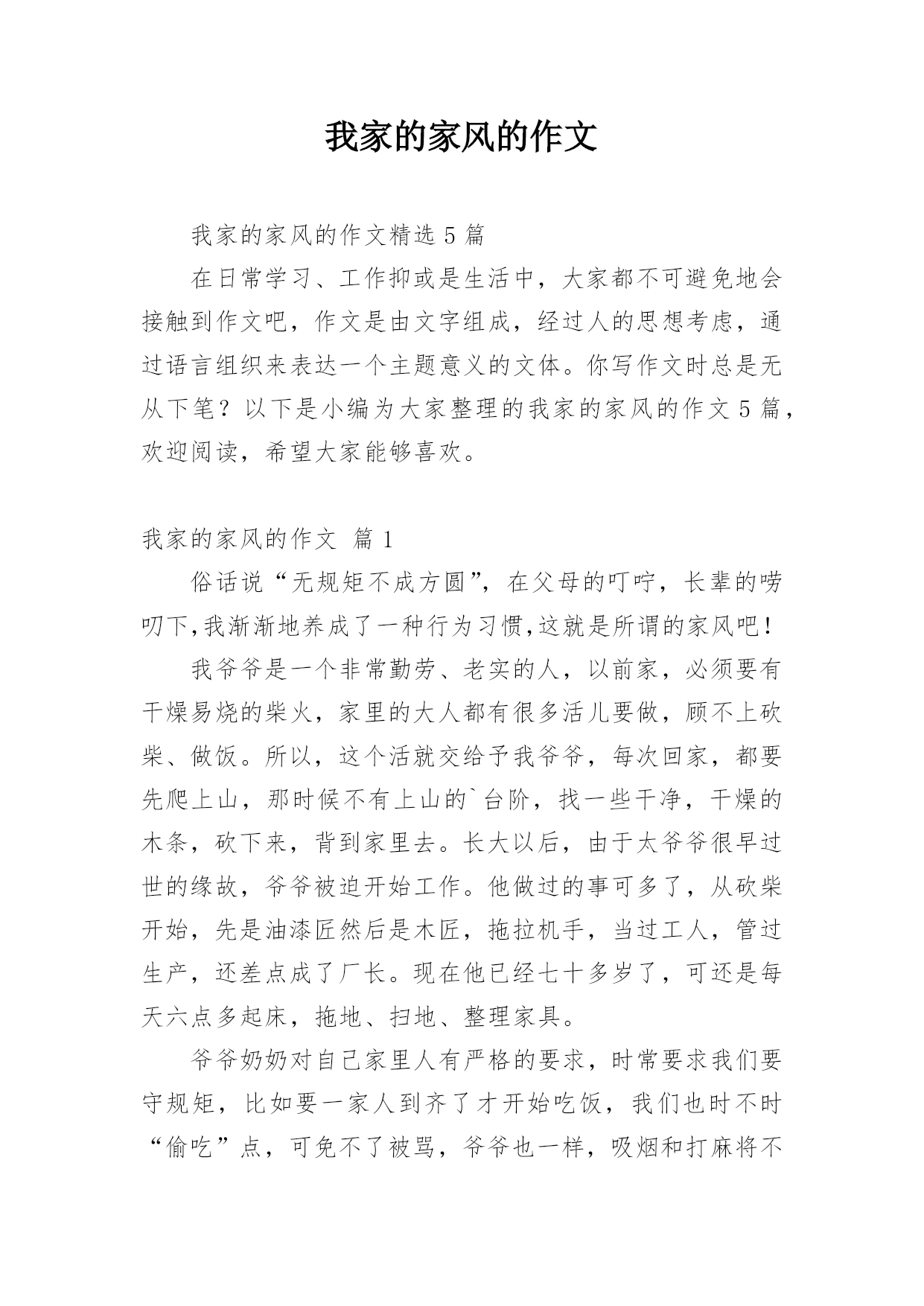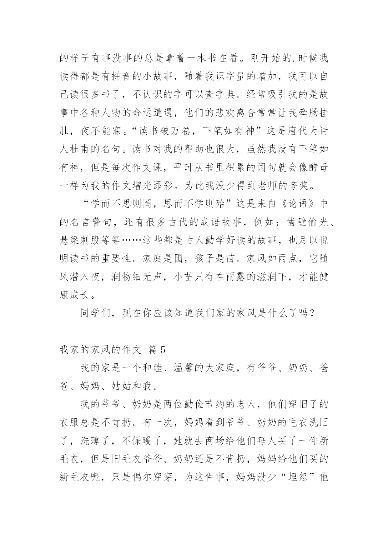 我家的家风的作文我家的家风的作文精选5篇在日常学习、工作抑或是生活中,大家都不可避免地会接触到作文吧,作文是由文字组成,经过人的思想考虑,通过语言组织来表达一个主题意义的文体。你写作文时总是无从下笔?以下是小编为大家整理的我家的家风的作文5篇,欢迎阅读,希望大家能够喜欢。我家的家风的作文篇1俗话说“无规矩不成方圆”,在父母的叮咛,长辈的唠叨下,我渐渐地养成了一种行为习惯,这就是所谓的家风吧!我爷爷是一个非常勤劳、老实的人,以前家,必须要有干燥易烧的柴火,家里的大人都有很多活儿要做,顾不上砍柴、做饭。所以,这个活就交给予我爷爷,每次回家,都要先爬上山,那时候不有上山的`台阶,找一些干净,干燥的木条,砍下来,背到家里去。长大以后,由于太爷爷很早过世的缘故,爷爷被迫开始工作。他做过的事可多了,从砍柴开始,先是油漆匠然后是木匠,拖拉机手,当过工人,管过生产,还差点成了厂长。现在他已经七十多岁了,可还是每天六点多起床,拖地、扫地、整理家具。爷爷奶奶对自己家里人有严格的要求,时常要求我们要守规矩,比如要一家人到齐了才开始吃饭,我们也时不时“偷吃”点,可免不了被骂,爷爷也一样,吸烟和打麻将不知被说过多少次。我小时候是在爷爷奶奶家长大的,上了幼儿园大班才去新安江,习惯了彼此的陪伴,于是不由自主的想念,每次放假我们都会去一次更楼,把他们的需要的生活用品拿去,一家人开开心心地吃饭,平时我们也会打电话,一聊就十几分钟。这就是我们家的家风“勤劳、诚恳”。我家的家风的作文篇2从我懂事起,就知道我家的客厅里摆放着三个装饰品。稍大一些,我问爷爷,这些是什么字,爷爷告诉我,这是勤俭、简朴、宽容,这就是我们家的家风。我摇摇头。爷爷笑着回答我:“我们的家风看太公、奶奶和你的妈妈。”我的太公今年87岁了,从不乱买东西,在他眼里一元钱好似十元钱那么珍贵。一件夏天的短袖T恤穿了四五年,有了小孔也舍不得丢弃;一双皮鞋穿了三四年,依然不嫌旧。小时候,我经常拿太公的老花镜玩。一次,我不小心把老花镜弄断了。太公七拼八凑修好了,我真服了他!简朴,太公教会我。奶奶每天起早摸黑,辛勤地劳动着。有一次,我一早起来就不见奶奶的身影,我知道她准又在田间劳动了。奶奶背着药桶正在打药水。打完药水,又提着篮子到另一块地里摘茄子。我说:“奶奶,你快休息一会吧。”奶奶说:“不用啦,我要做饭了!你快做作业吧!”勤劳,奶奶教会我。暑假的一天,我家来了一个小客人,我和他玩得很开心。休息的时候,他好奇地翻看我的'东西。他对别的不怎么感兴趣,却饶有兴致地玩起了我的小风扇。可是一不小心,他把小风扇弄脱了手,只听“啪”的一声,扇片摔坏了。我呆住了,视线顿时变得模糊起来,我哭出了声。他很紧张,跑进了厕所里。妈妈闻声赶到,把我叫进了书房,对我说了道理。第二天,他又来找我,跟我道歉,我们的手又紧紧握在了一起。宽容,妈妈教会我。这就是我的家风,它犹如温暖的春风滋润着我幼小的心田,好像凉爽的秋风抚慰我温柔的心田。我家的家风的作文篇3俗语说:“国有国法,家有家规,校有校训,家有家风。”如果一个家庭的家风很好,那这家人的思想品德也是会很好的,而我们家的家风就是“孝顺”。从小,爸爸妈妈就教我要孝敬长辈,尊敬师长。我家的太公年纪很大了,背驼得厉害,需要有人长时间的陪伴和照顾他。那天我正在家看电视,突然听到旁边的太公“哎哟哟”一声,回头一看,太公正弯着腰缓缓地给自己捶背,我知道他一定是腰痛发作了,我立即上前说道:“太公,我来帮你捶吧!”说着就用力地挥起了我的小拳头,“啪嗒啪嗒”地捶打起来,太公舒服地眯起了眼睛,不一会儿居然睡着了。在周末时,爷爷奶奶为了给我做好吃的.总是忙个不停,我会经常的帮奶奶买盐拎菜打黄酒,帮爷爷倒垃圾洗碗,只要是力所能及的事情,我都是主动去帮忙的。还做爸爸妈妈的小帮手,妈妈生了妹妹之后常常腰痛,我会在妈妈直不起腰的时候帮她捶一捶,在妈妈的指导下照顾妹妹,为妈妈减轻负担。这就是亲情,这就是爱,这就是孝顺。做为这个家庭的小主人,我要牢牢记住:百善孝为先。我家的家风的作文篇4古代大家族里几乎都有自己的家风家规。林则徐勤俭持家,生活简朴,他崇尚“俭”为林家之家风;曾国藩以为“勤”为人生第一要义,崇尚“勤”为曾家之家风也,而现在我们的家庭中很少有什么家风家规了,那么,我们家的家风是什么呢?“多读书才会有知识,有了知识才会有眼界!”这是妈妈常常用来教育我们姐妹几个的话,知识改变命运,妈妈意识到了知识的重要性并且养成了勤学好读的好习惯。在我的记忆里,妈妈总是不停地学习参加各种考试,没有事儿的时候她总是书不离手,后来不知不觉中她的这种习惯也影响了我。在我还是个小孩子的时候,爸爸妈妈就给我买了很多的故事书,每晚睡觉之前,他们就开始给我讲故事,讲的次数多了,我几乎可以把一本故事书从头背到尾。慢慢的我长大了,开始自己认字了。于