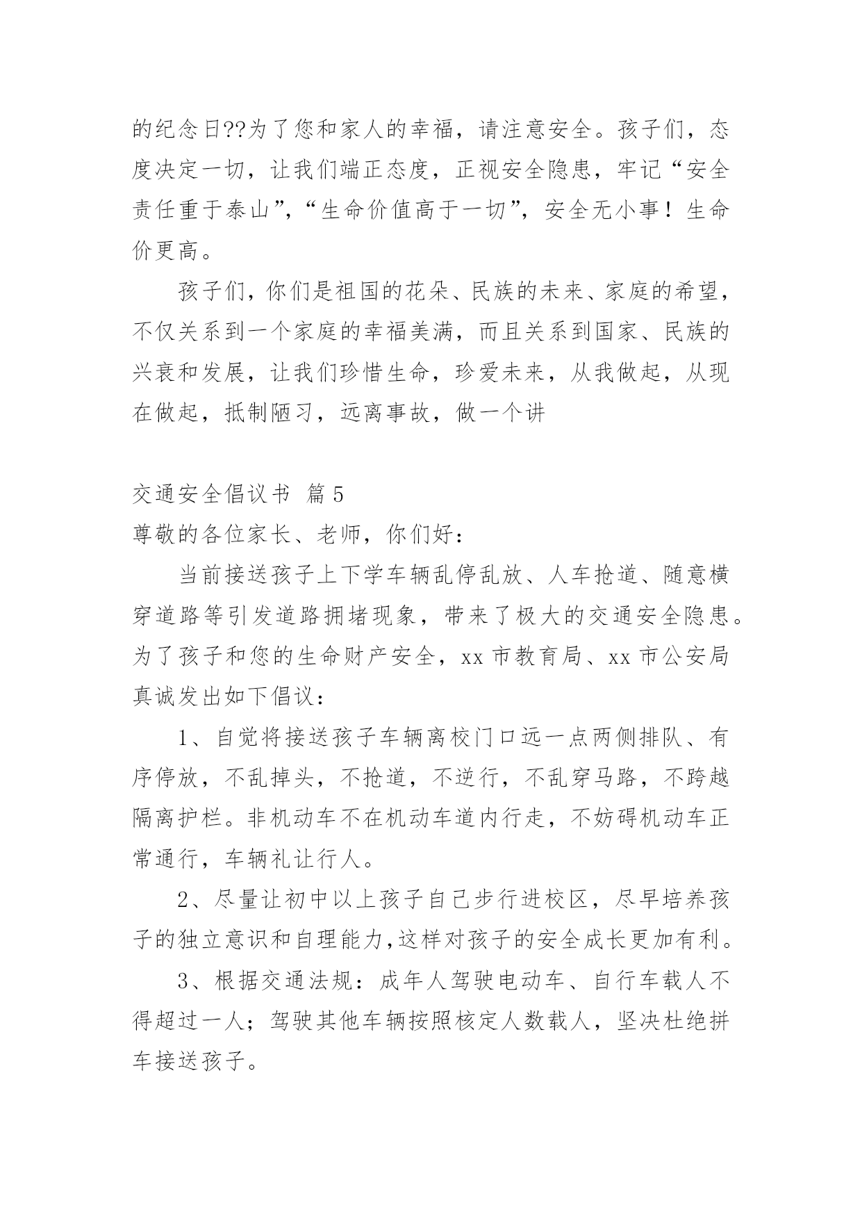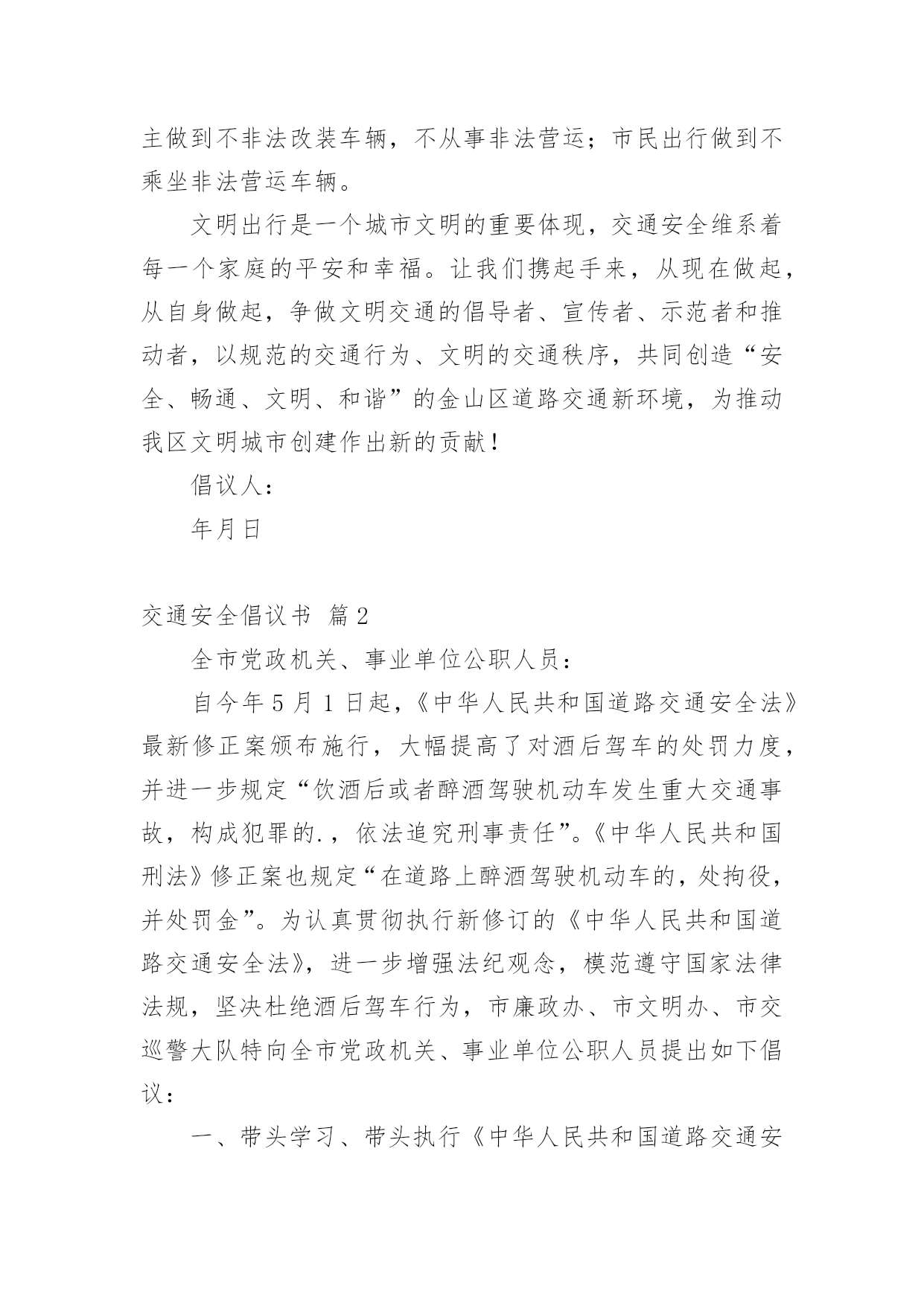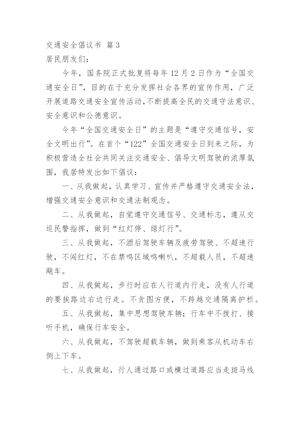 交通安全倡议书【精华】交通安全倡议书模板集锦五篇在不断进步的时代,倡议书的使用频率越来越高,不同的倡议书内容同样也是不同的。一听到写倡议书就拖延症懒癌齐复发?下面是小编为大家整理的交通安全倡议书5篇,欢迎阅读,希望大家能够喜欢。交通安全倡议书篇1广大市民朋友们:近年来,随着金山地区交通管理工作的不断深入推进,全区交通秩序和交通安全得到显著改善,广大市民对文明出行的认同度和满意度正在不断提高,营造更安全、更有序、更畅通的交通环境已成为全体市民的共同期盼。为进一步巩固和深化交通大整治工作成果,全面净化本区非机动车、行人通行秩序,切实把金山打造成为全市道路交通秩序最好、管理最严的地区,我们向广大市民发出如下倡议:一、文明行路:行人做到不闯红灯、不乱穿马路、不跨越隔离栏。二、规范骑车:非机动车骑行人做到不逆行、不闯红灯、不骑行机动车道和人行道、不闯禁令、不违法载人、不超越停车线、不加装车棚、不骑行无牌和非标电动自行车。三、安全出行:电动自行车车主和残疾人机动轮椅车车主做到不非法改装车辆,不从事非法营运;市民出行做到不乘坐非法营运车辆。文明出行是一个城市文明的重要体现,交通安全维系着每一个家庭的平安和幸福。让我们携起手来,从现在做起,从自身做起,争做文明交通的倡导者、宣传者、示范者和推动者,以规范的交通行为、文明的交通秩序,共同创造“安全、畅通、文明、和谐”的金山区道路交通新环境,为推动我区文明城市创建作出新的贡献!倡议人:年月日交通安全倡议书篇2全市党政机关、事业单位公职人员:自今年5月1日起,《中华人民共和国道路交通安全法》最新修正案颁布施行,大幅提高了对酒后驾车的处罚力度,并进一步规定“饮酒后或者醉酒驾驶机动车发生重大交通事故,构成犯罪的.,依法追究刑事责任”。《中华人民共和国刑法》修正案也规定“在道路上醉酒驾驶机动车的,处拘役,并处罚金”。为认真贯彻执行新修订的《中华人民共和国道路交通安全法》,进一步增强法纪观念,模范遵守国家法律法规,坚决杜绝酒后驾车行为,市廉政办、市文明办、市交巡警大队特向全市党政机关、事业单位公职人员提出如下倡议:一、带头学习、带头执行《中华人民共和国道路交通安全法》等国家法律法规,切实增强法律意识和纪律观念,坚决杜绝酒后驾车,争做文明交通的表率和践行者。二、在工作和生活中,严格自我约束,提高自控能力,做到喝酒不开车、开车不喝酒。对开车的人员不劝酒、不敬酒,并严格提醒开车的人员酒后不驾车。三、发现他人酒后驾车的,要及时进行劝阻,坚决制止酒后驾车行为,坚决不搭乘酒驾车辆。四、严格执行苏州市党政机关工作人员禁酒规定。五、提倡文明安全驾车,自觉遵守交通法规,服从交警的管理,不闯红灯、不乱停车、不超速、不超员、不往车外乱扔废弃物、礼让斑马线行人。各级党政机关和事业单位的公职人员要充分认识酒后驾车的危害性以及后果的严重性,模范执行禁酒规定和《道路交通安全法》等国家法律法规,做到警钟常鸣、防微杜渐。各级各部门要切实加强对本单位干部职工的教育、管理和监督,督促广大干部职工积极投身于文明交通活动之中,以严明的法纪杜绝酒驾行为,以实际的行动树立良好形象。关爱生命,文明交通。为了自己,为了他人,为了家庭的幸福美满,请您严格遵守交通法规,文明驾车。让我们携起手来、共同行动,一起创造一个平安畅通、和谐文明的交通环境,让我们的城市更靓丽、生活更美好、家庭更幸福!倡议人:20xx年XX月XX日交通安全倡议书篇3居民朋友们:今年,国务院正式批复将每年12月2日作为“全国交通安全日”,目的在于充分发挥社会各界的宣传作用,广泛开展道路交通安全宣传活动,不断提高全民的交通守法意识、安全意识和公德意识。今年“全国交通安全日”的主题是“遵守交通信号,安全文明出行”。在首个“122”全国交通安全日到来之际,为积极营造全社会共同关注交通安全、倡导文明驾驶的浓厚氛围,我居特发出如下倡议:一、从我做起,认真学习、宣传并严格遵守交通安全法,增强交通安全意识和交通法制观念。二、从我做起,自觉遵守交通信号、交通标志,遵从交巡民警指挥,做到“红灯停、绿灯行”。三、从我做起,不酒后驾驶车辆及疲劳驾驶、不超速行驶,不闯红灯,不在禁鸣区域鸣喇叭,不超载人员,不超速飚车。四、从我做起,步行时应在人行道内行走,没有人行道的要挨路边右边行走。不贪图方便,不跨越交通隔离护栏。五、从我做起,集中思想驾驶车辆;行车中不拨打、接听手机,确保行车安全。六、从我做起,不驾驶超载车辆,做到乘客从机动车右侧上下车。七、从我做起,行人通过路口或横过道路应当走斑马线或者过街设施,通过时要“右看、左看,向前行”,确认安全。不勾肩搭背,不追逐打闹,不逗留聚集。八、从我做起,骑车时注意车速,不要“飞车”,双手离把,并注意行人及机动车,不要快速在行人中间穿行。交通安全倡议书篇4交通是我们生活中重要