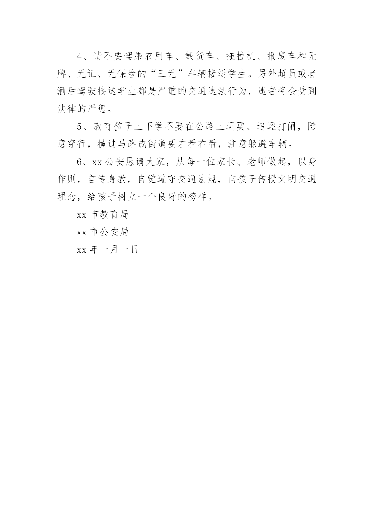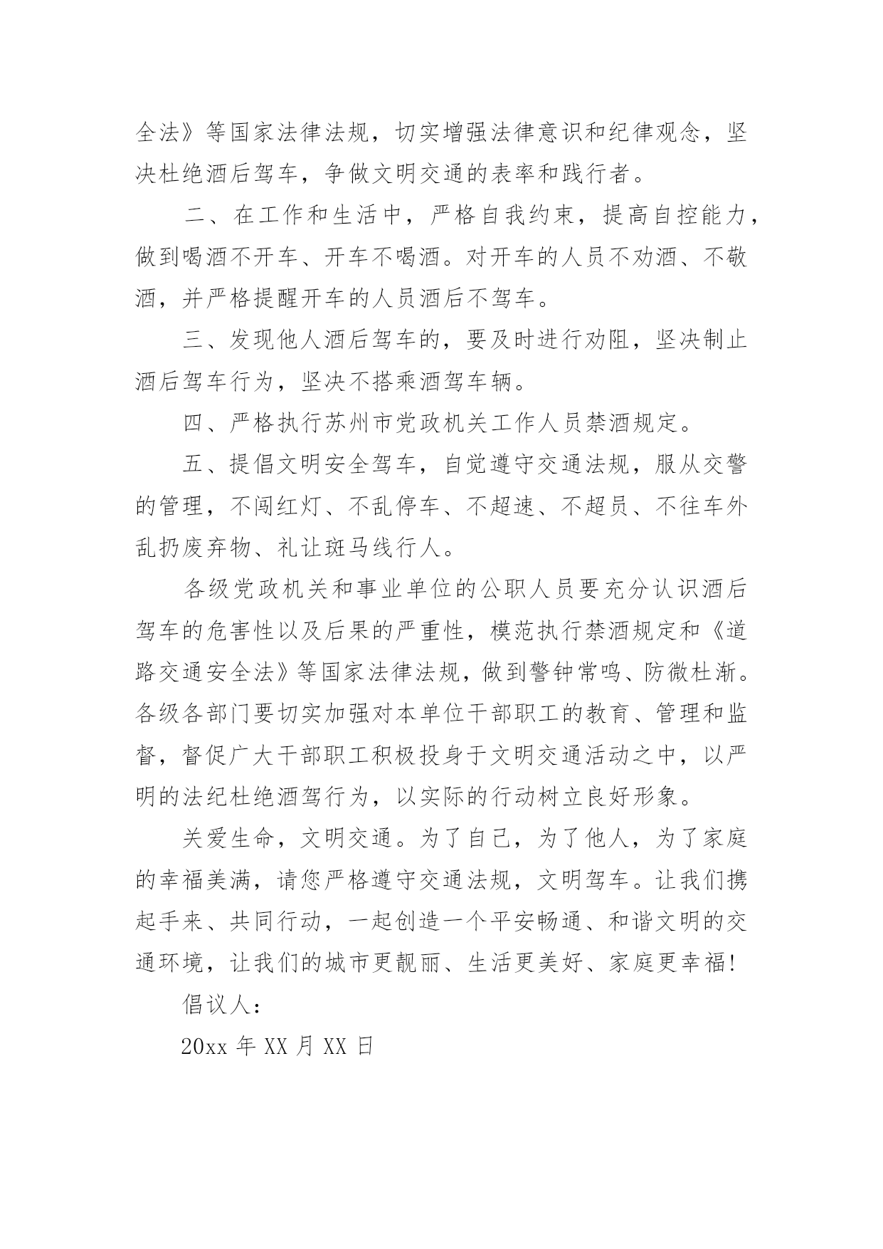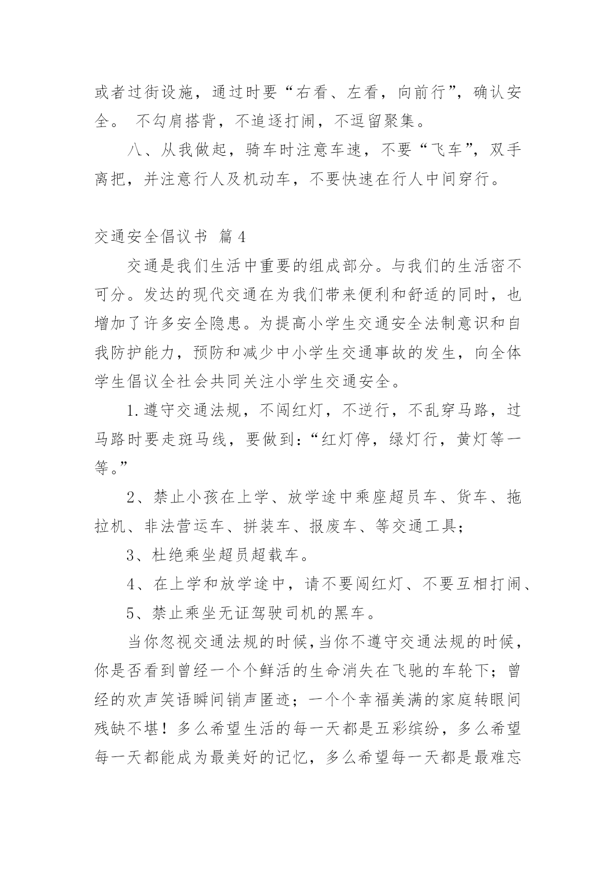 交通安全倡议书【精华】交通安全倡议书模板集锦五篇在不断进步的时代,倡议书的使用频率越来越高,不同的倡议书内容同样也是不同的。一听到写倡议书就拖延症懒癌齐复发?下面是小编为大家整理的交通安全倡议书5篇,欢迎阅读,希望大家能够喜欢。交通安全倡议书篇1广大市民朋友们:近年来,随着金山地区交通管理工作的不断深入推进,全区交通秩序和交通安全得到显著改善,广大市民对文明出行的认同度和满意度正在不断提高,营造更安全、更有序、更畅通的交通环境已成为全体市民的共同期盼。为进一步巩固和深化交通大整治工作成果,全面净化本区非机动车、行人通行秩序,切实把金山打造成为全市道路交通秩序最好、管理最严的地区,我们向广大市民发出如下倡议:一、文明行路:行人做到不闯红灯、不乱穿马路、不跨越隔离栏。二、规范骑车:非机动车骑行人做到不逆行、不闯红灯、不骑行机动车道和人行道、不闯禁令、不违法载人、不超越停车线、不加装车棚、不骑行无牌和非标电动自行车。三、安全出行:电动自行车车主和残疾人机动轮椅车车主做到不非法改装车辆,不从事非法营运;市民出行做到不乘坐非法营运车辆。文明出行是一个城市文明的重要体现,交通安全维系着每一个家庭的平安和幸福。让我们携起手来,从现在做起,从自身做起,争做文明交通的倡导者、宣传者、示范者和推动者,以规范的交通行为、文明的交通秩序,共同创造“安全、畅通、文明、和谐”的金山区道路交通新环境,为推动我区文明城市创建作出新的贡献!倡议人:年月日交通安全倡议书篇2全市党政机关、事业单位公职人员:自今年5月1日起,《中华人民共和国道路交通安全法》最新修正案颁布施行,大幅提高了对酒后驾车的处罚力度,并进一步规定“饮酒后或者醉酒驾驶机动车发生重大交通事故,构成犯罪的.,依法追究刑事责任”。《中华人民共和国刑法》修正案也规定“在道路上醉酒驾驶机动车的,处拘役,并处罚金”。为认真贯彻执行新修订的《中华人民共和国道路交通安全法》,进一步增强法纪观念,模范遵守国家法律法规,坚决杜绝酒后驾车行为,市廉政办、市文明办、市交巡警大队特向全市党政机关、事业单位公职人员提出如下倡议:一、带头学习、带头执行《中华人民共和国道路交通安全法》等国家法律法规,切实增强法律意识和纪律观念,坚决杜绝酒后驾车,争做文明交通的表率和践行者。二、在工作和生活中,严格自我约束,提高自控能力,做到喝酒不开车、开车不喝酒。对开车的人员不劝酒、不敬酒,并严格提醒开车的人员酒后不驾车。三、发现他人酒后驾车的,要及时进行劝阻,坚决制止酒后驾车行为,坚决不搭乘酒驾车辆。四、严格执行苏州市党政机关工作人员禁酒规定。五、提倡文明安全驾车,自觉遵守交通法规,服从交警的管理,不闯红灯、不乱停车、不超速、不超员、不往车外乱扔废弃物、礼让斑马线行人。各级党政机关和事业单位的公职人员要充分认识酒后驾车的危害性以及后果的严重性,模范执行禁酒规定和《道路交通安全法》等国家法律法规,做到警钟常鸣、防微杜渐。各级各部门要切实加强对本单位干部职工的教育、管理和监督,督促广大干部职工积极投身于文明交通活动之中,以严明的法纪杜绝酒驾行为,以实际的行动树立良好形象。关爱生命,文明交通。为了自己,为了他人,为了家庭的幸福美满,请您严格遵守交通法规,文明驾车。让我们携起手来、共同行动,一起创造一个平安畅通、和谐文明的交通环境,让我们的城市更靓丽、生活更美好、家庭更幸福!倡议人:20xx年XX月XX日交通安全倡议书篇3居民朋友们:今年,国务院正式批复将每年12月2日作为“全国交通安全日”,目的在于充分发挥社会各界的宣传作用,广泛开展道路交通安全宣传活动,不断提高全民的交通守法意识、安全意识和公德意识。今年“全国交通安全日”的主题是“遵守交通信号,安全文明出行”。在首个“122”全国交通安全日到来之际,为积极营造全社会共同关注交通安全、倡导文明驾驶的浓厚氛围,我居特发出如下倡议:一、从我做起,认真学习、宣传并严格遵守交通安全法,增强交通安全意识和交通法制观念。二、从我做起,自觉遵守交通信号、交通标志,遵从交巡民警指挥,做到“红灯停、绿灯行”。三、从我做起,不酒后驾驶车辆及疲劳驾驶、不超速行驶,不闯红灯,不在禁鸣区域鸣喇叭,不超载人员,不超速飚车。四、从我做起,步行时应在人行道内行走,没有人行道的要挨路边右边行走。不贪图方便,不跨越交通隔离护栏。五、从我做起,集中思想驾驶车辆;行车中不拨打、接听手机,确保行车安全。六、从我做起,不驾驶超载车辆,做到乘客从机动车右侧上下车。七、从我做起,行人通过路口或横过道路应当走斑马线或者过街设施,通过时要“右看、左看,向前行”,确认安全。不勾肩搭背,不追逐打闹,不逗留聚集。八、从我做起,骑车时注意车速,不要“飞车”,双手离把,并注意行人及机动车,不要快速在行人中间穿行。交通安全倡议书篇4交通是我们生活中重要