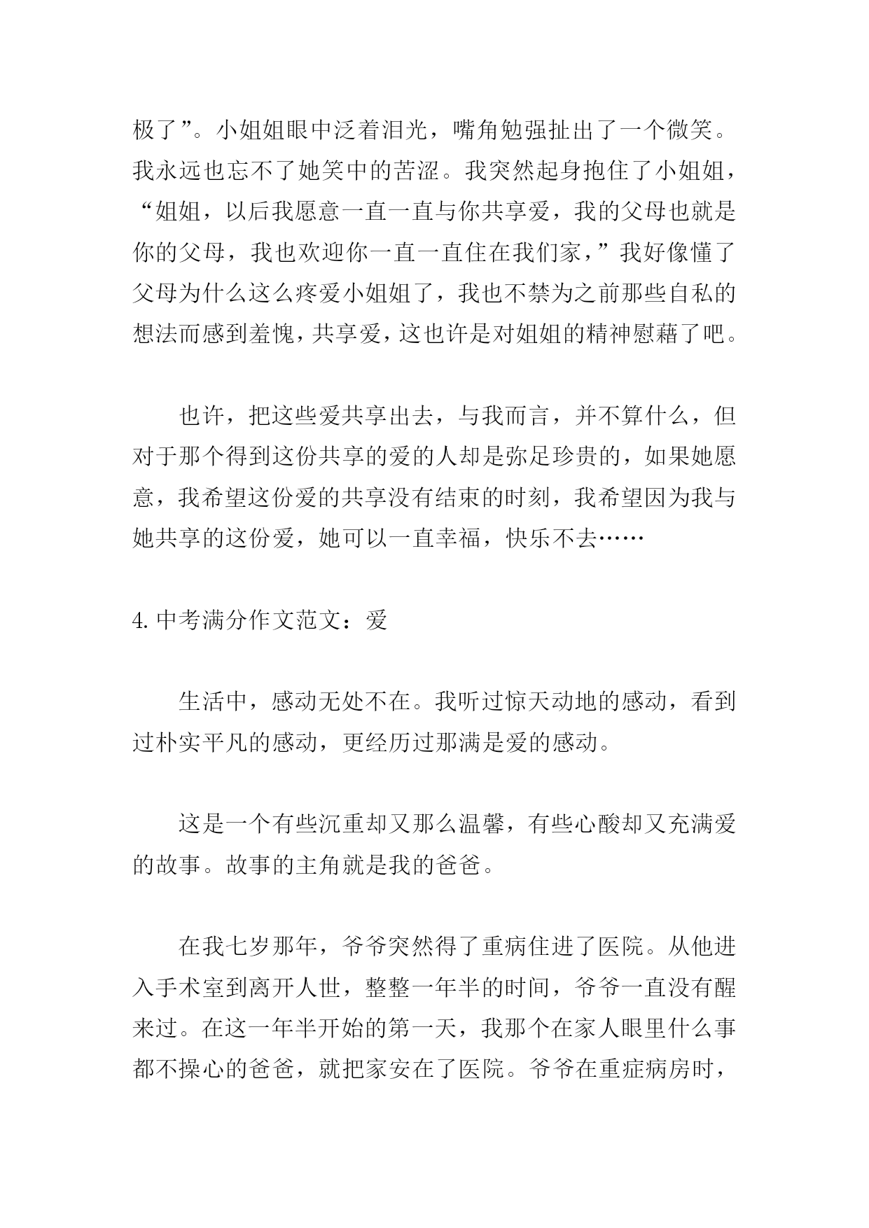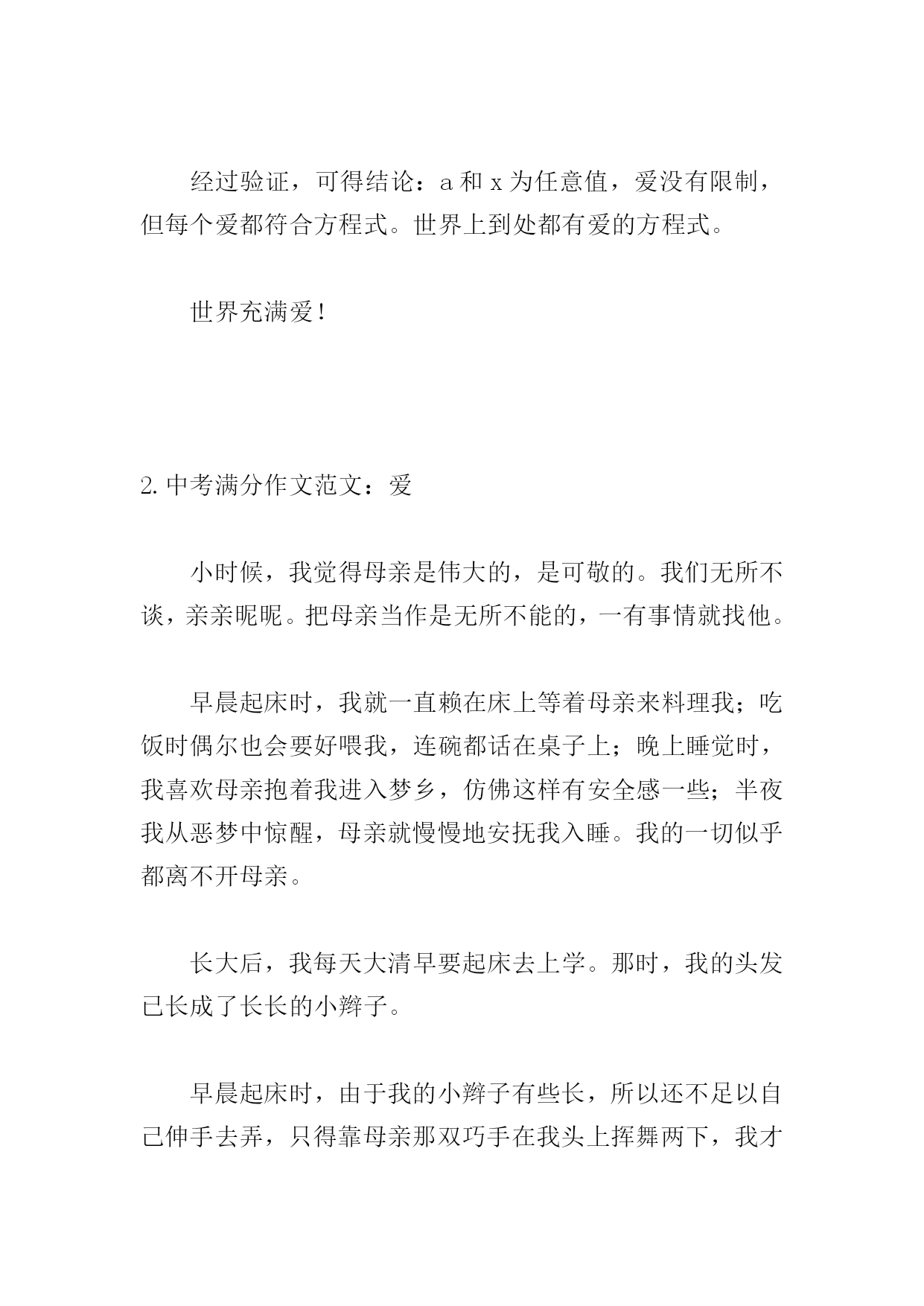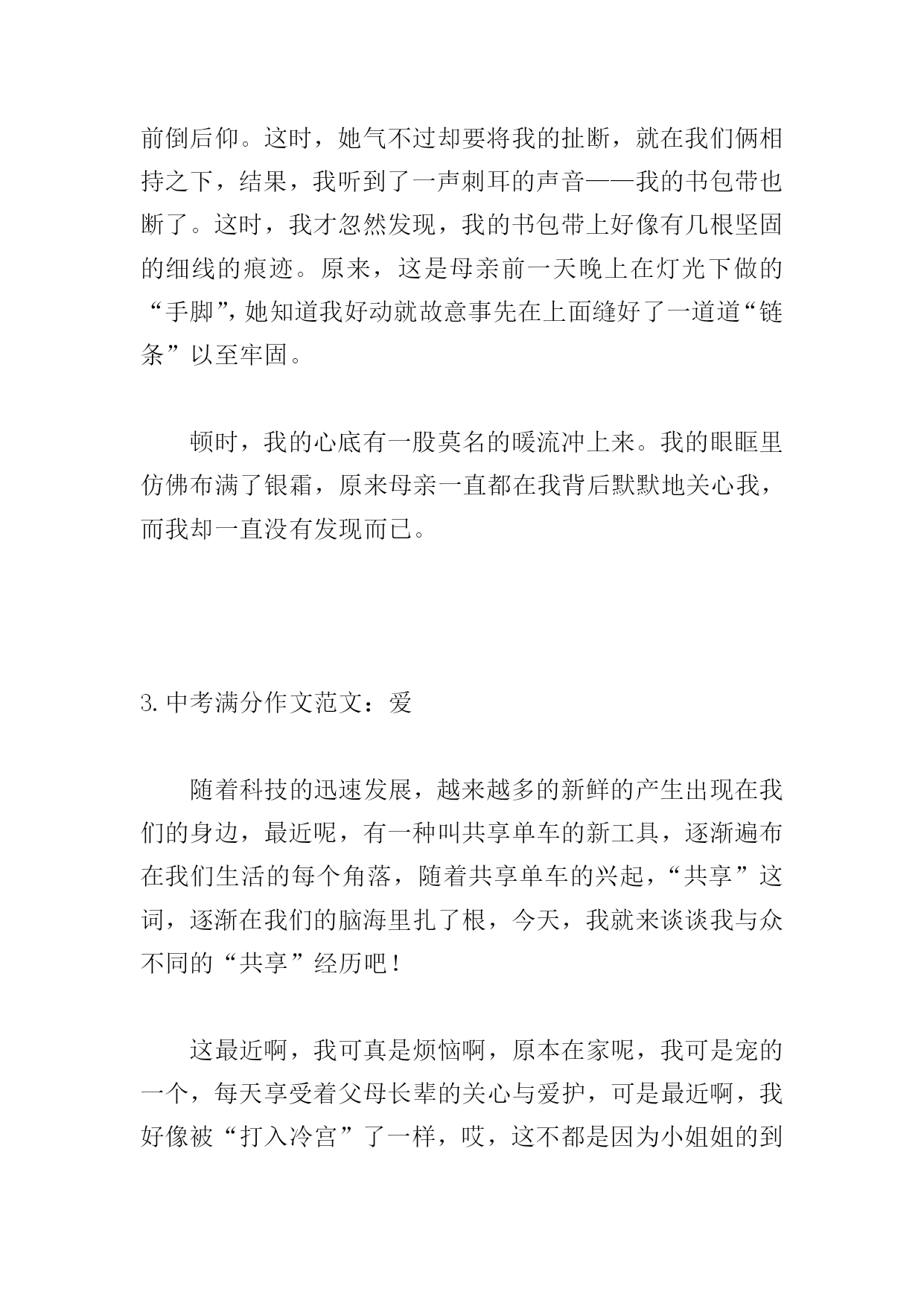 中考满分作文范文:爱1.中考满分作文范文:爱爱是多种多样的,几乎没有人可以用具体的语言来描绘它。但是,我就可以。设世间的生物为a,爱的方式为x,则ax=爱。当a=桃花,x=枯萎自己时:幽幽的微风吹来了三月的春天,娇艳的桃花如舞会上美丽的贵族小姐,青春,靓丽。只是,这春天来的快,去得也快。辛勤的蜜蜂带来了花粉,昔日美丽的桃花,褪去华丽的外衣,正在精心的照看她的宝宝。因为害怕他的营养不够,她枯萎了自己,只是那枯黄的花瓣却依旧挂在枝头,眷恋那逐渐成熟的果实,即使脆弱得不堪一击,也死命地挡住那狂风的攻击,她依靠的是一份牵挂吧,一份爱的牵挂。当a=燕子,x=劳累自己时:迎春花开,迎来了春天,也迎回了燕子。那轻巧的身影来不及休息,就接着忙了起来,来来回回,进进出出,不停地衔着泥丸,经过一天的劳累,一个可爱的家就建好了。她欣喜的绕着新家不停的飞舞,似乎都能看到她脸上洋溢着的笑容。日子一天一天的过去,以往的平静突然被打破了,叽叽喳喳的声音传来——小燕子们出生了!但是,她却更加辛苦了,一天不知飞出去几次,但是她依然不知疲惫的辛苦着,因为,她要让她的孩子吃饱,让他们尽快长大,看着孩子们健康长大,这是她的愿望。支持她的是信念吧,一份爱的信念。当a=人类,x=贡献一生时:百花争艳的春天,如花儿般的少女们在草地上嬉戏,轻巧的身影如莺如燕,在这里留下了她们的足迹。时光匆匆流逝,转眼几年过去了,昔日的少女已成为妇人,那圆圆的肚子中孕育了一个小生命。她小心翼翼的照看着,仿佛那是她的生命。她用手轻抚肚子,嘴角总是有一丝温暖的笑容。转眼几年,她的孩子长大了,青春也离她而去,细纹不觉爬上了她的眼角。可那调皮的孩子,却总是不让她省心,这会儿又不知道在哪儿捣乱呢。她的唇轻抿,眉紧皱,心中的急躁谁又能知。不知不觉间,她苍老得更快了。又是一年一年的时光流逝,她也数不清已度过了多少岁月。头上的乌发已经变得雪白,千沟万壑的皱纹就那么布在脸上。一辈子过得很快。只是,她不后悔,不后悔将自己的一辈子贡献了出去。看着孩子们脸上洋溢着的幸福笑容,这样就够了,这就是爱的贡献吧。经过验证,可得结论:a和x为任意值,爱没有限制,但每个爱都符合方程式。世界上到处都有爱的方程式。世界充满爱!2.中考满分作文范文:爱小时候,我觉得母亲是伟大的,是可敬的。我们无所不谈,亲亲昵昵。把母亲当作是无所不能的,一有事情就找他。早晨起床时,我就一直赖在床上等着母亲来料理我;吃饭时偶尔也会要好喂我,连碗都话在桌子上;晚上睡觉时,我喜欢母亲抱着我进入梦乡,仿佛这样有安全感一些;半夜我从恶梦中惊醒,母亲就慢慢地安抚我入睡。我的一切似乎都离不开母亲。长大后,我每天大清早要起床去上学。那时,我的头发已长成了长长的小辫子。早晨起床时,由于我的小辫子有些长,所以还不足以自己伸手去弄,只得靠母亲那双巧手在我头上挥舞两下,我才得以去上学。因为家离学校有点远,而且我们都会在学校食宿一星期,所以母亲怕我不会自己照顾自己就会每星期去看望我几次。就这样春去秋来,我才渐渐地不再让母亲为我所辫子,不再让她不放心我而千里迢迢跑来看我了。我每次一放假回到家里,都会把学校里发生的事情都告诉给母亲,她听得很认真,很仔细,并时不时地问我这怎么样,那如何。而现在,我真正长大了,明白事理了。母亲也把我扔给奶奶照顾,她却要等到一年到头才回来几天,家里什么事都交给奶奶。而奶奶已经年迈,我有什么事也无人倾诉,无人可帮忙,什么都得依靠自己。渐渐地,我已经习惯了这种孤独的生活。有什么事我也没有告诉她,我变得沉默了。好不容易等到母亲回家了,然而我们却是像一般的亲戚一样,母亲问一句,我答一句。我们好像没什么话可说一样。当我做什么事不好时,她会说我;当我对奶奶说话偶尔大声了些的时候,她会用尖锐的眼斜视着我。我慢慢地发现,她对我很严厉了,我开始有此怕她了。开学了,我背着书包去上学。跟我的朋友耀新书包,拿在手里前摆后晃地成倒扇形,很结实,而我那个朋友的书包却发出一声咔嚓的响声,原来她的书包带断了,把我给笑得前倒后仰。这时,她气不过却要将我的扯断,就在我们俩相持之下,结果,我听到了一声刺耳的声音——我的书包带也断了。这时,我才忽然发现,我的书包带上好像有几根坚固的细线的痕迹。原来,这是母亲前一天晚上在灯光下做的“手脚”,她知道我好动就故意事先在上面缝好了一道道“链条”以至牢固。顿时,我的心底有一股莫名的暖流冲上来。我的眼眶里仿佛布满了银霜,原来母亲一直都在我背后默默地关心我,而我却一直没有发现而已。3.中考满分作文范文:爱随着科技的迅速发展,越来越多的新鲜的产生出现在我们的身边,最近呢,有一种叫共享单车的新工具,逐渐遍布在我们生活的每个角落,随着共享单车的兴起,“共享”这词,逐